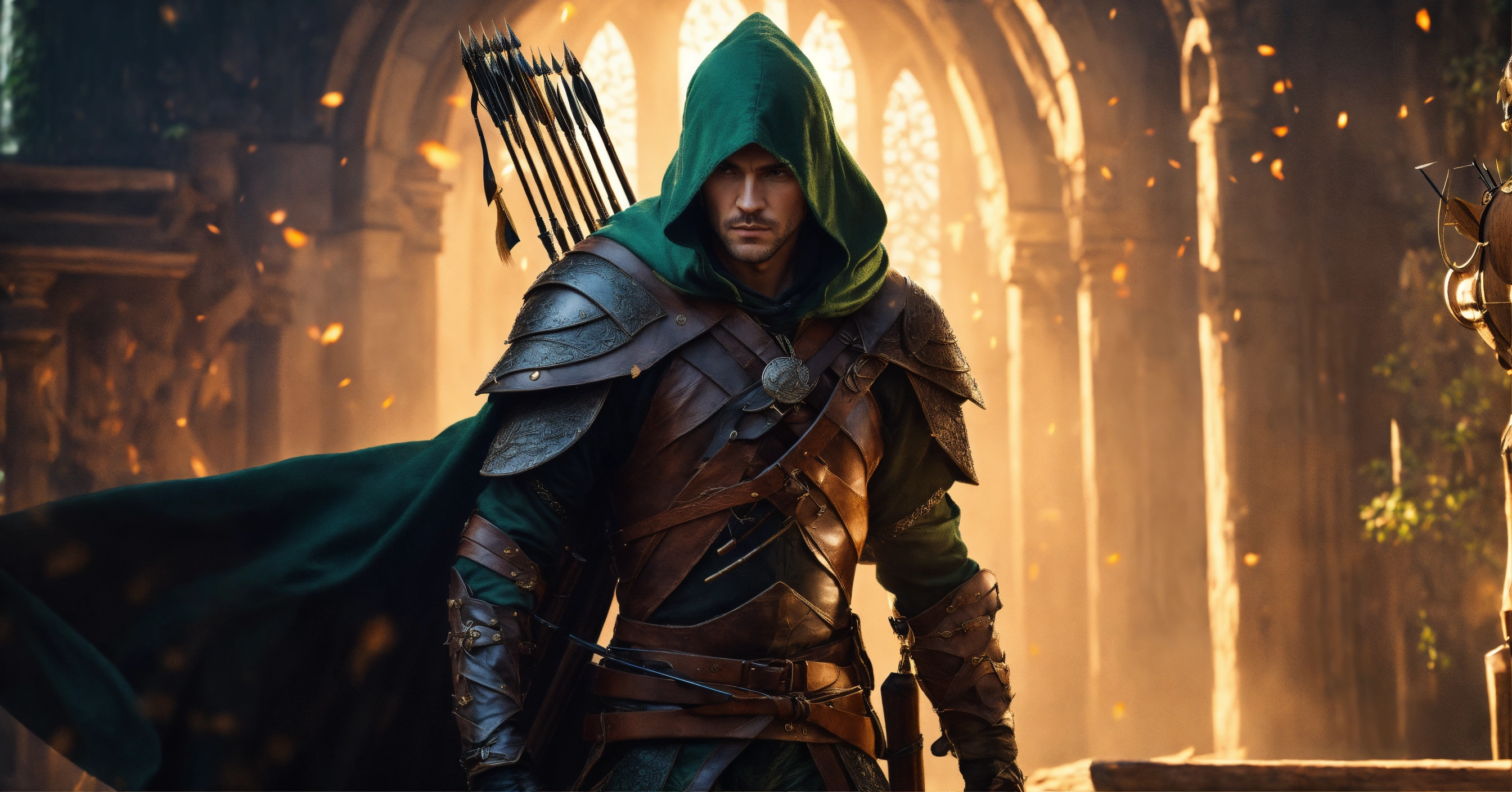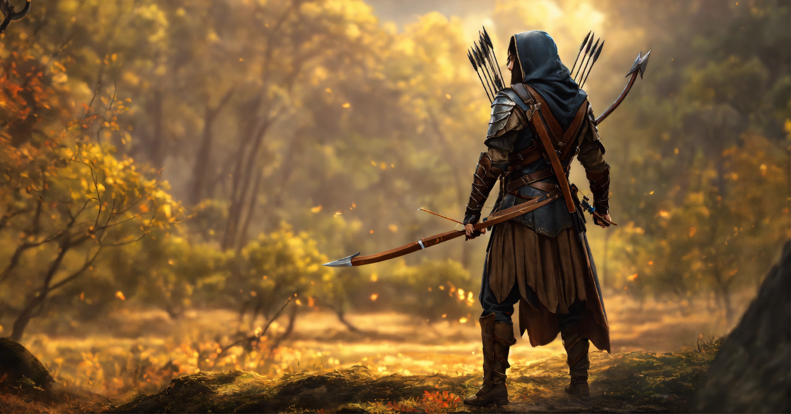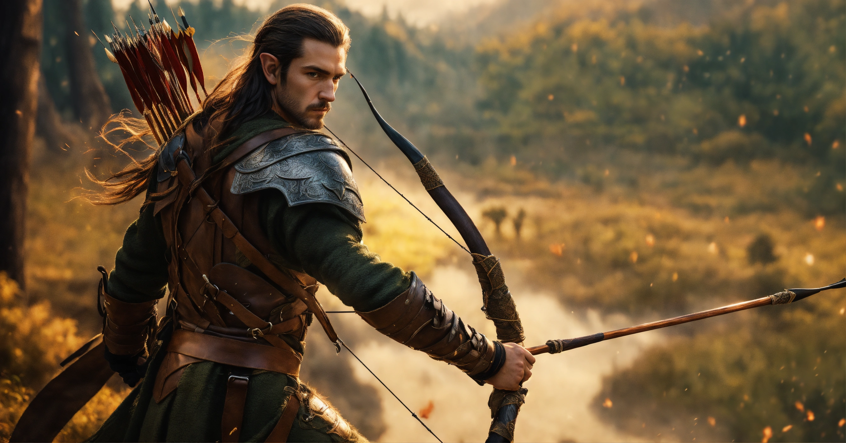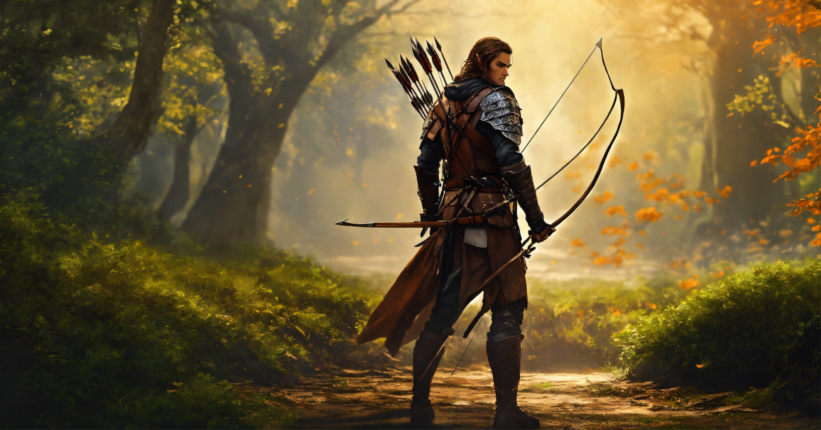 Fine art, delicate detail, male wood-elf, rogue assassin, wielding longbow, wearing leather armor, and cloak, has a quiver of arrows on his back, standing in a defensive stance, ready to attack, digital art