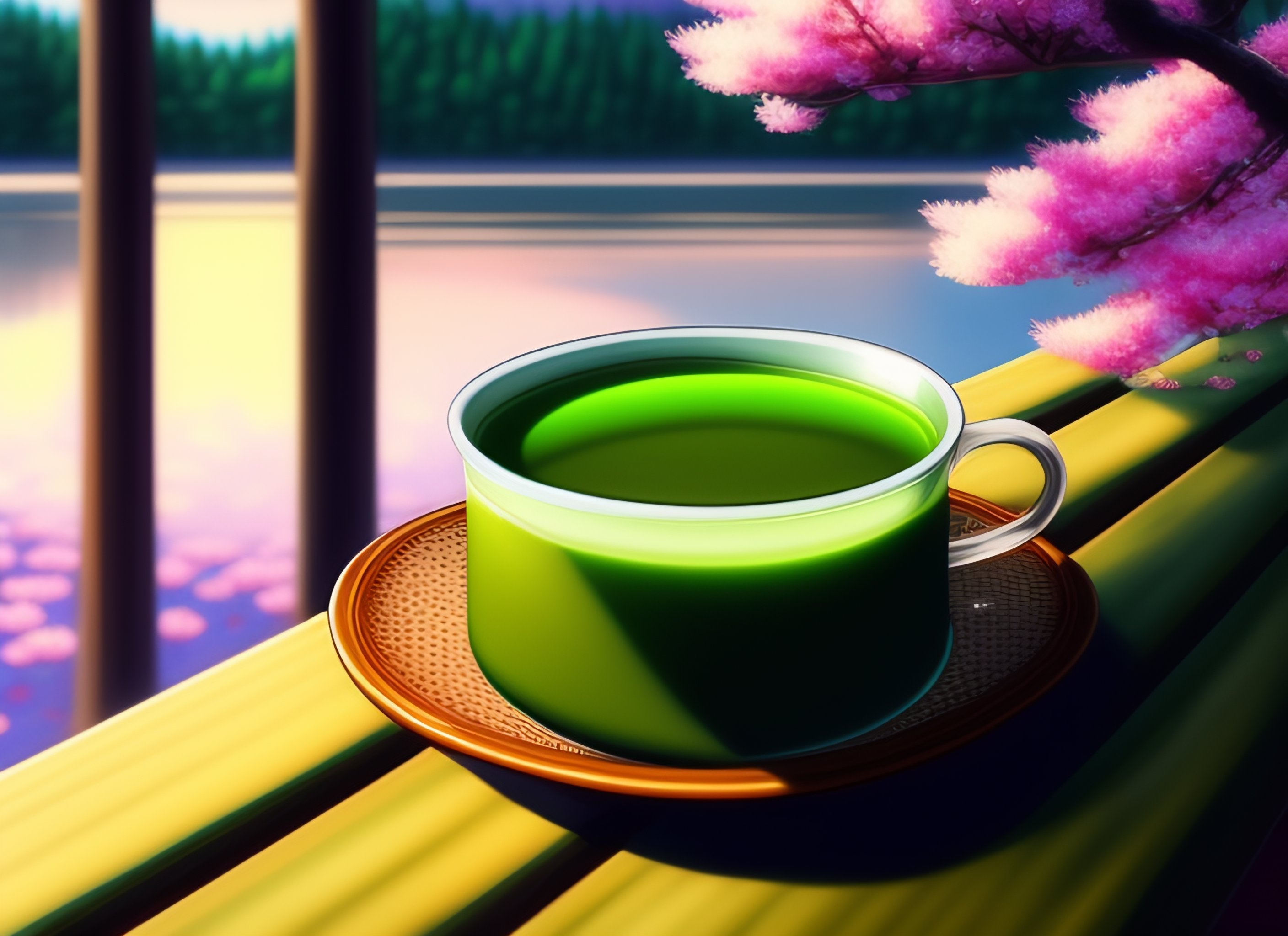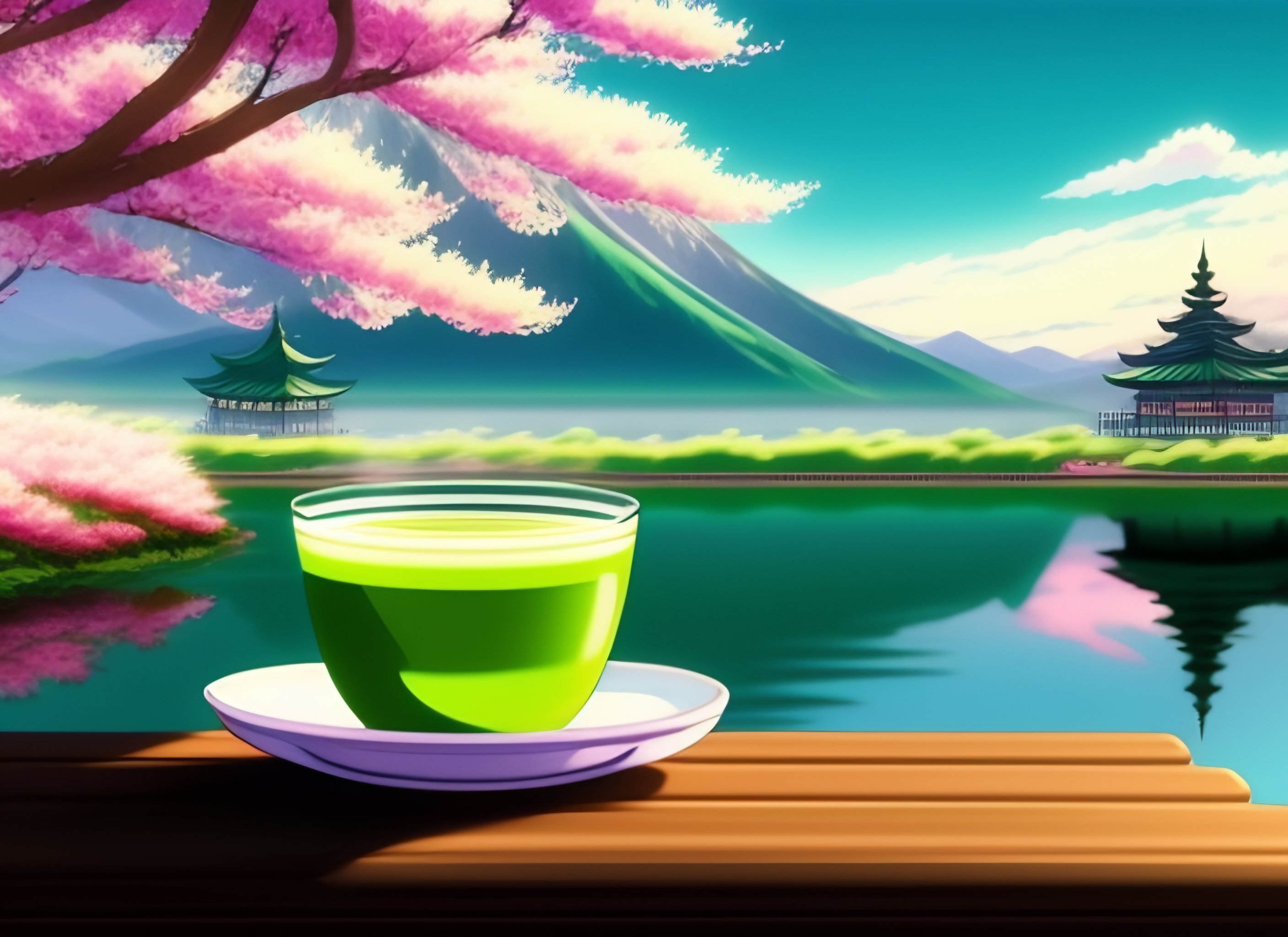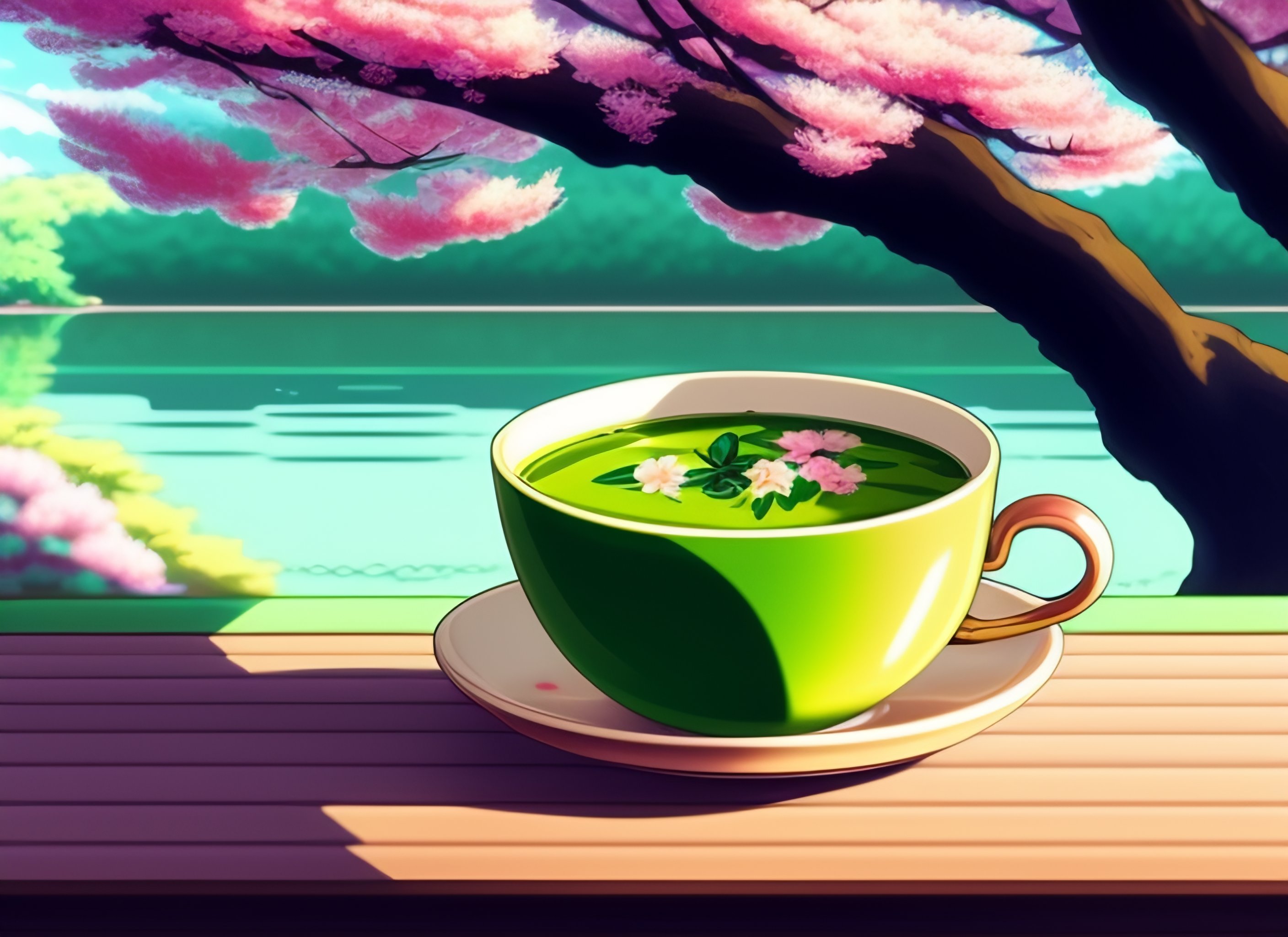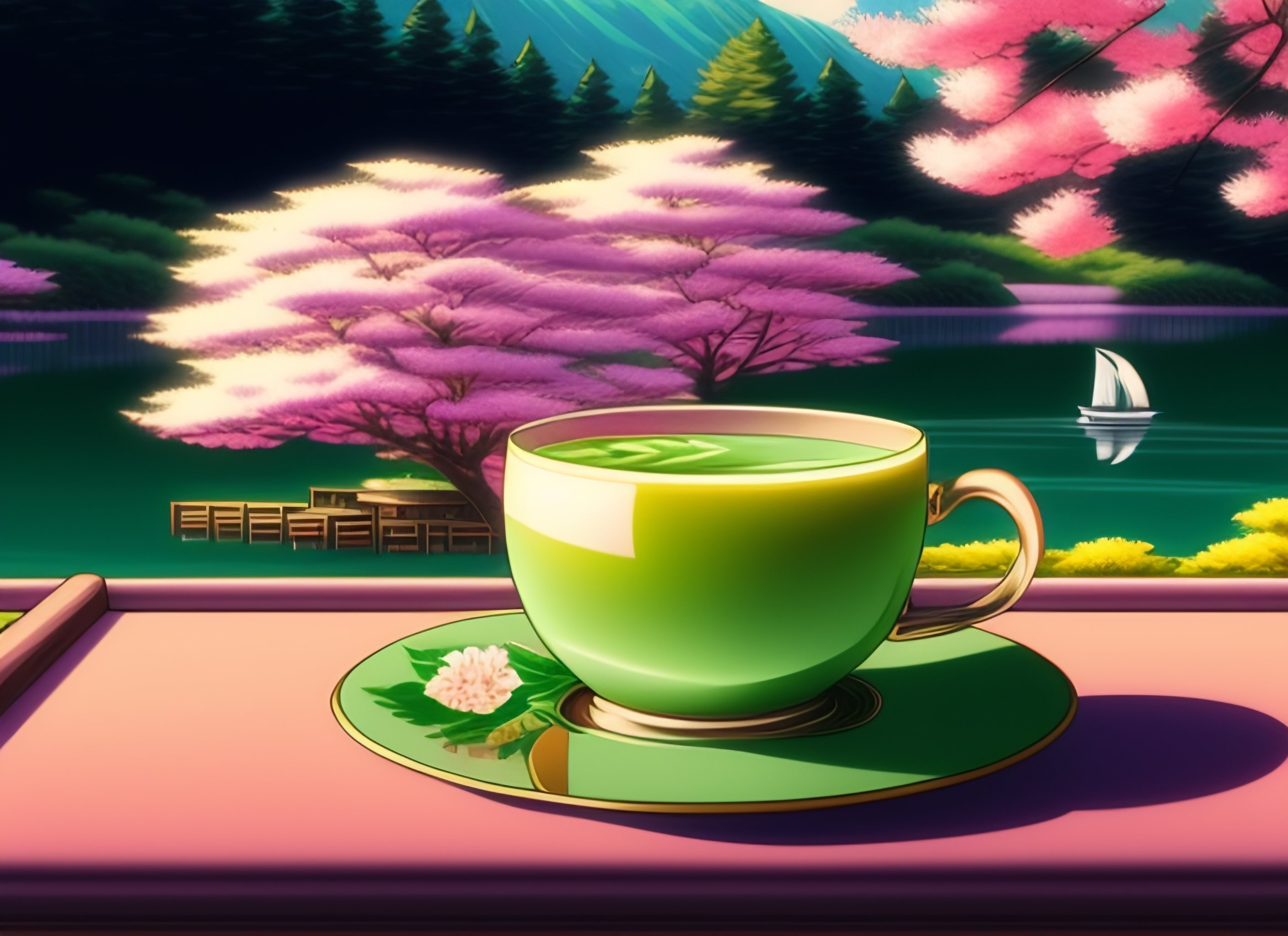 A good looking cup of matcha tea in a tea hut in vintage 1990 anime manga style, cherry blossoms in background with lake