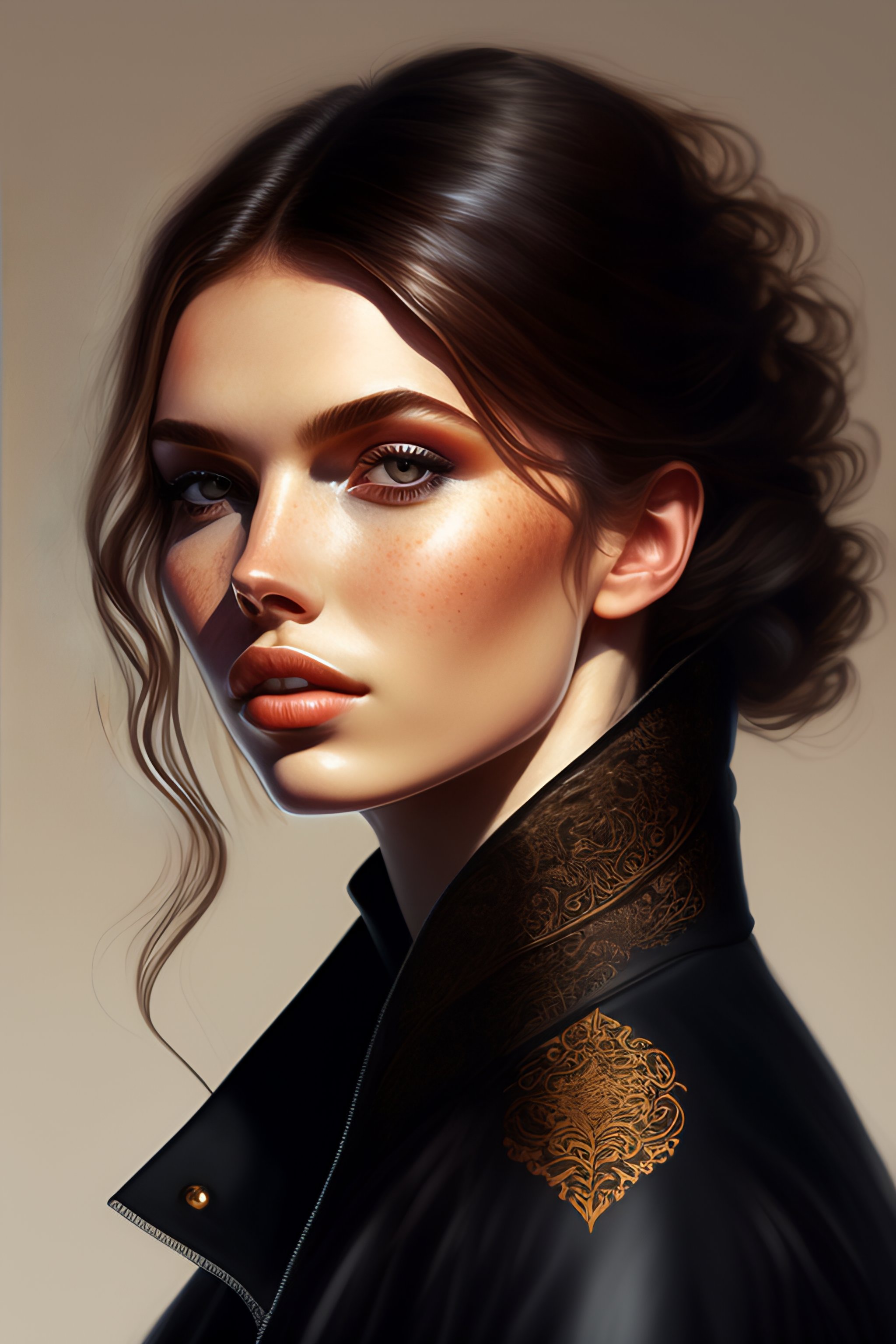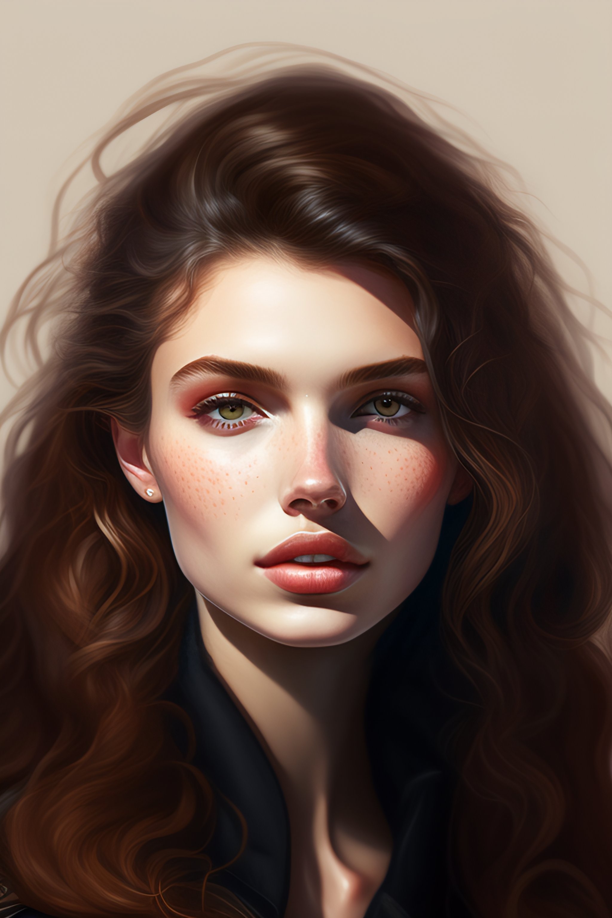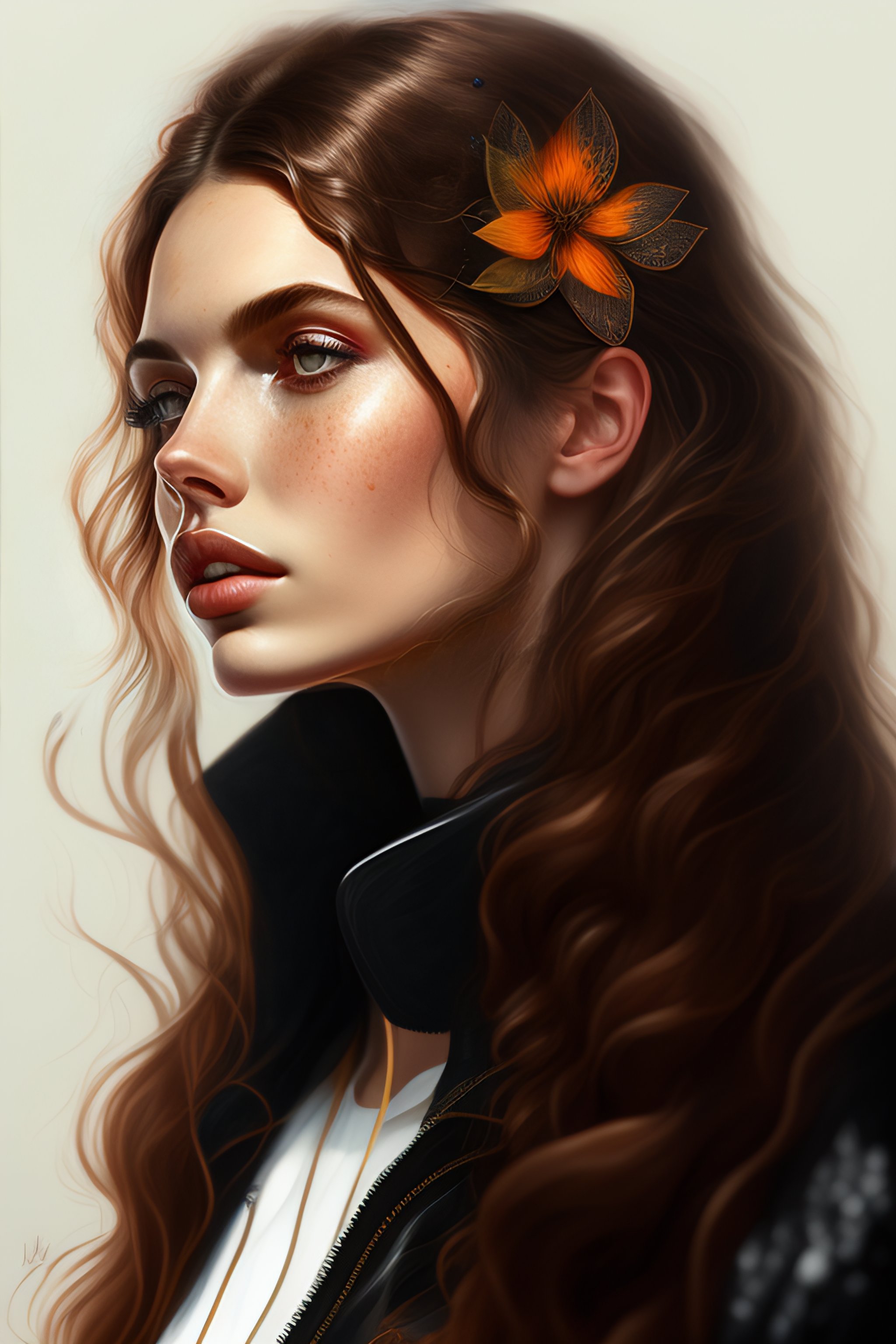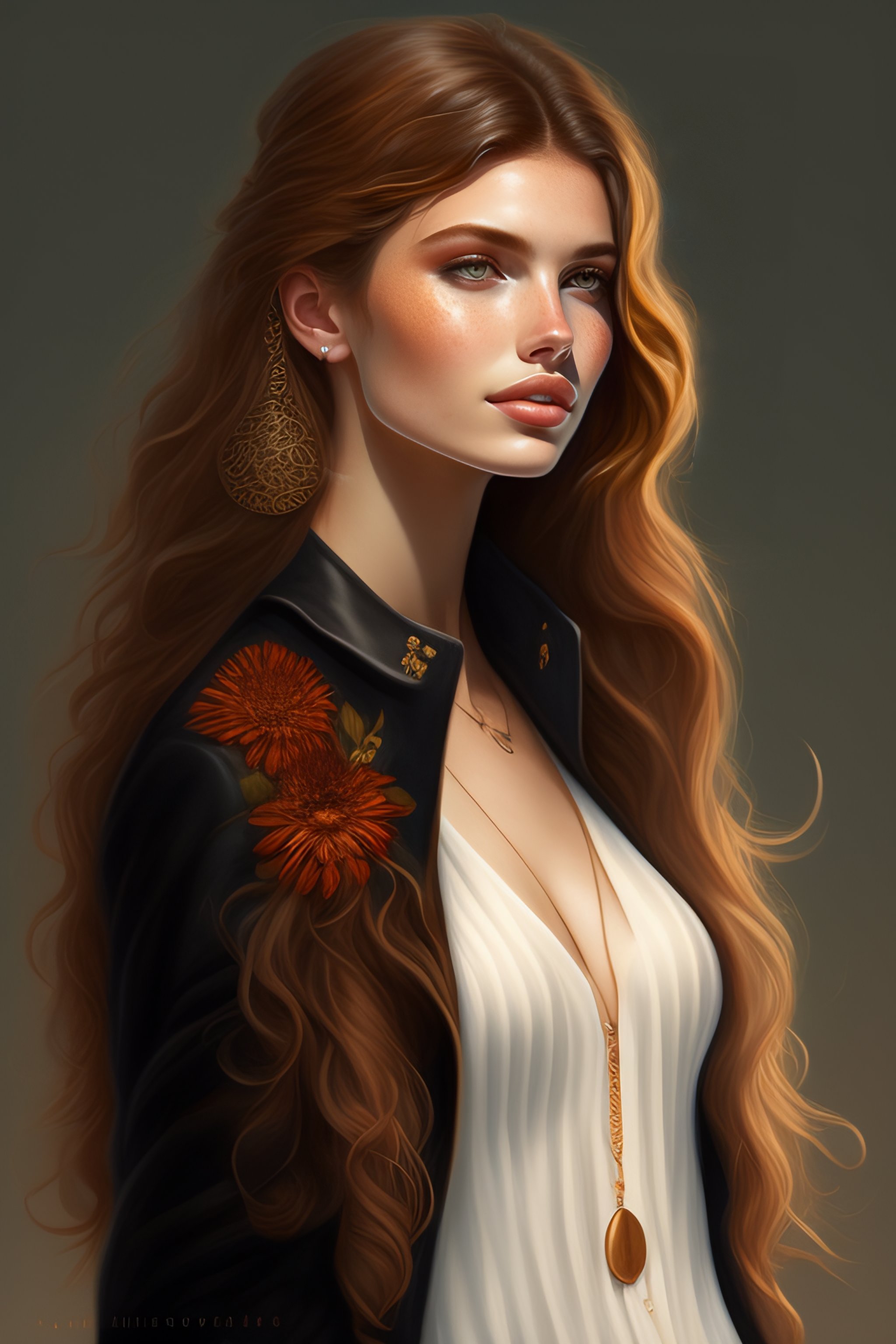 Black round shades, a full body portrait of a beautiful wild, intricate, elegant, highly detailed, digital painting, artstation, concept art, smooth, sharp focus, illustration, brown hair, black jacket, youthful, hannah murray, round face, messy hair, hippy, freckles