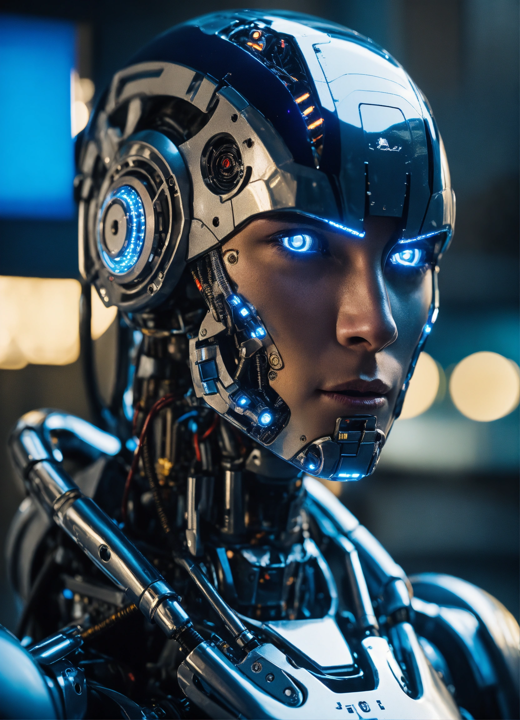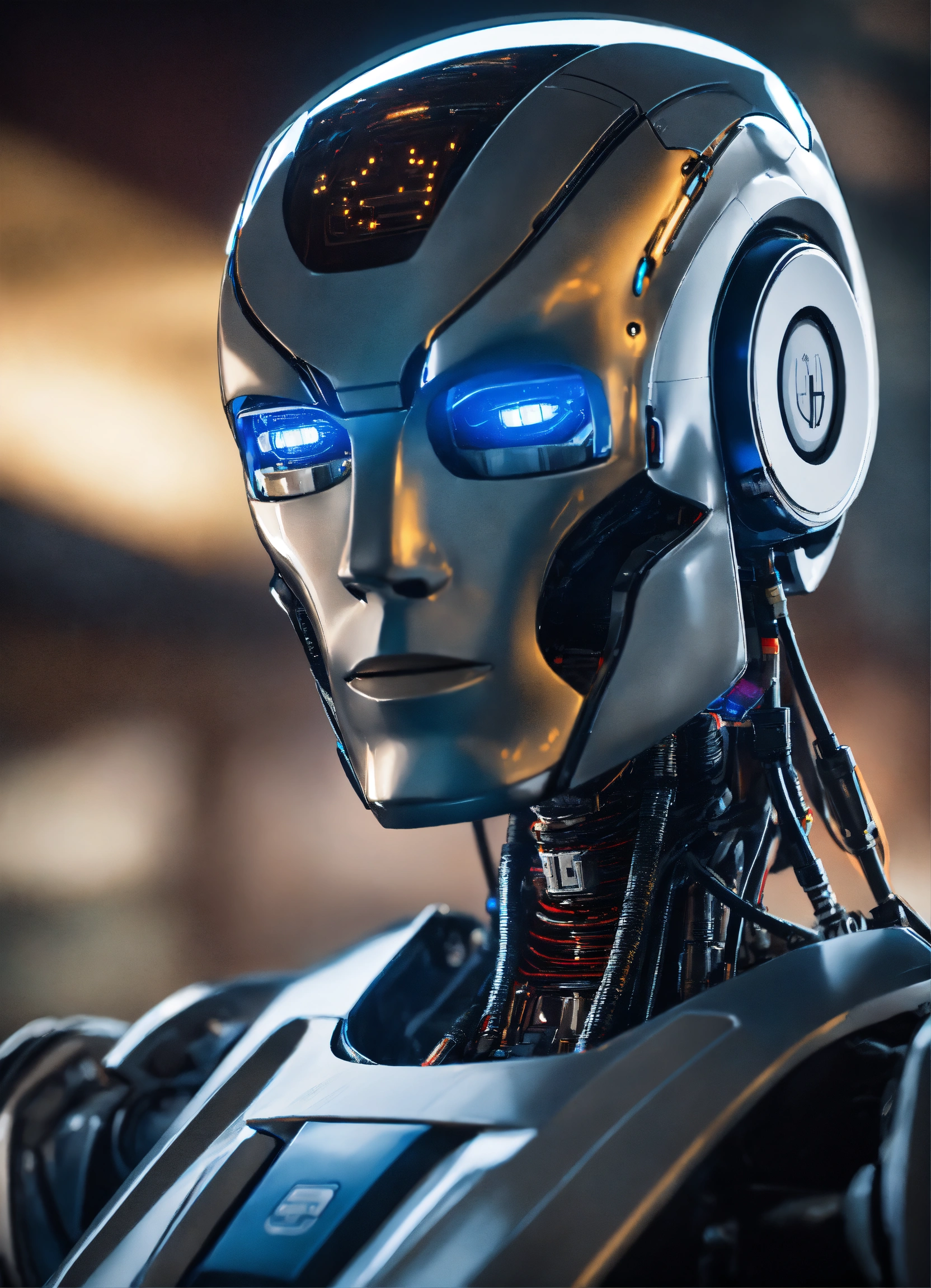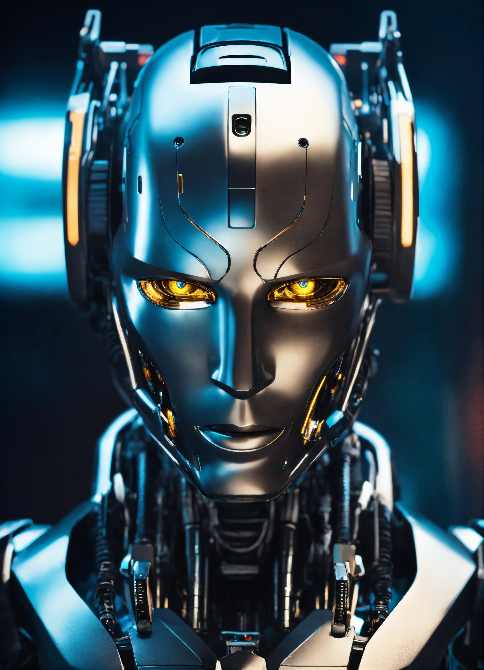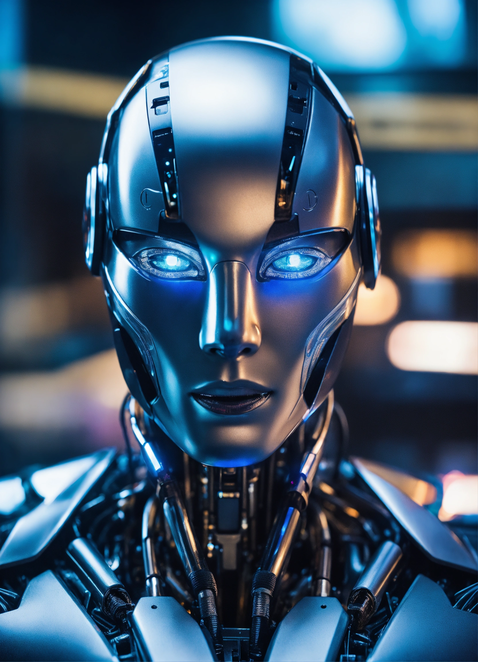 Forward-facing male robot, medium ultra-detailed photography, style a blend of 'i, robot' and 'westworld' with sleek design and visible circuitry, lighting dynamic side-lighting highlighting the robot's facial features and reflecting off its polished surface, colors chrome, dark metallic blues, and intense white glows from the eyes, composition canon eos-1d x mark iii, 55mm lens, sharp focus on the glowing eyes and facial structure, f/2.5, iso 80, shutter speed 1/125, portrait framing capturing the robot's face and neck against a futuristic city