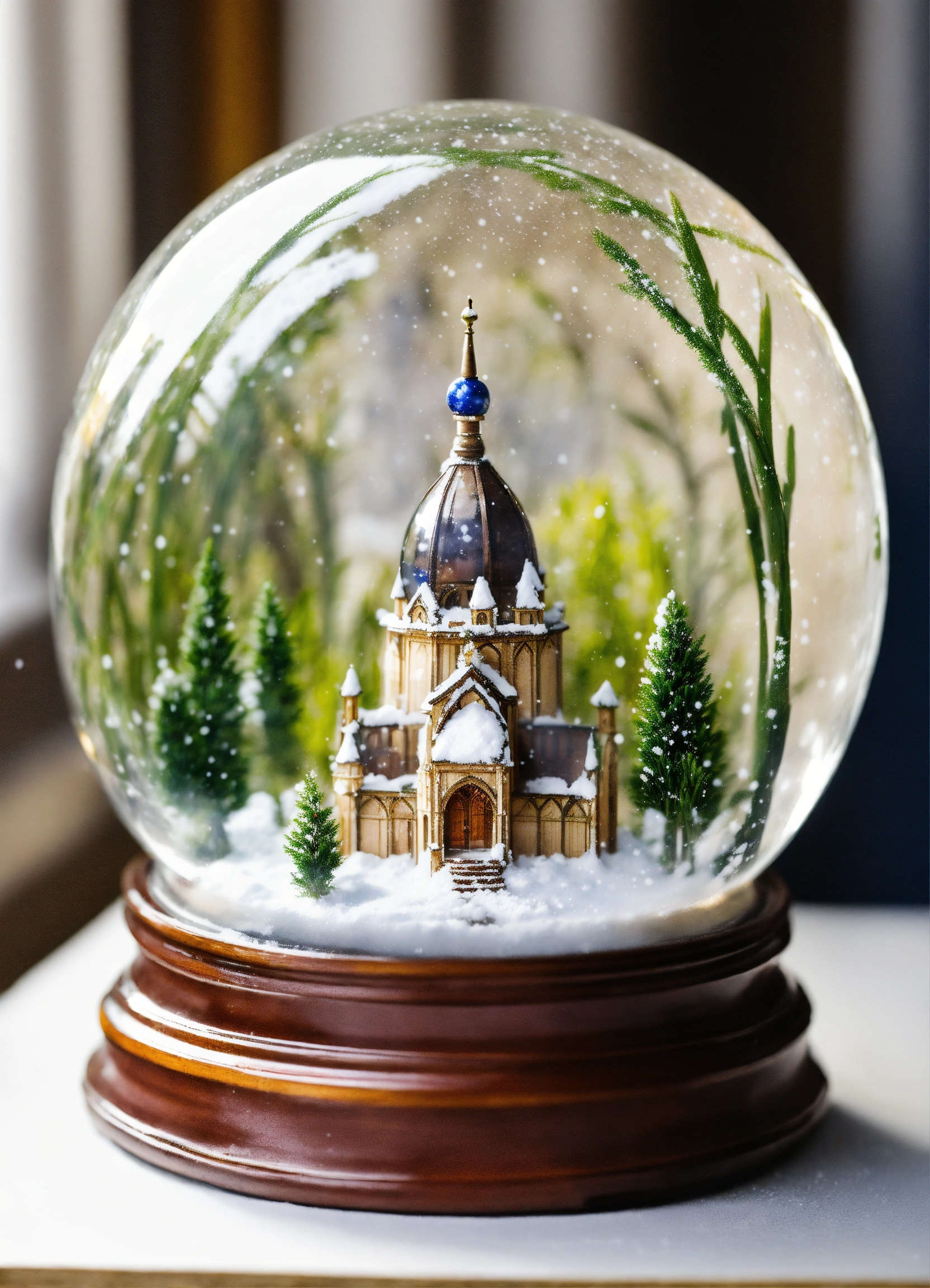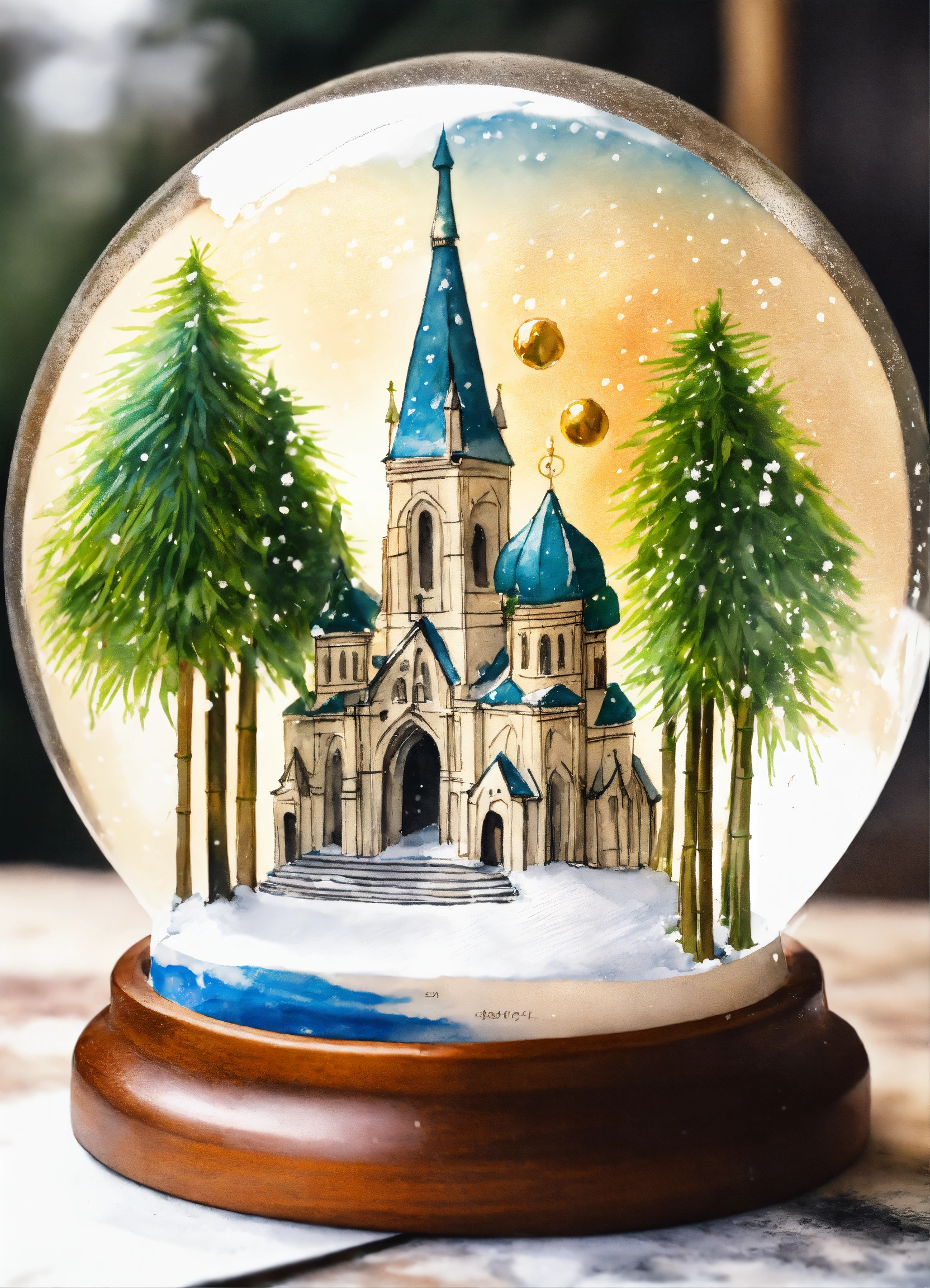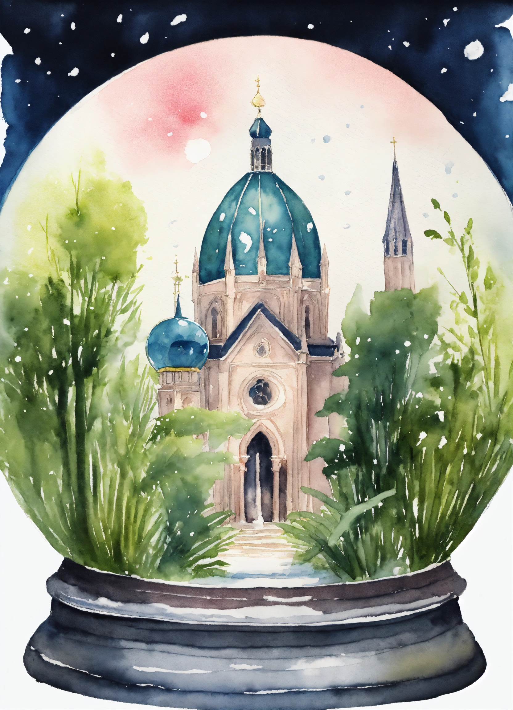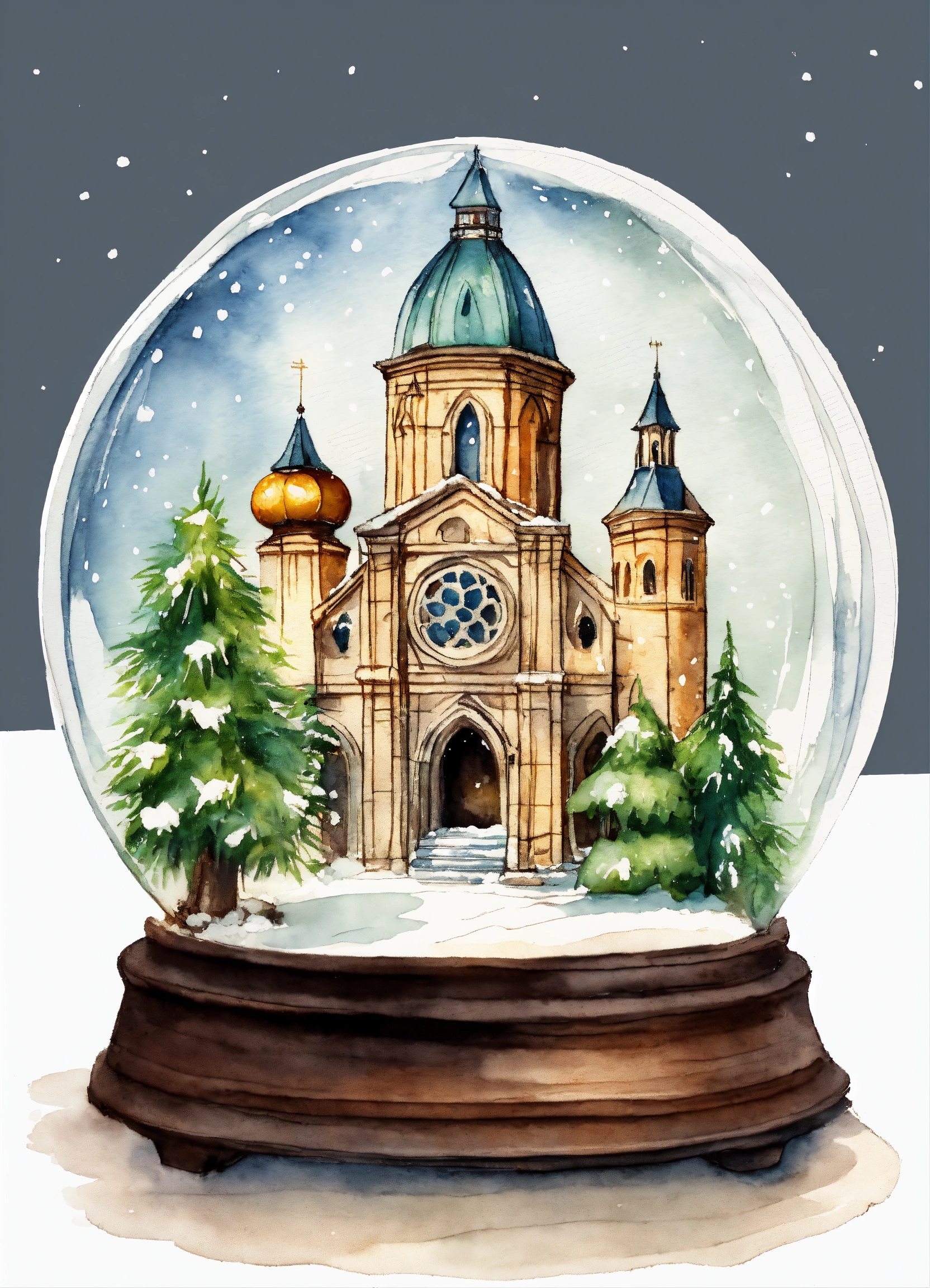 Draw a miniature spherical snowglobe, with giant bamboos inside, and a 12th century french gothic cathedral with a single bell tower on its side amid the bamboos. it's snowing in the snowglobe. light watercolor painting style, on a plain white background