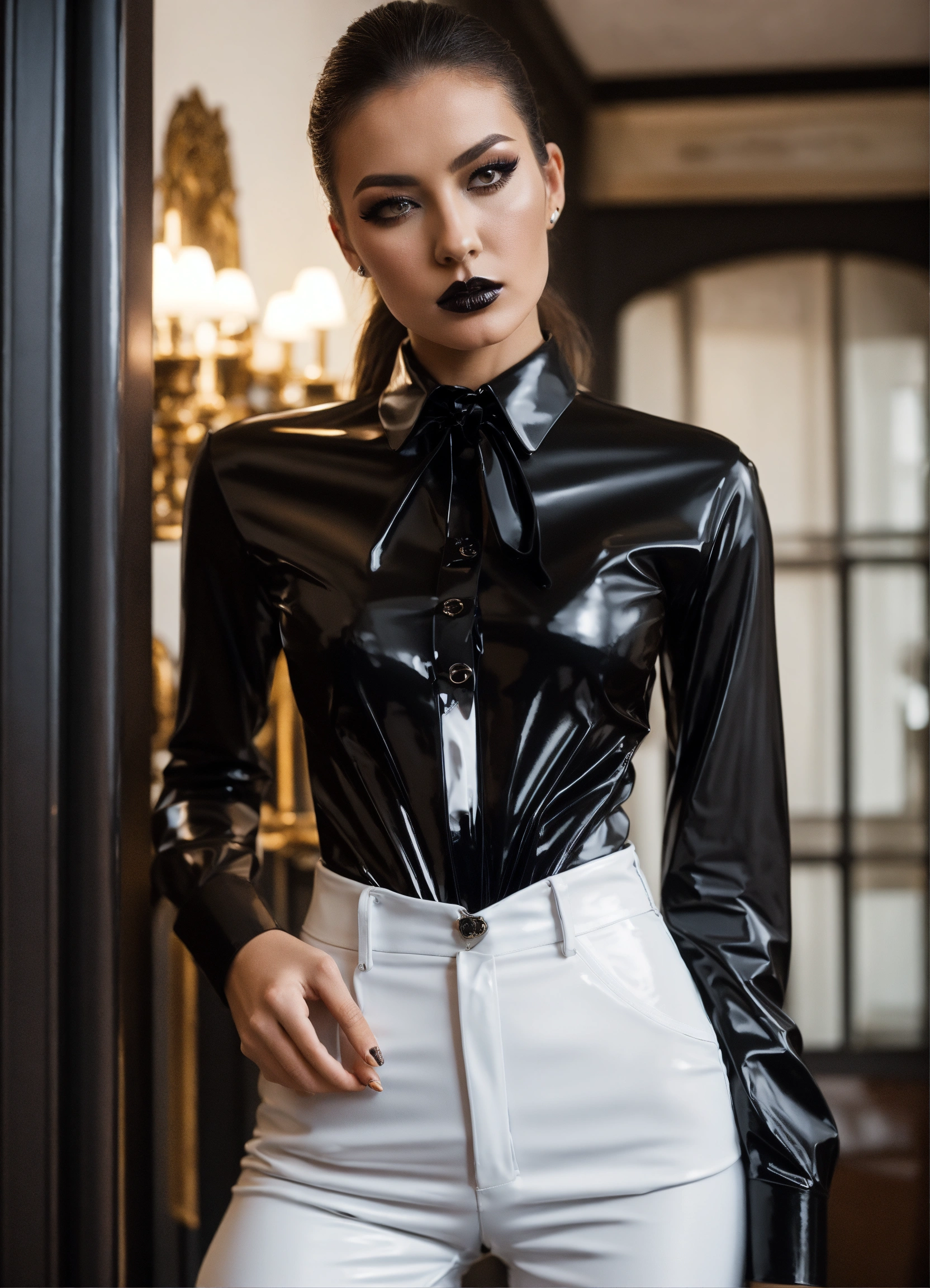 Stunning french seductress woman fashion model, black straight high ponytail, black pvc corset an pvc pants, white office shirt and black necktie, mansion room, white office shirt collar, eyeliner, arrogant look