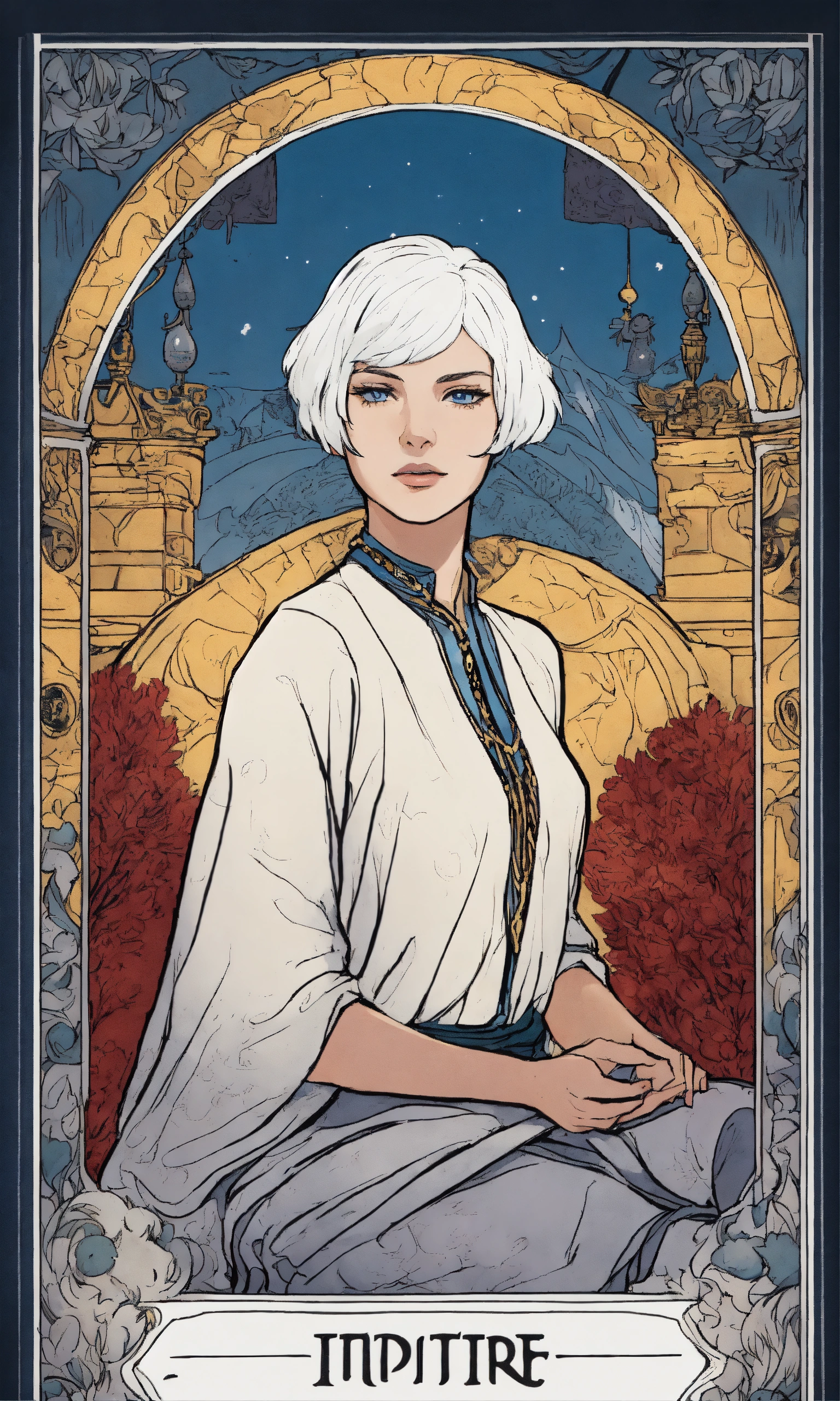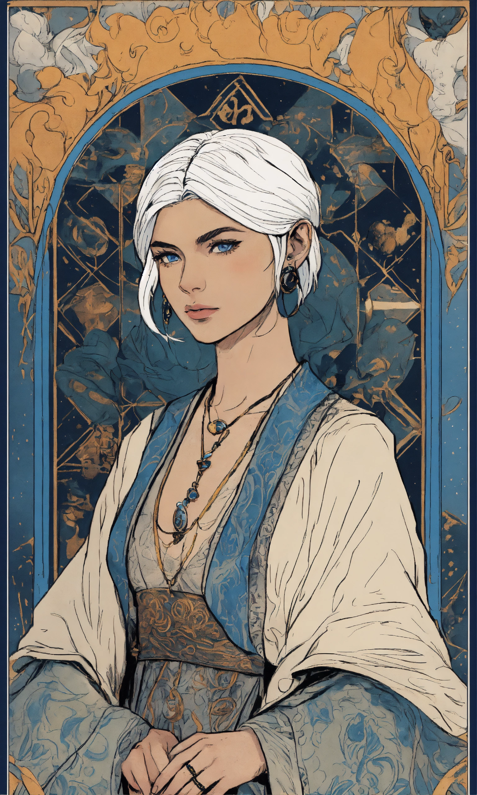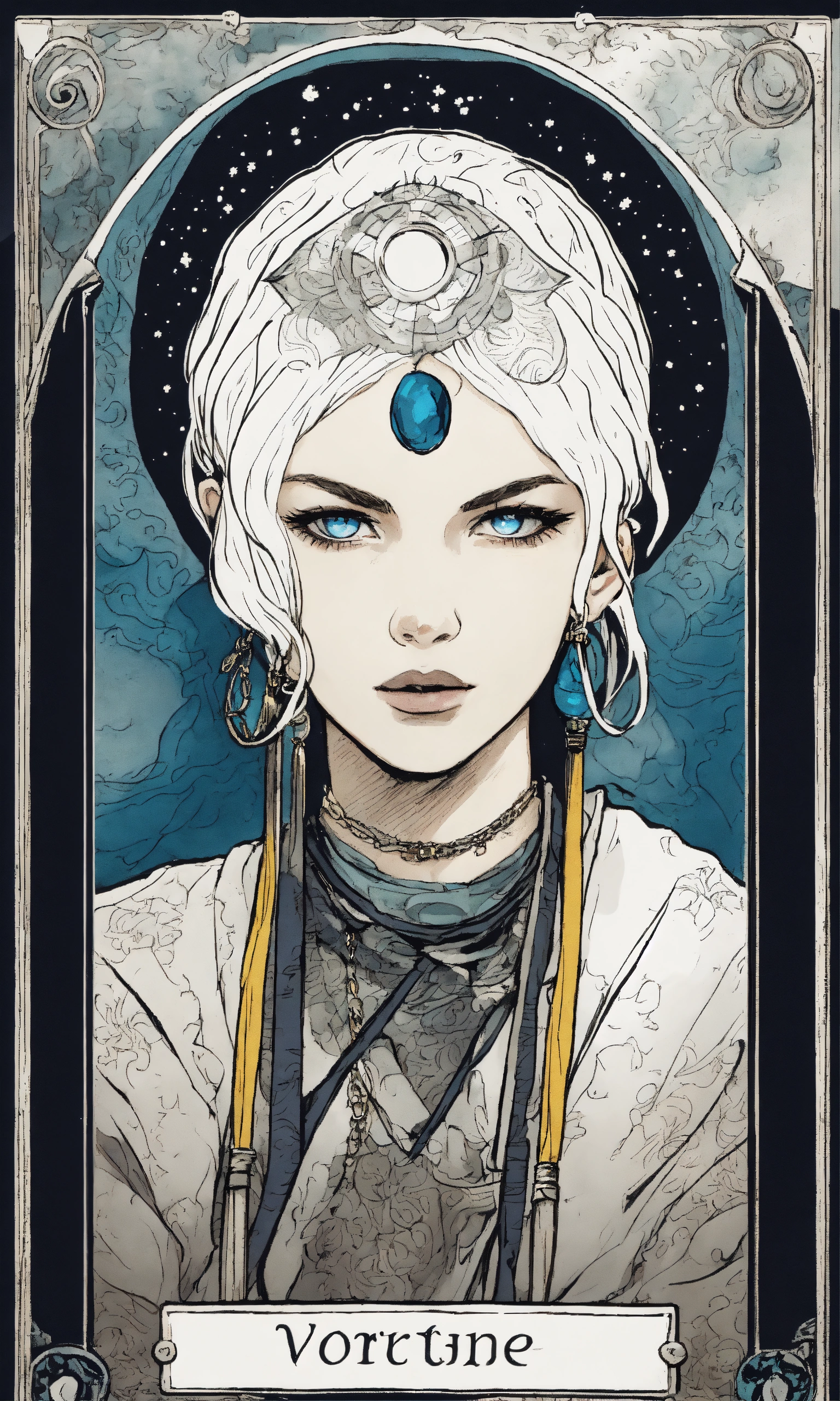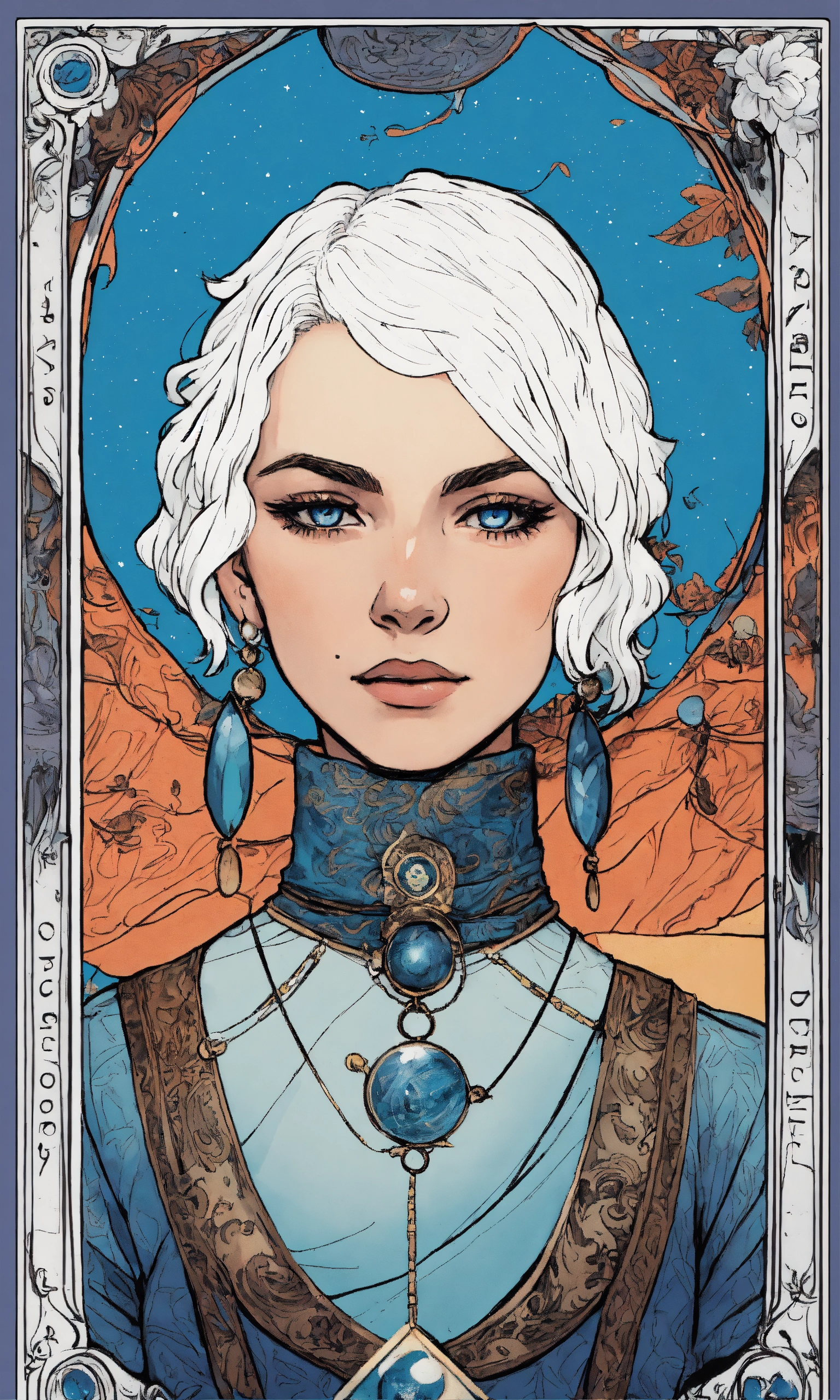 A tarot card of an impish and young woman with short white hair, bang, square face, blue eyes. fortune teller card. ink and pen. graphic novel style.