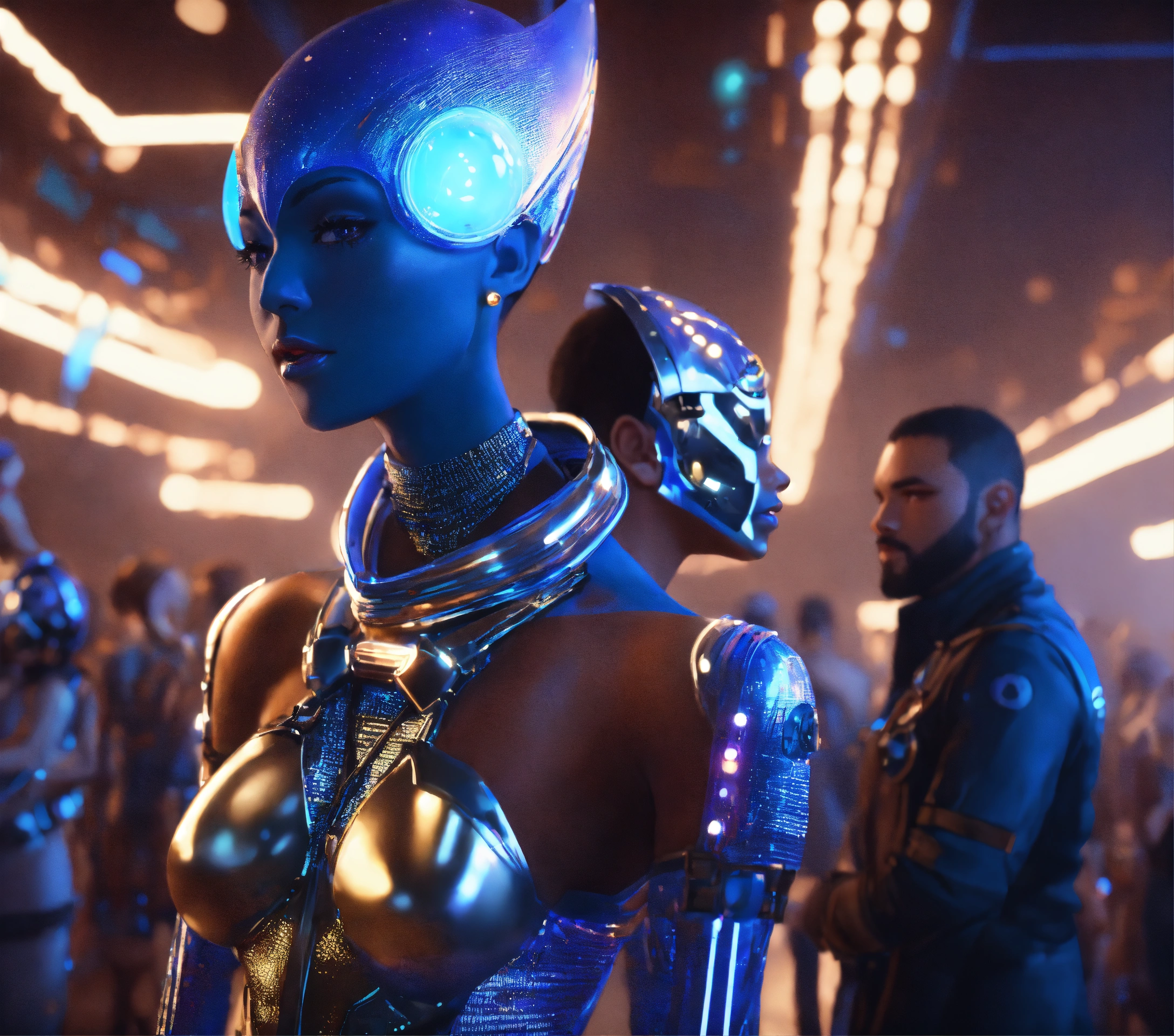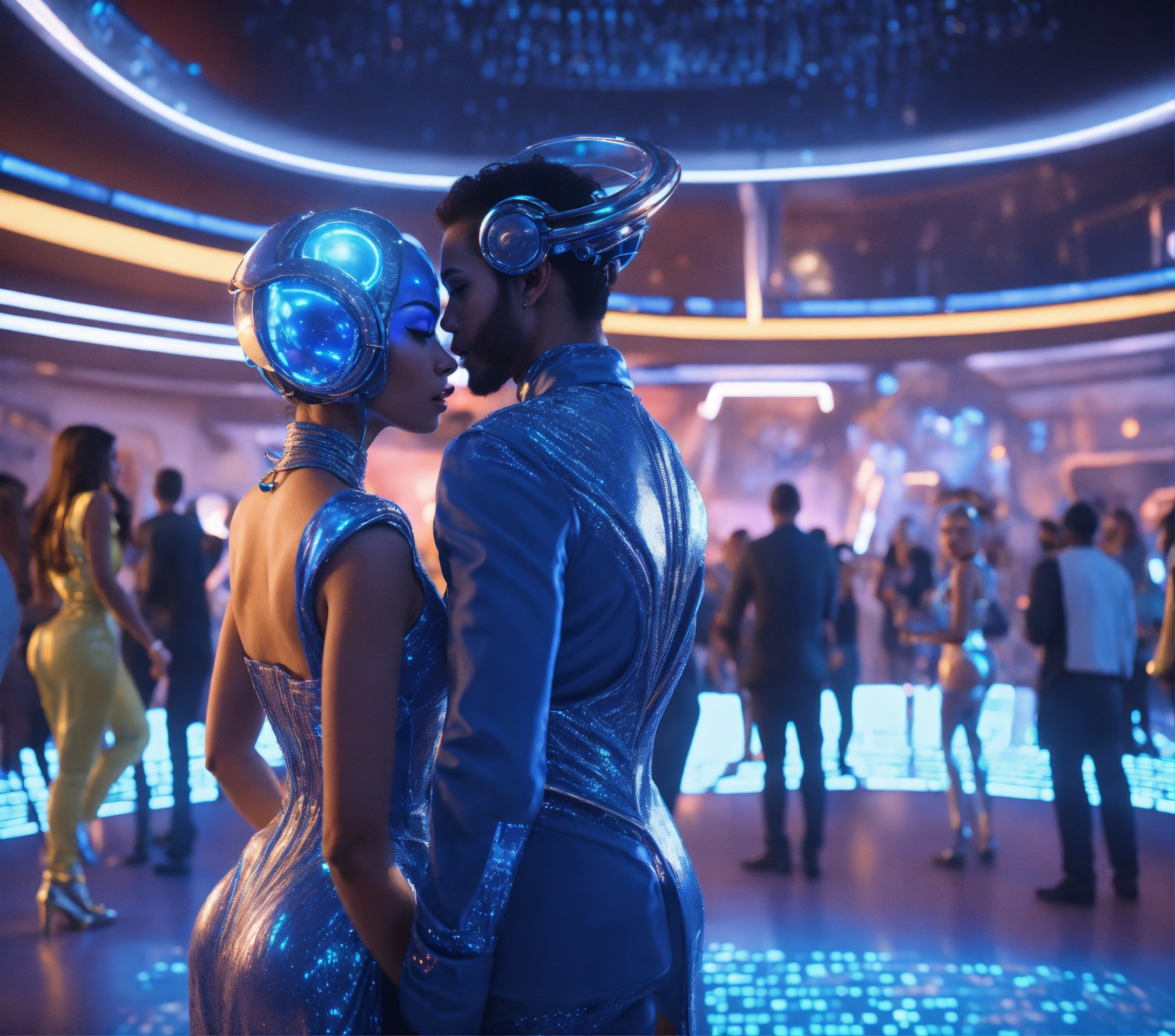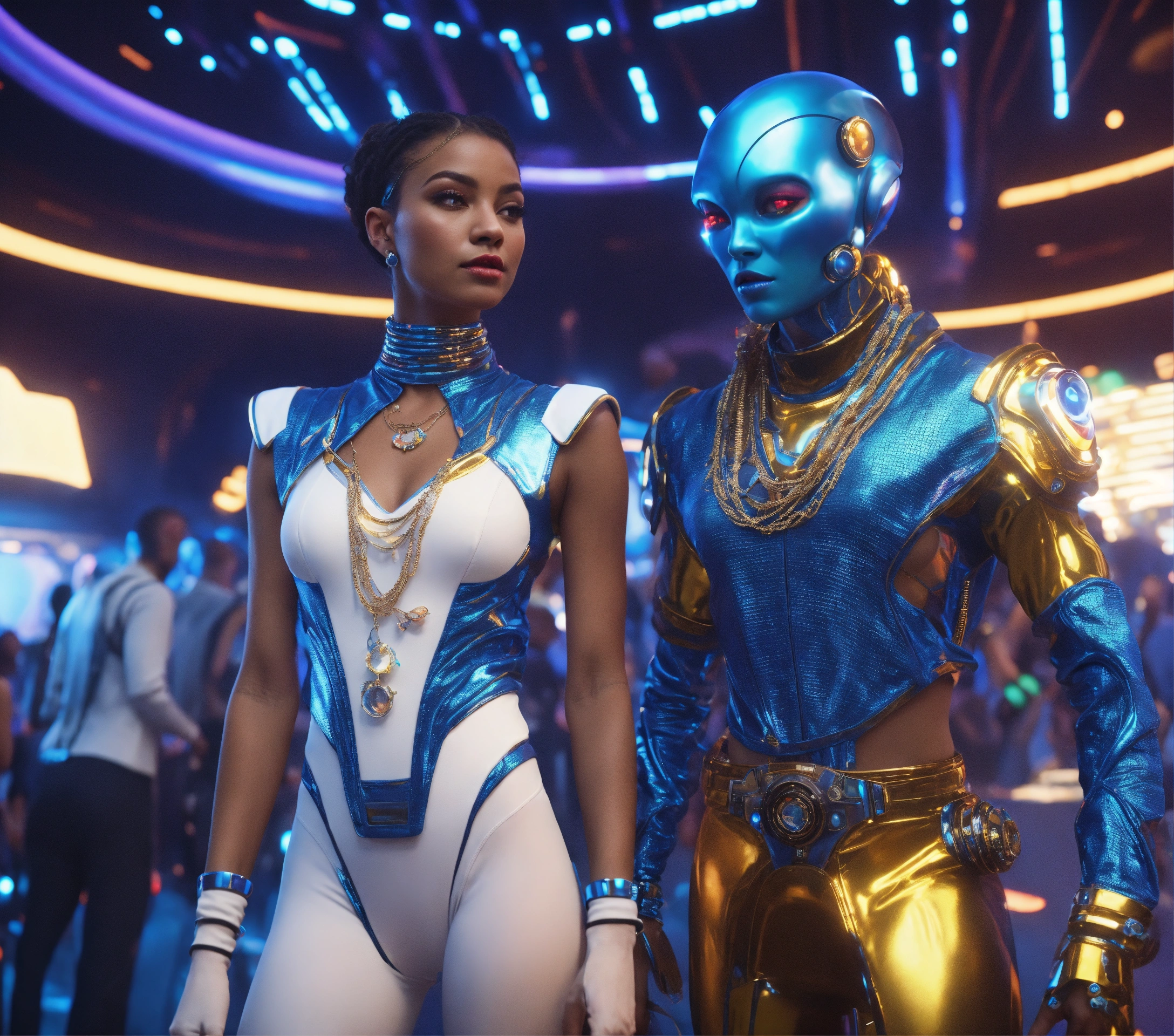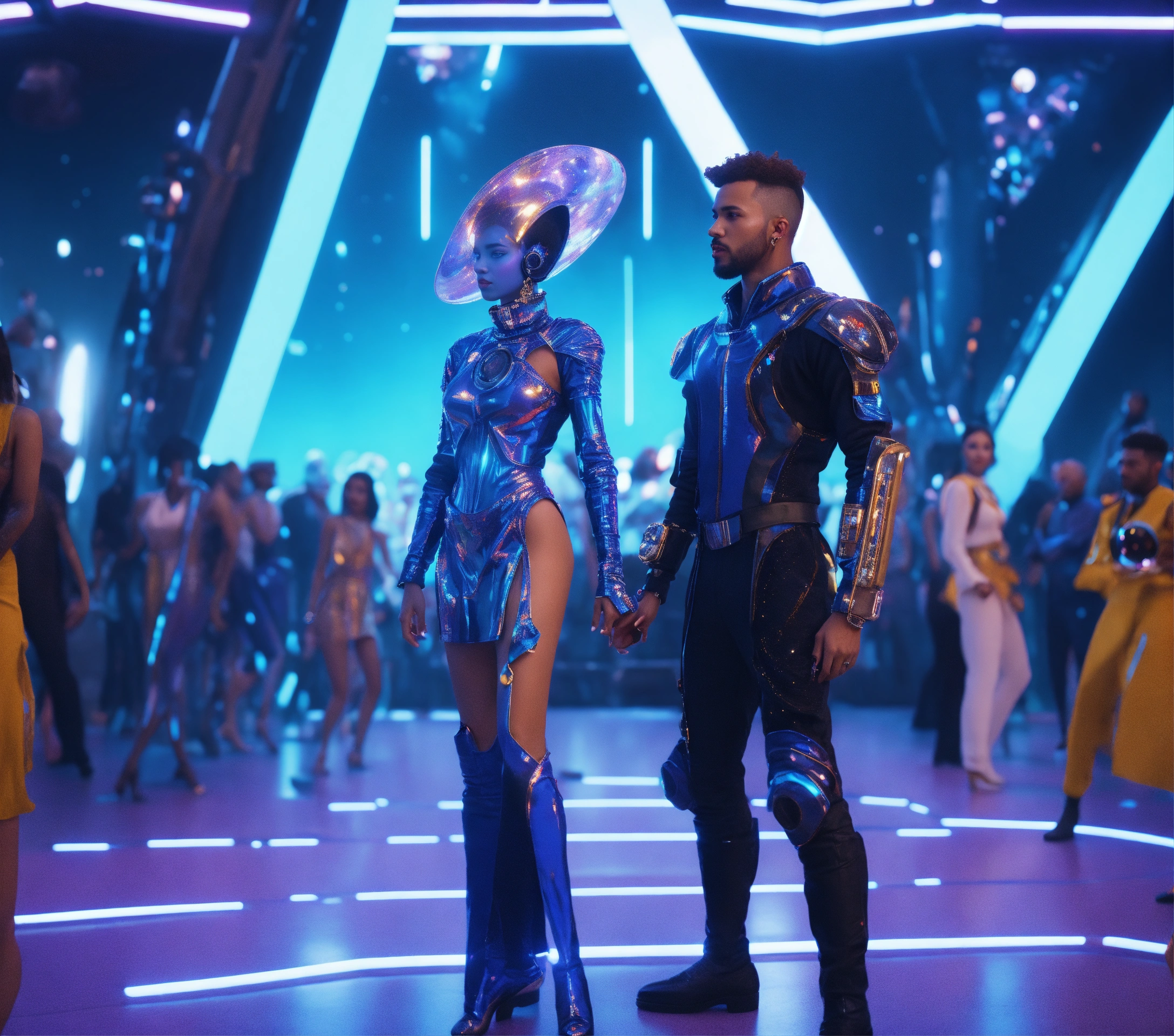 Zoom out from a beautiful blue alien girl and handsome guy wearing space fashion with alot of jewelry with beautiful women in funky futuristic royal attire dance and socialize at a packed jazz concert on a spaceport, realistic, futuristic, sci fi, 8k, unreal engine, pixar
