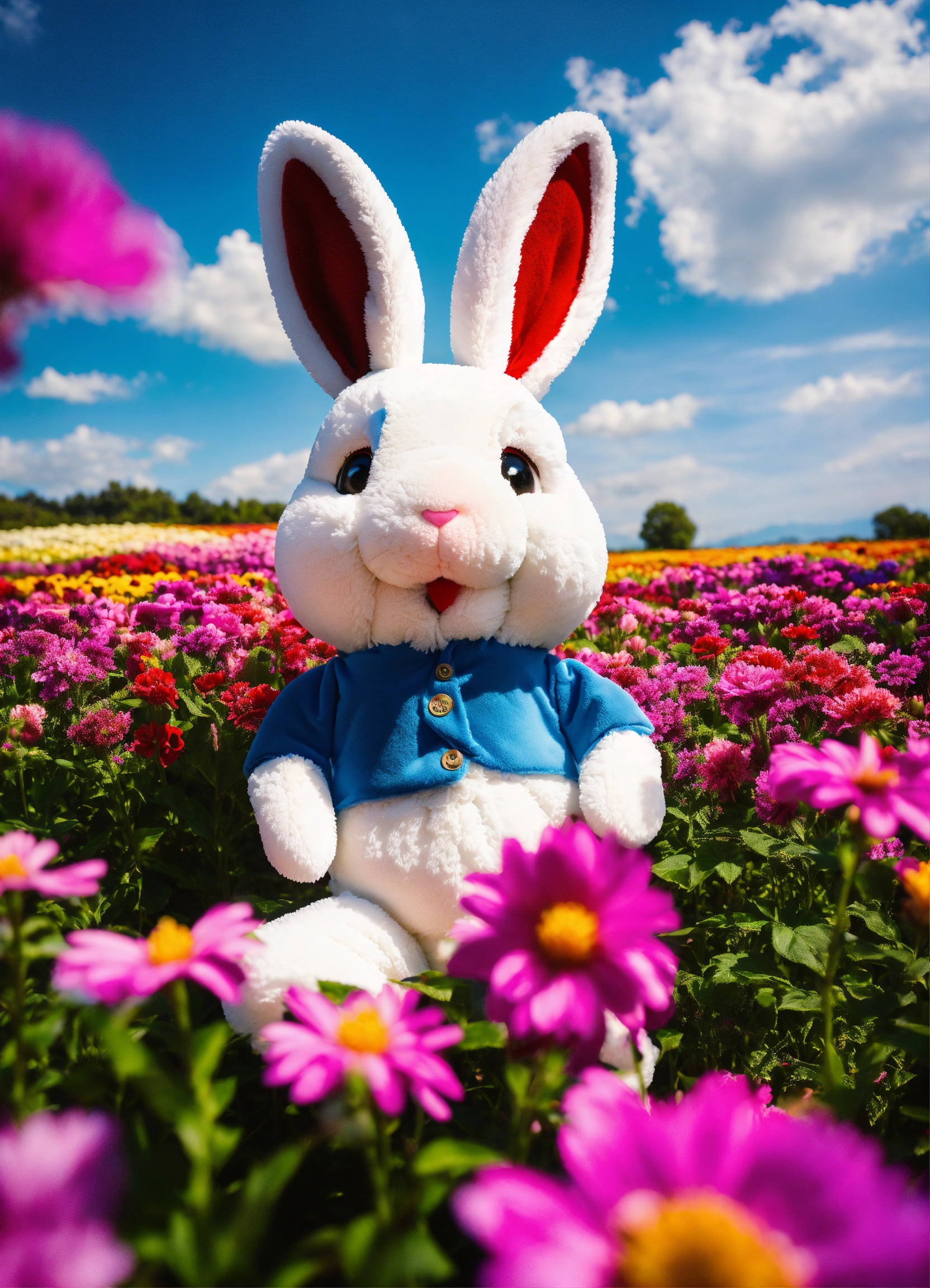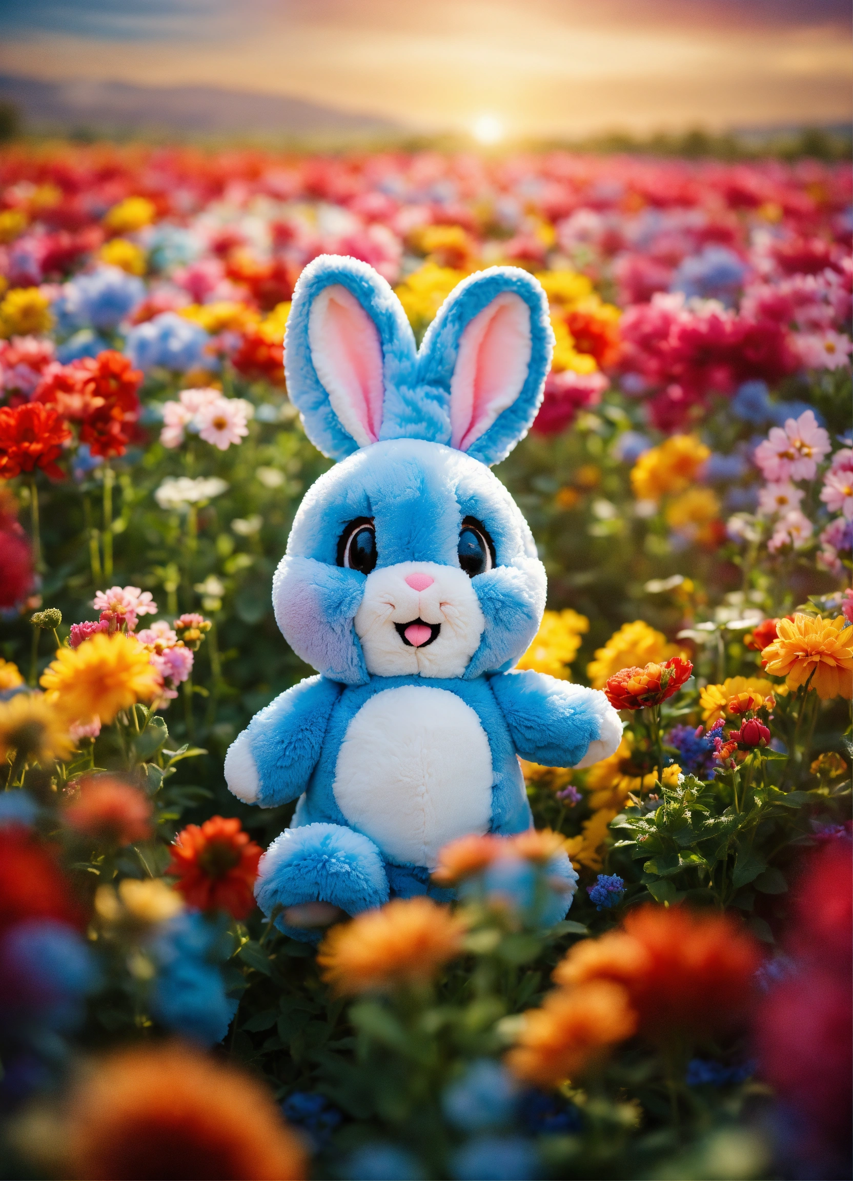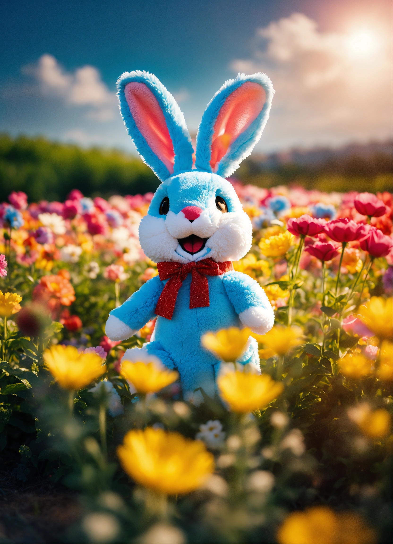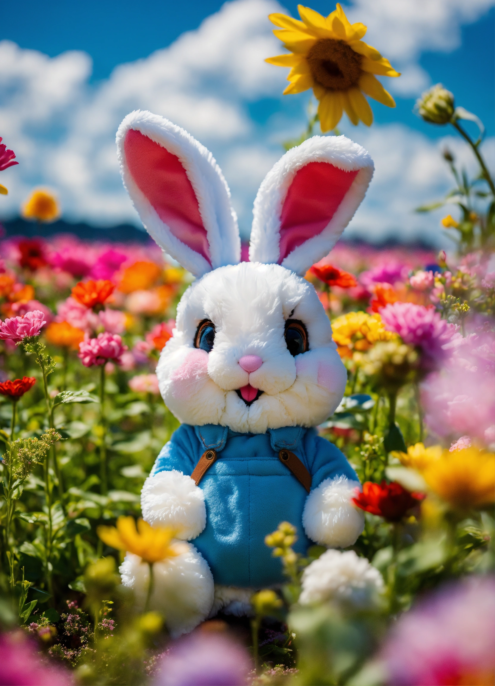 Happy funny bunny rabbit plushie, happy, surrounded by colorful flowers in a massive flower field, beautiful blue sky, perfect lighting, moody hues, 8k, ultra hd
