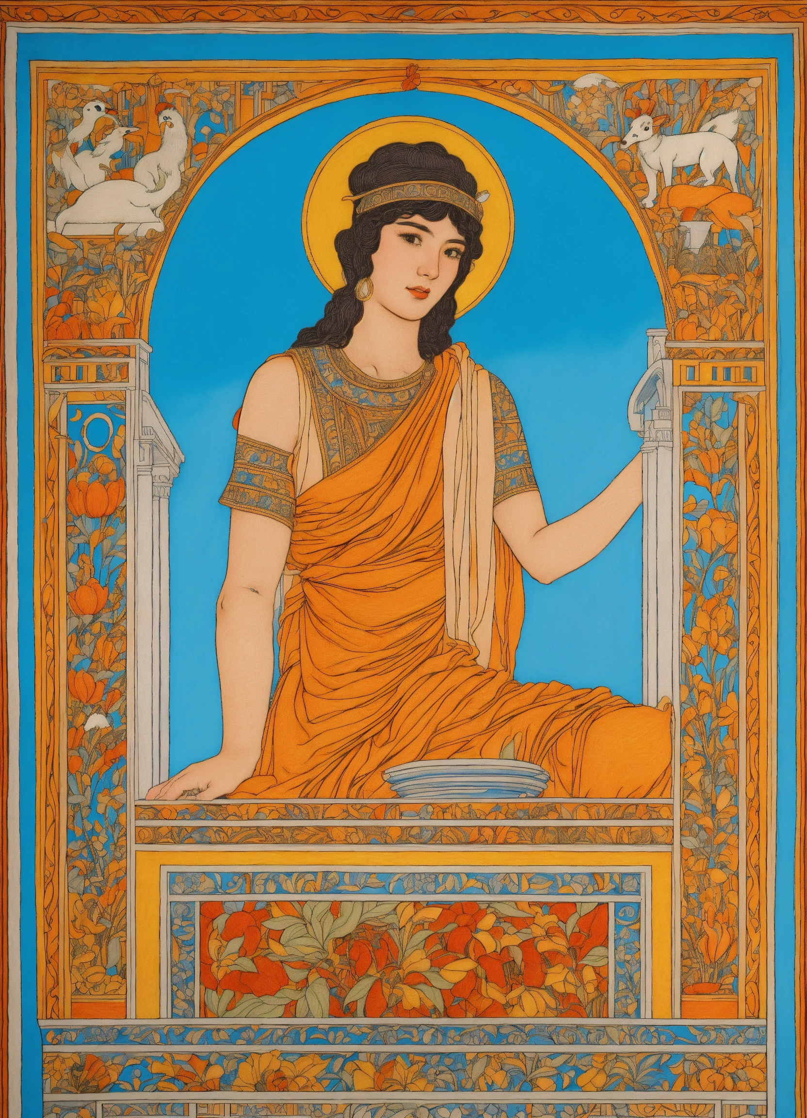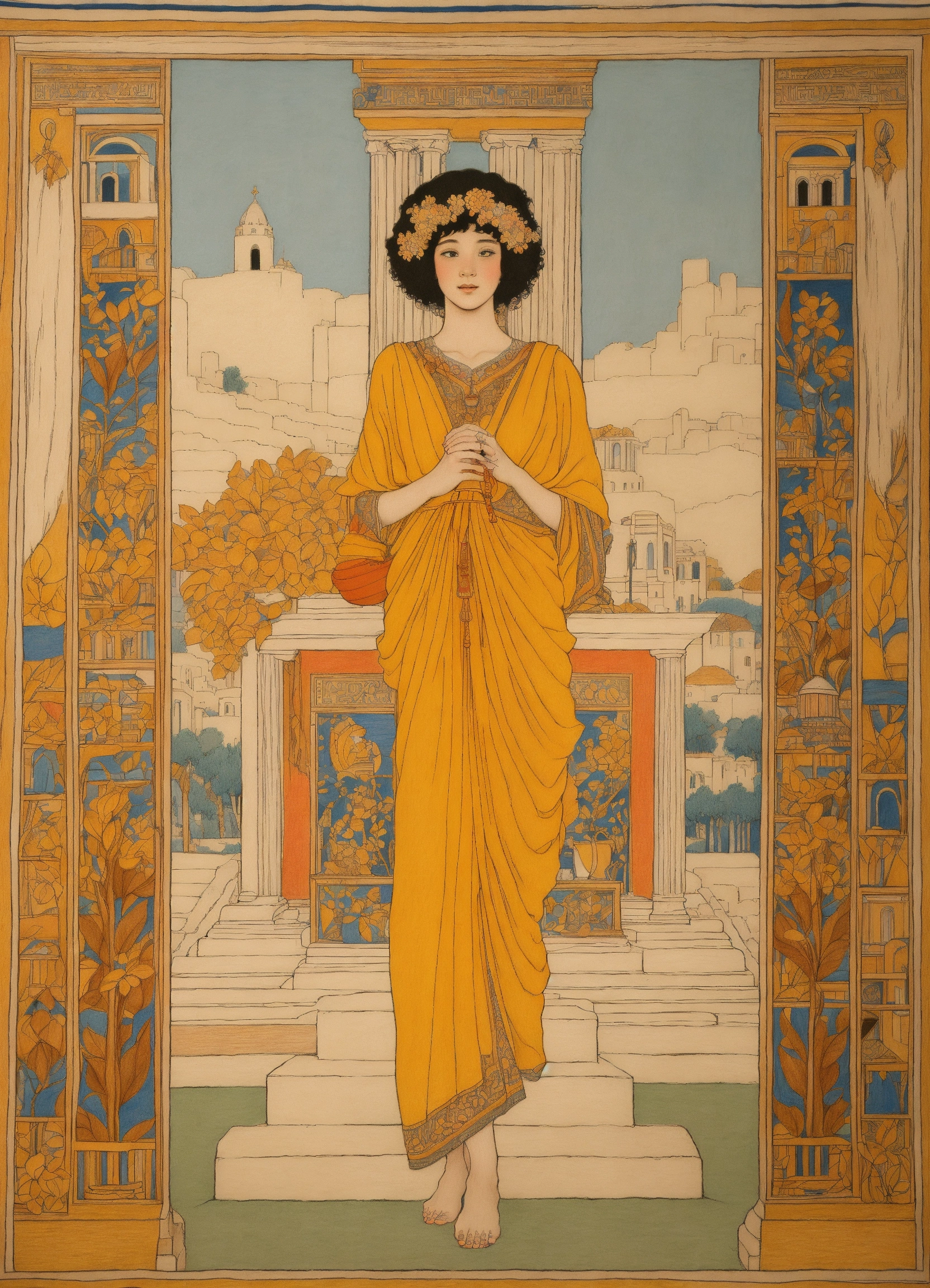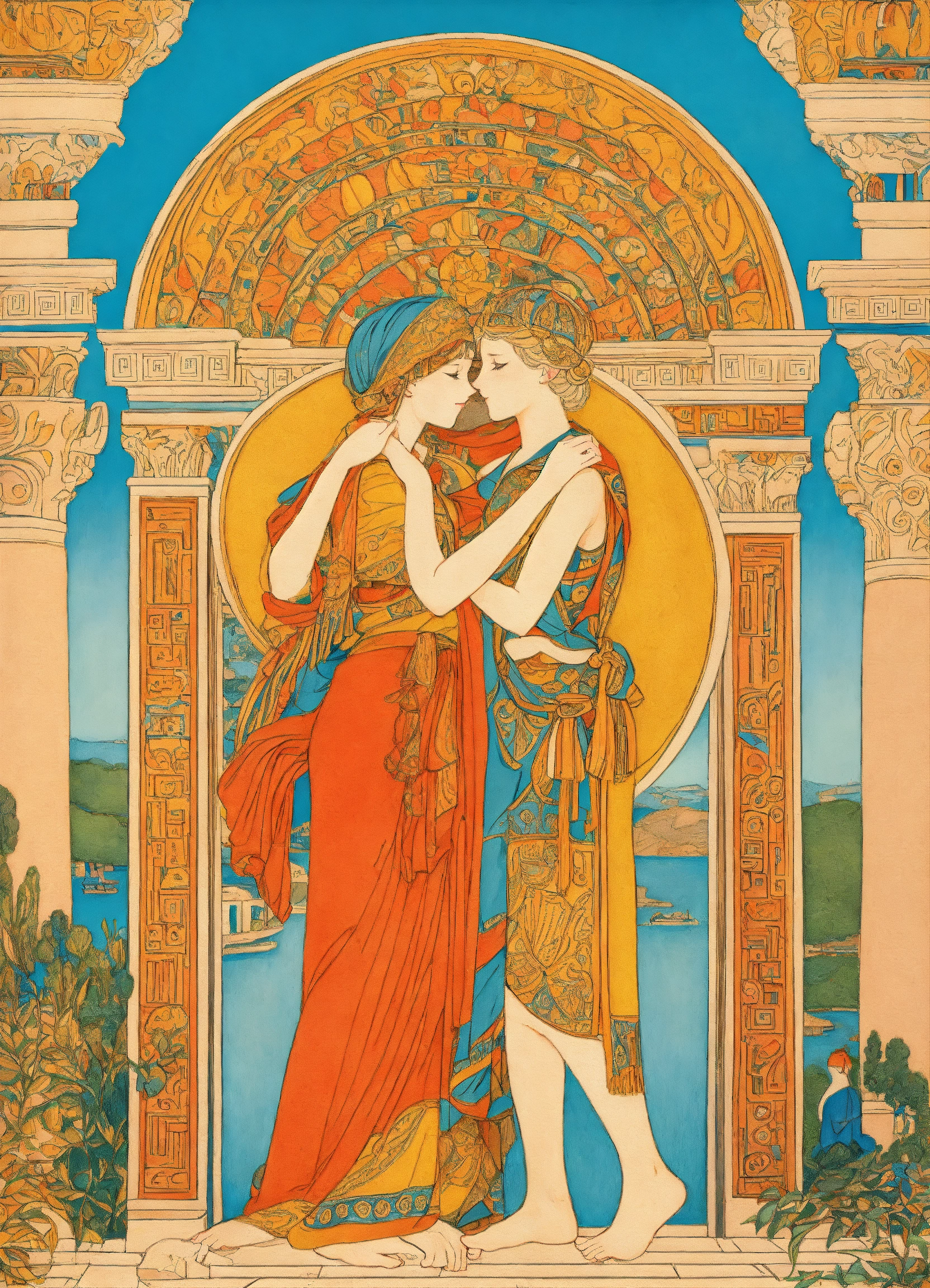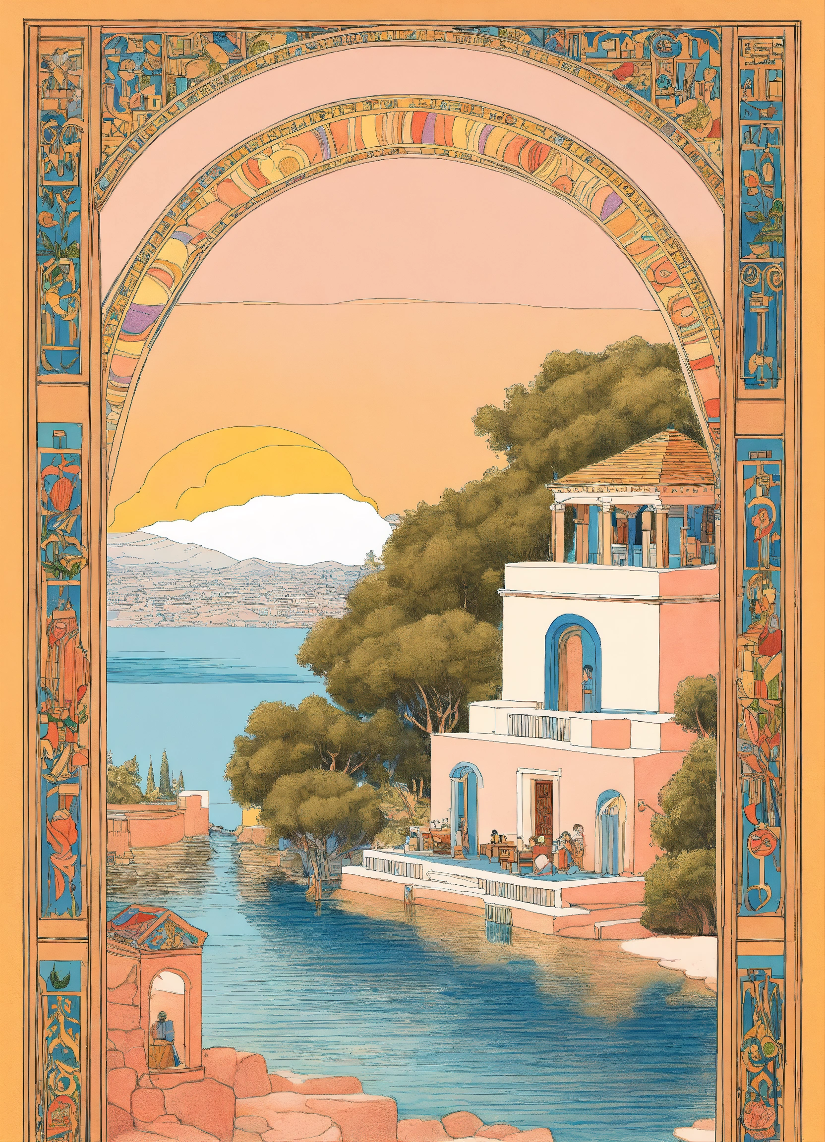 Traditional greek art drawing the perfect harmony in the human being. line drawing, clean clear lines, coloring book style, bright colors, intricate details, greek tapestry elements, elegant, magical, serene, fine details, pastel pencils, winsor mccay style