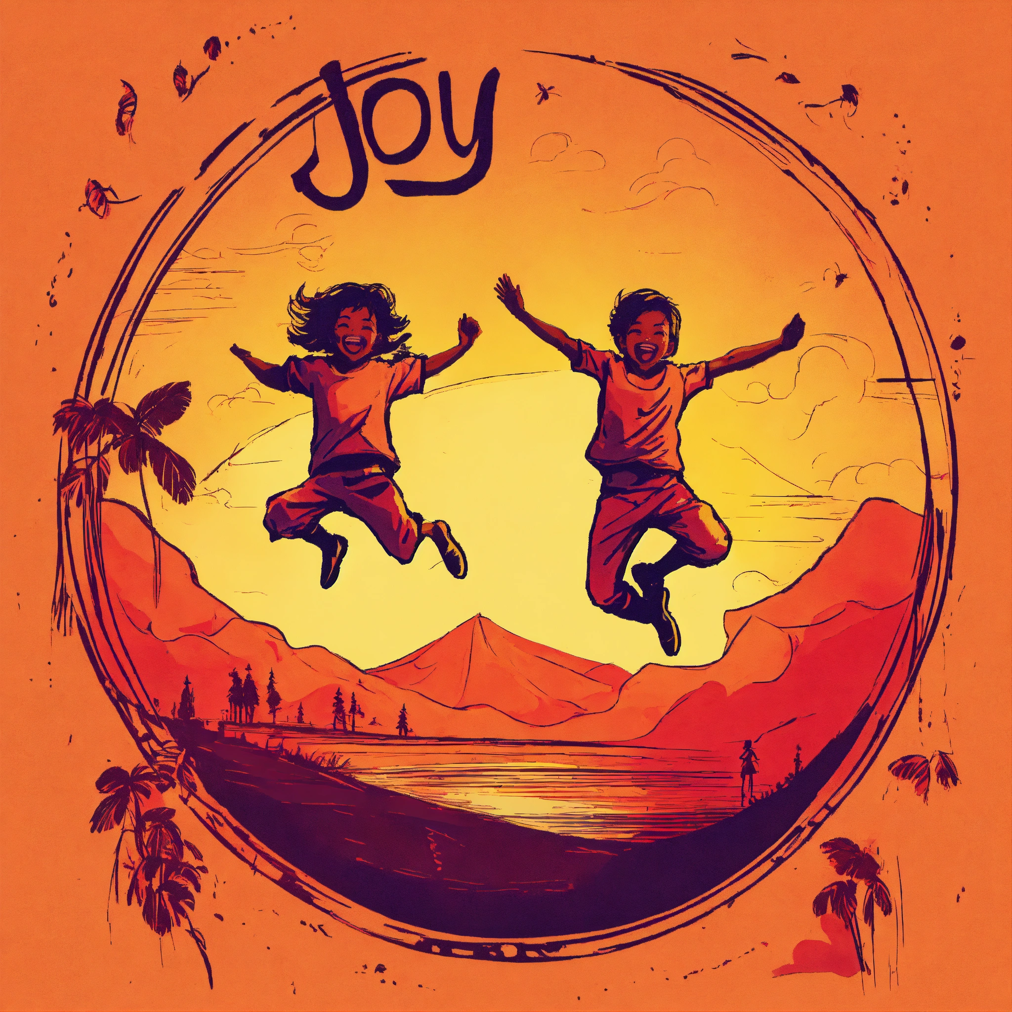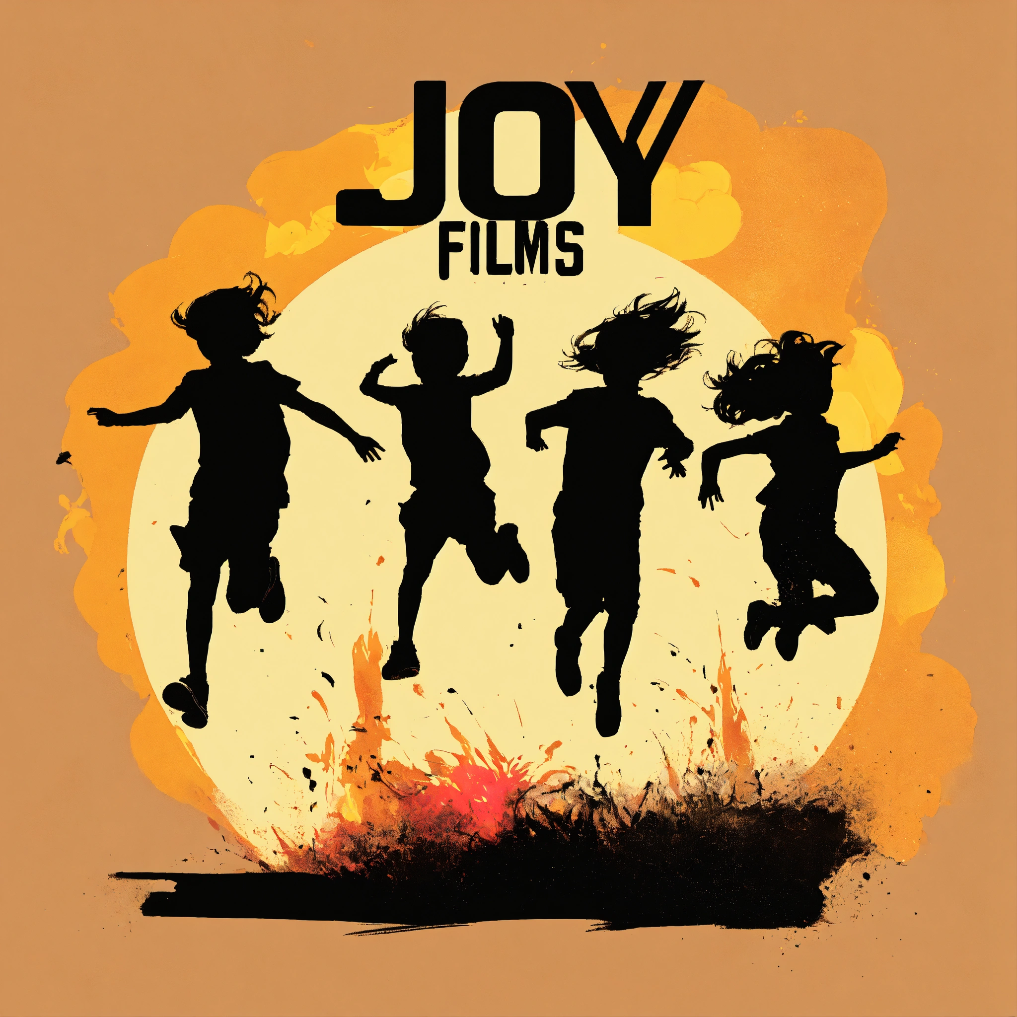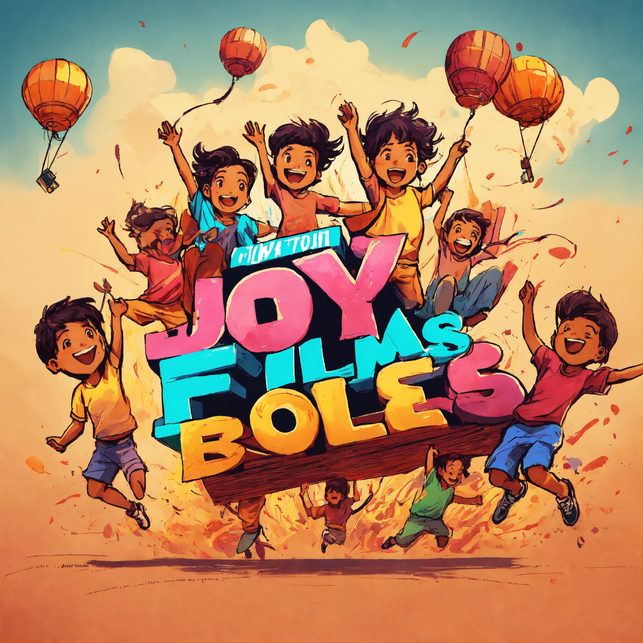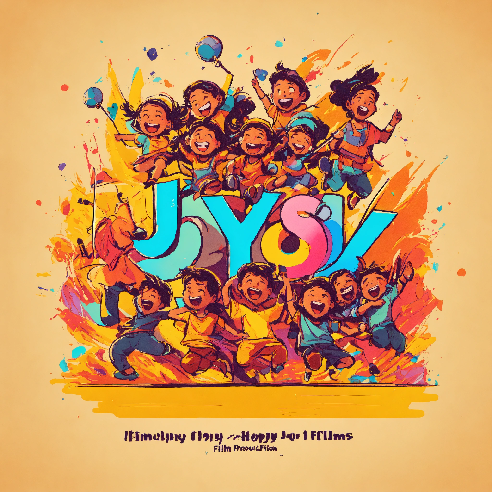 Film production company logo design, text as "joy films", illustration of indian children jumping happy motion, big and bold text "joy films", vibrant, high detail ink sketch, movie making elements, more space for text, ink art emblem design