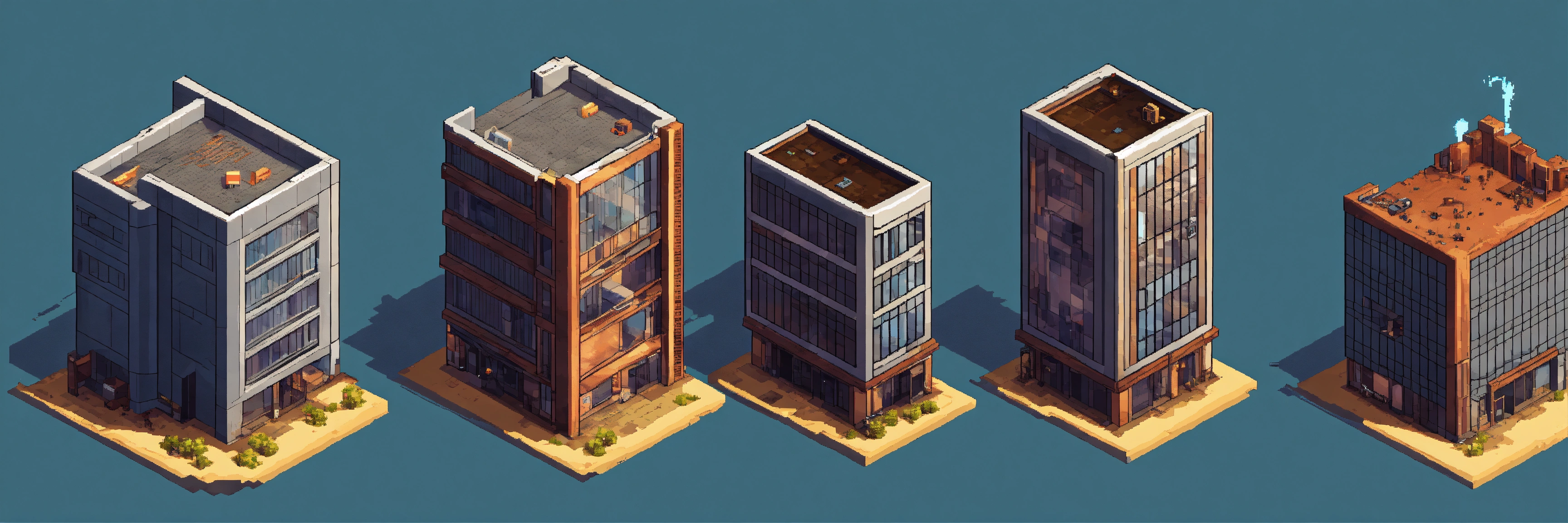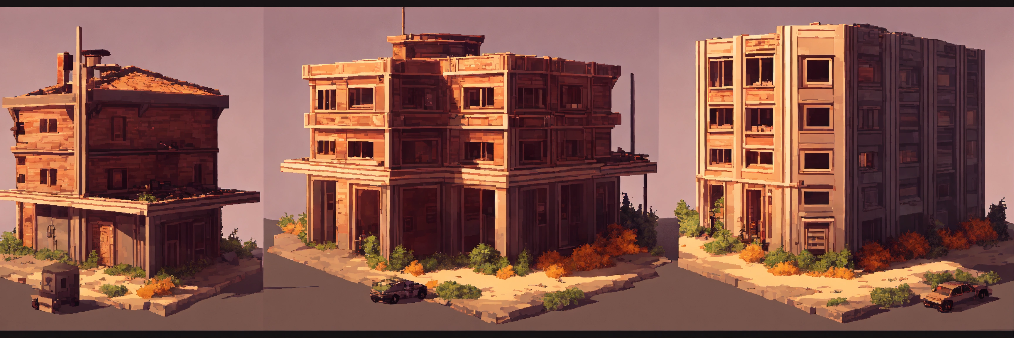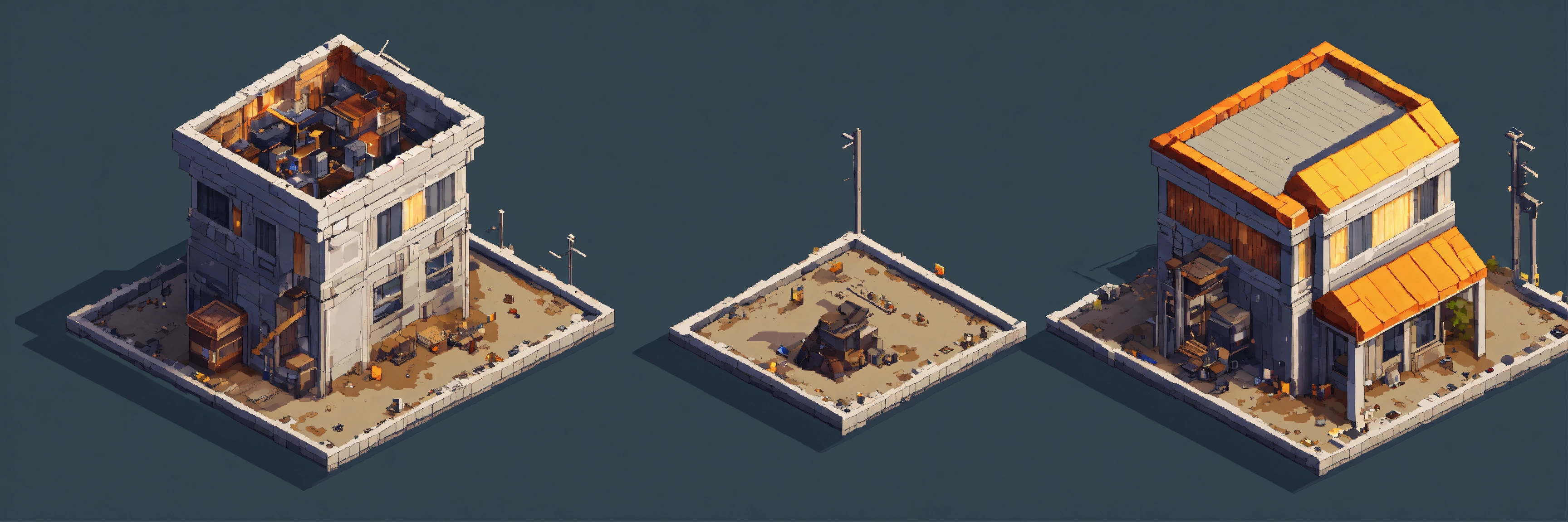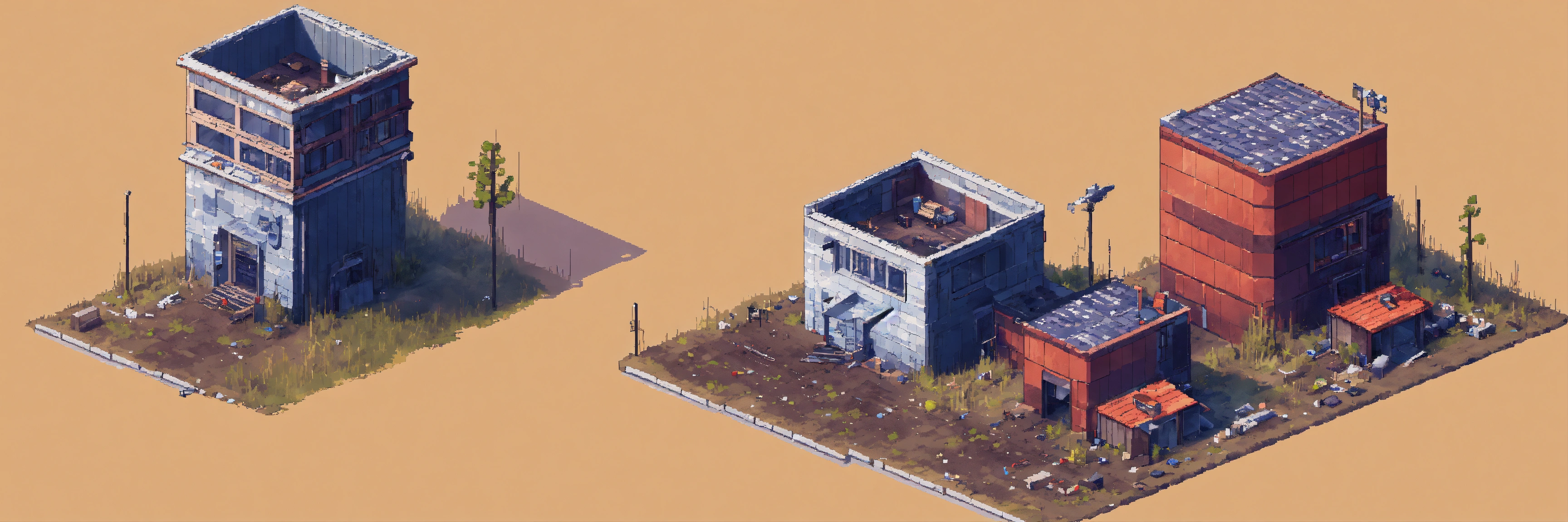 Isometric. short to tall upgrade progression of a post-apocalyptic single defense building after apocalypse. isolated, plain background. top down isometric mobile game extremely simplistic pixel art. low res blocky.