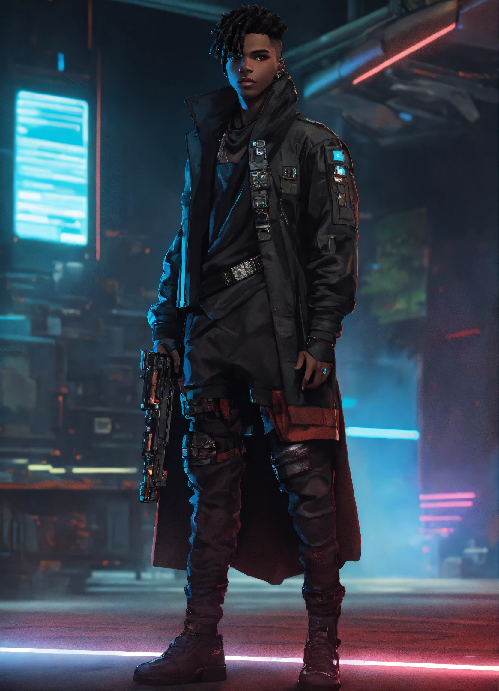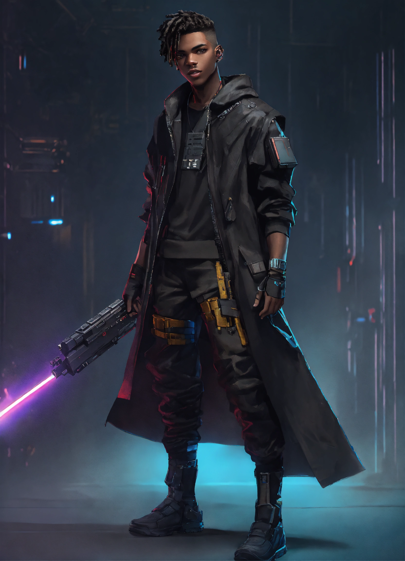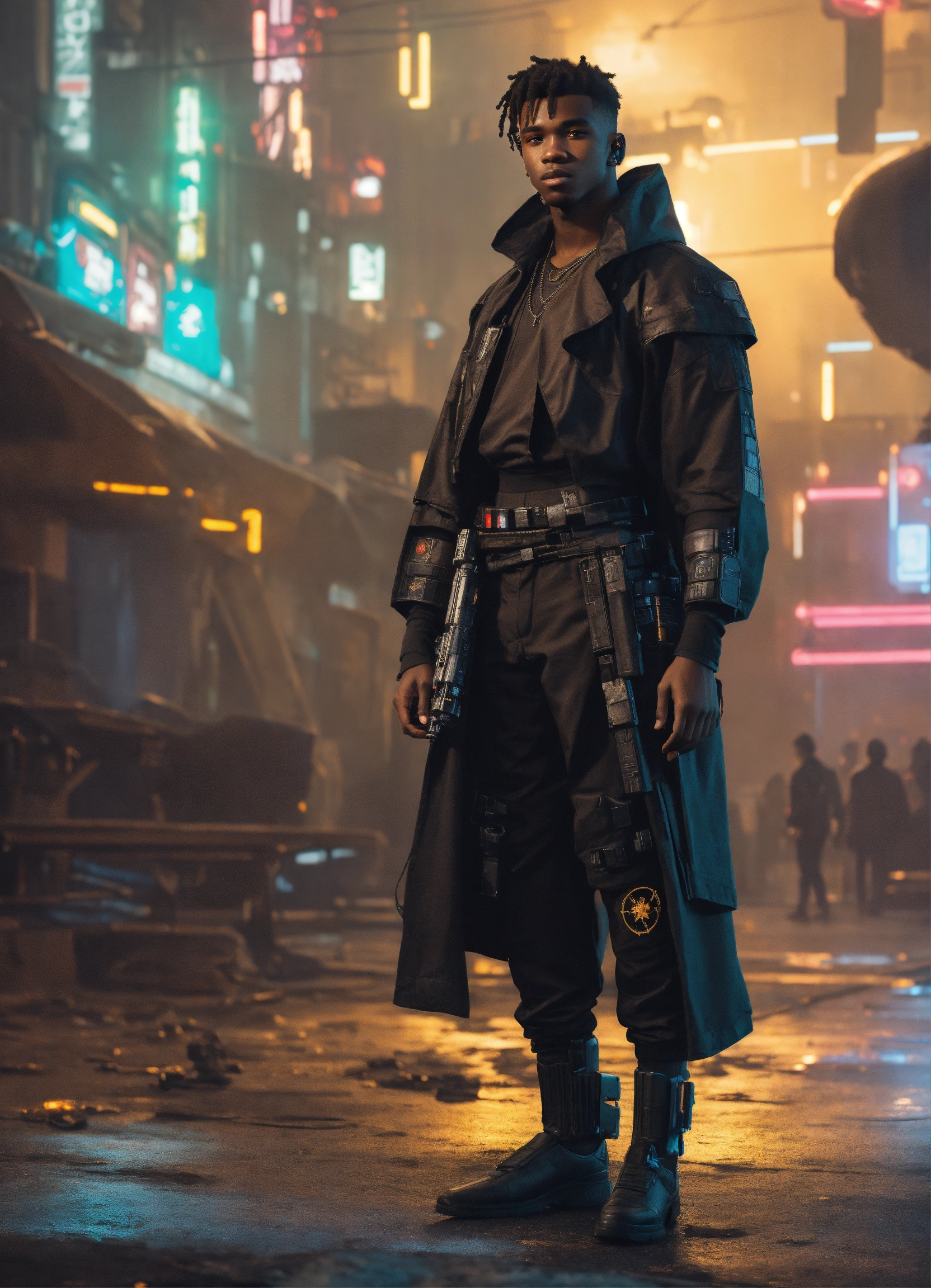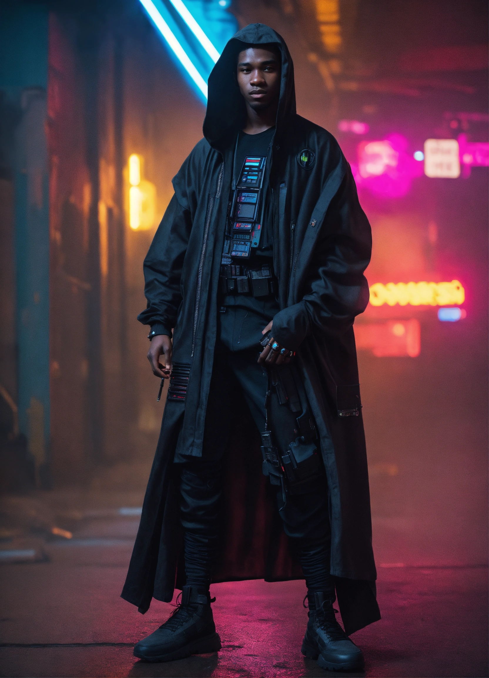 Full body photo of a black cyberpunk 18-year-old man wearing dark draped clothing, cool pallet, epic, alternative history, star wars type clothing, concept art