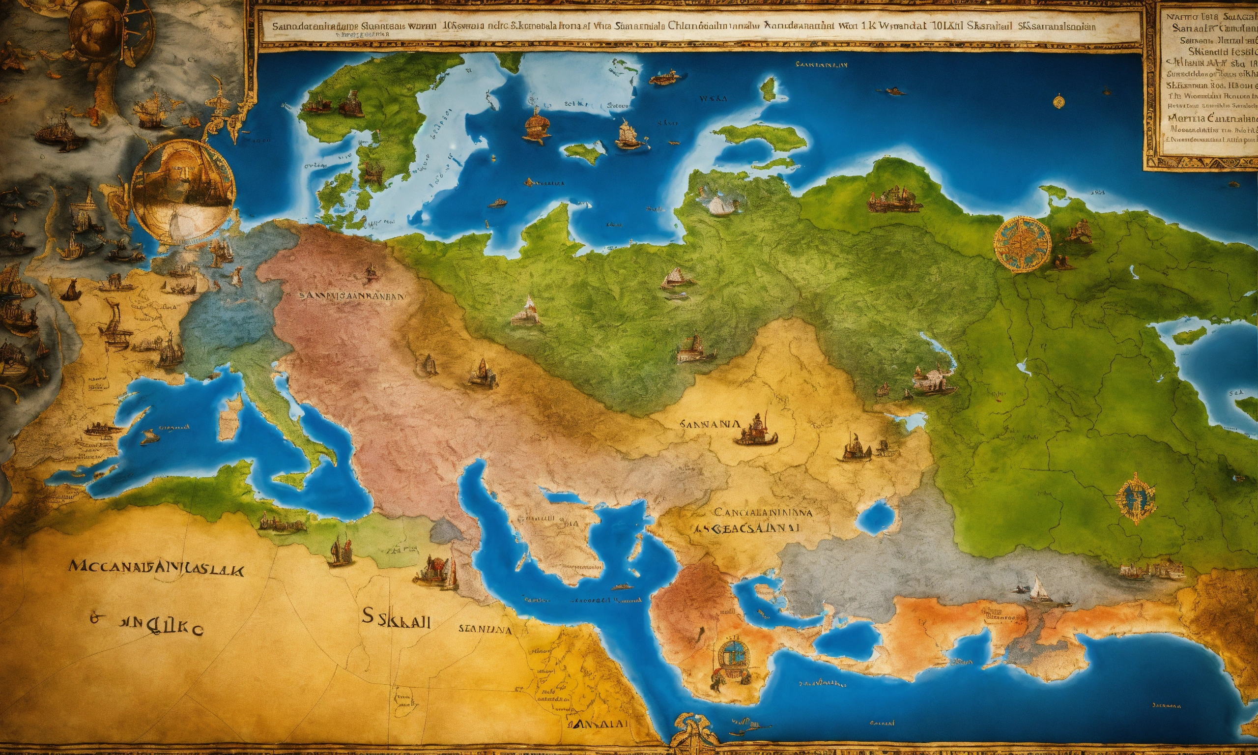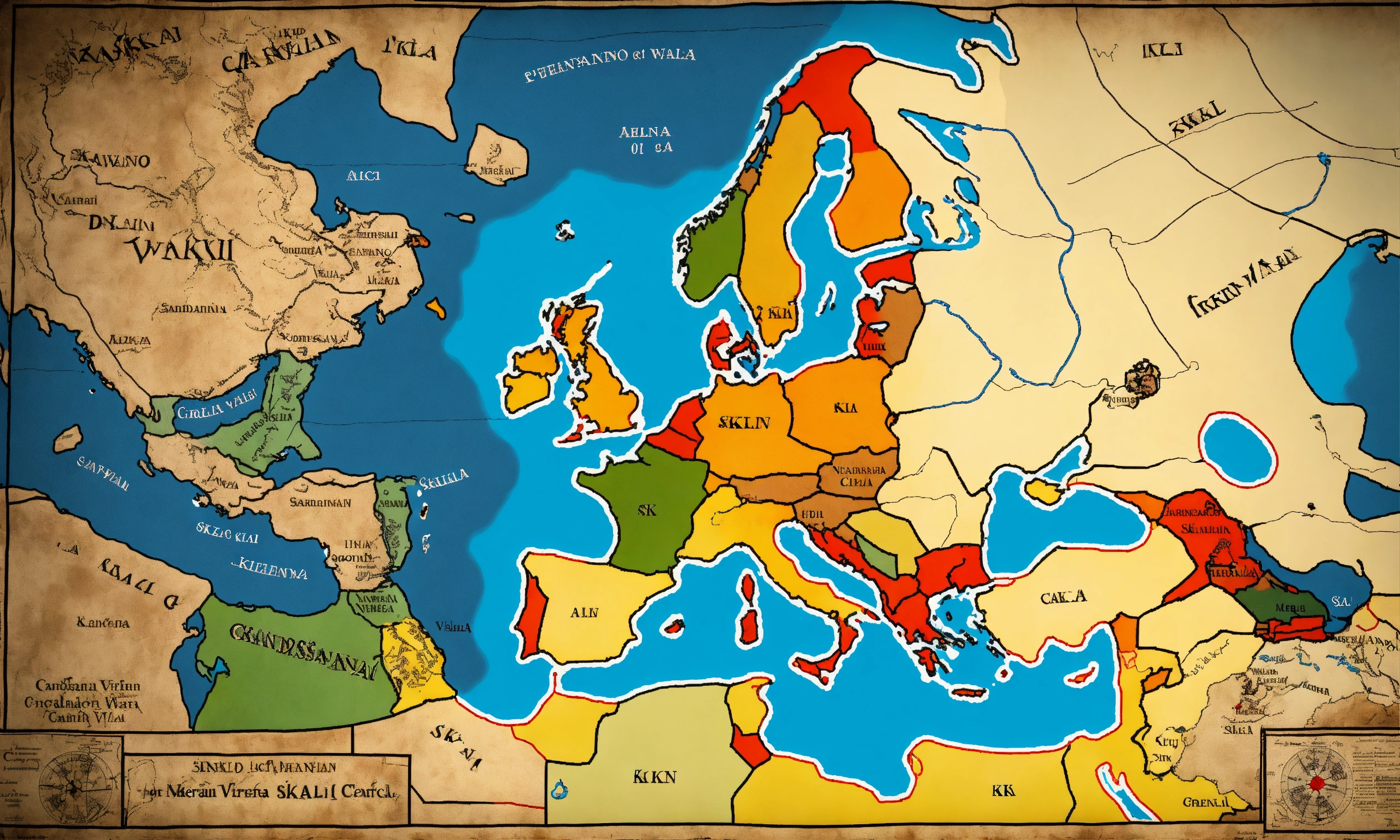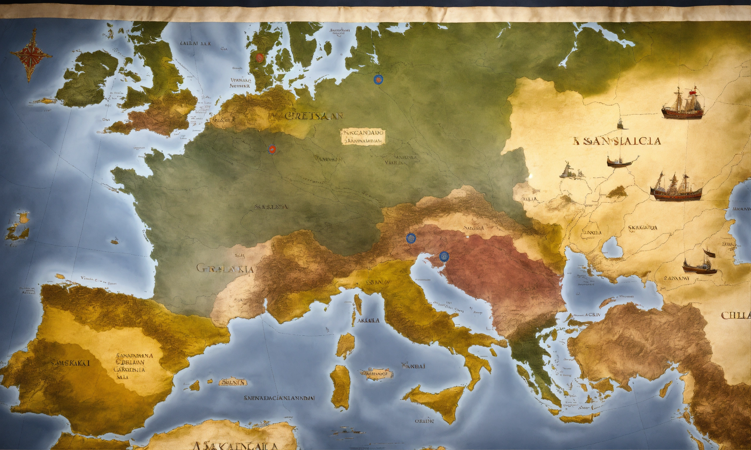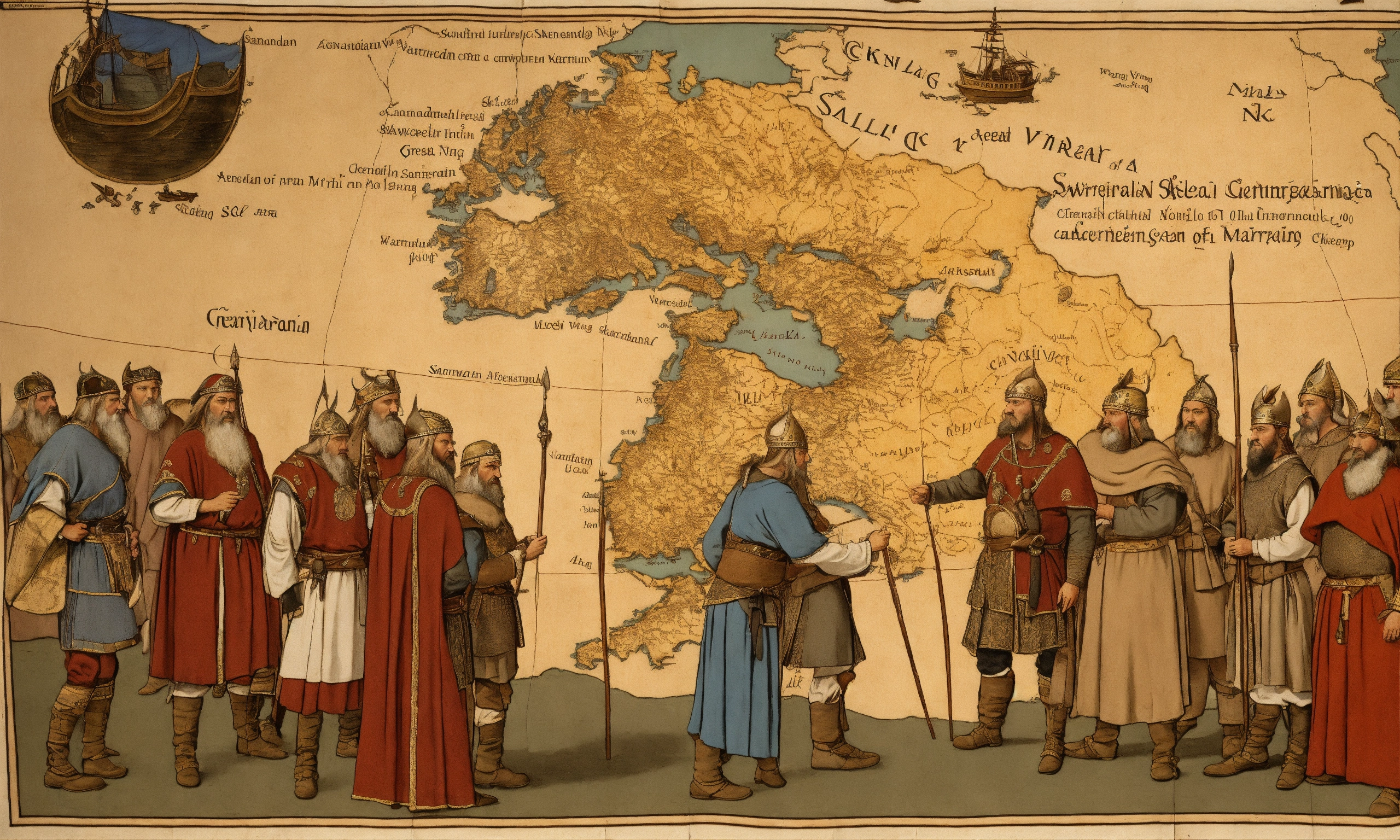 Meeting of scandinavian war chiefs in the 10th century around a map of the mediterranean in the great skali viking with a realistic style