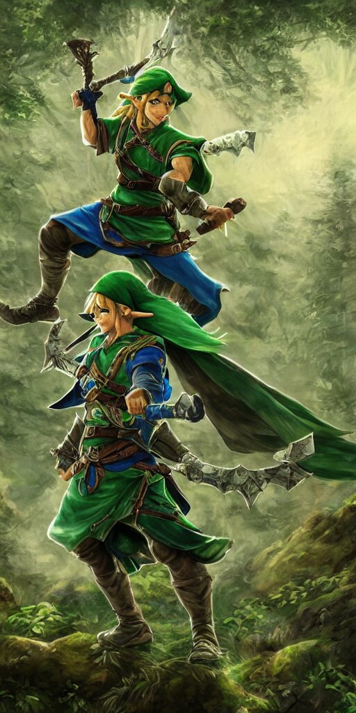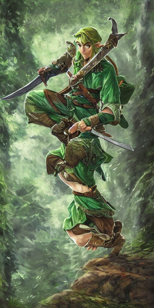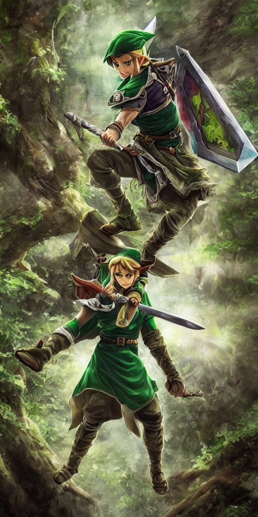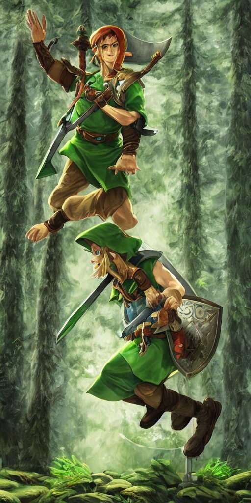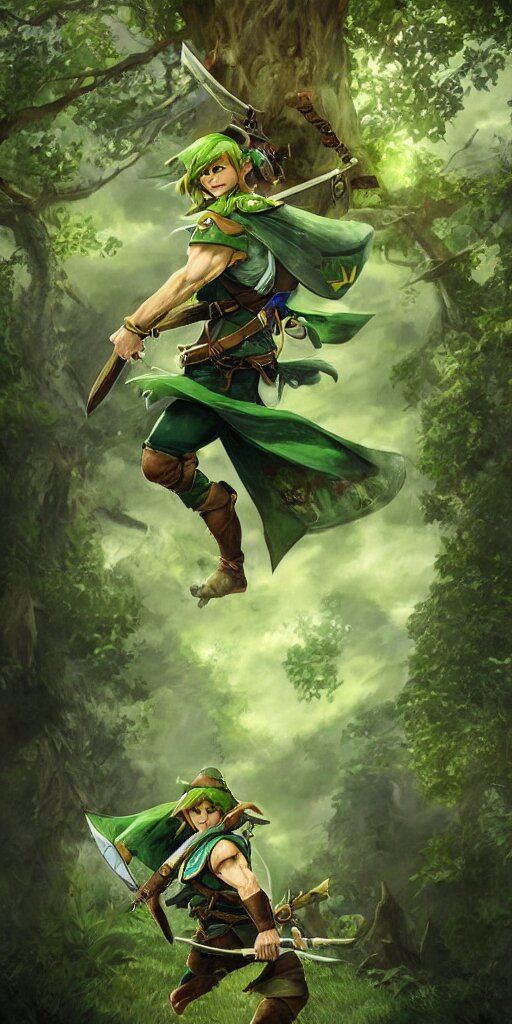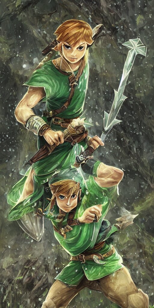 Link dressed in traditional green tunic and cap holding the master sword and hylian shield in dynamic fighting pose, mystical forest background, dark skies, intricately detailed, finely textured, cgsociety