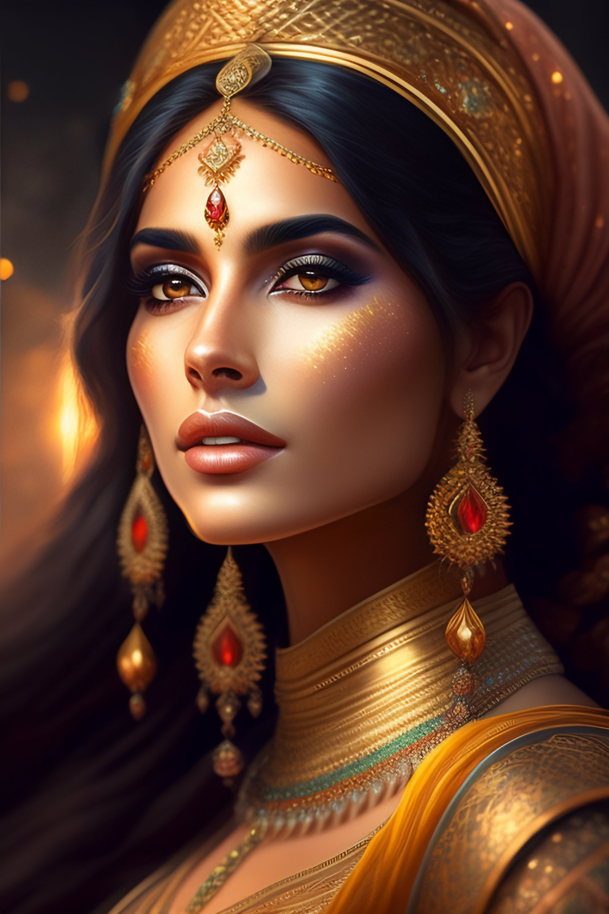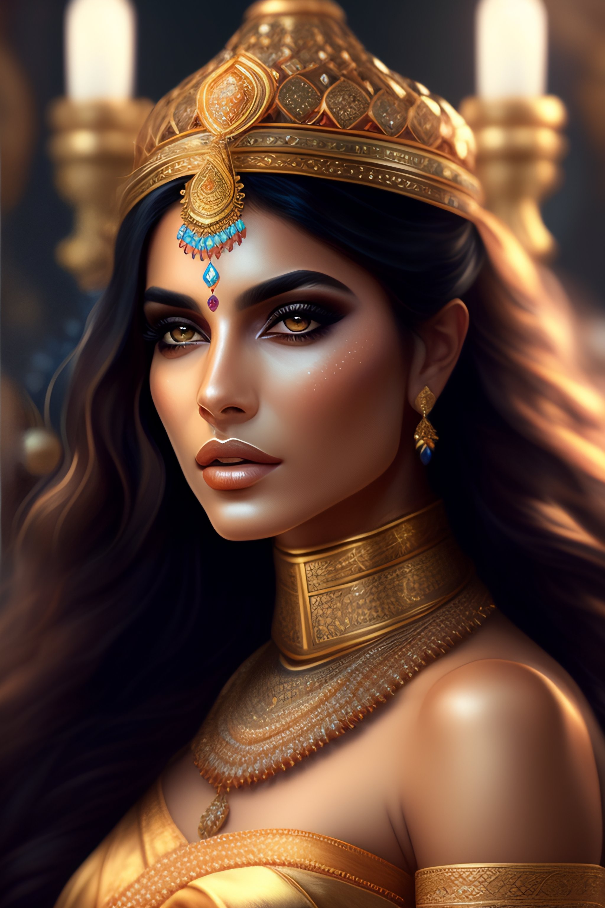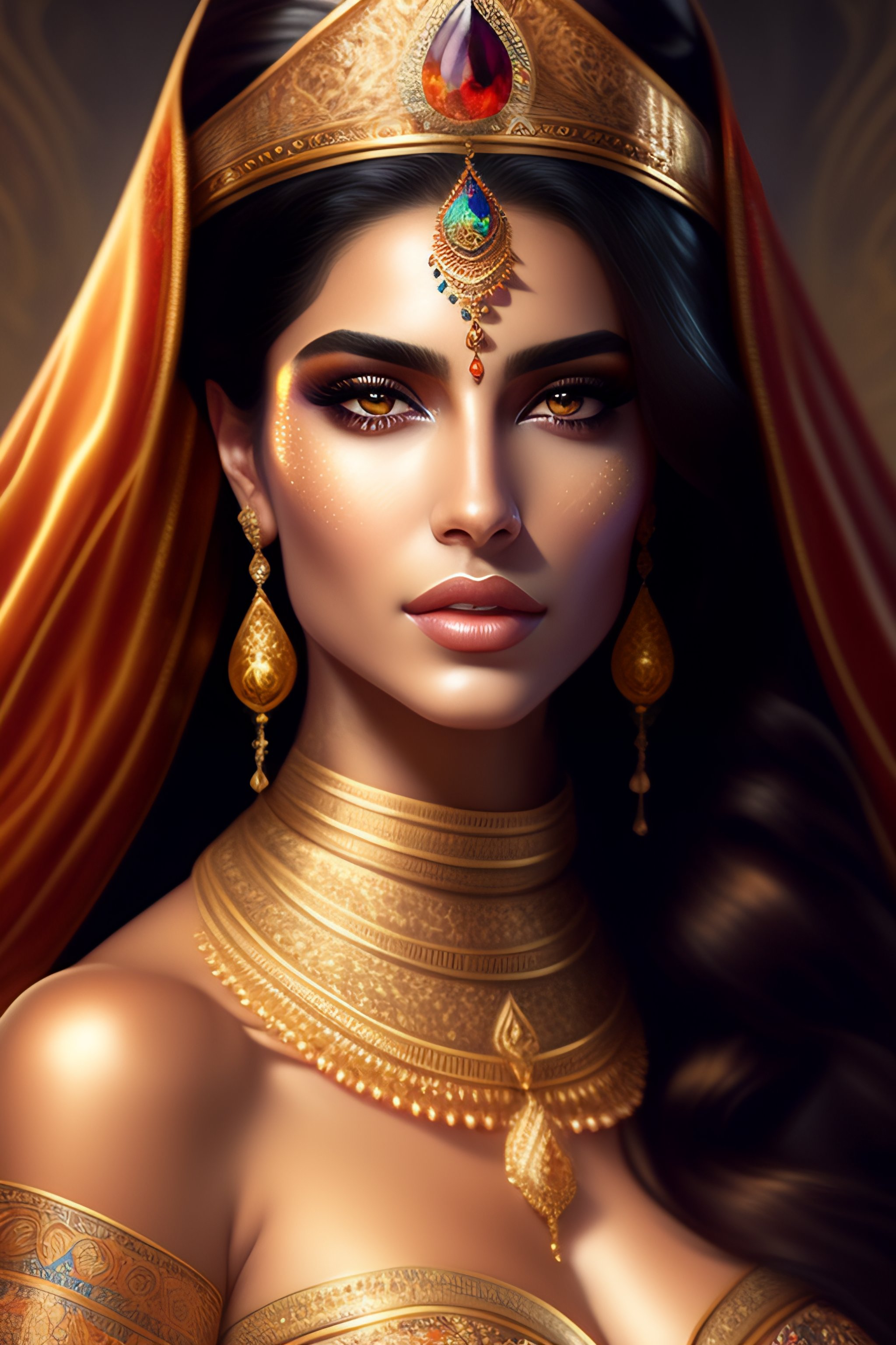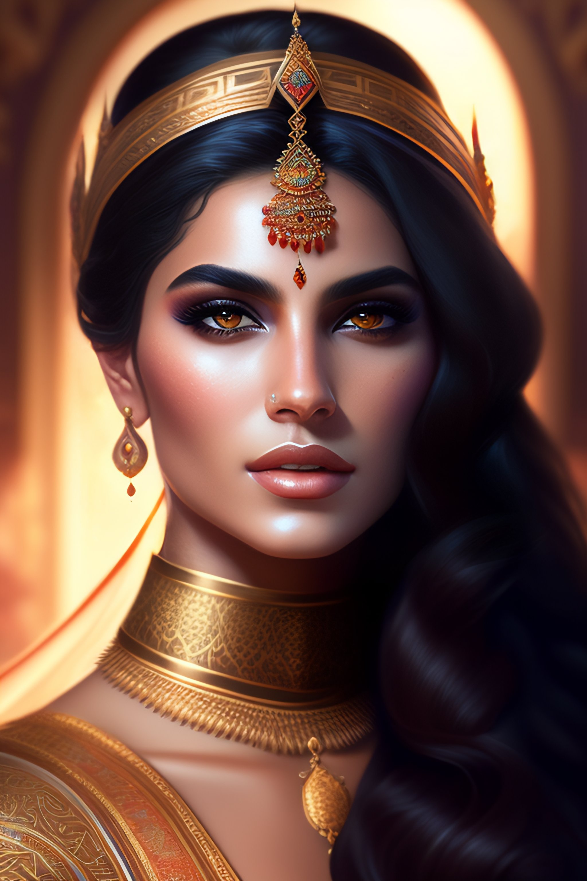 Beautiful portrait of an attractive persian princess who is a queen, beautiful princess, face painting, dramatic lighting, intricate, wild, highly detailed, digital painting, artstation, concept art, smooth, sharp focus, illustration, art by artgerm and greg rutkowski and alphonse mucha, footage from space camera