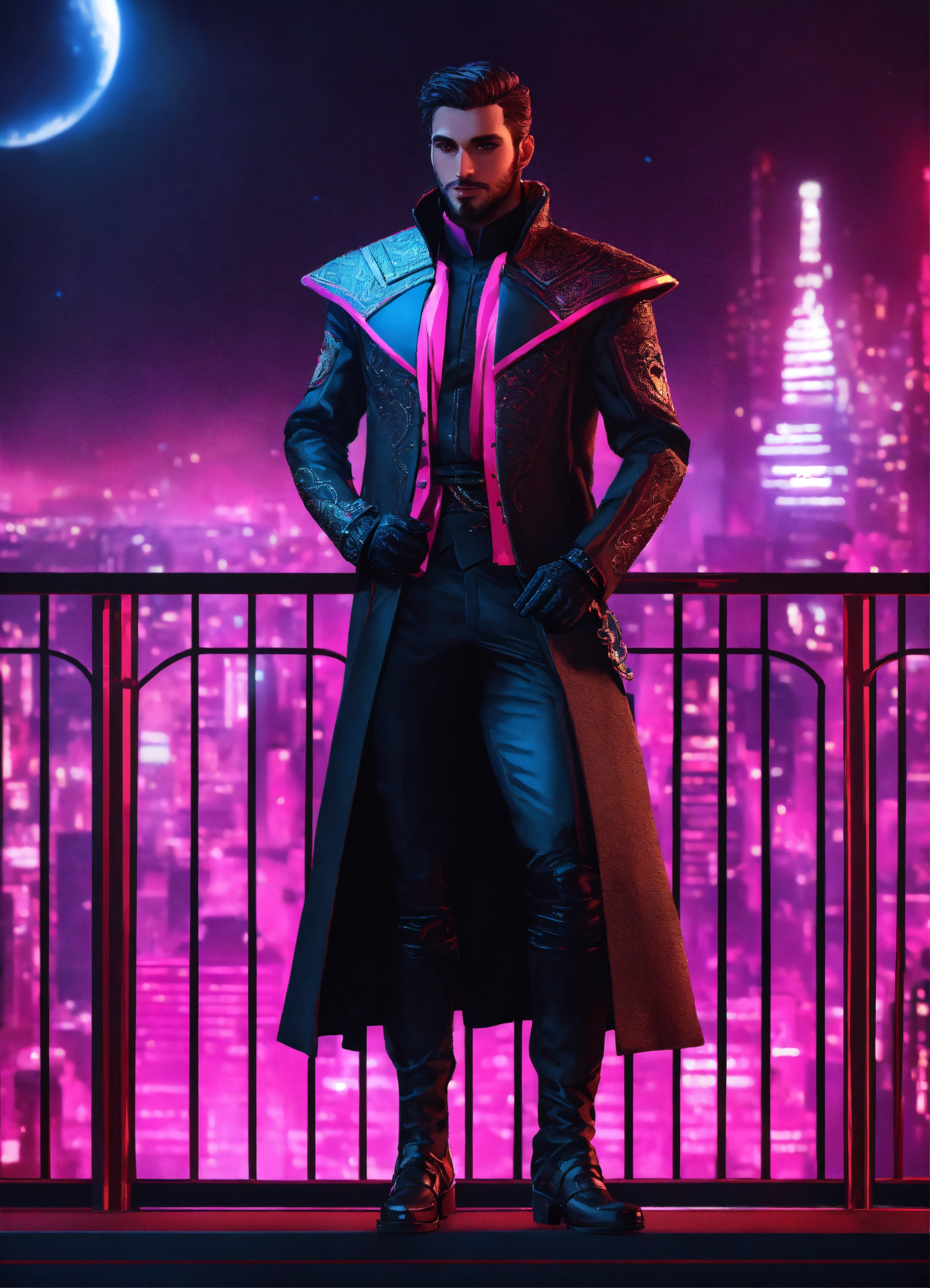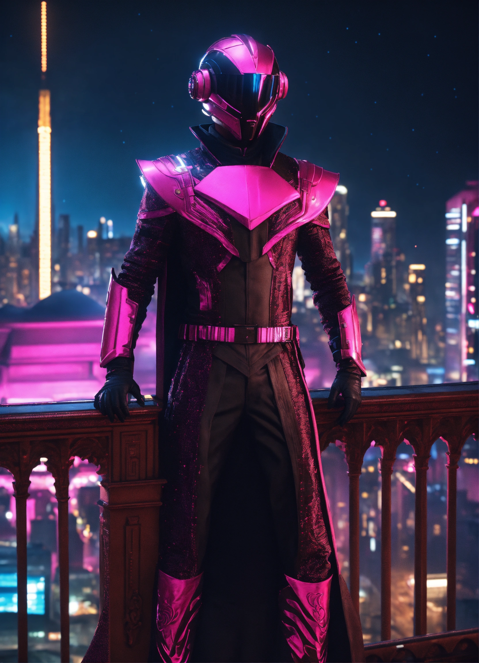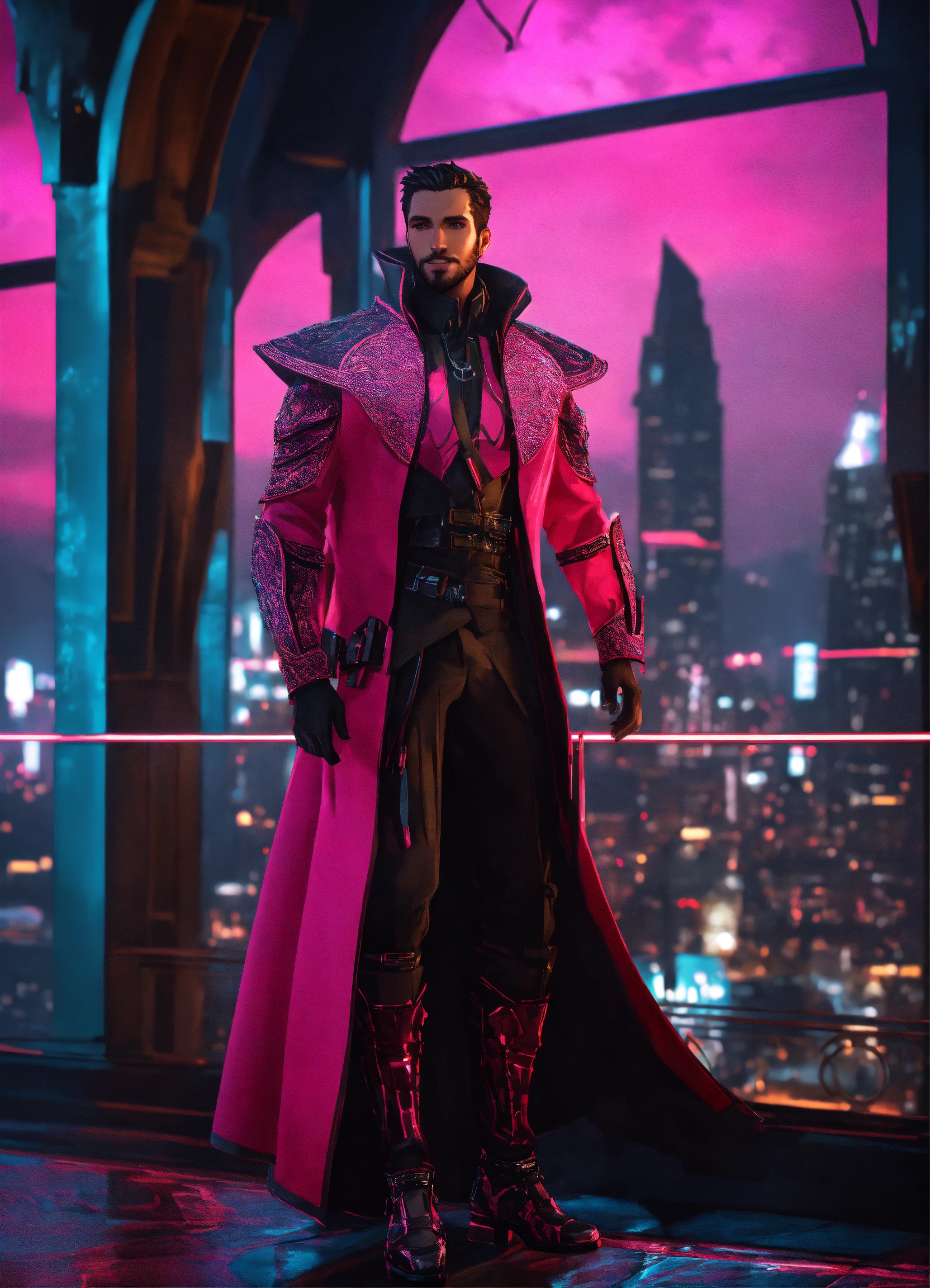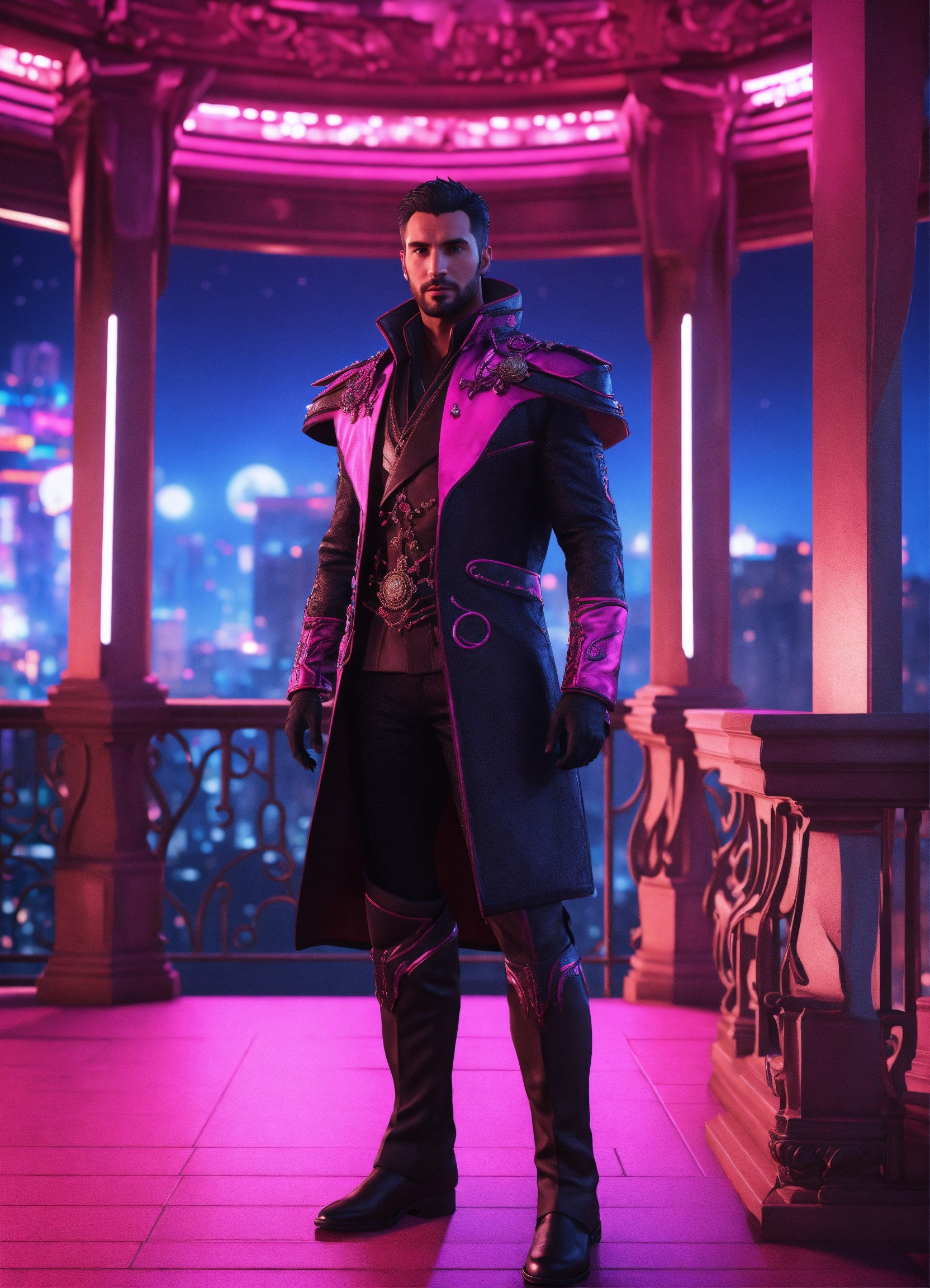 Highly detailed full body of a sci fi aristocrat, royalty, black and hot pink and outfit, standing on palace balcony overlooking a sci fi city at night, male, handsome, 30 years old, evil, highly detailed, unreal engine, 8d