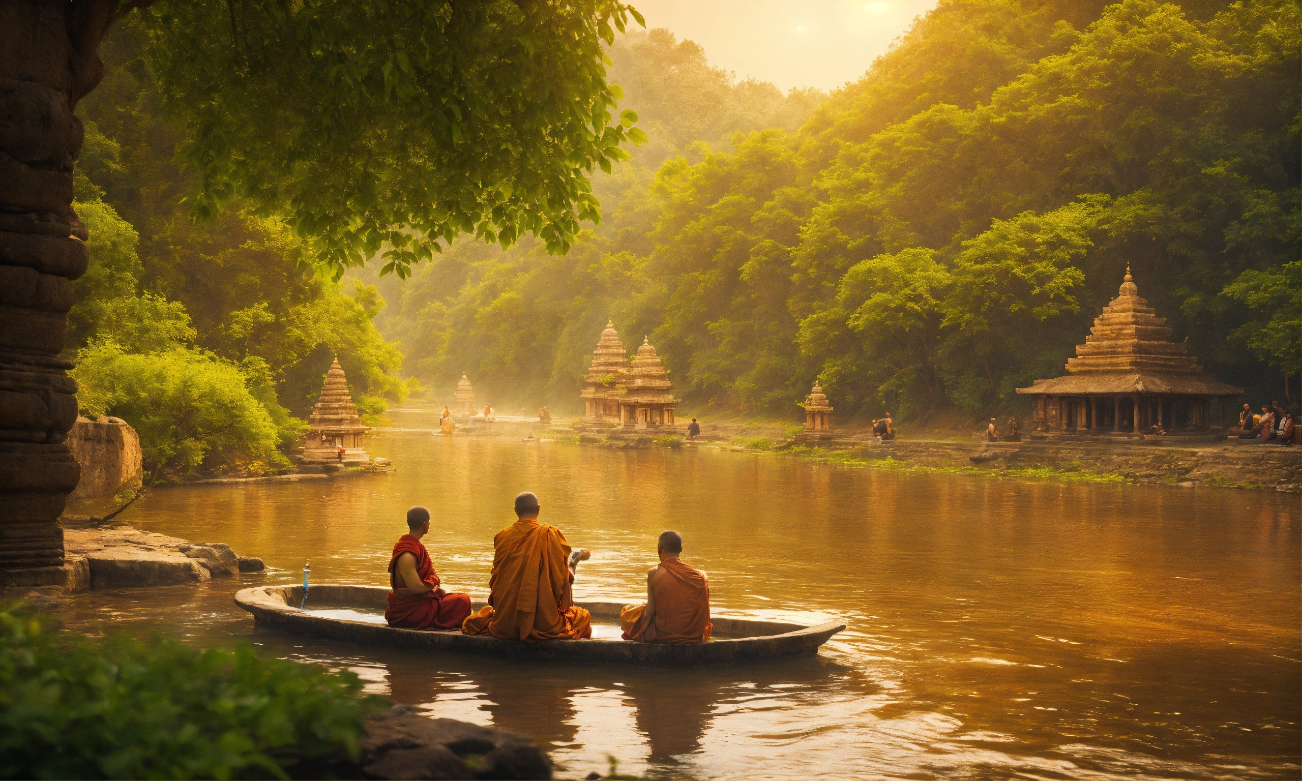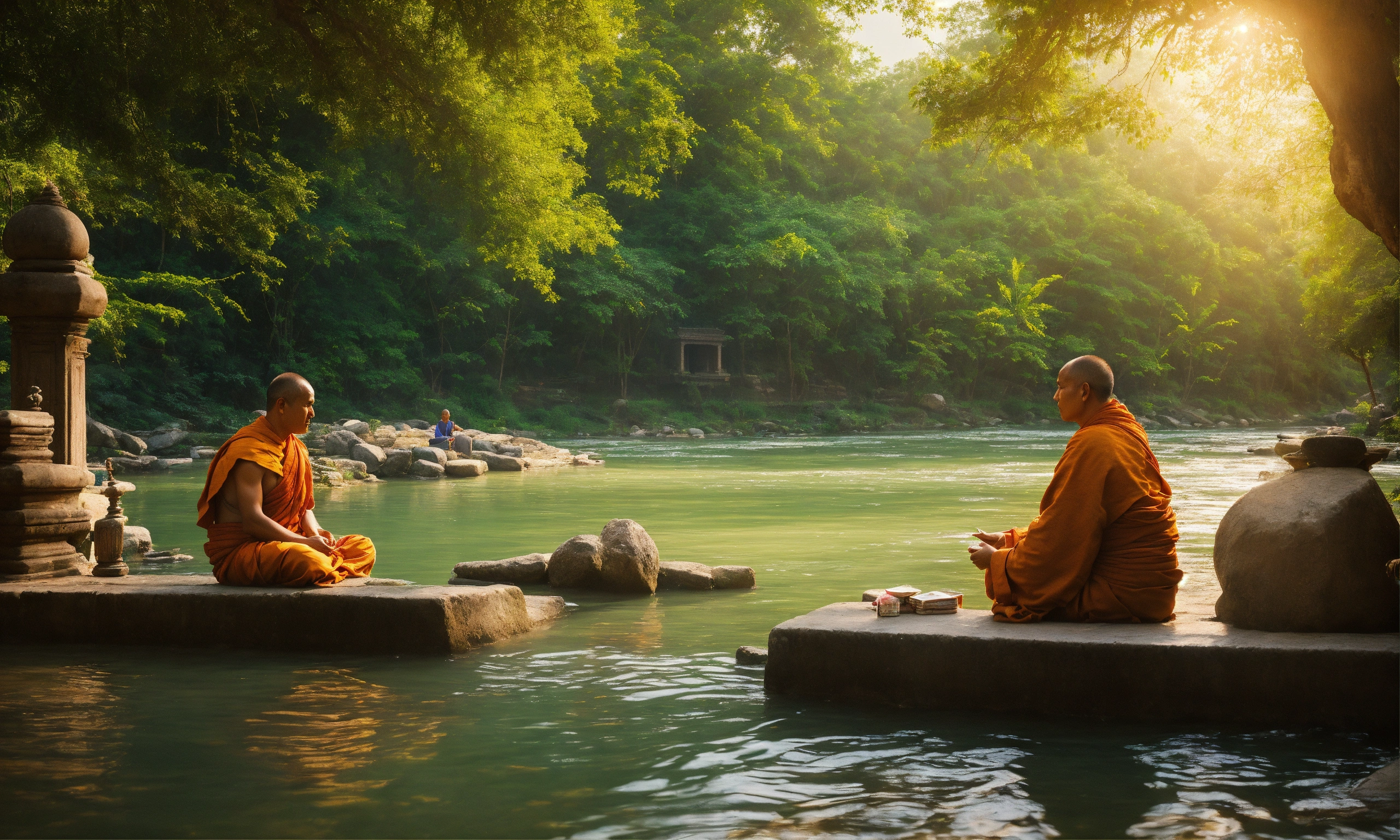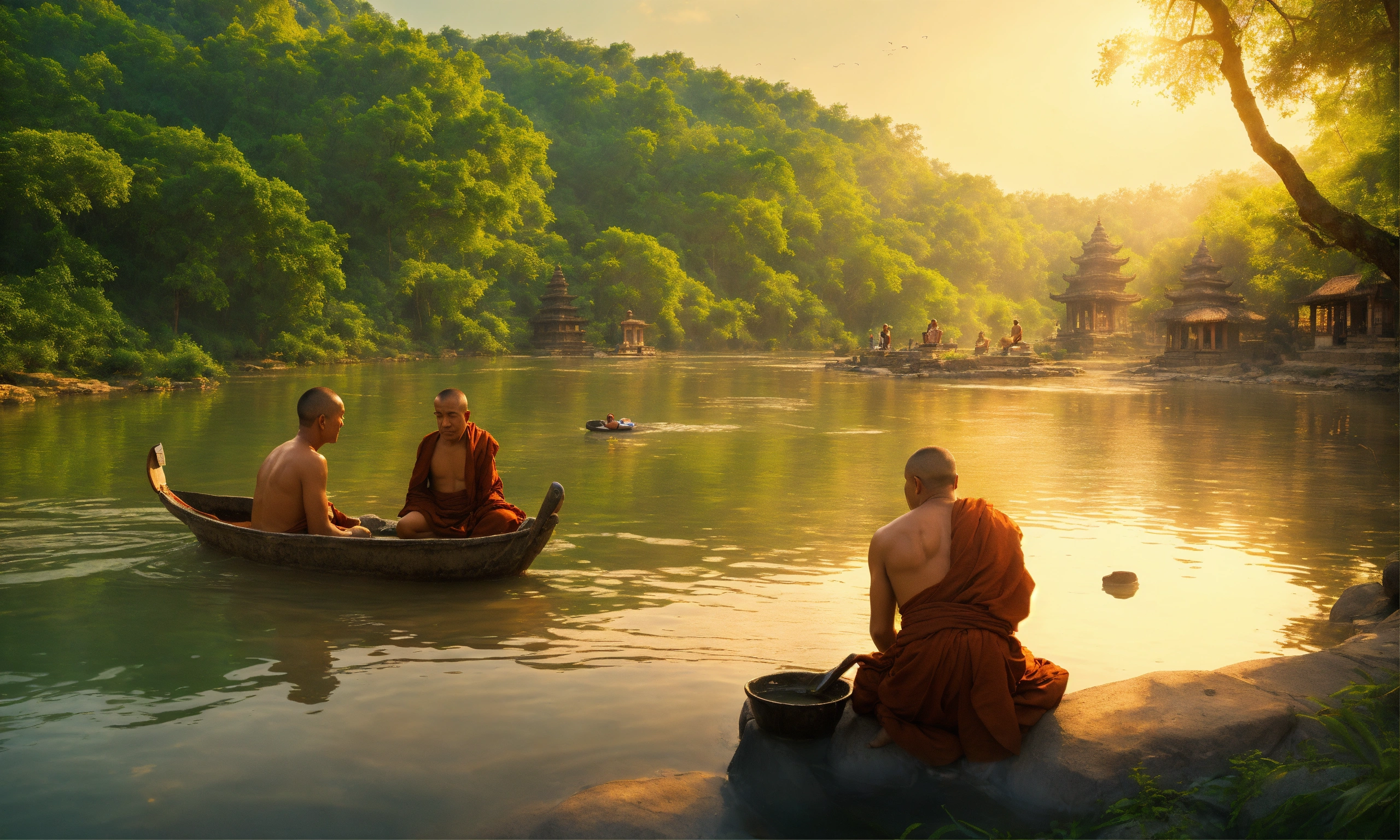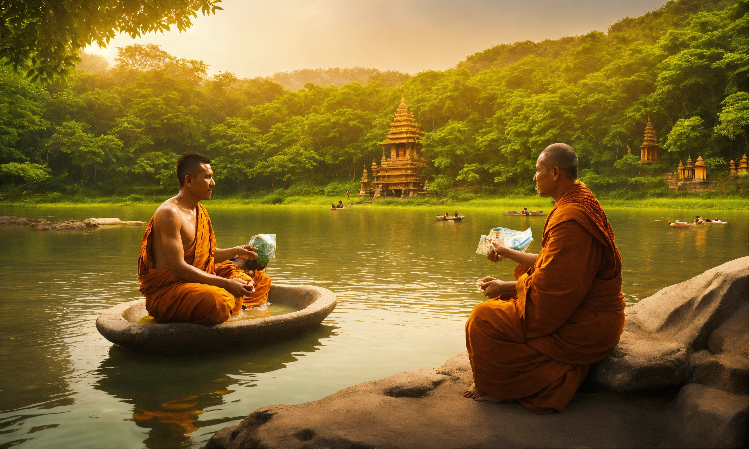 Two men talking to each other while taking bath in a beautiful river, one man giving money to the other and a monk is listening to them, temples and trees on the banks of this river, mesmerizing enviroment