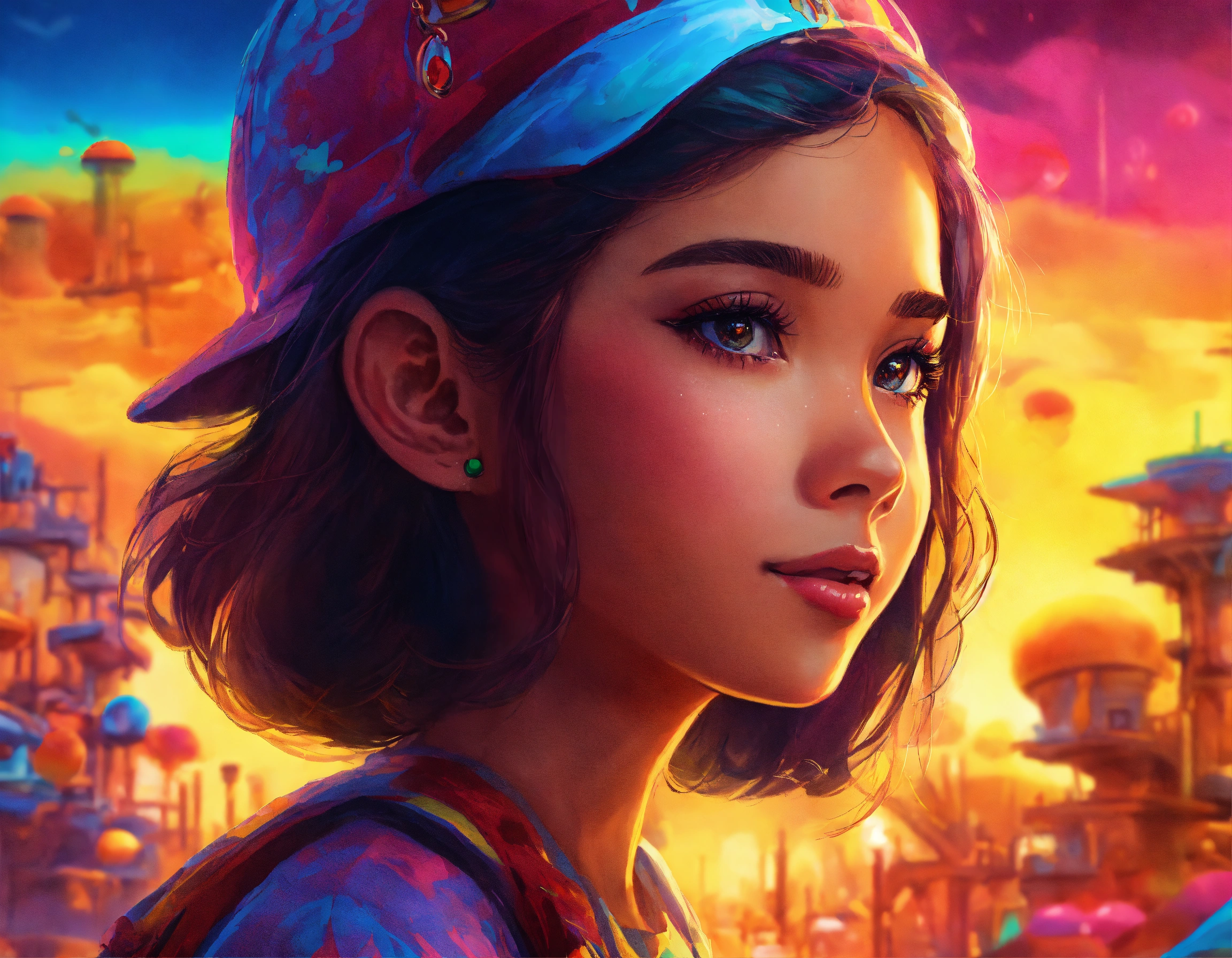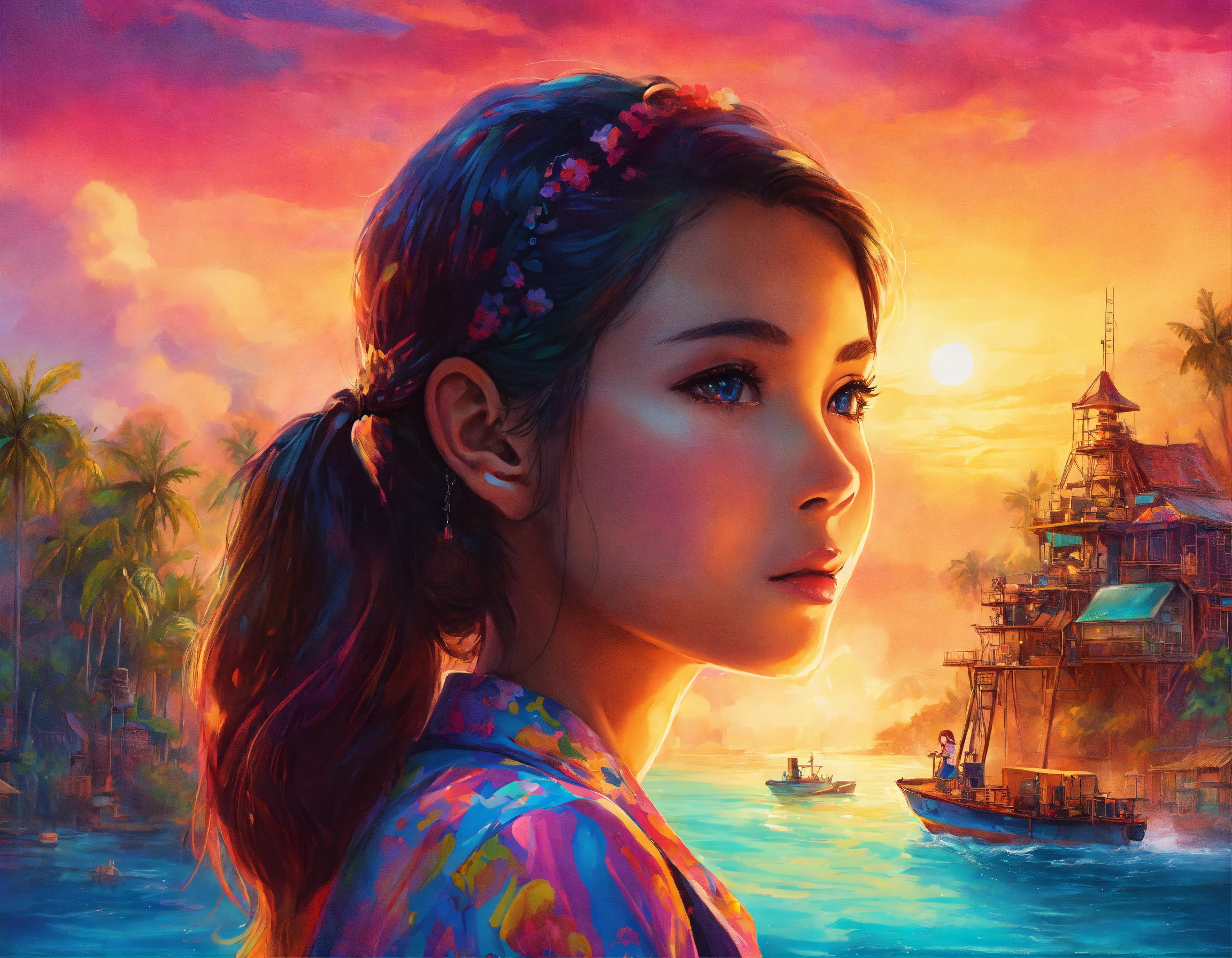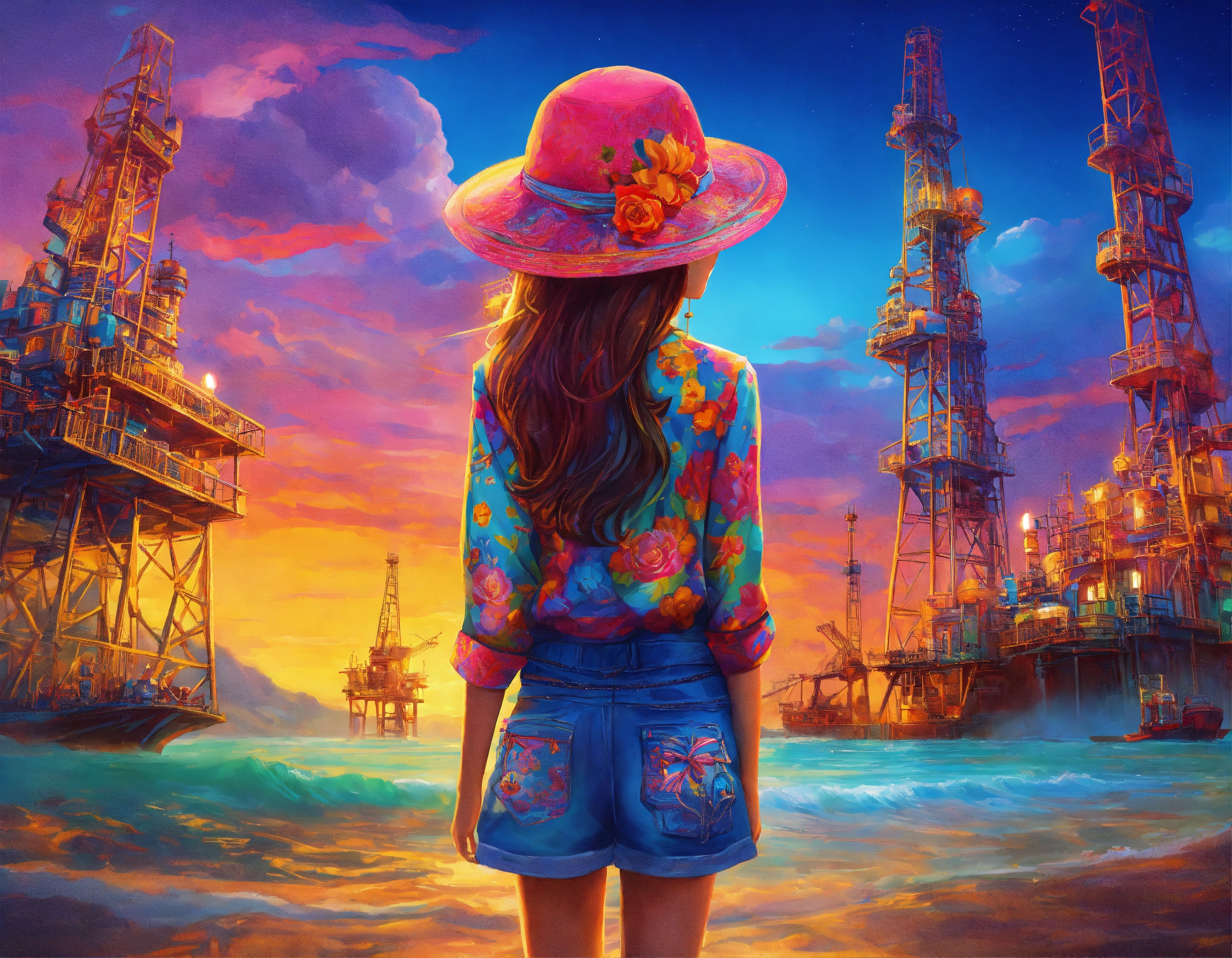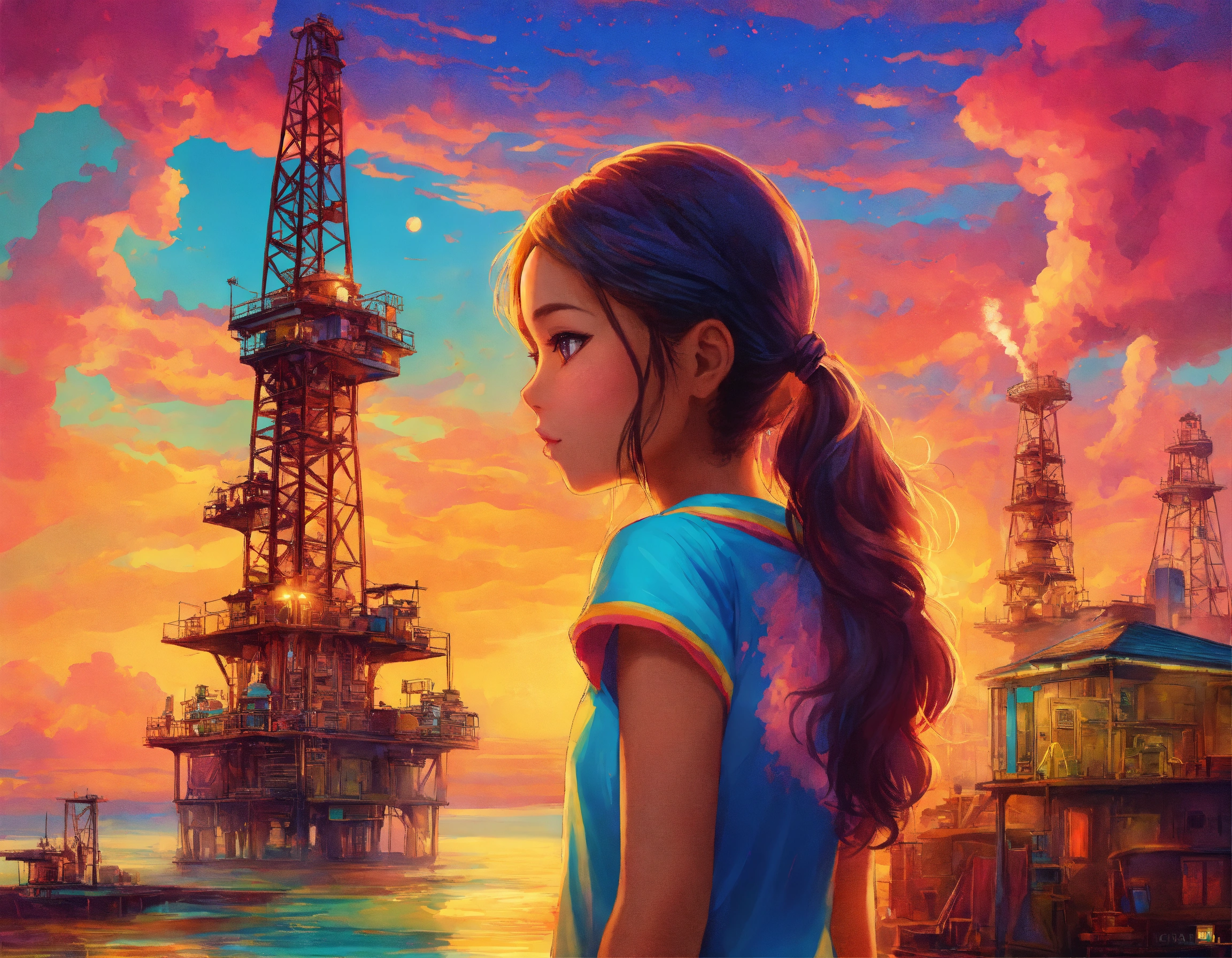 Girl, indonesian faces, back to camera, oil drilling background, ultra hd, story book illutration, technicolor, ultra-hd, studio lighting, by lisa frank