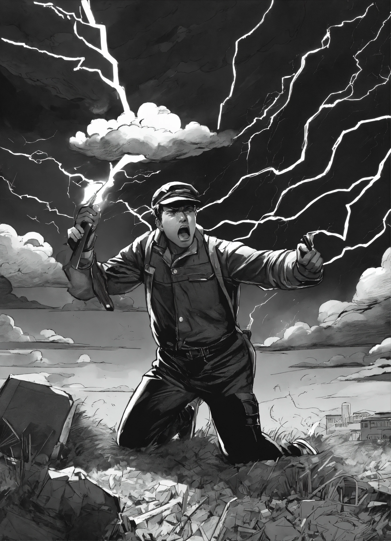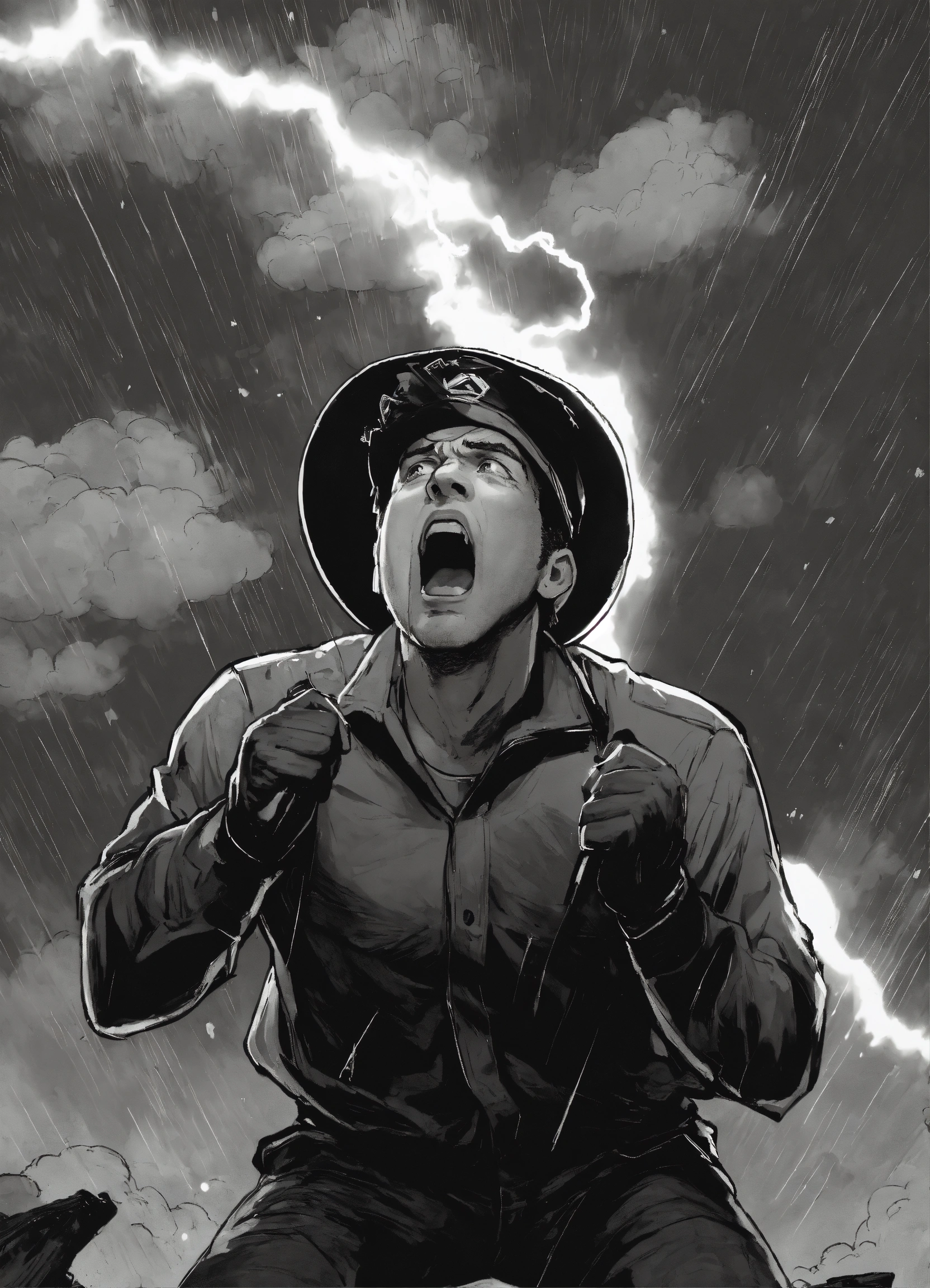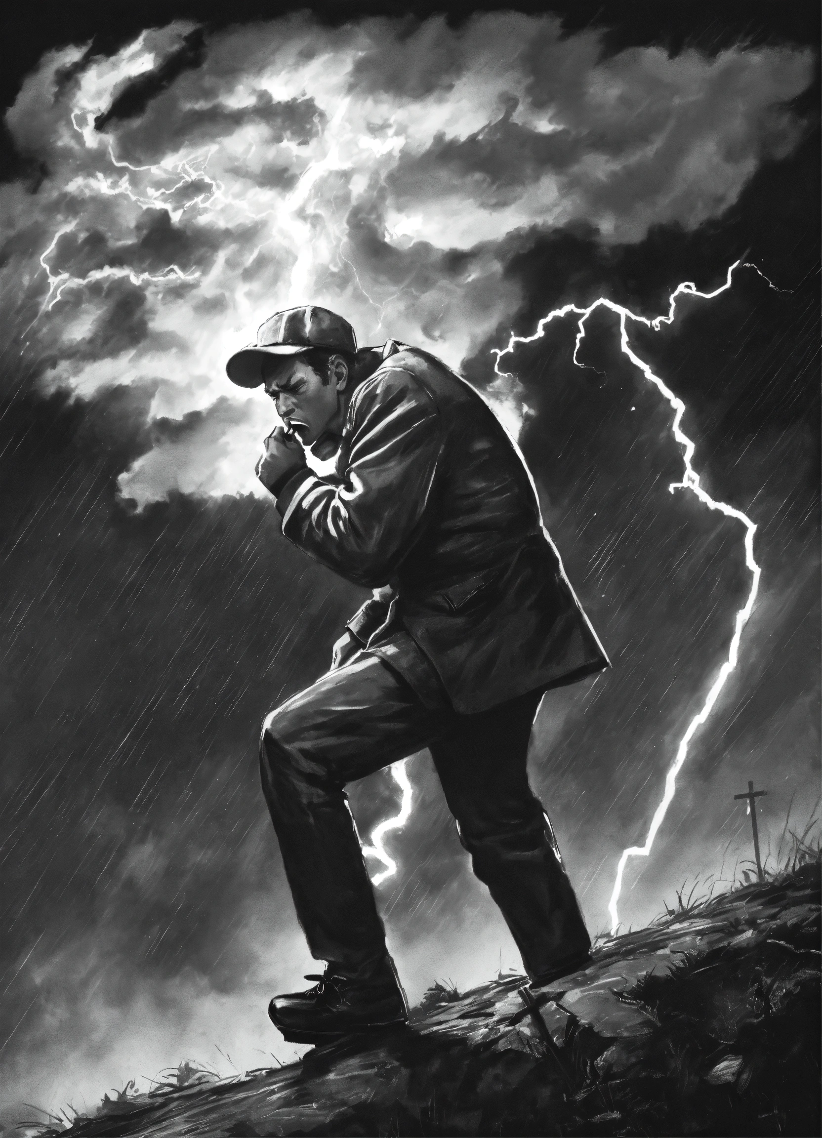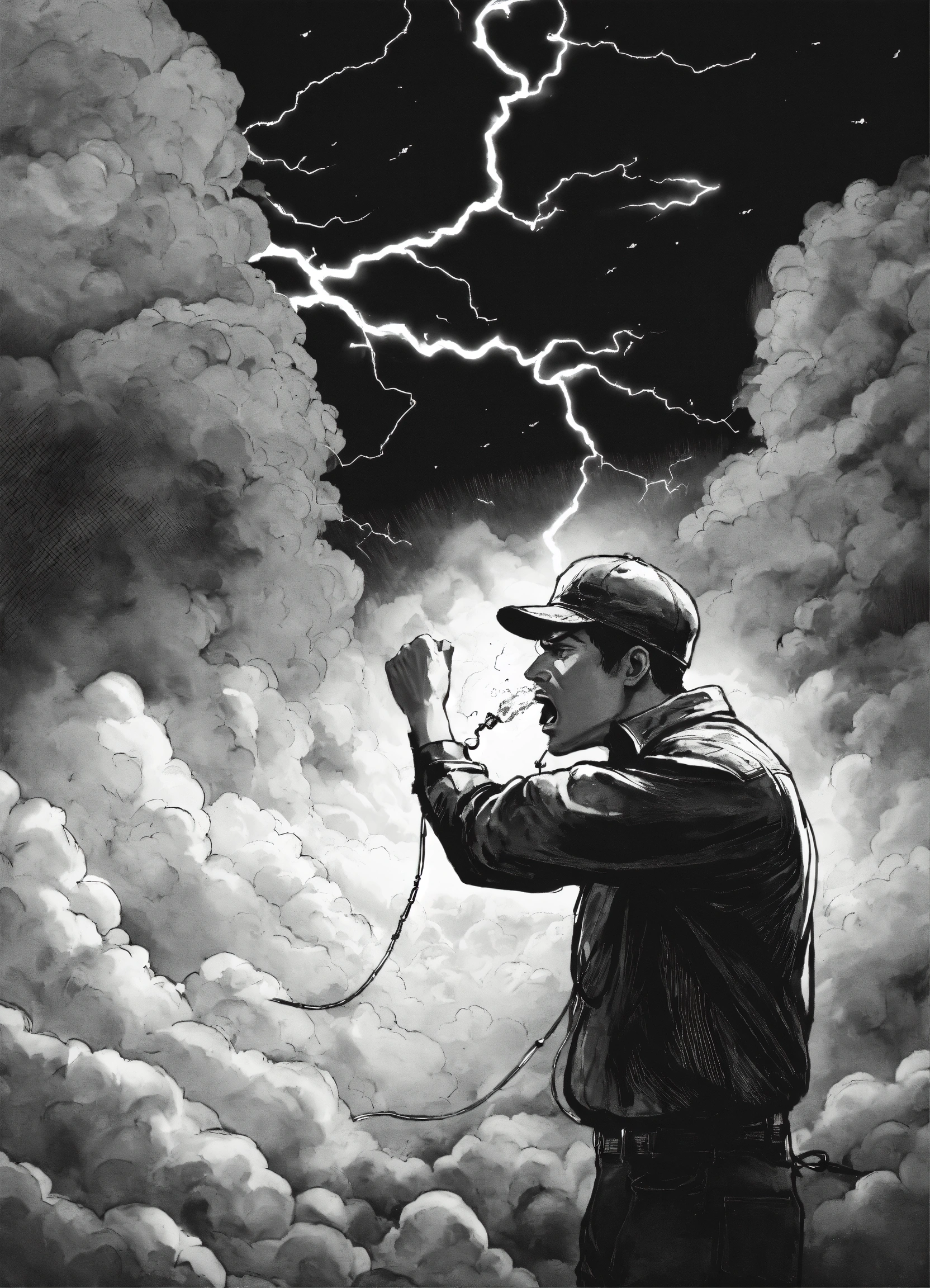A black and white illustration of an man, arguing, bent over in frustration, wearing cap, wearing whistle, with lightning and clouds swirling around him