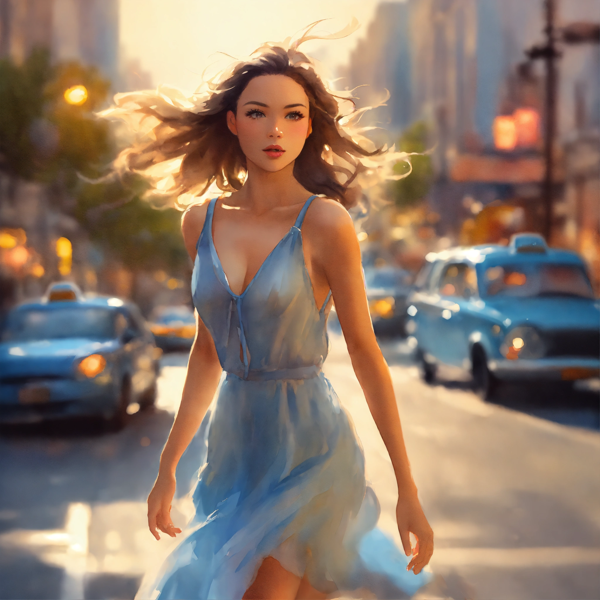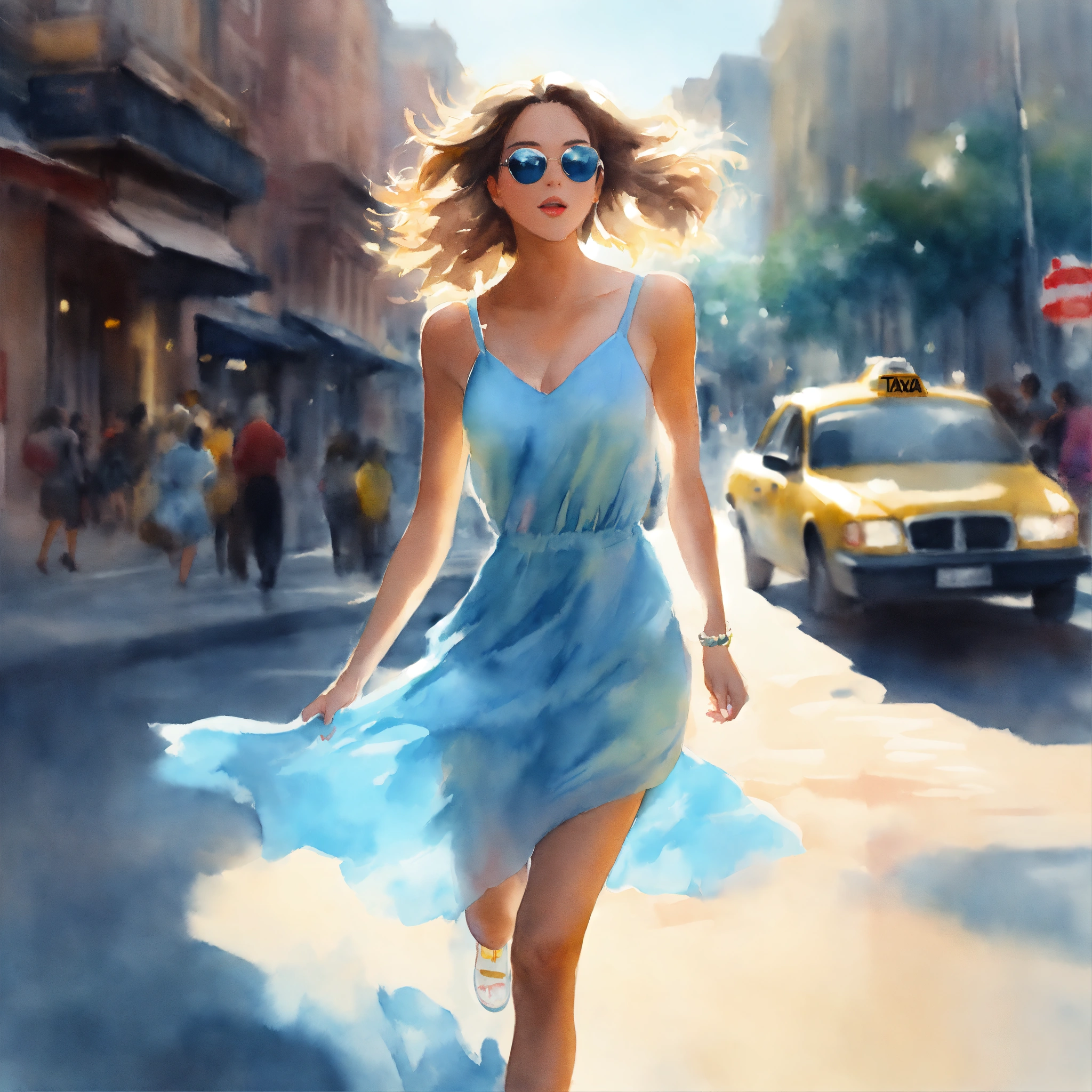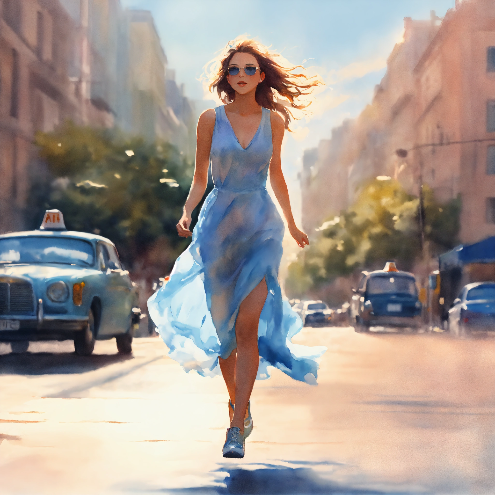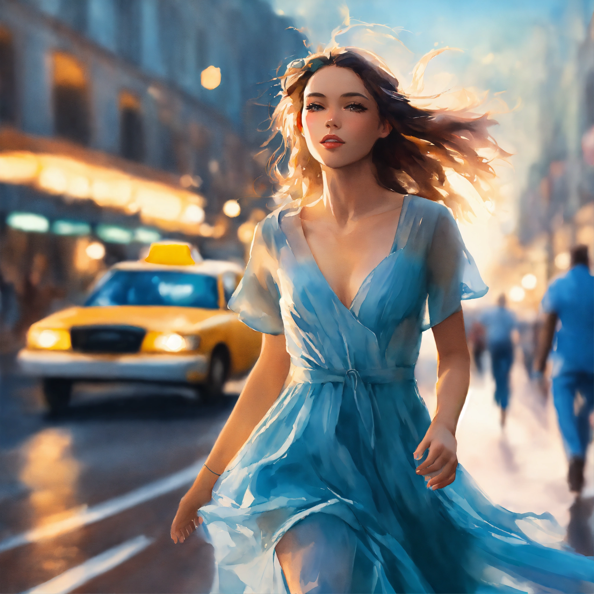 A beautiful girl in a dress runs very fast down the street for a taxi, great lighting, pastel light blue shades, 8k rendering, award-winning art, watercolour style