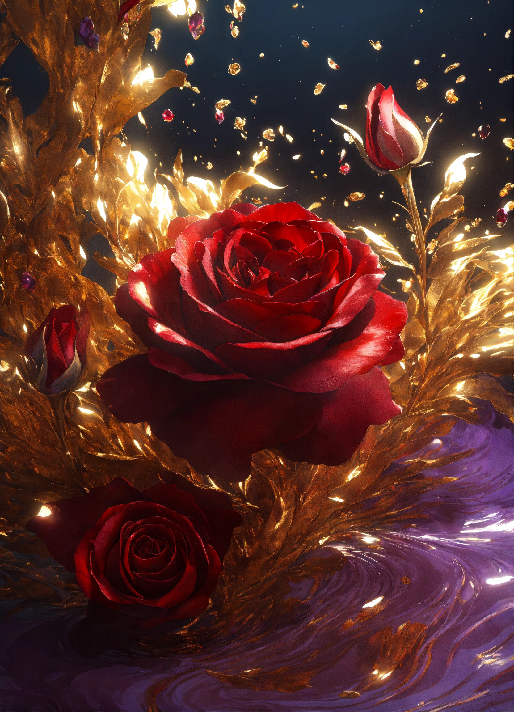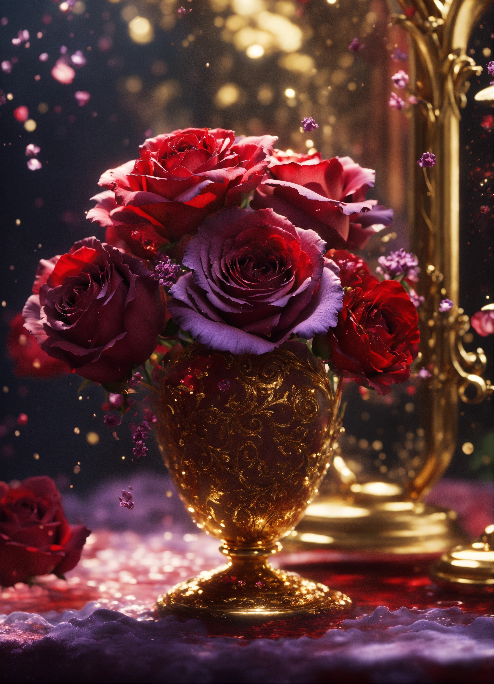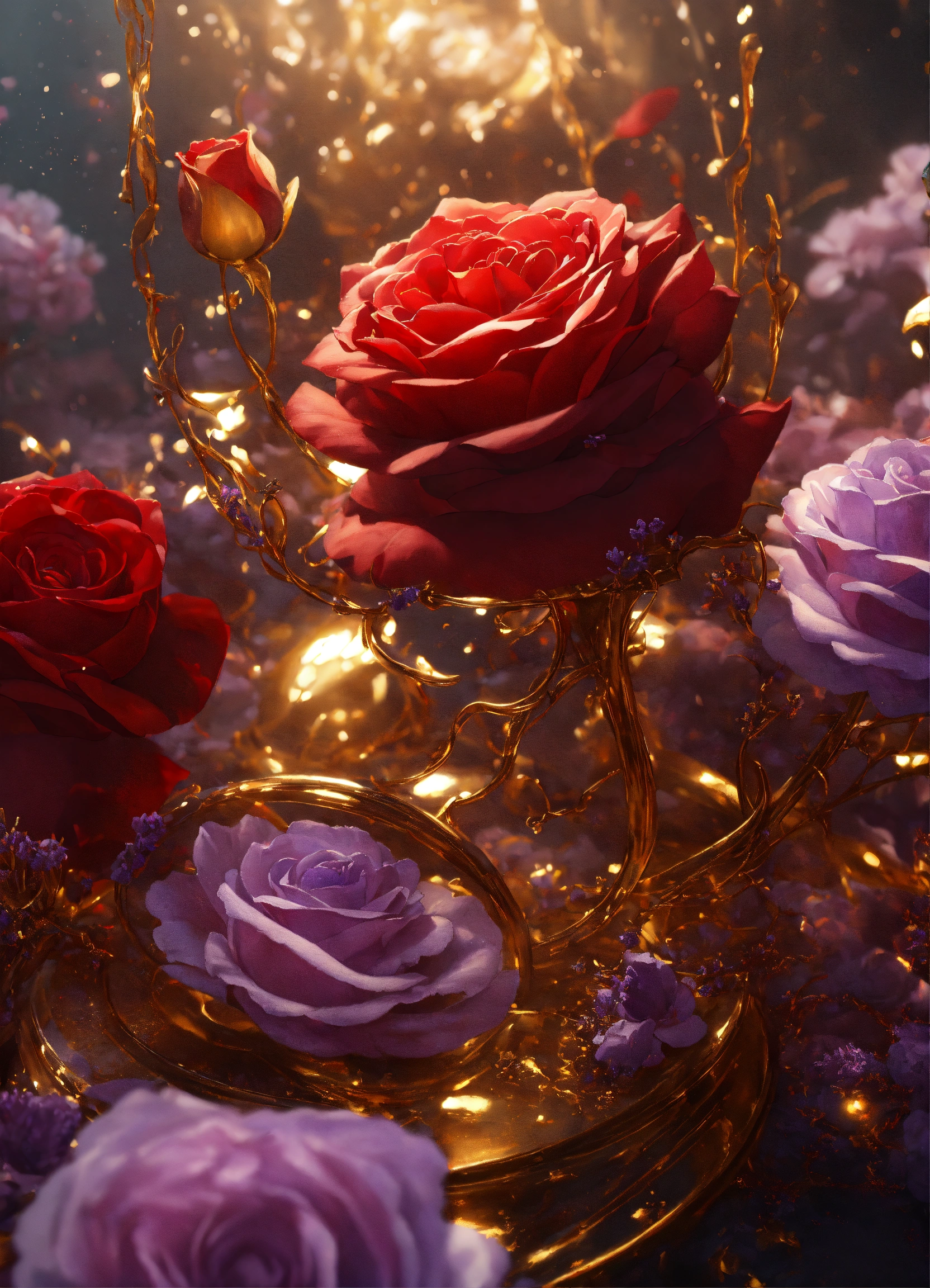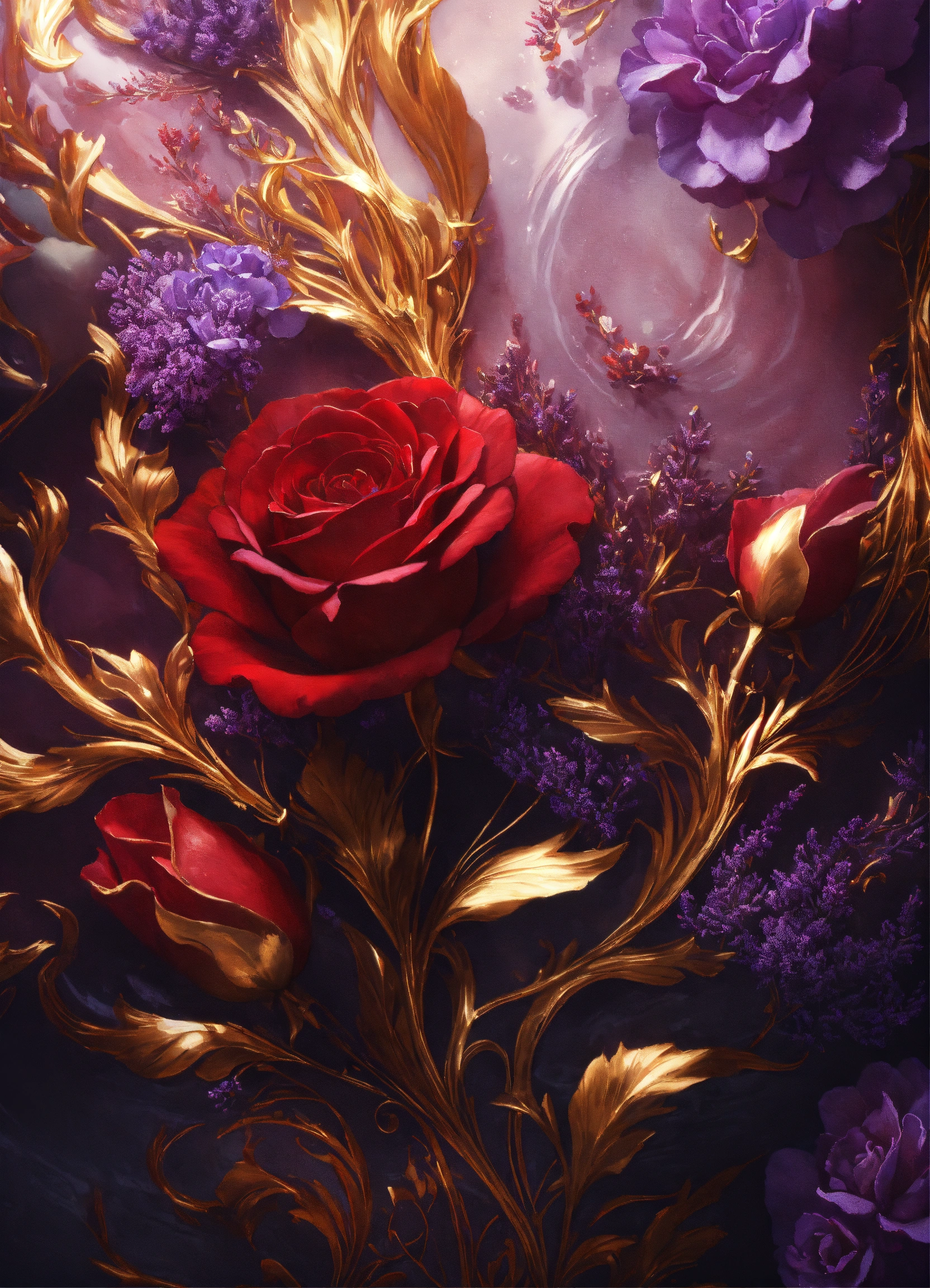 A painting with lavender swirls, in the style of dark scarlet and light gold, underwater scenes, use of precious materials, meticulous design, dark sanguine and white, velvet - red and gold, unreal engine render, 8k, roses made of glass, 🌹