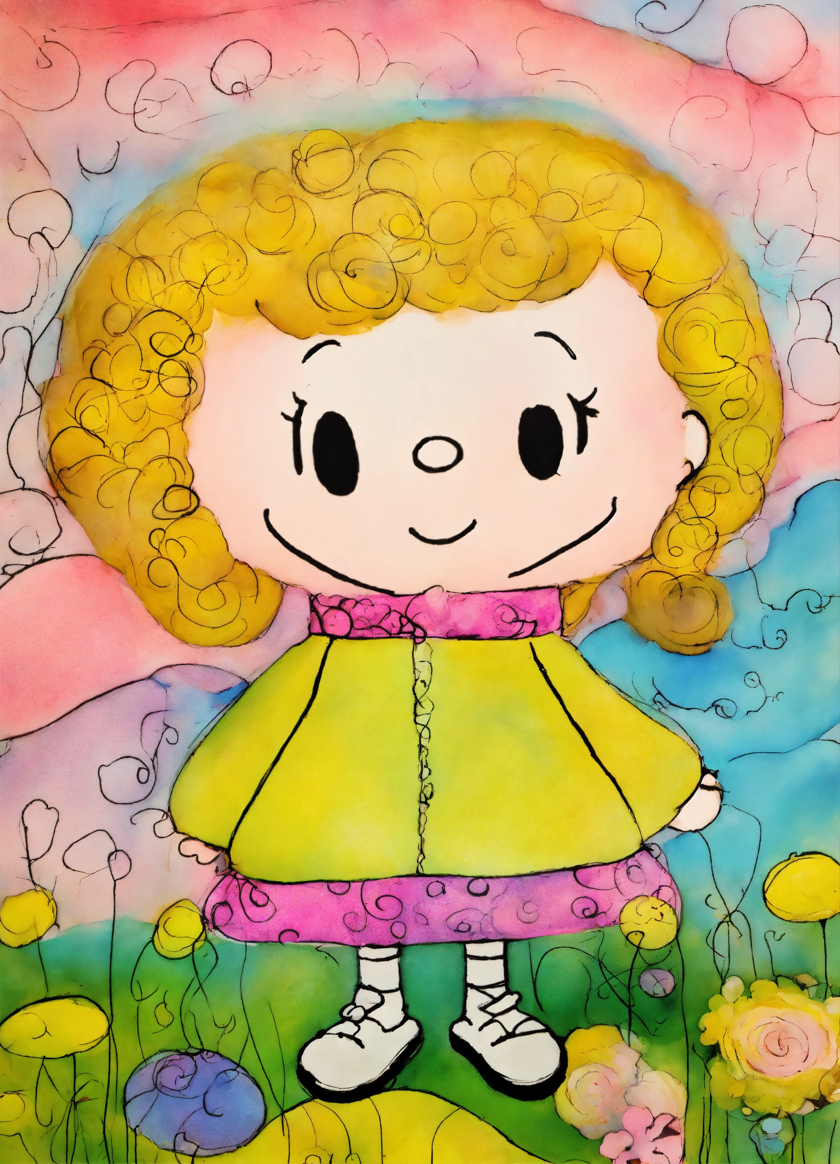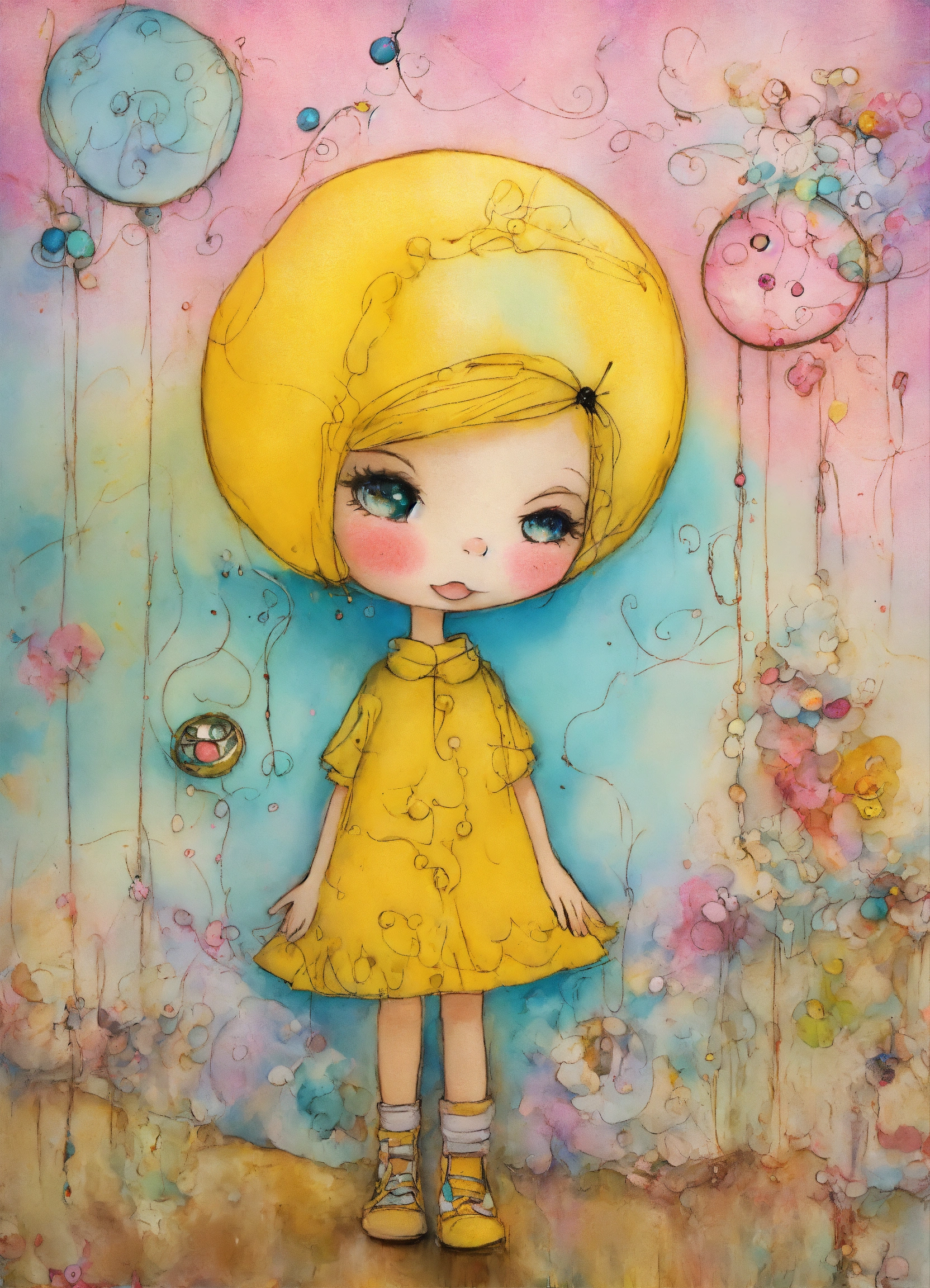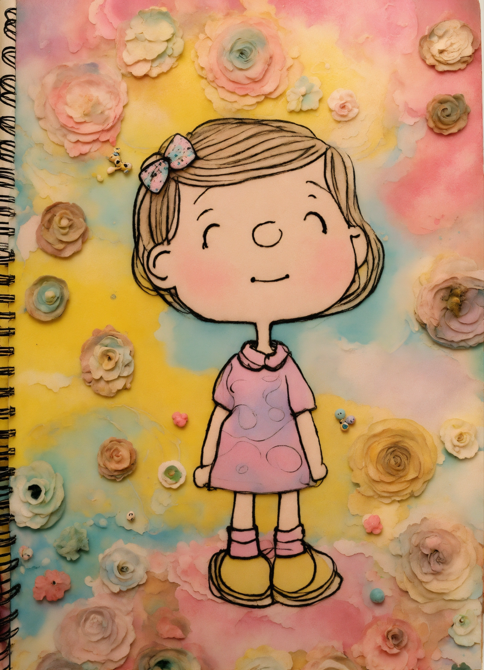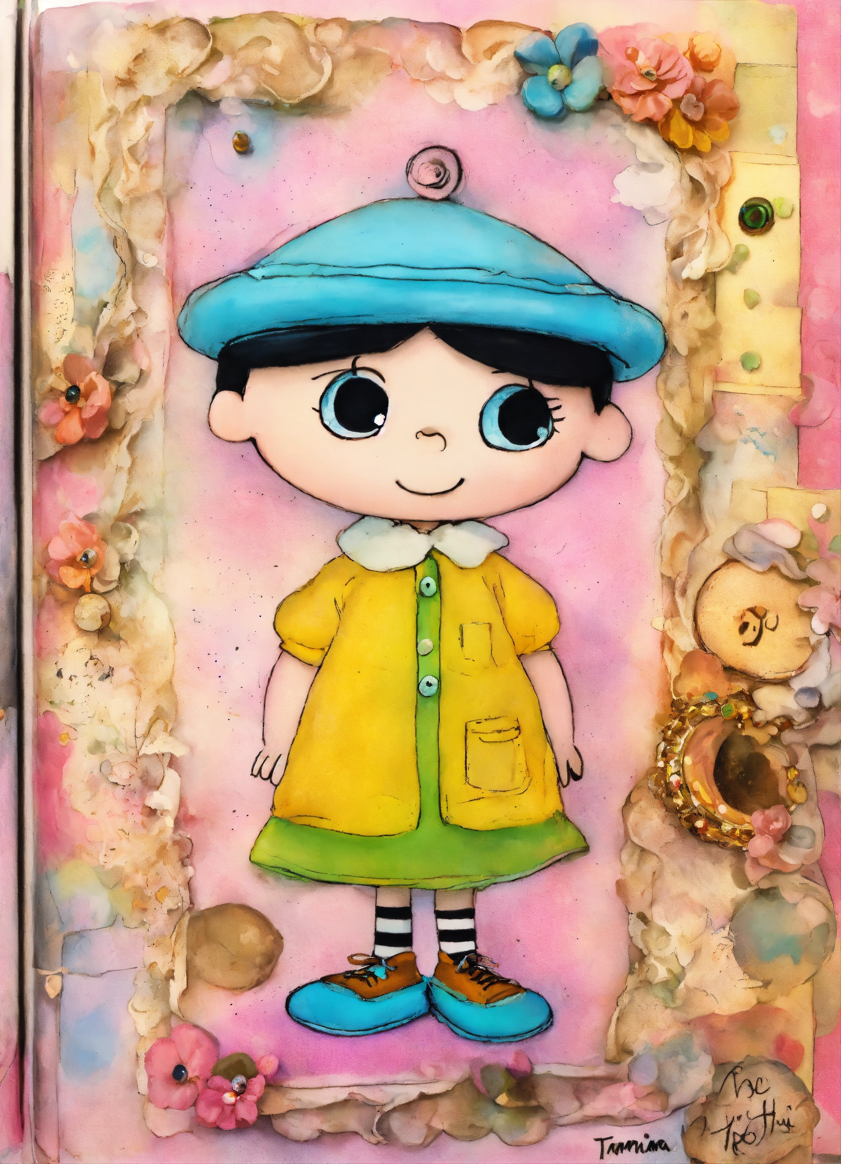 Shabby chic dreamy mist pastel junk journals whimsical cute quirky charlie brown style "peanuts" with big eyes in odd clothings, tamara laporte style, swirling magical fairytale abstract art style
