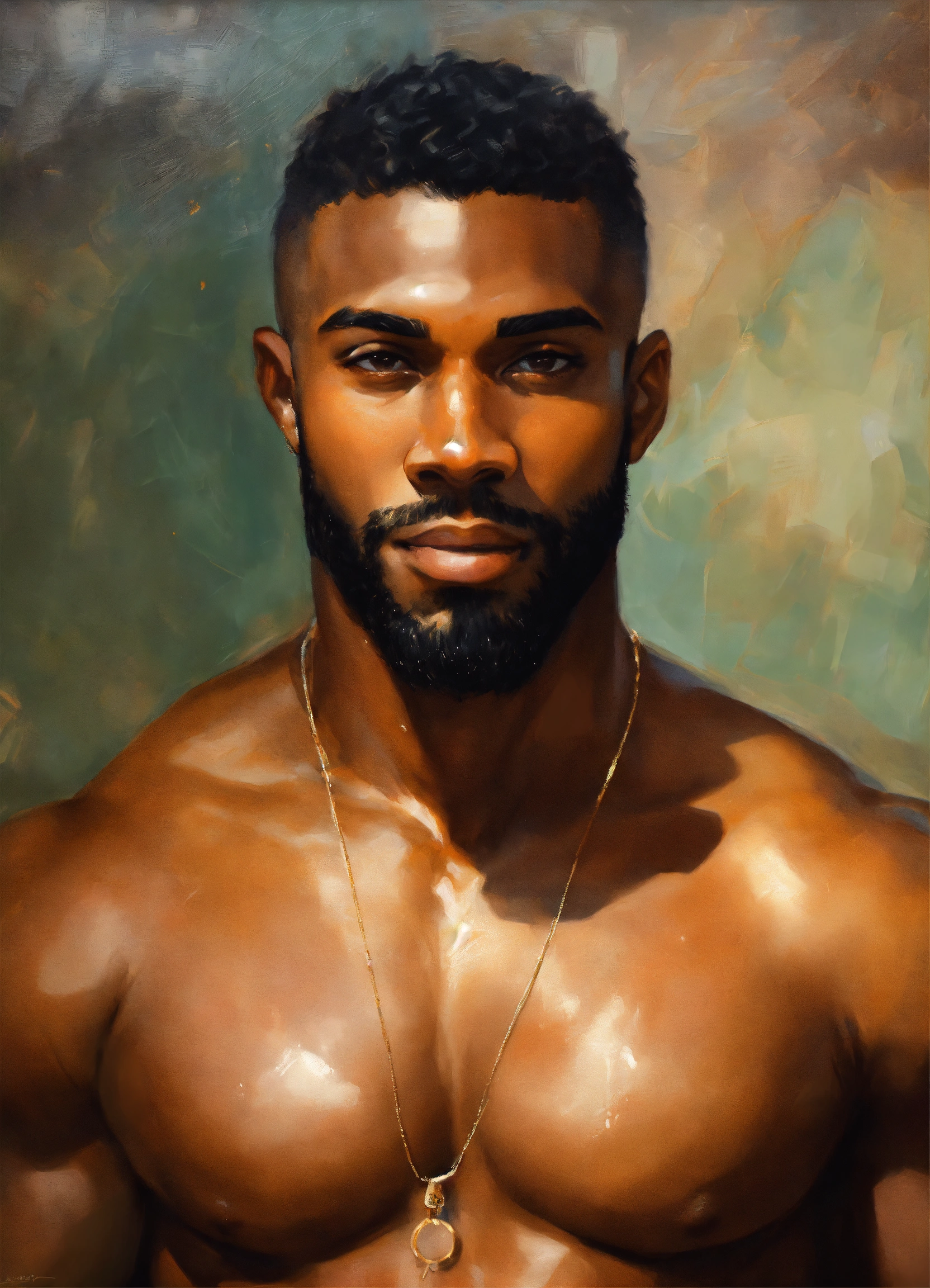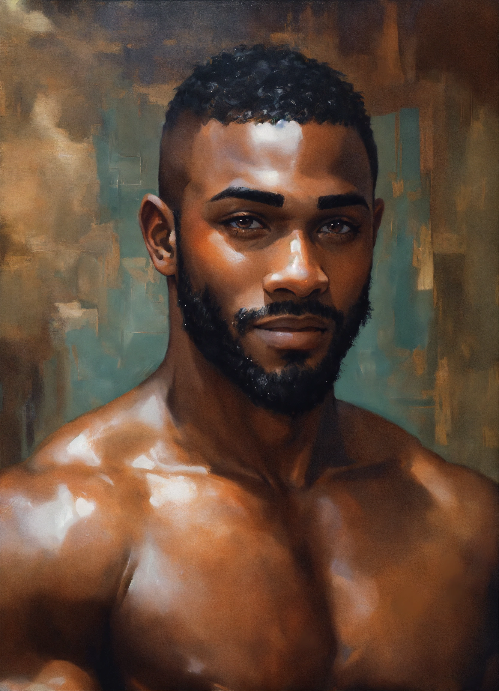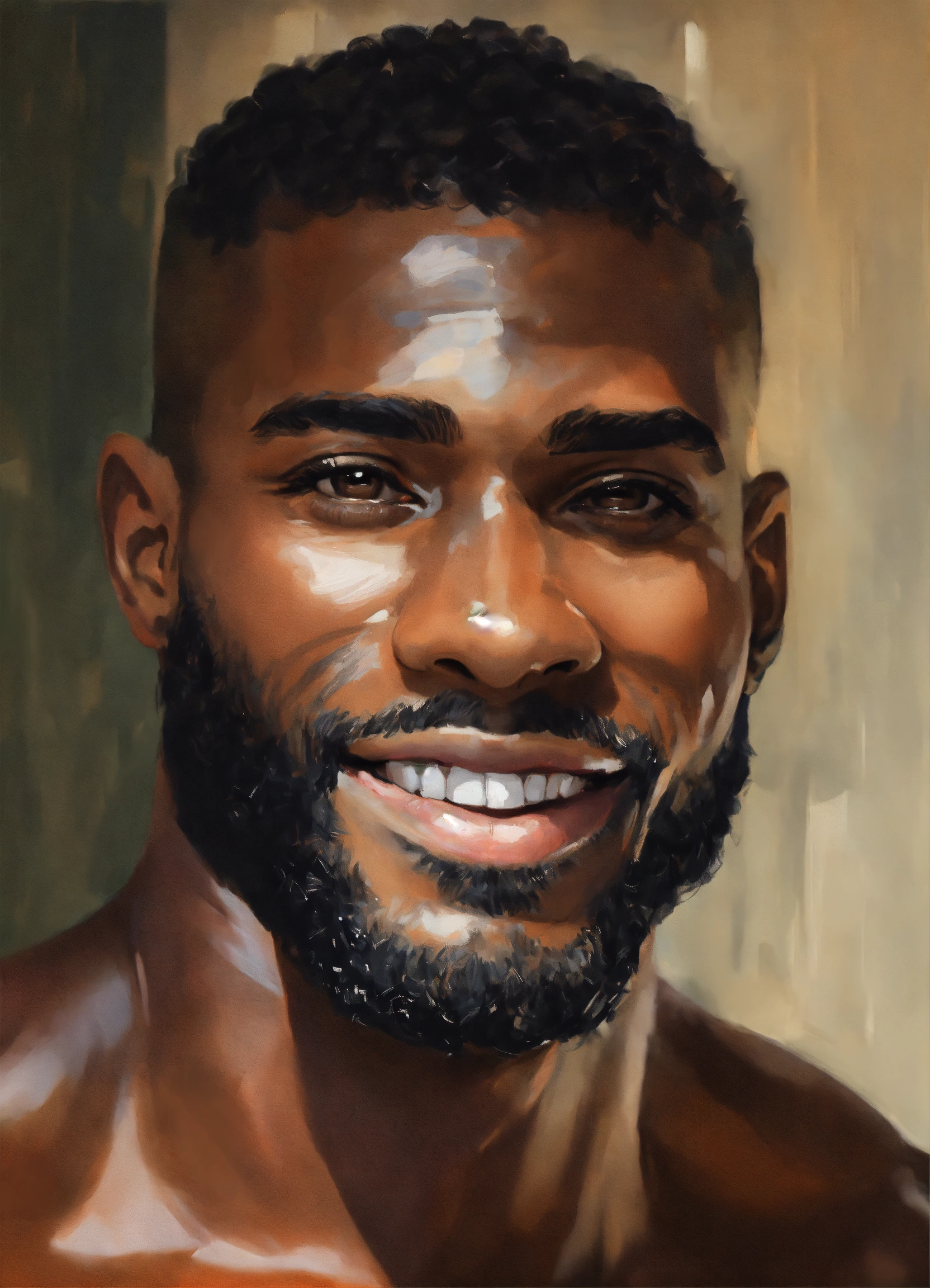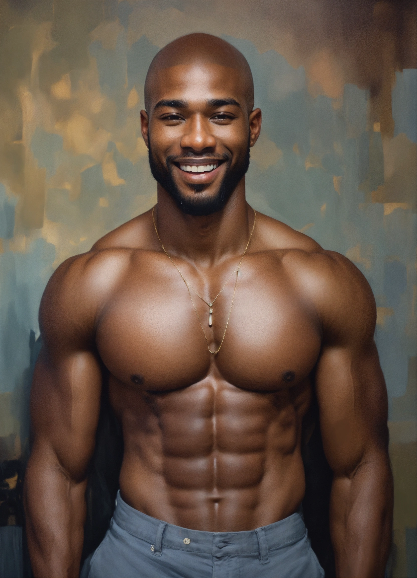 Handsome 26-year-old black man, flawless brown skin, big pecs, six-pack abs, big quadriceps, bald, short beard, gorgeous, beautiful smile, brown eyes, intricate, elegant, by alyssa monks, highly detailed, symmetrical facial expression, fine details, masterpiece, trending on artstation