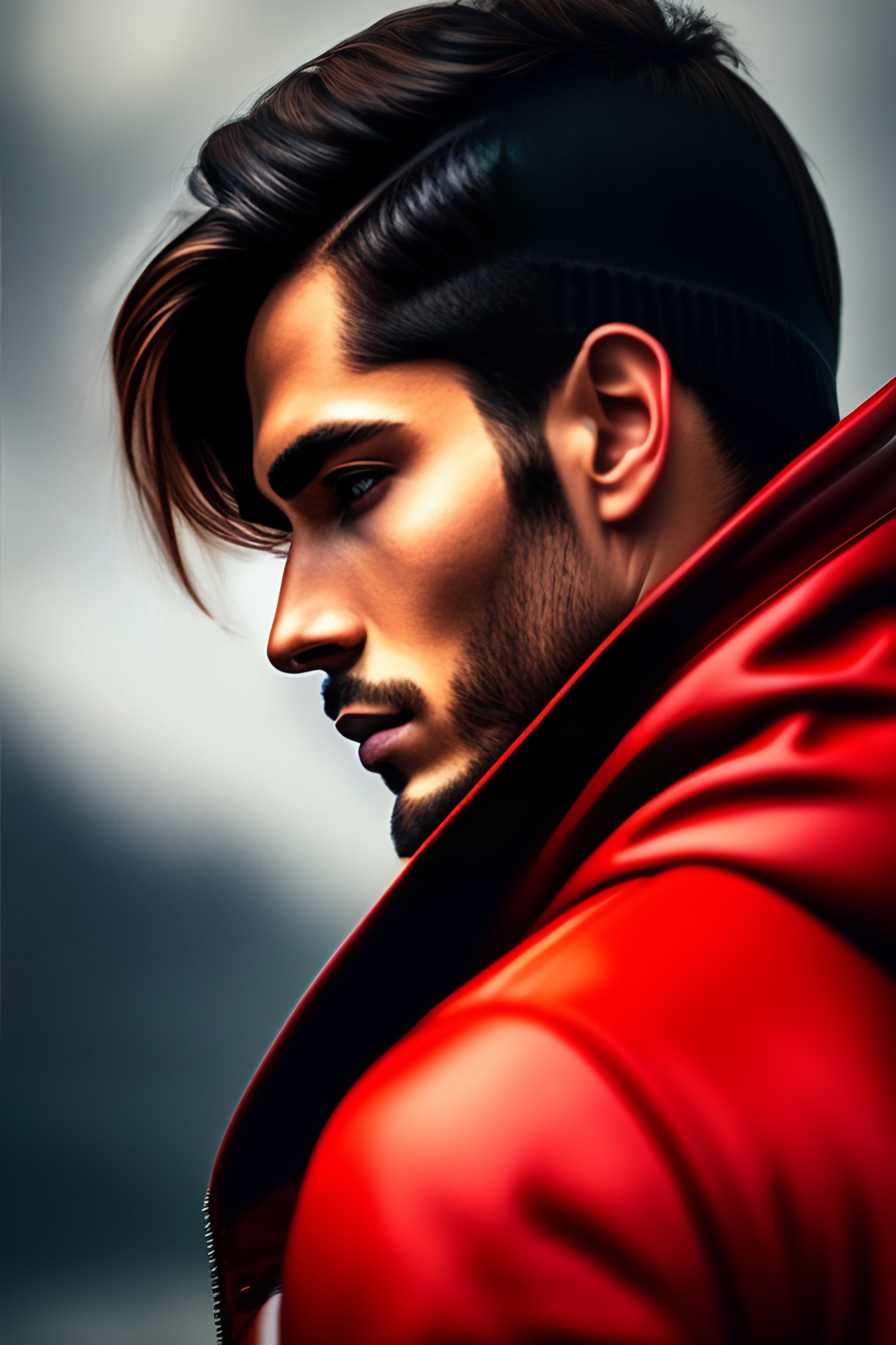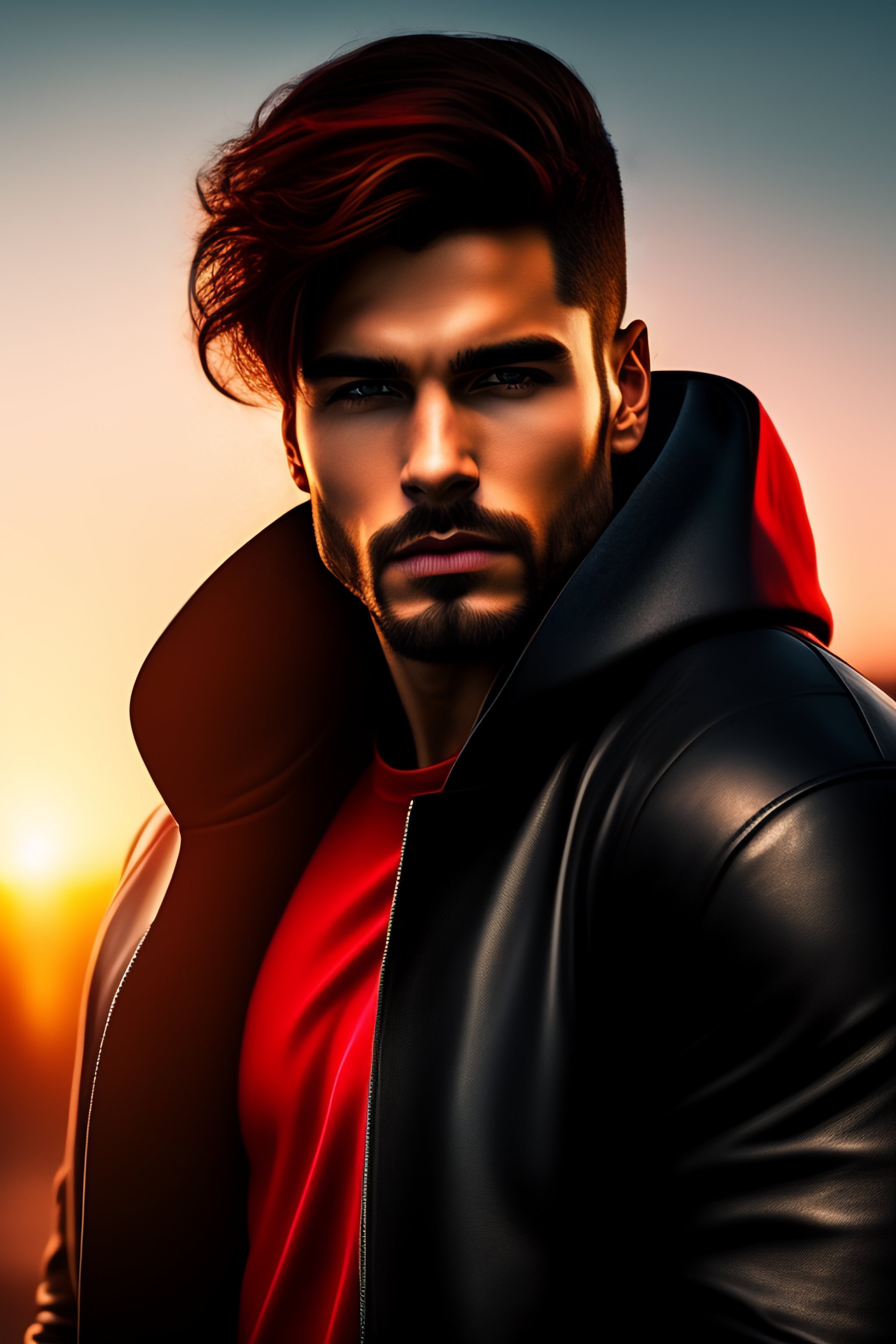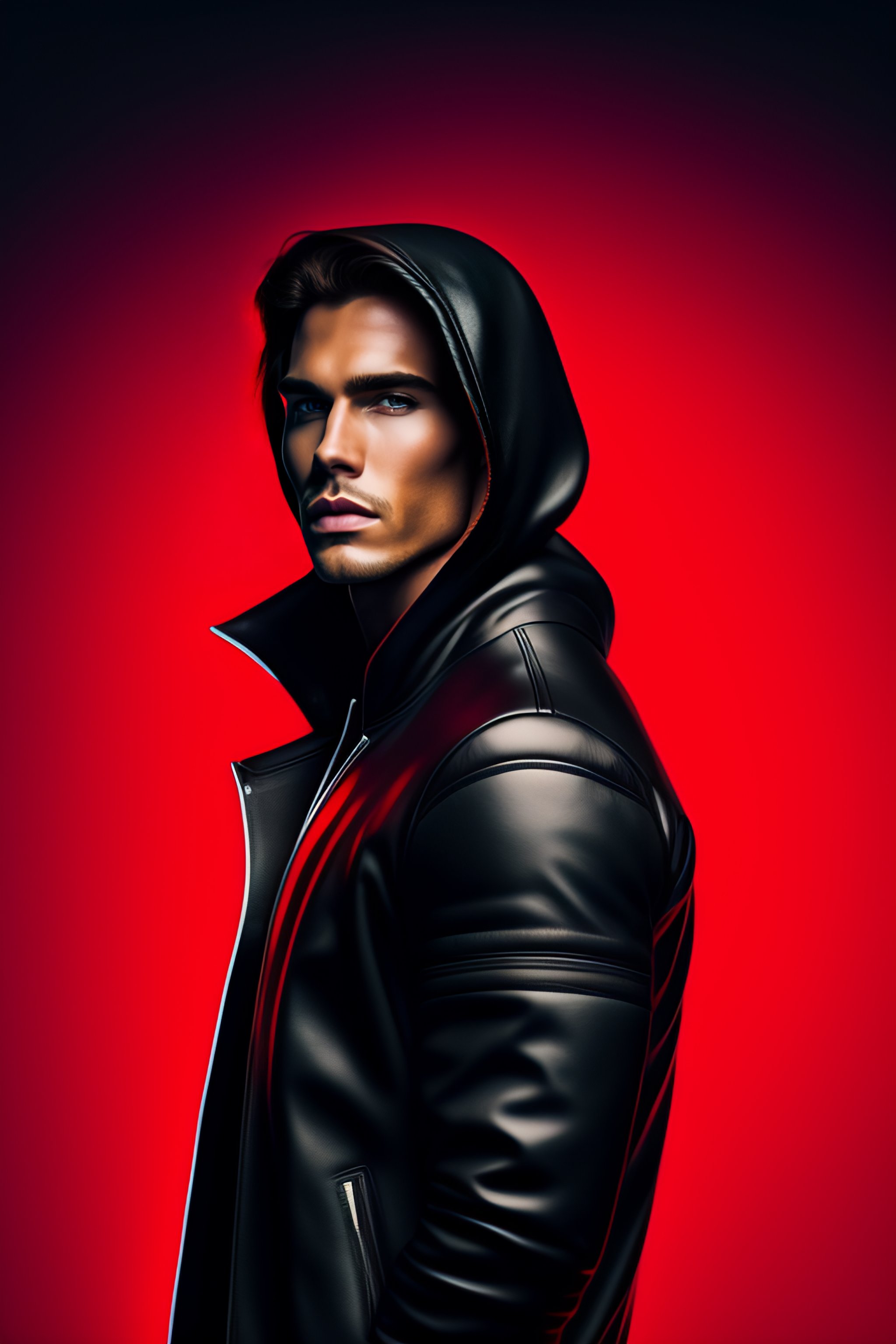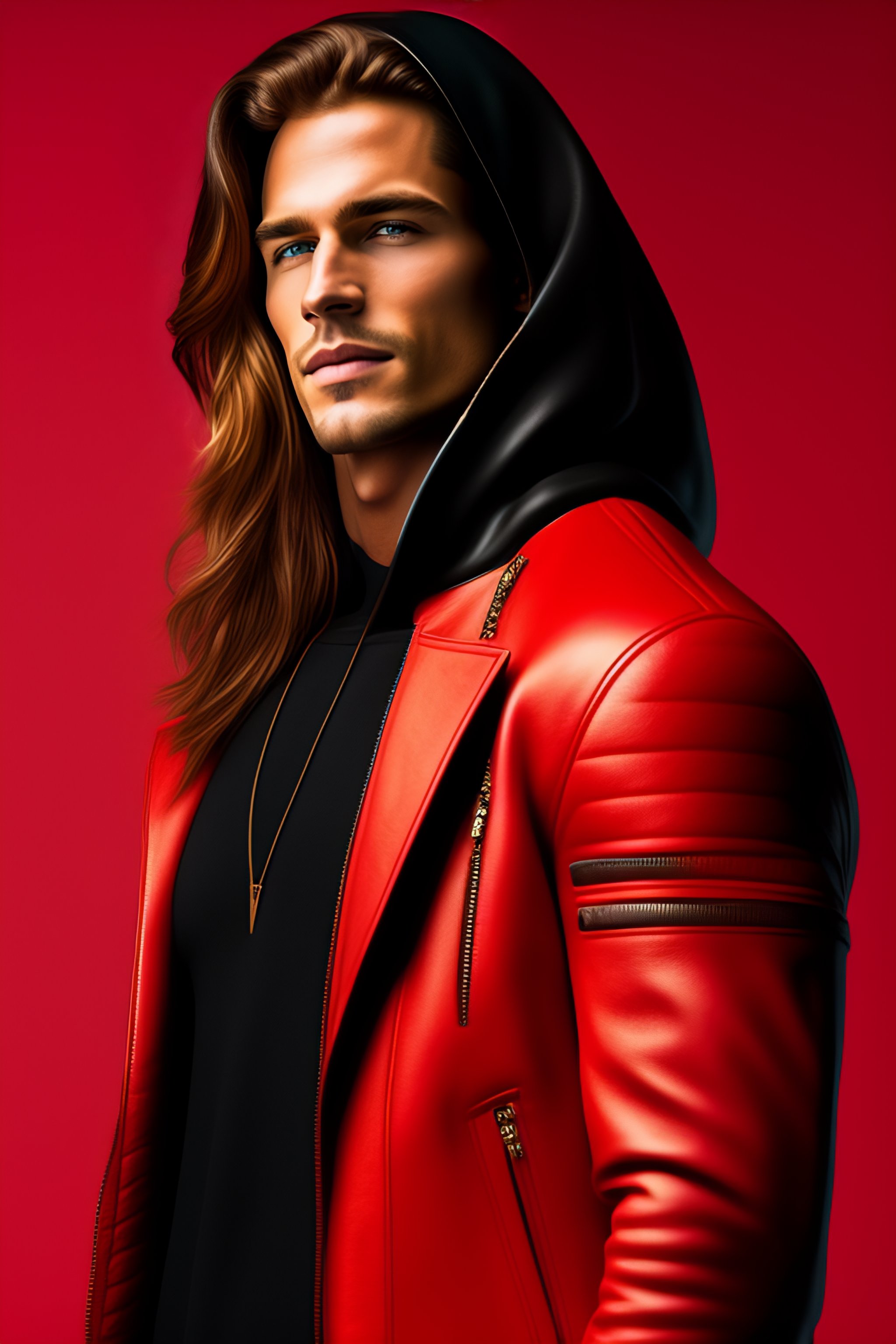 A guy in a leather jacket, a black hoodie holds the world on his finger, full height. red background, shoulder-length hair