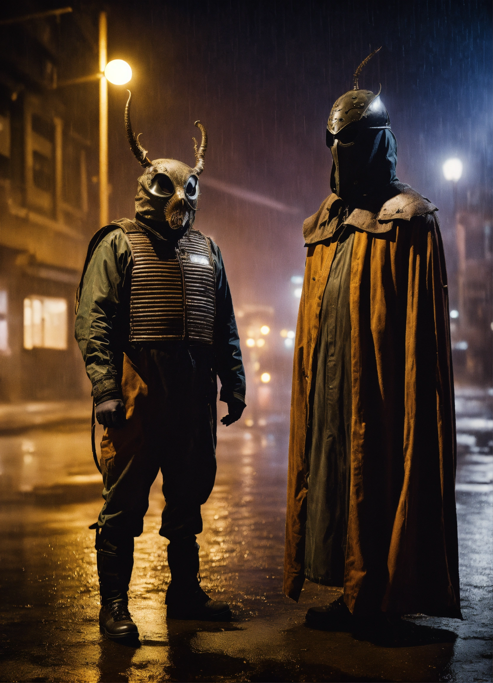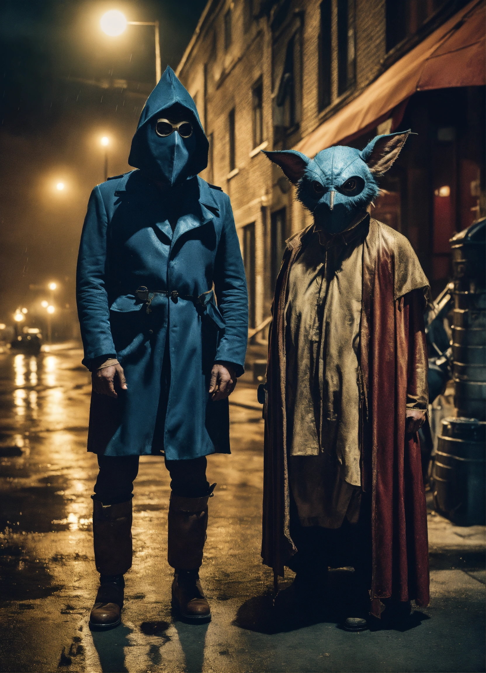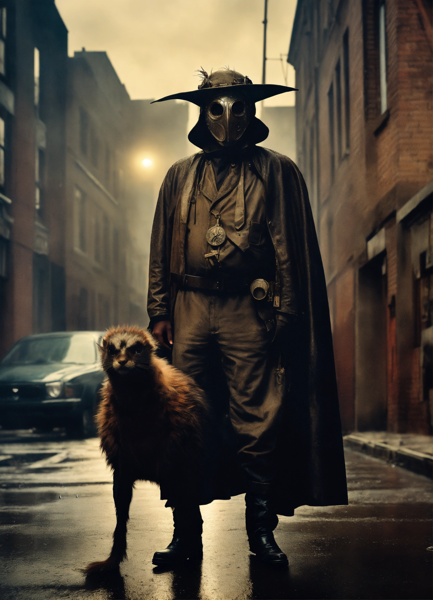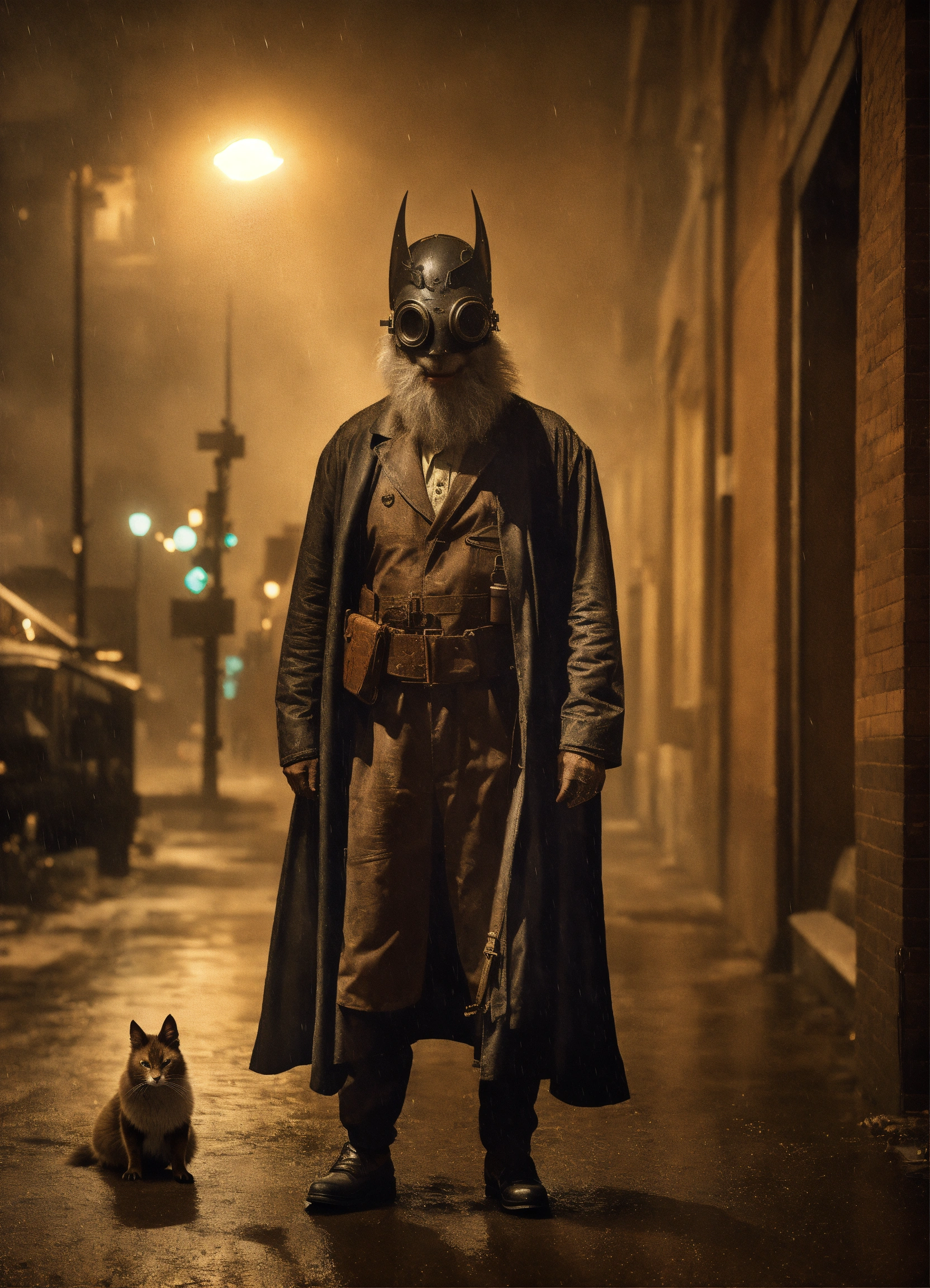 Old man wearing a masked superhero costume standing next to a strange creature, in the style of contemporary vintage photography, necronomicon illustrations, tabletop photography, 1890, hyperrealistic animal portraits, ghostly presence, street of postapocalyptic industrial street, night, rain