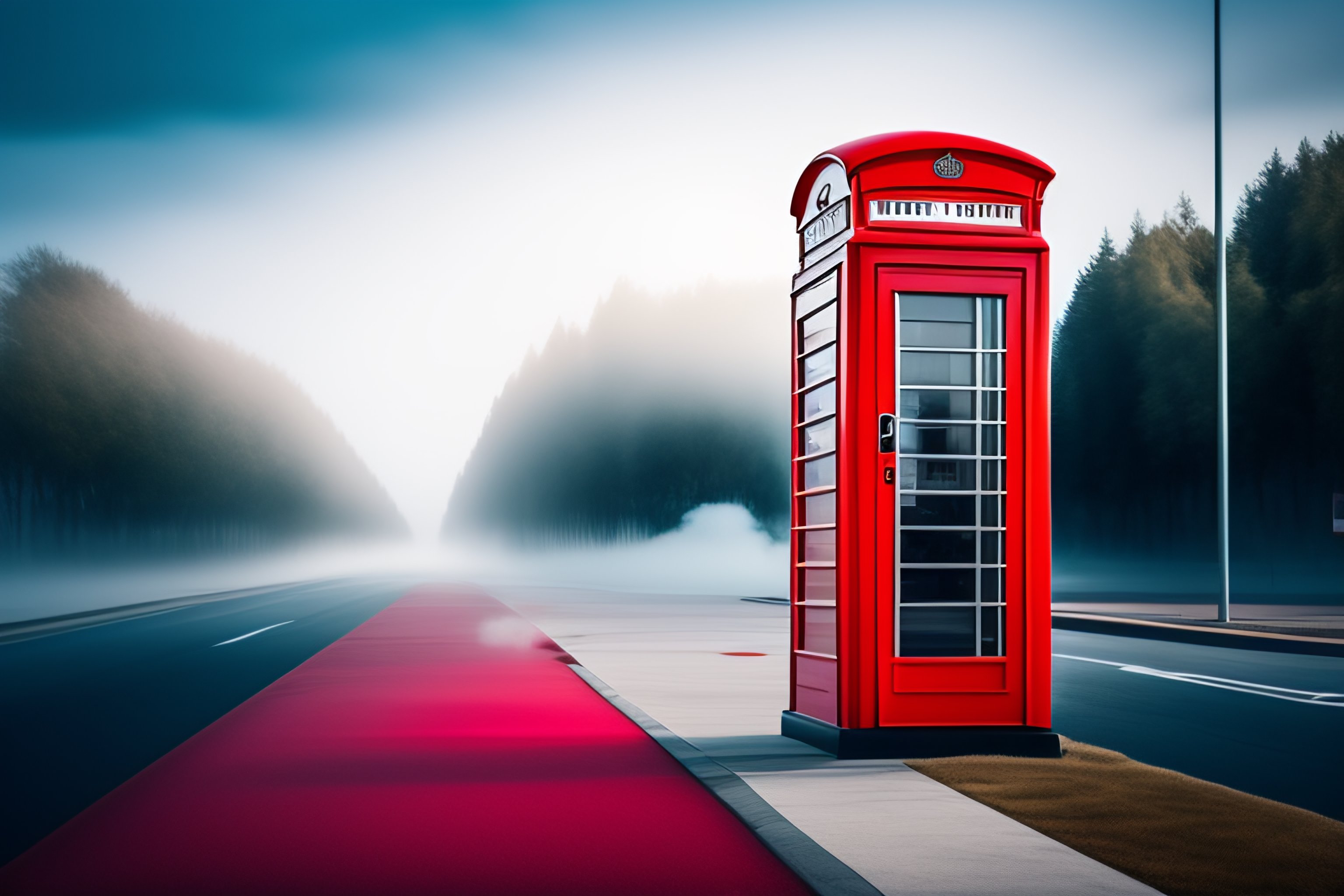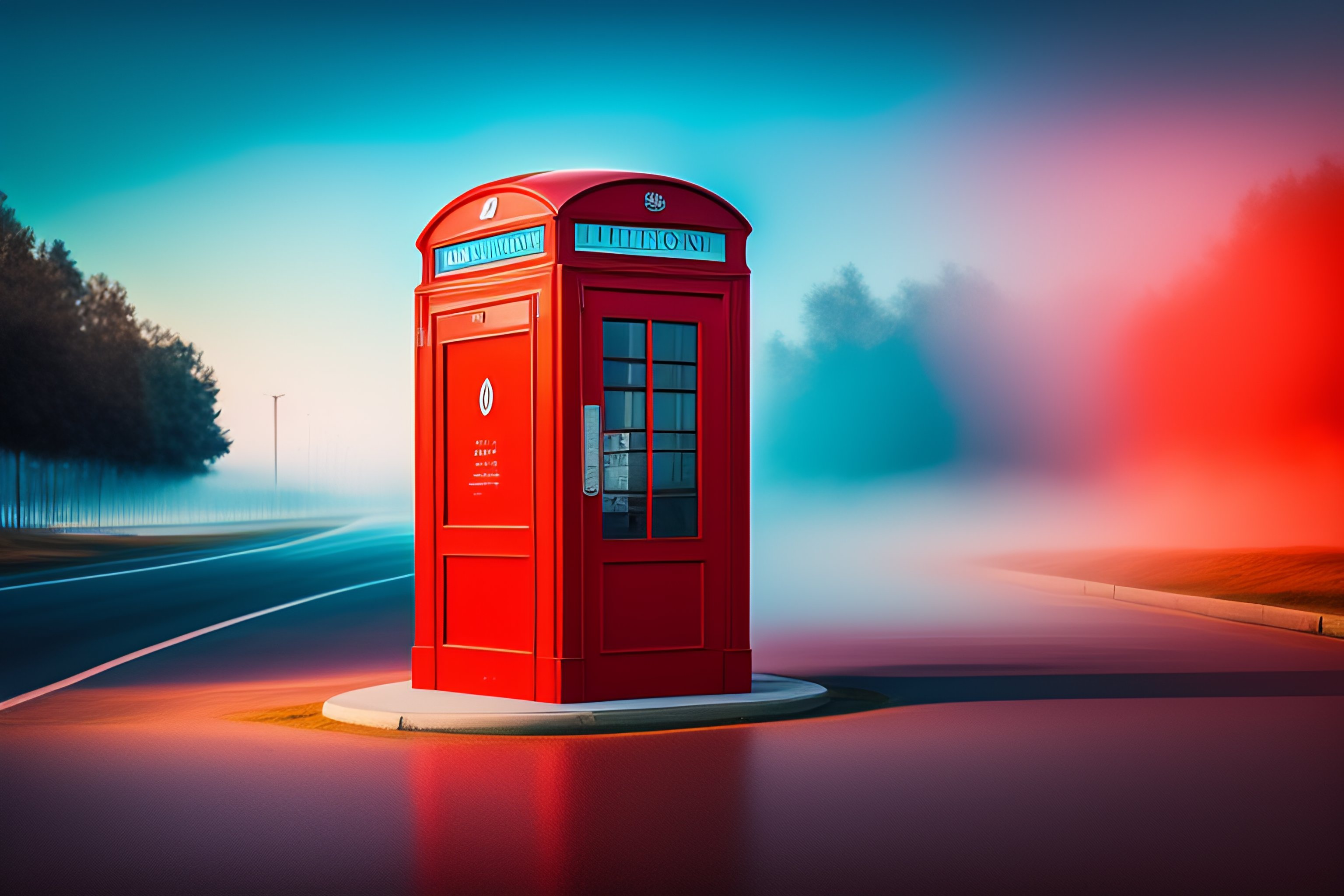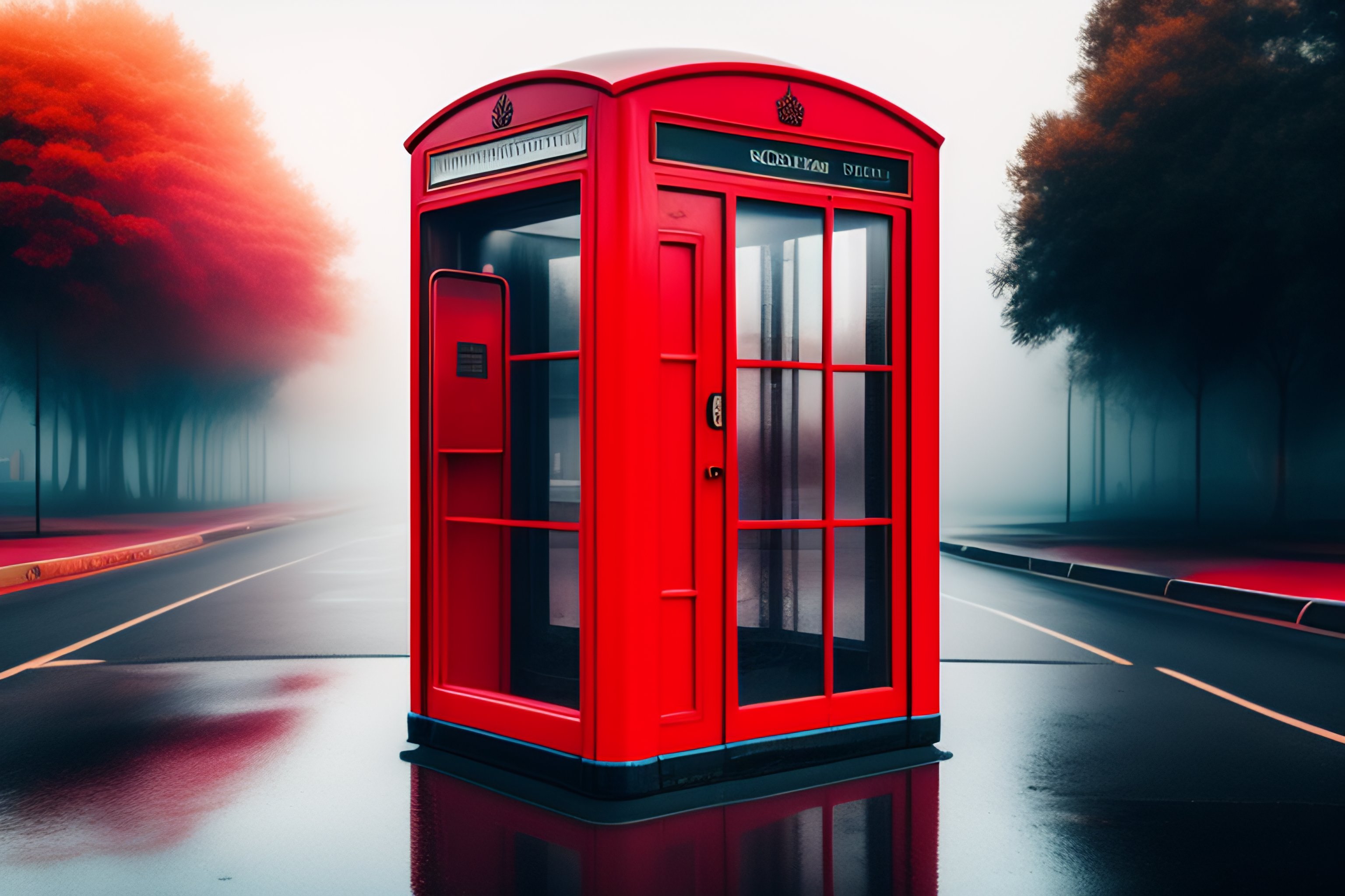 Color splash wide drone photo, of red phone booth inthe middle of empty street, detailed, mist, soft, vignette