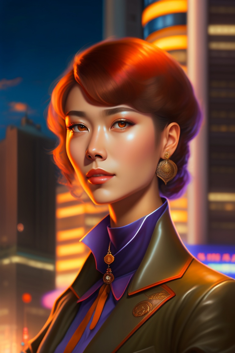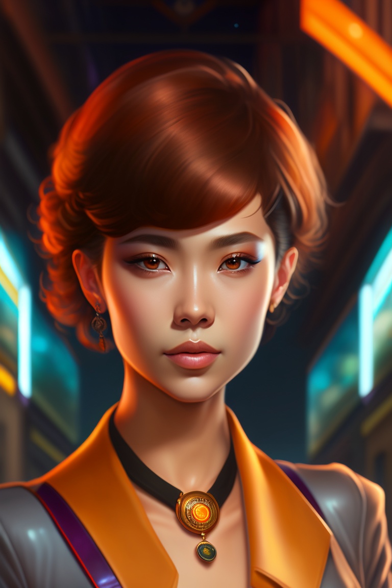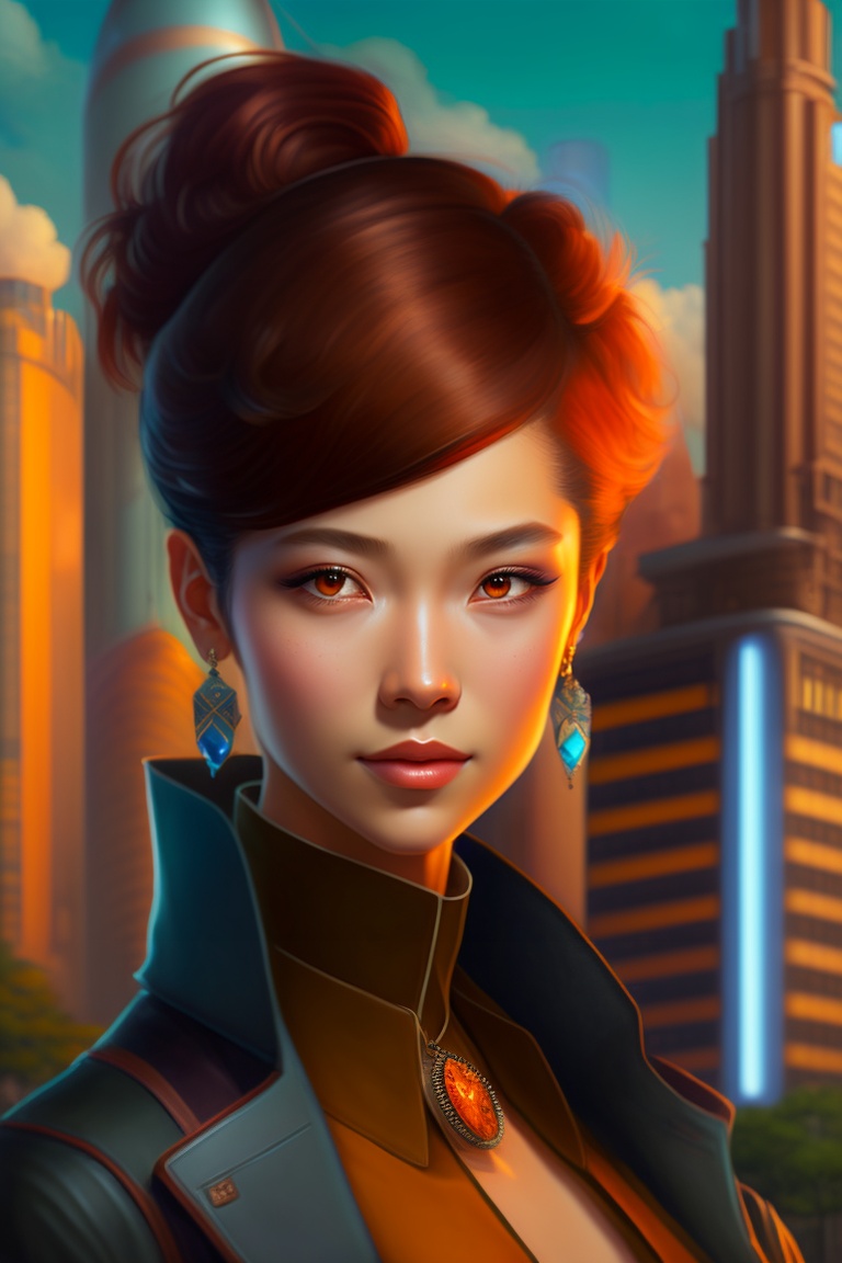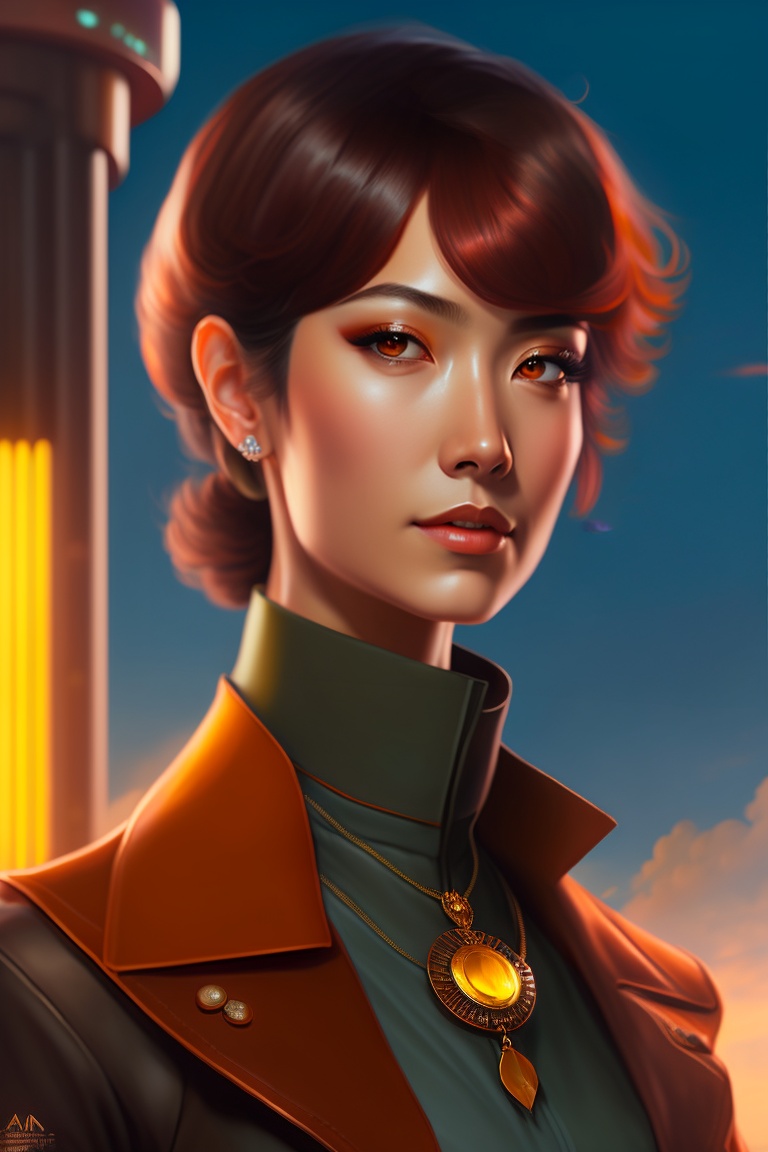 Detailed photorealistic portrait of a uraraka ochako, brown eyes, short hair, posing for heroic look, dystopian city landscape background by denis villeneuve, amano, yves tanguy, alphonse mucha, ernst haeckel, david lynch, edward robert hughes, roger dean, cyber necklace, rich moody colours
