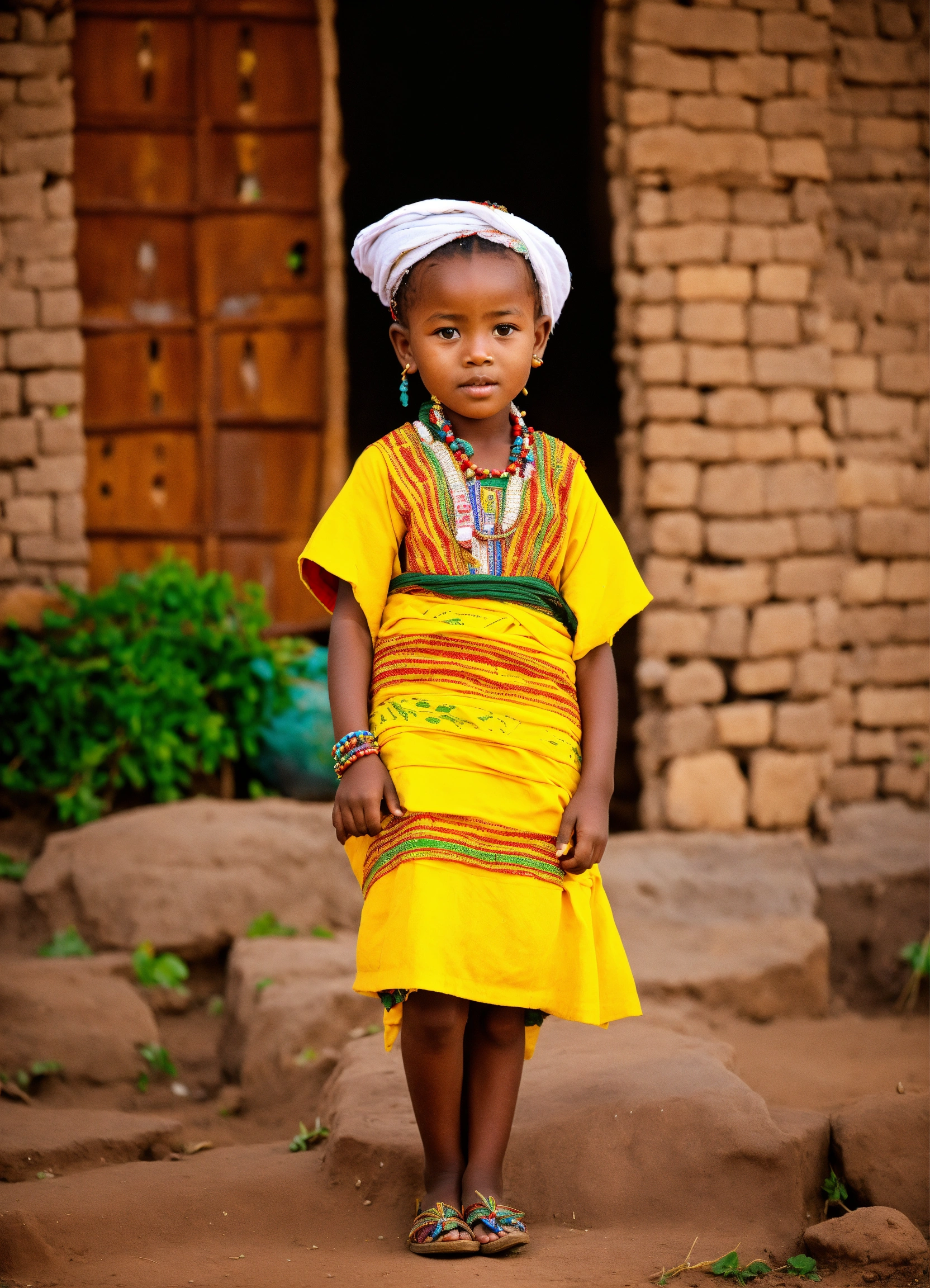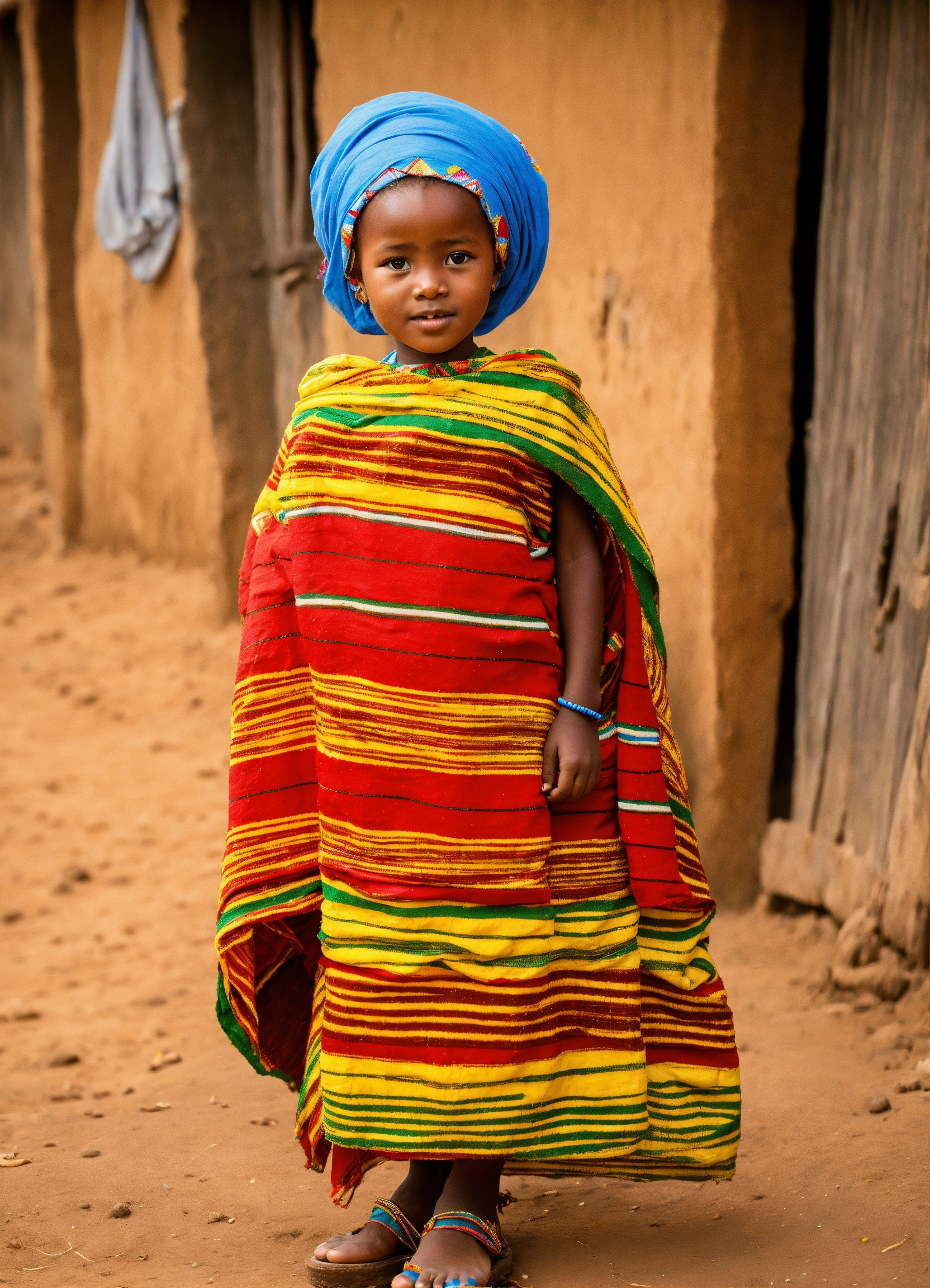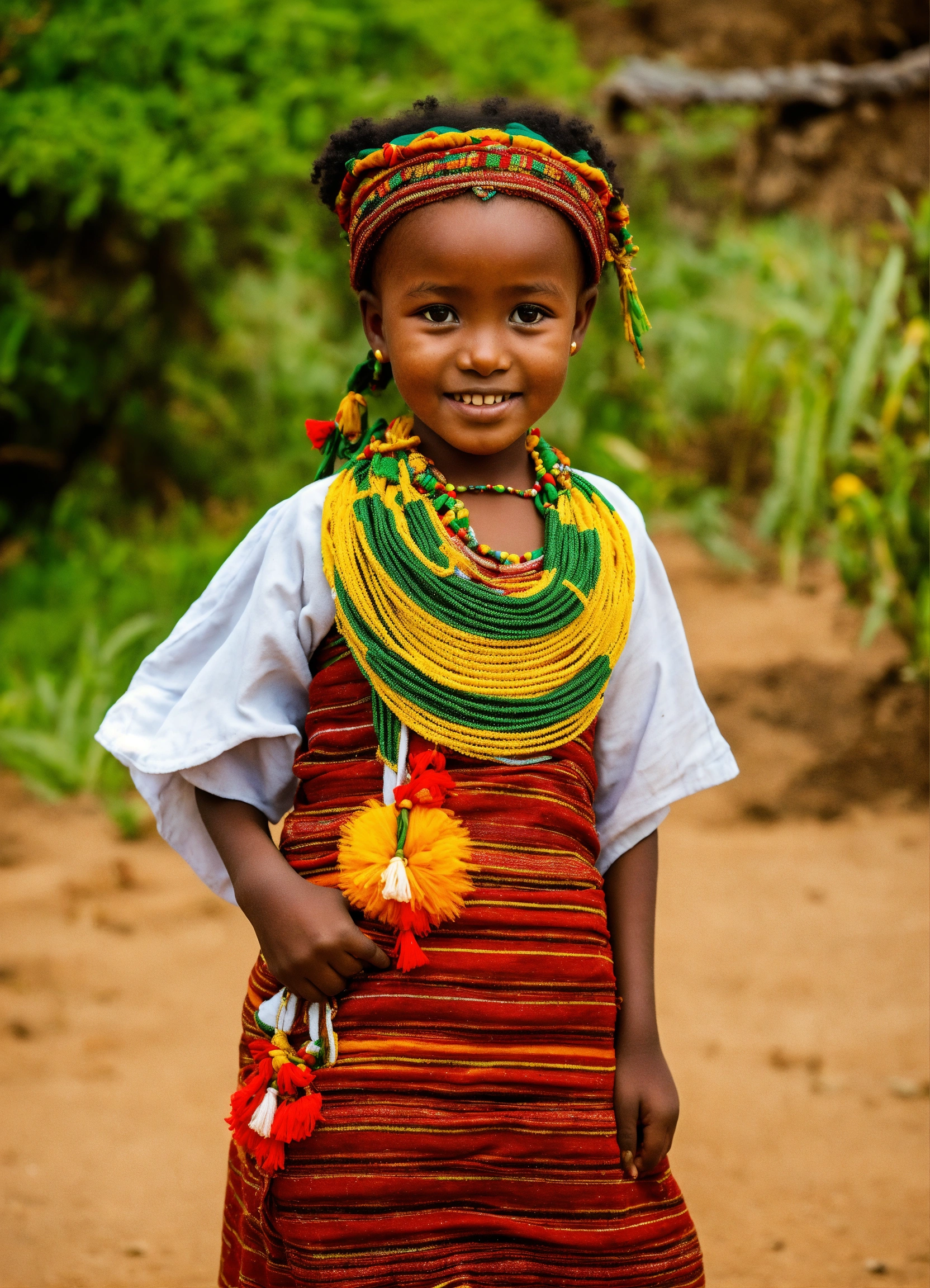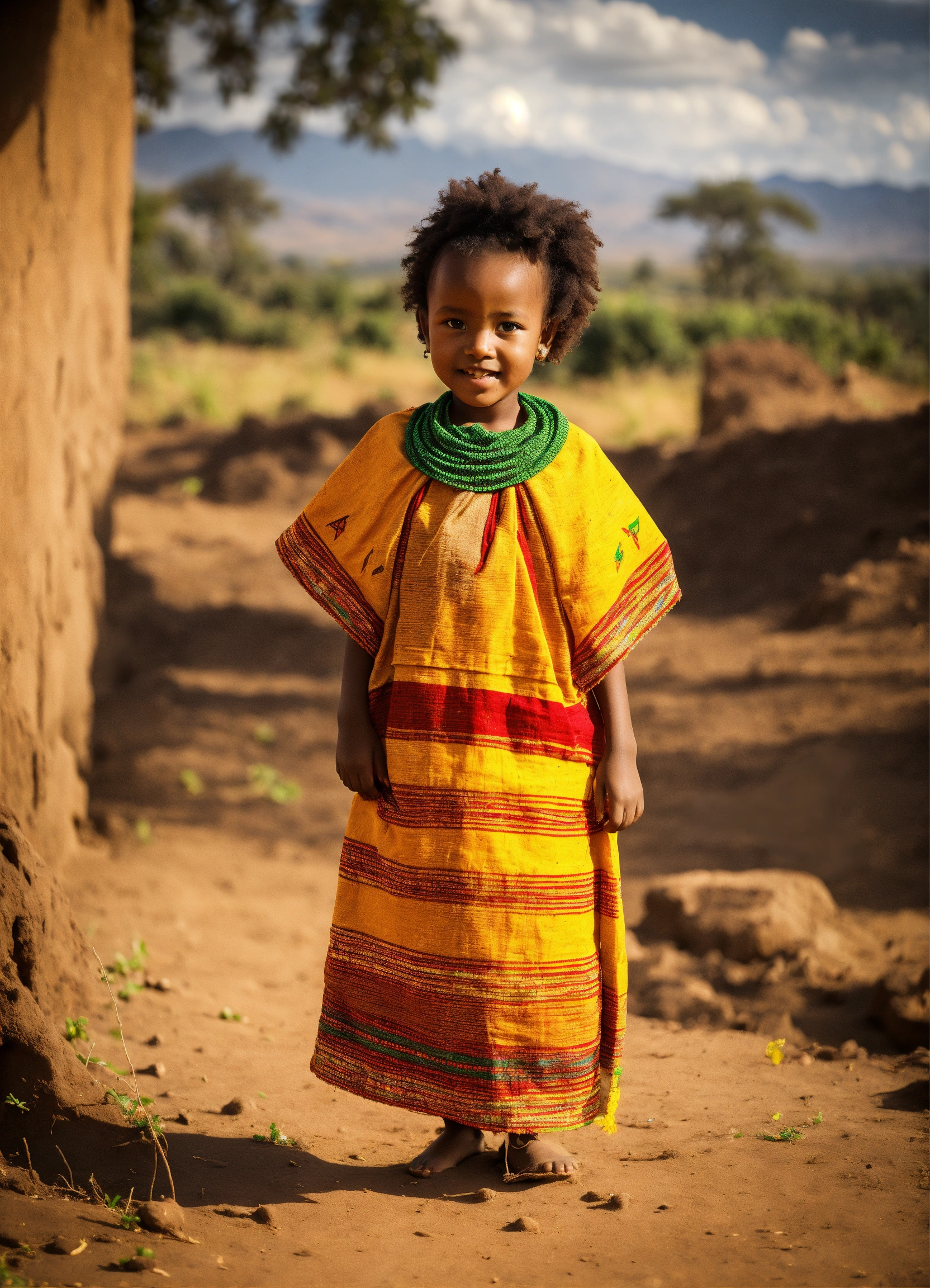 An ethiopian little girl wearing ethiopian traditional cloth located in ethiopian country side