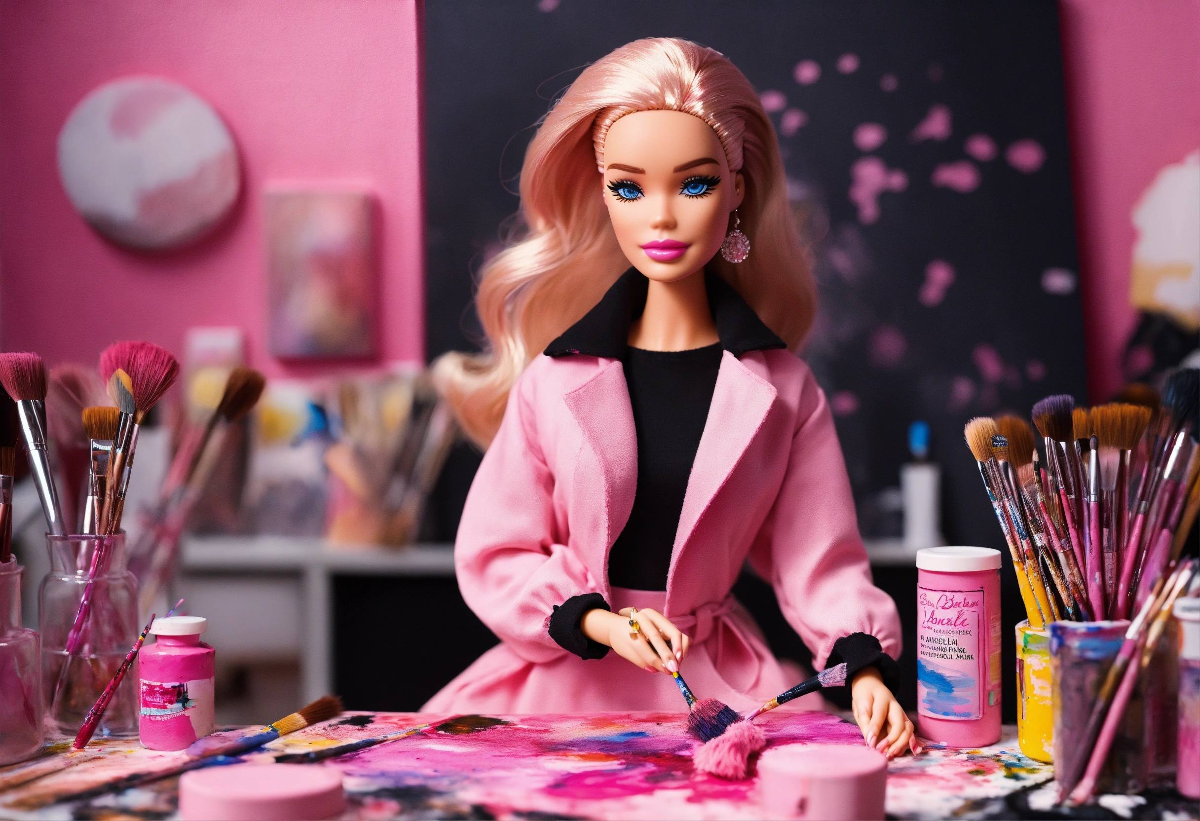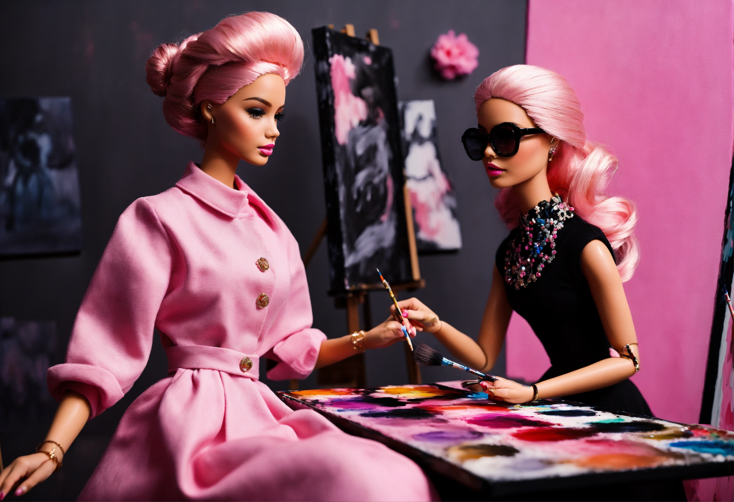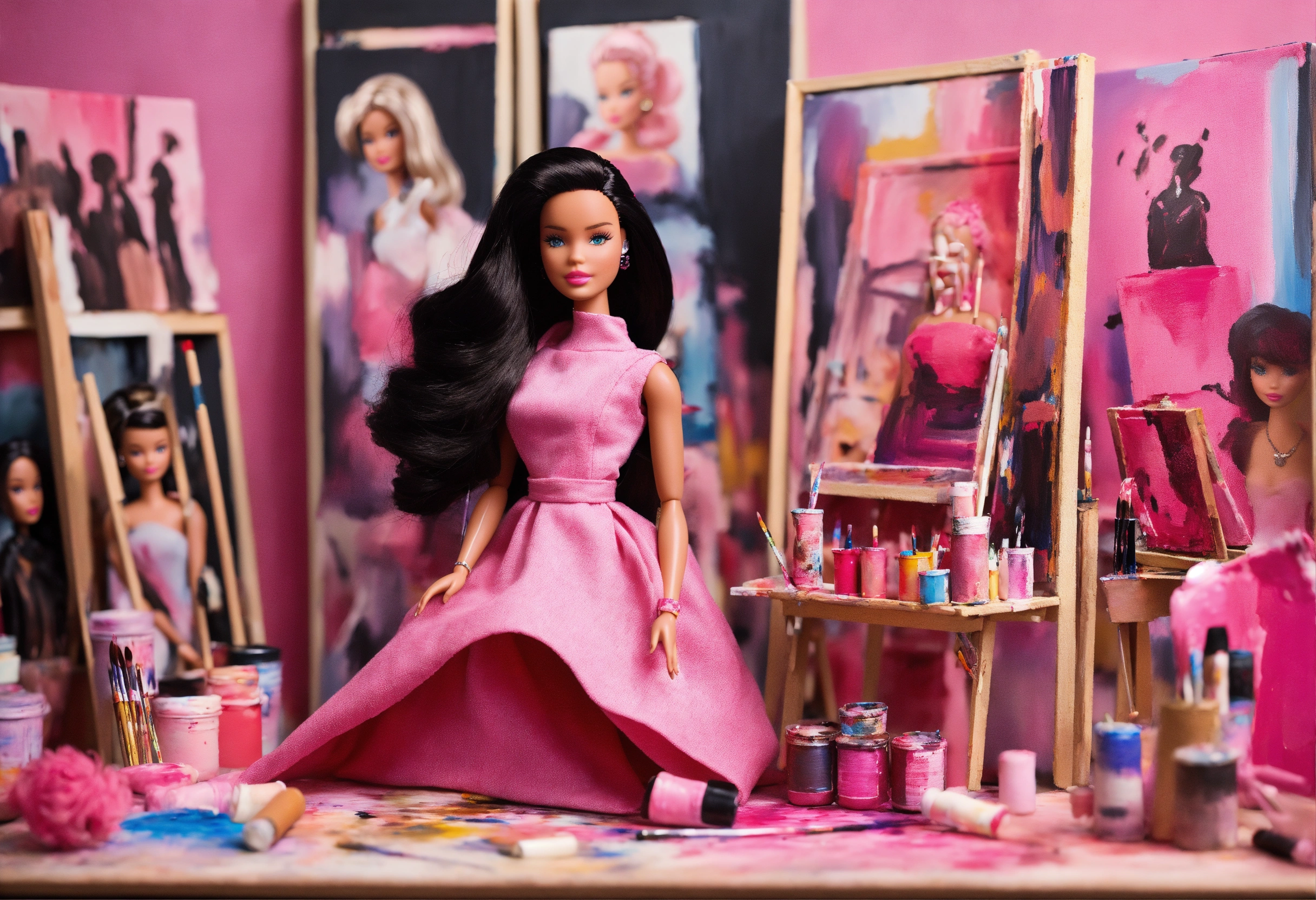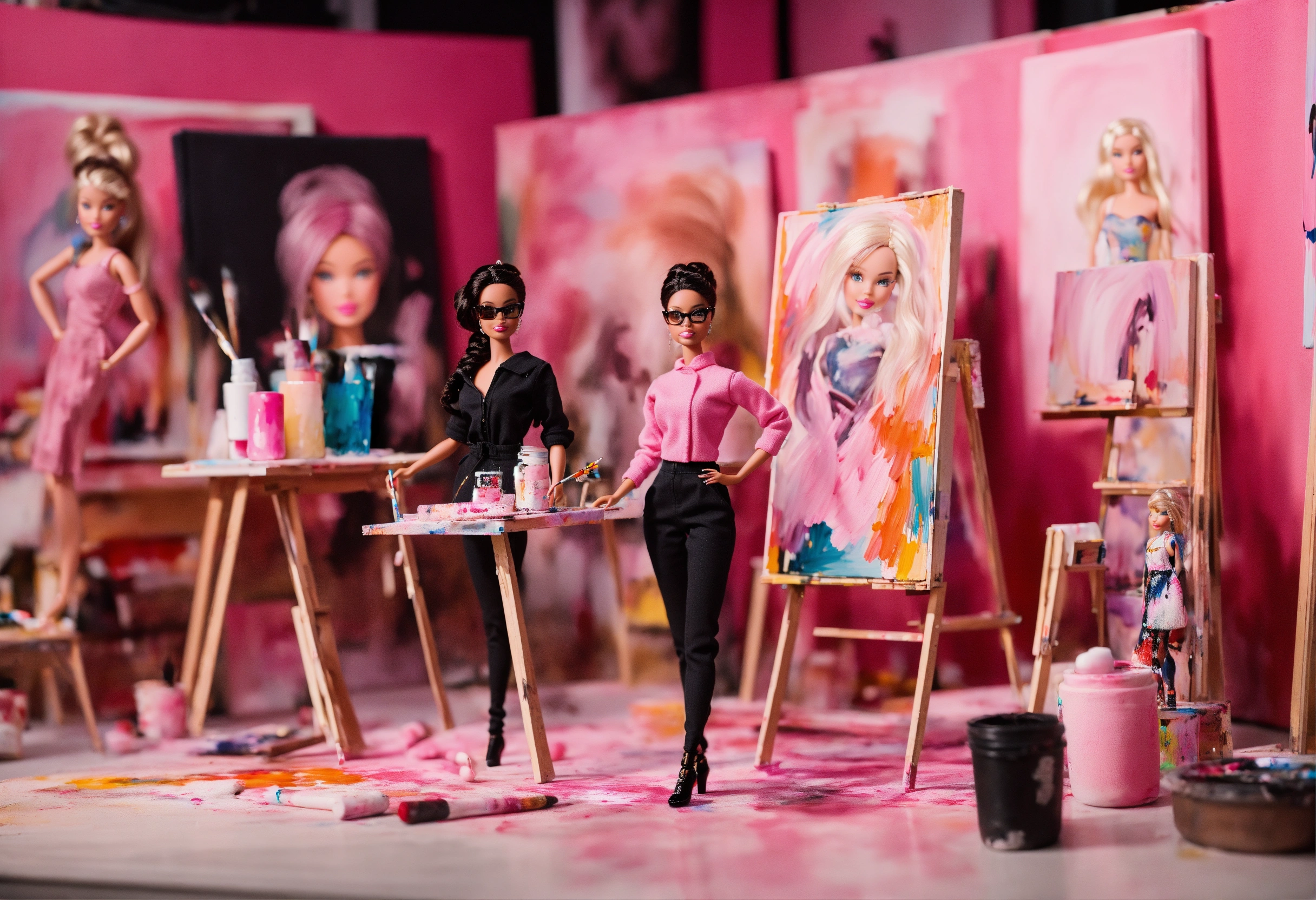 Barbie dolls, career as a artist, pink, and black fashionable, gorgeous, working in a art studio, painting on canvas