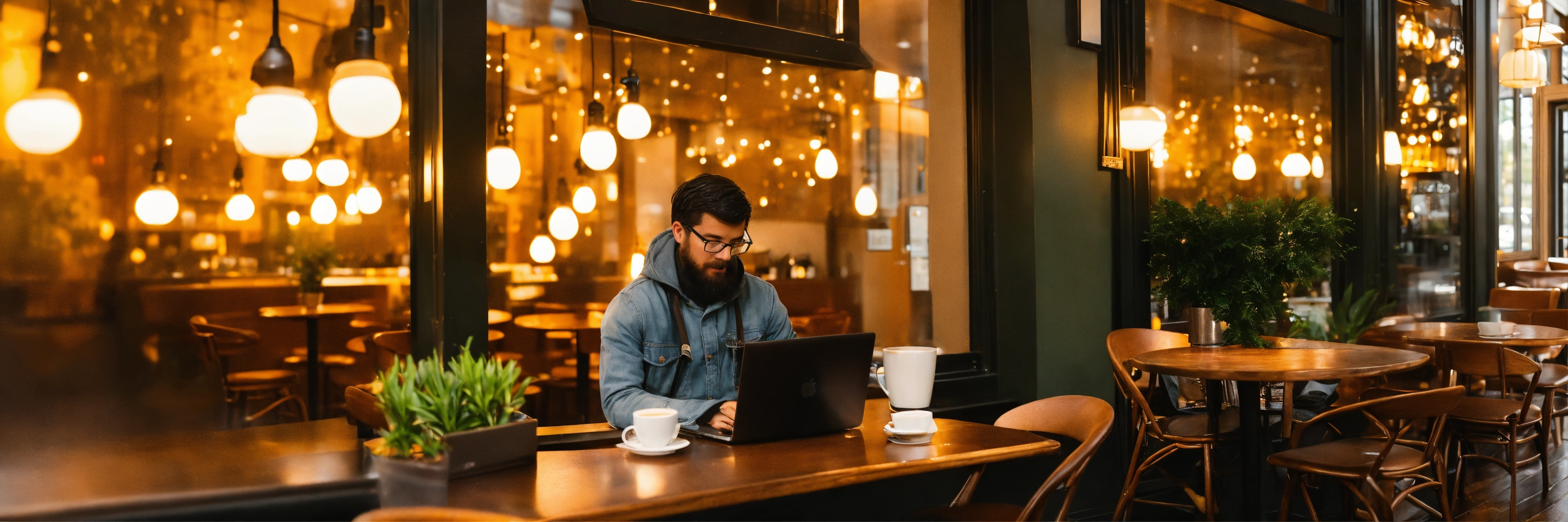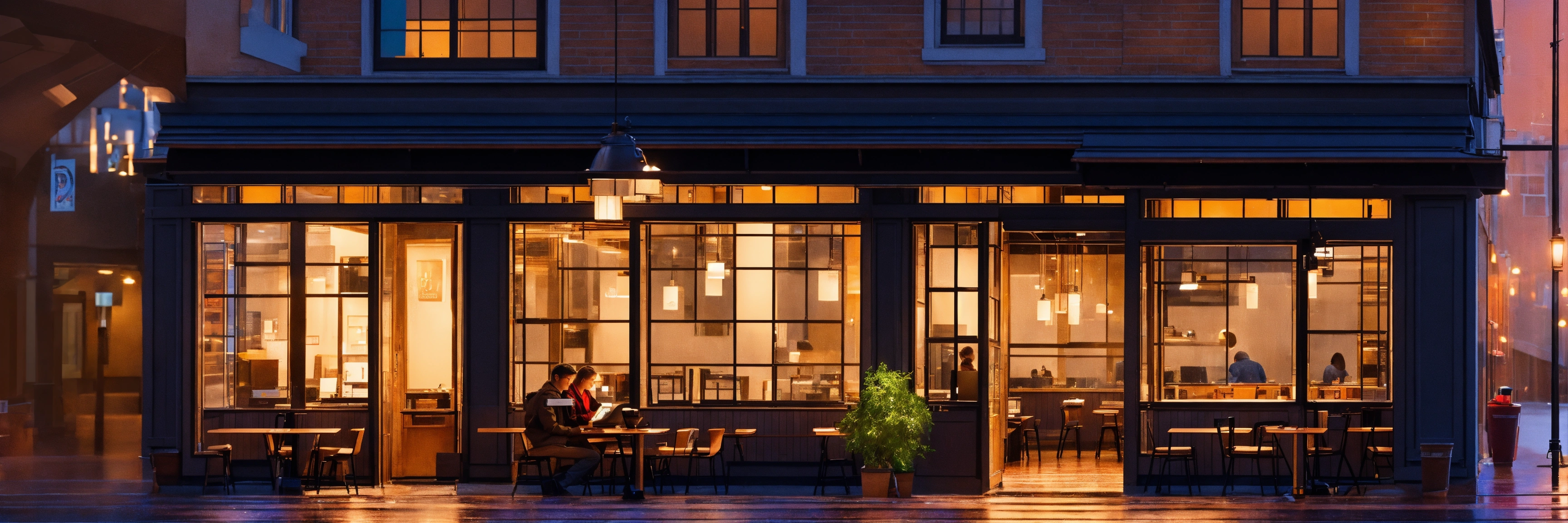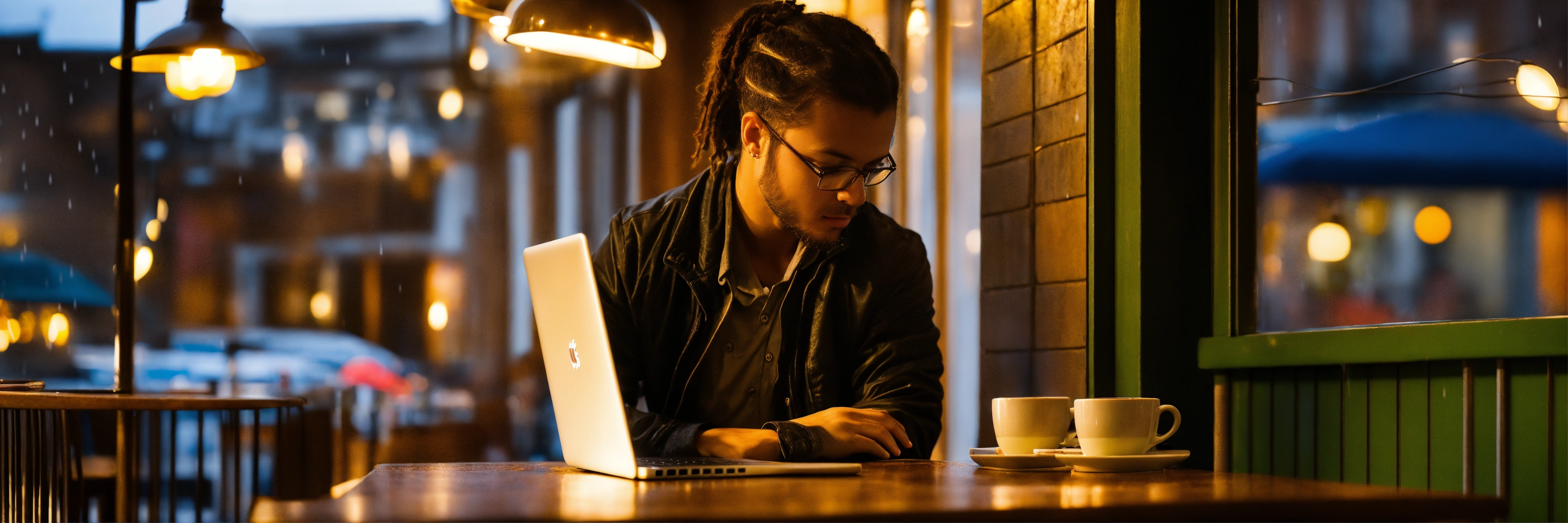 As the rain pours outside, a solopreneur cozies up in a corner of the coffee shop, their laptop open and ready for work. the warm glow of the cafe lights and the smell of freshly brewed coffee create the perfect atmosphere for productivity.