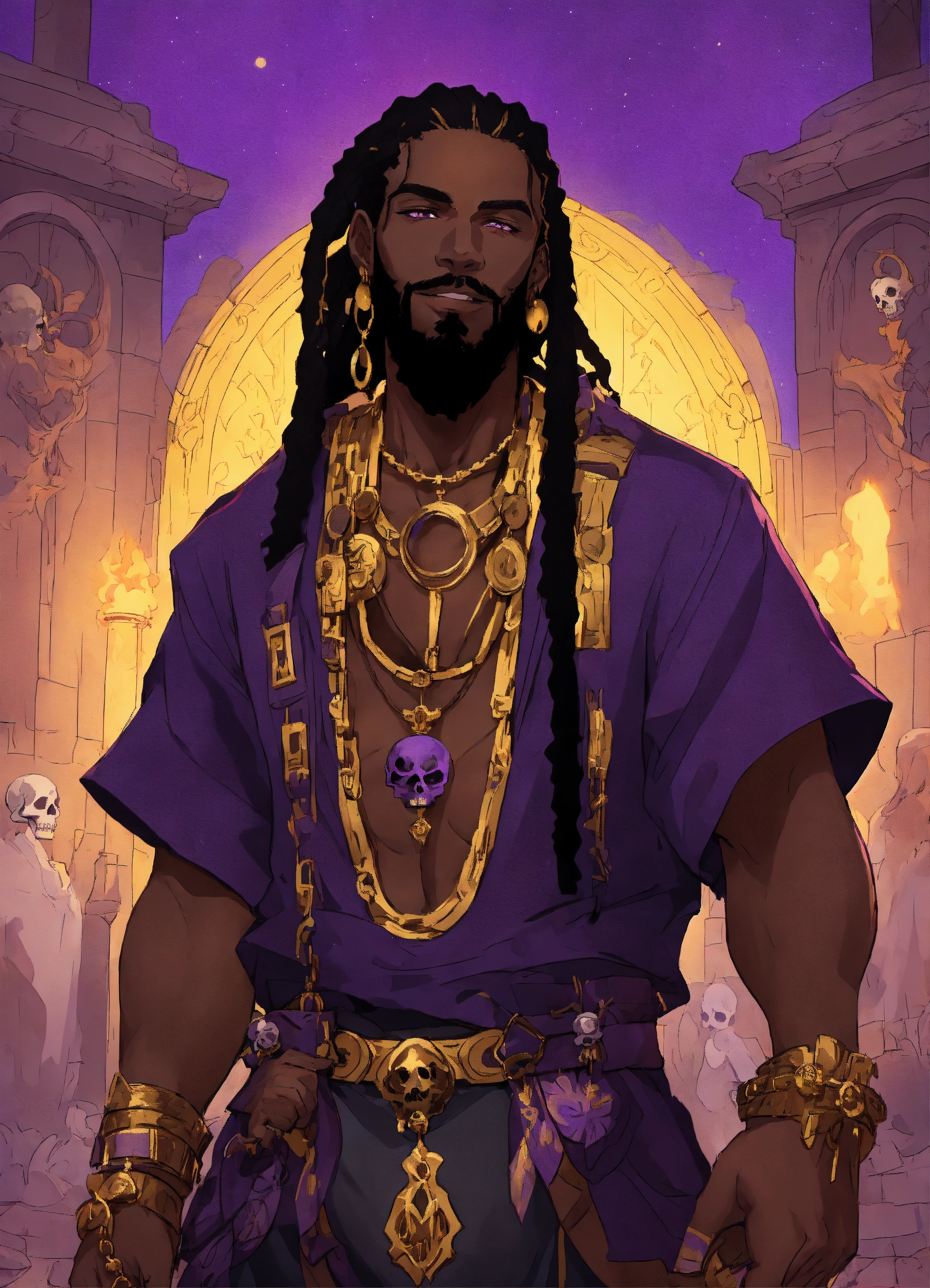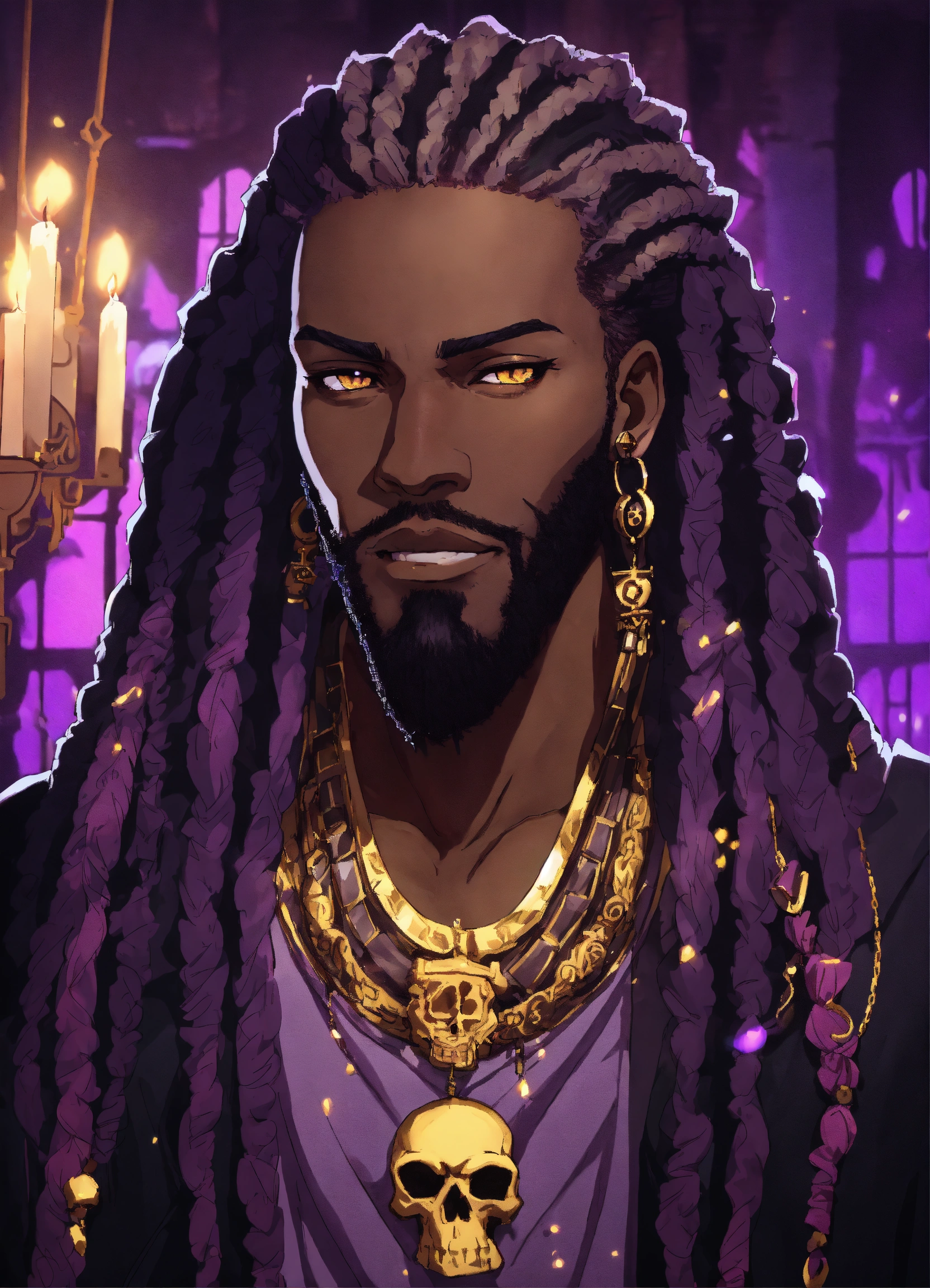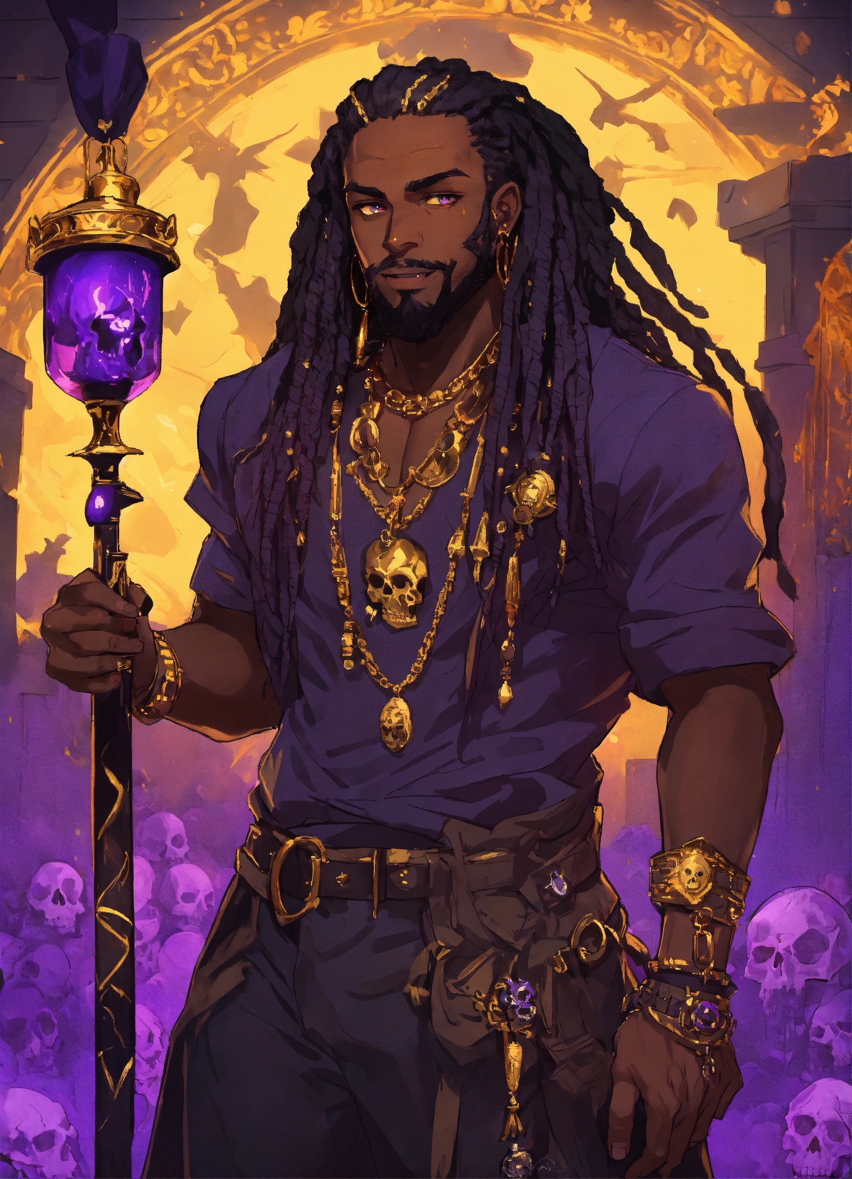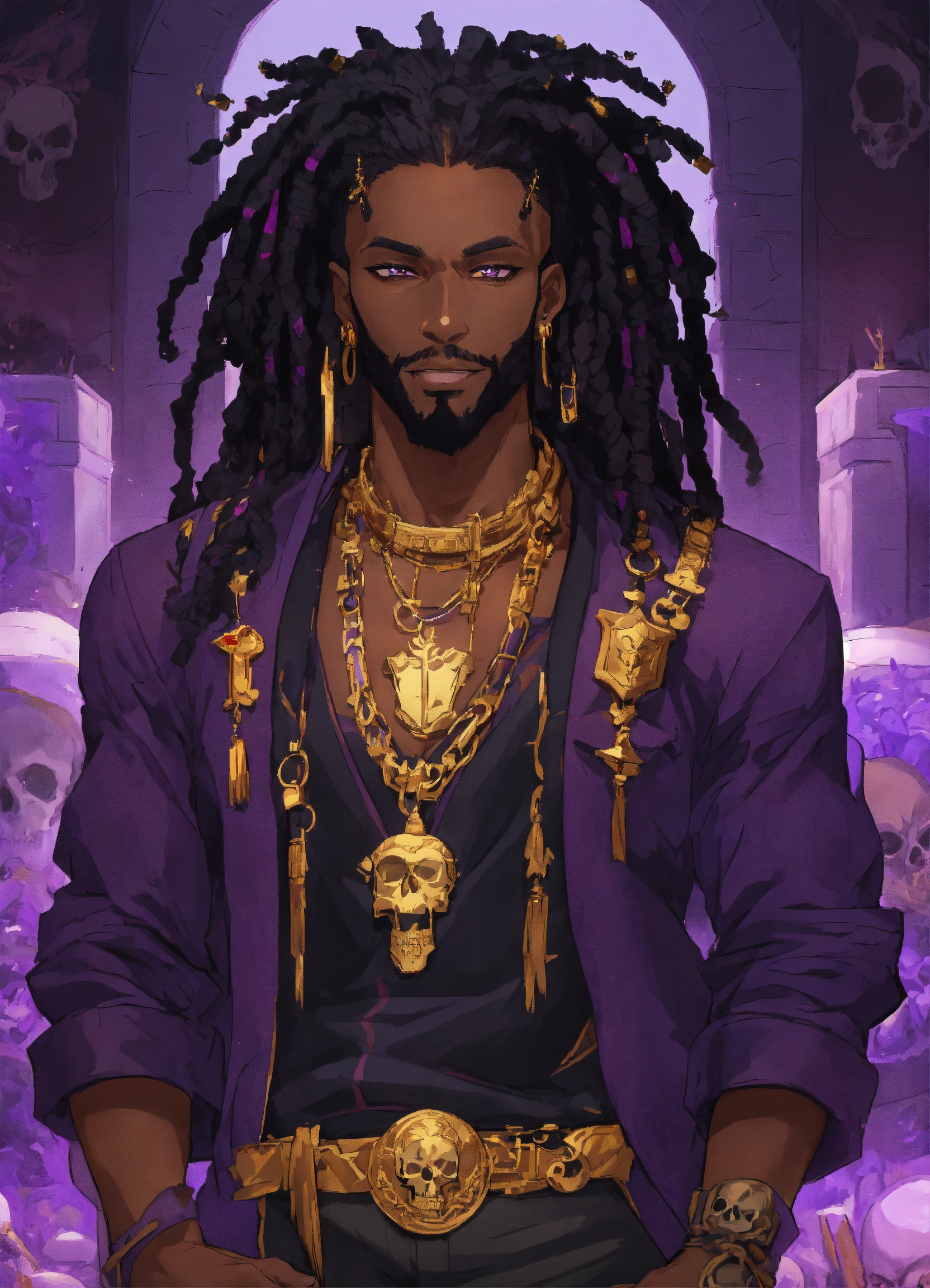 A dark-skinned black man with ornate long black, gold, and purple dreadlocks purple and gold eyes broad shouldered, barrel-chested low cut beard devious smirk onate skull necklace black, purple, gold color scheme surrounded by graves and spirits. anime artstyle, detailed, d&d attire, gravedigger clothes