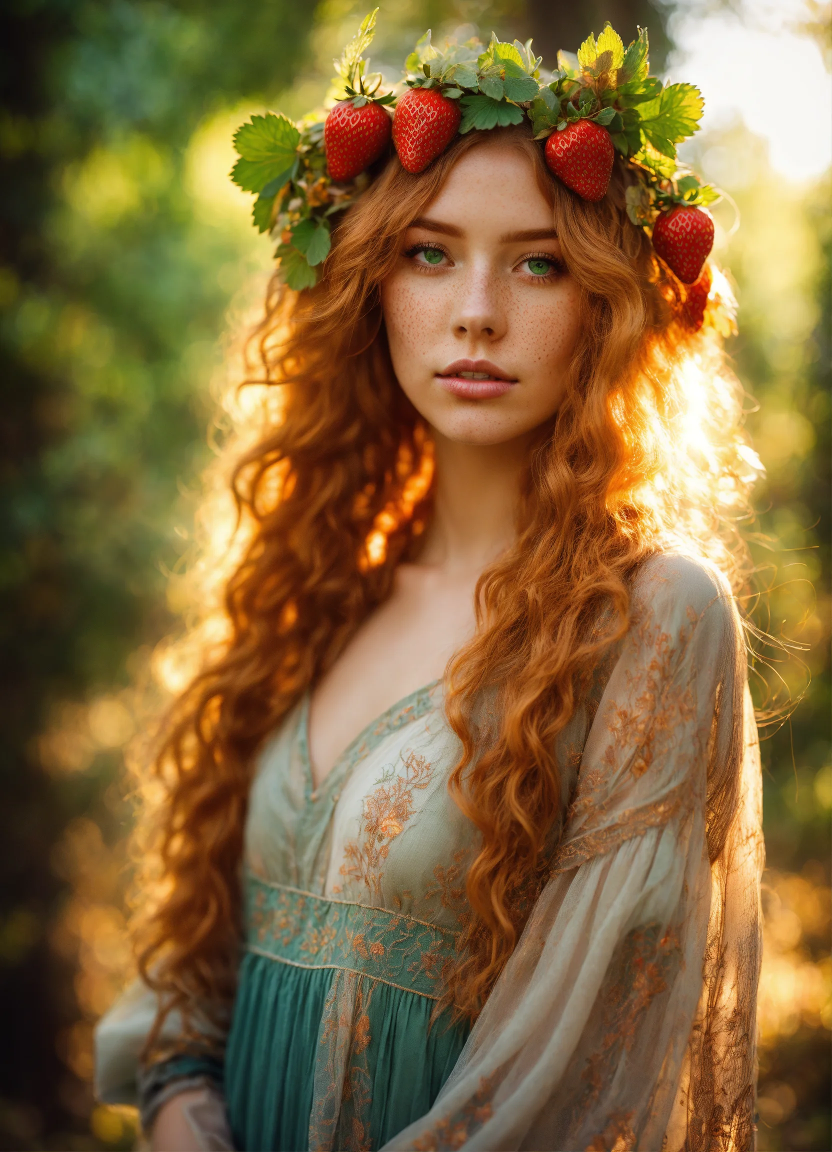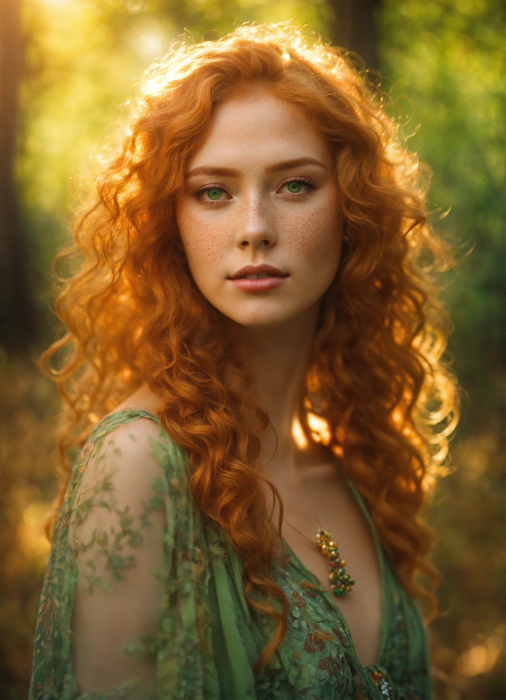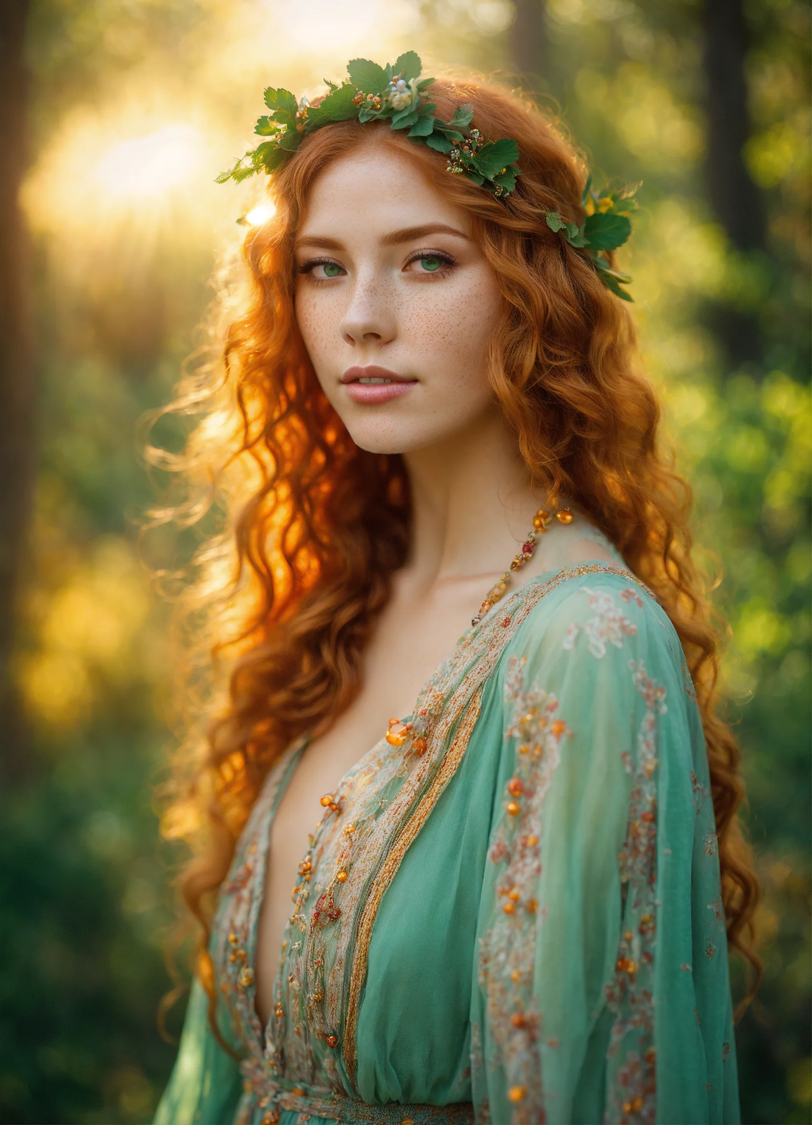 Bright, strawberry blonde-haired, with freckles. 30 year old 38 inch bustline anf full lips, green eyes, wearing amber strands and beads the sun, the autumn forest, fantastic beauty. curls. wearing a boho summer dress ultra-detailed dreamlike, photography 8k resolution image, translucent and ethereal.