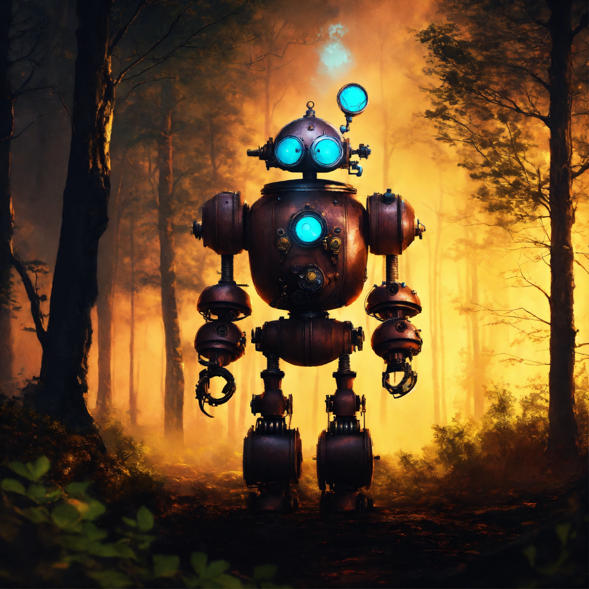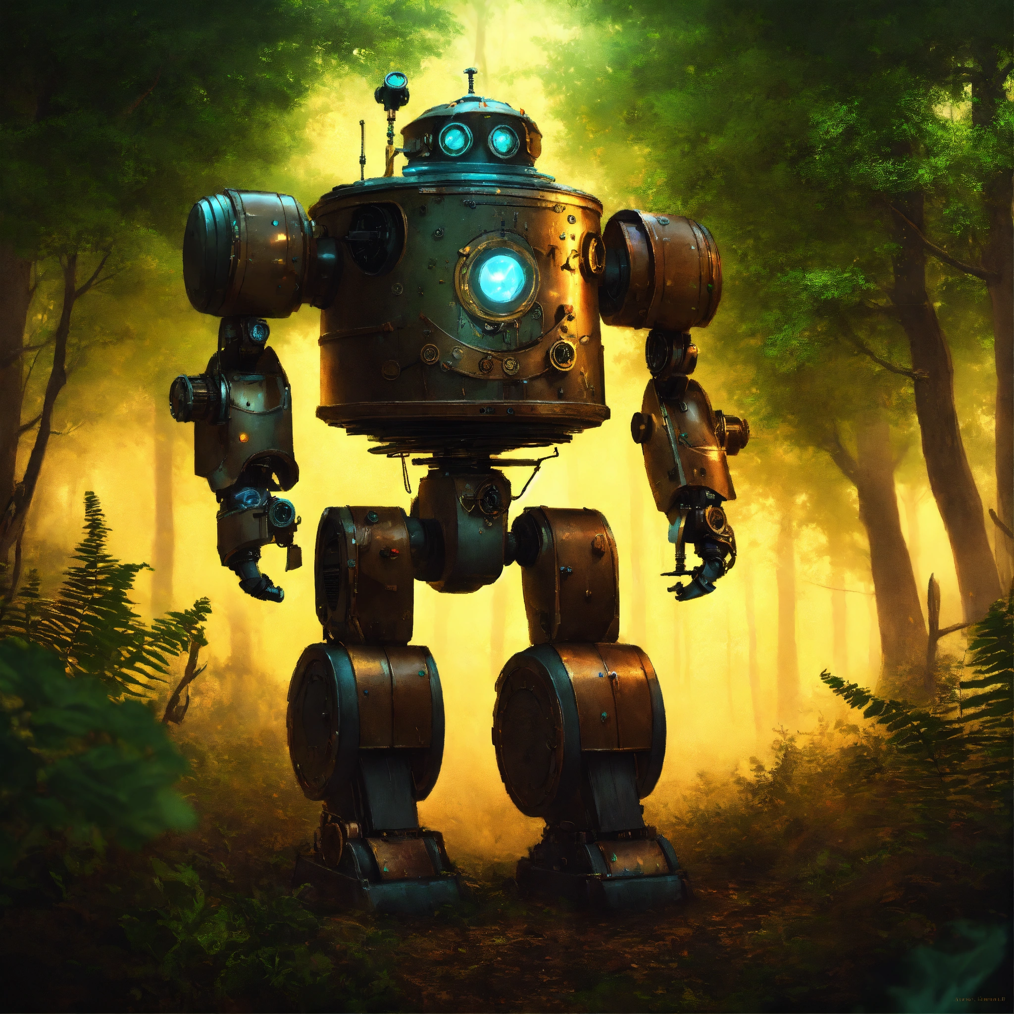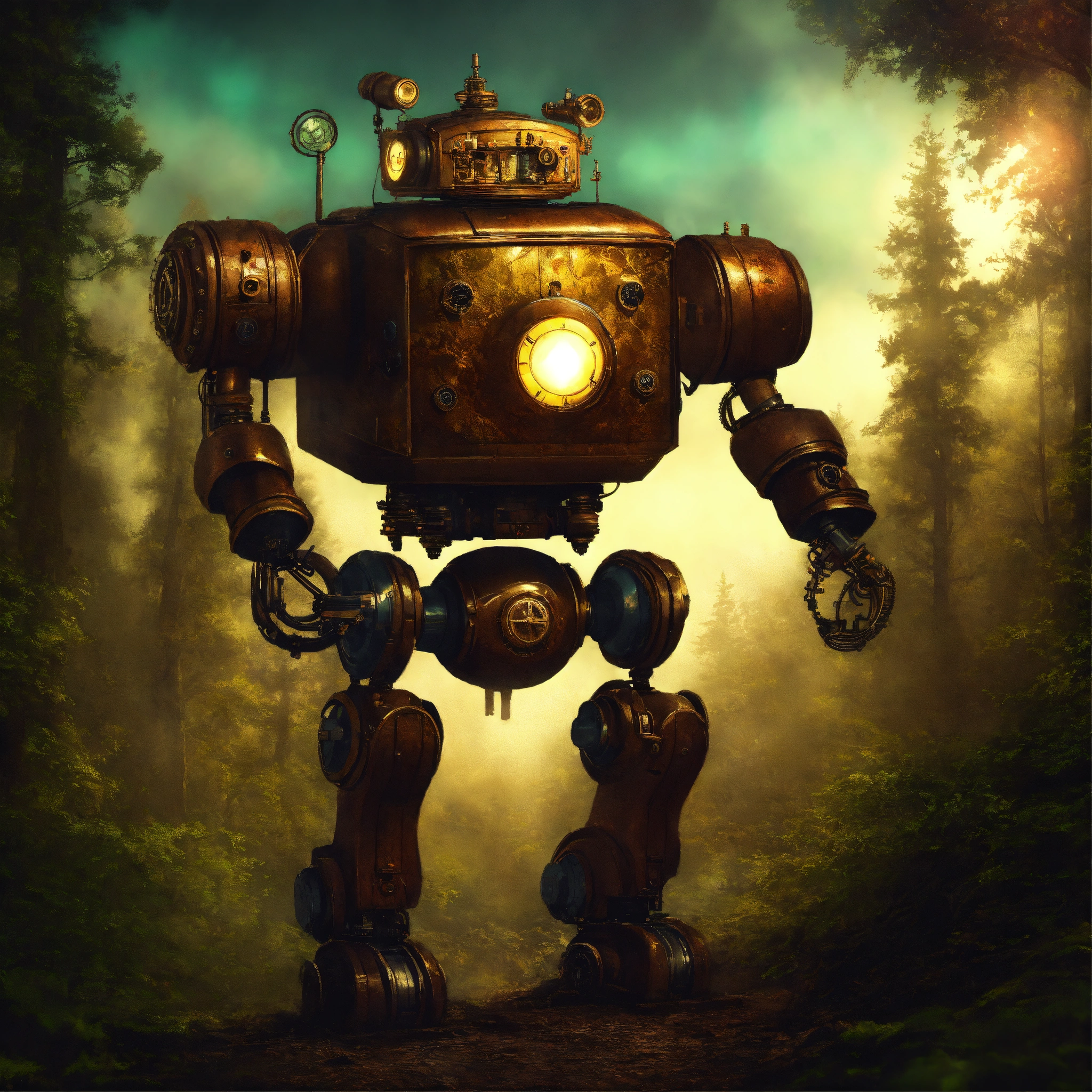 Steampunk robot, mustache, full body shot, forest background, dark dramatic lighting, digital painting, fantasy art