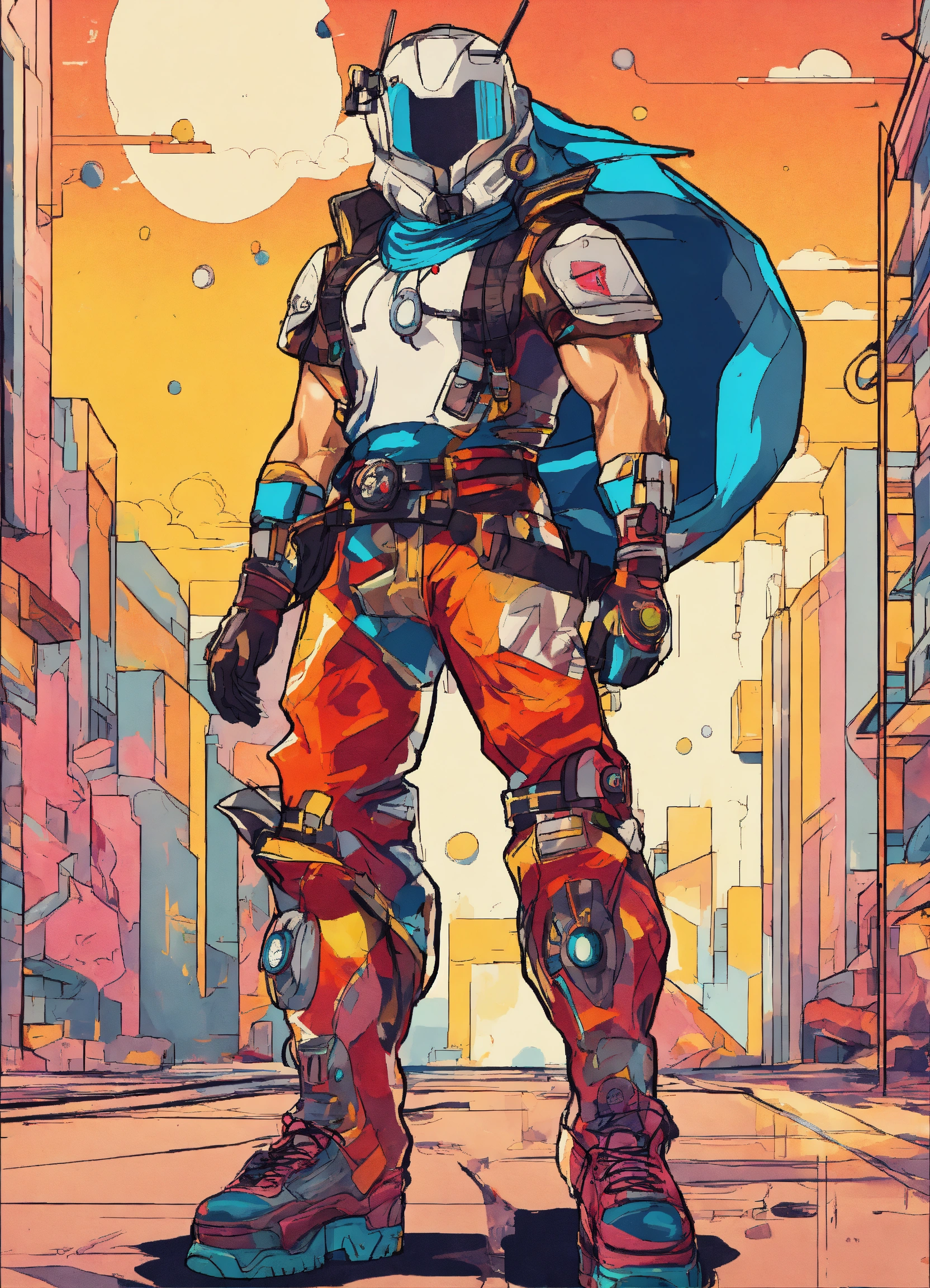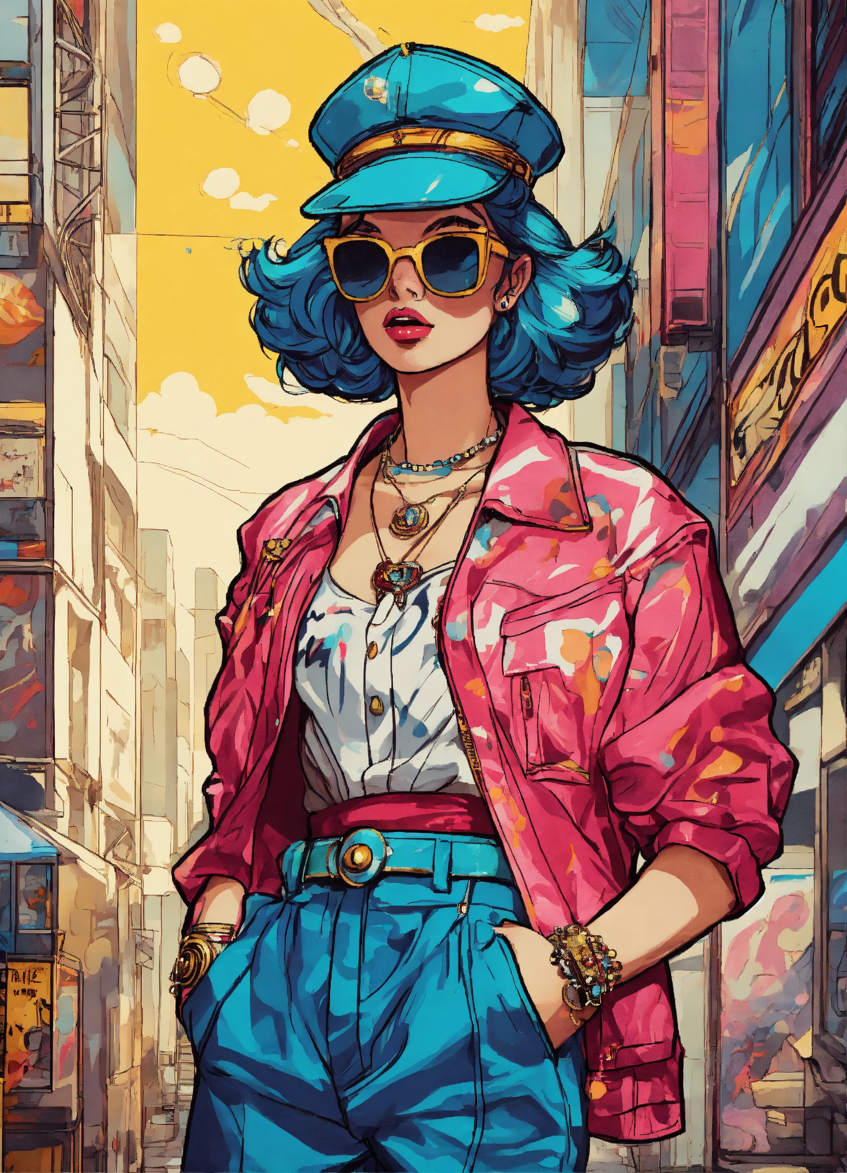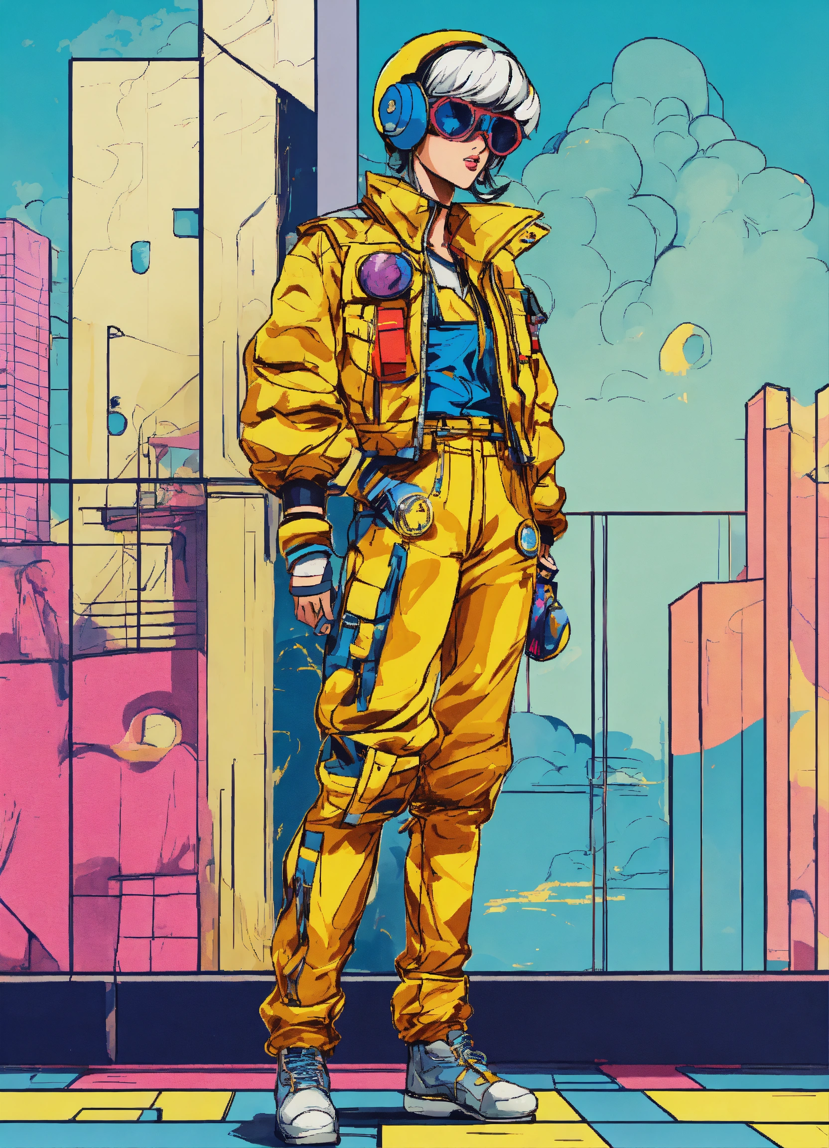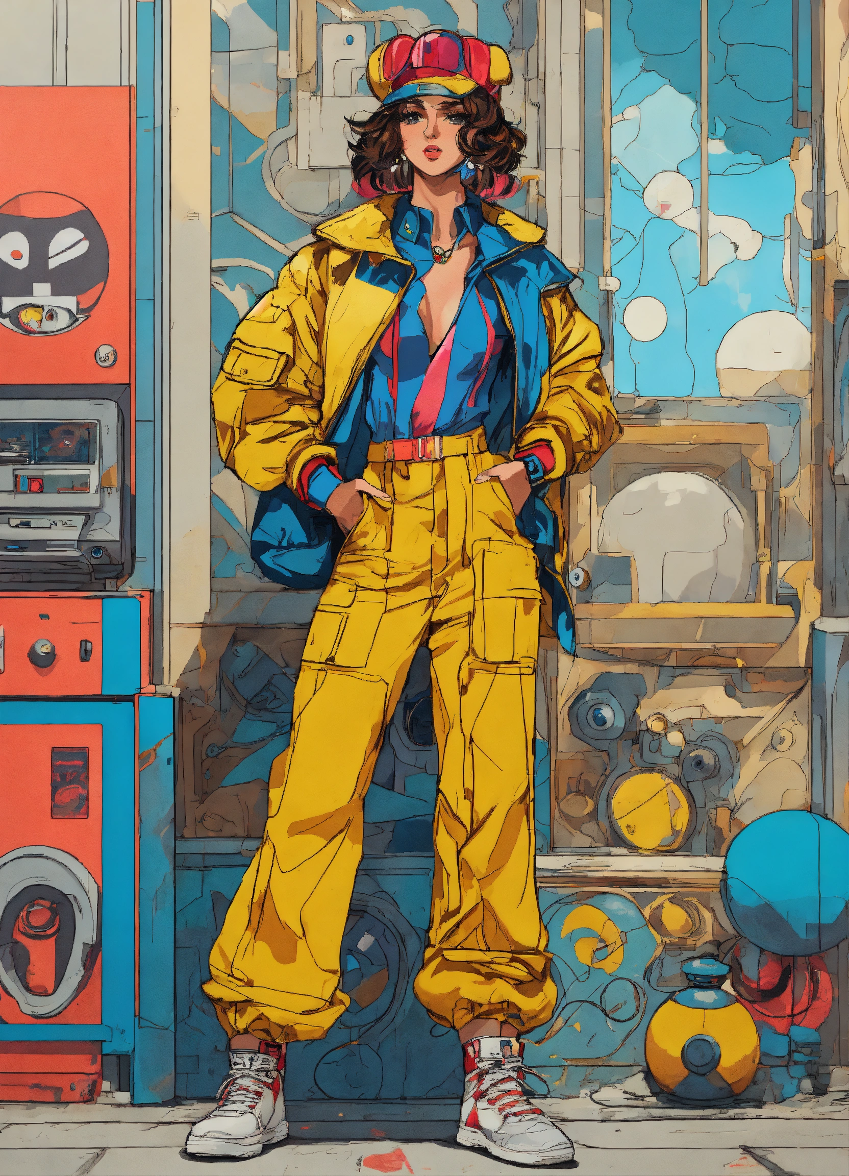 Full body street art retro gaming character in stylish haute couture outfit in the style of 80's vintage anime, surrealism, roy lichtenstein style. detailed line art. fine details. fine jewelry. neutral background