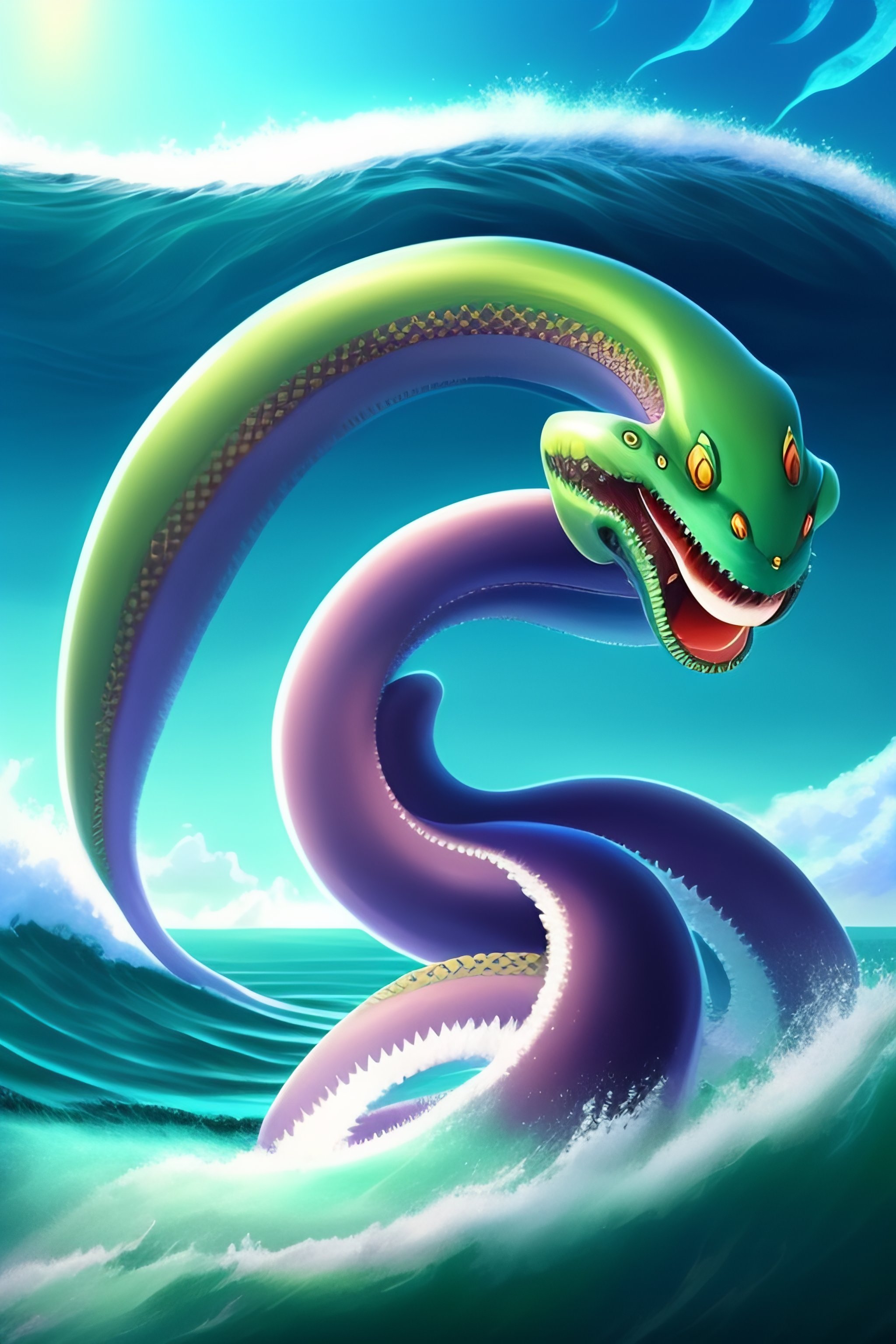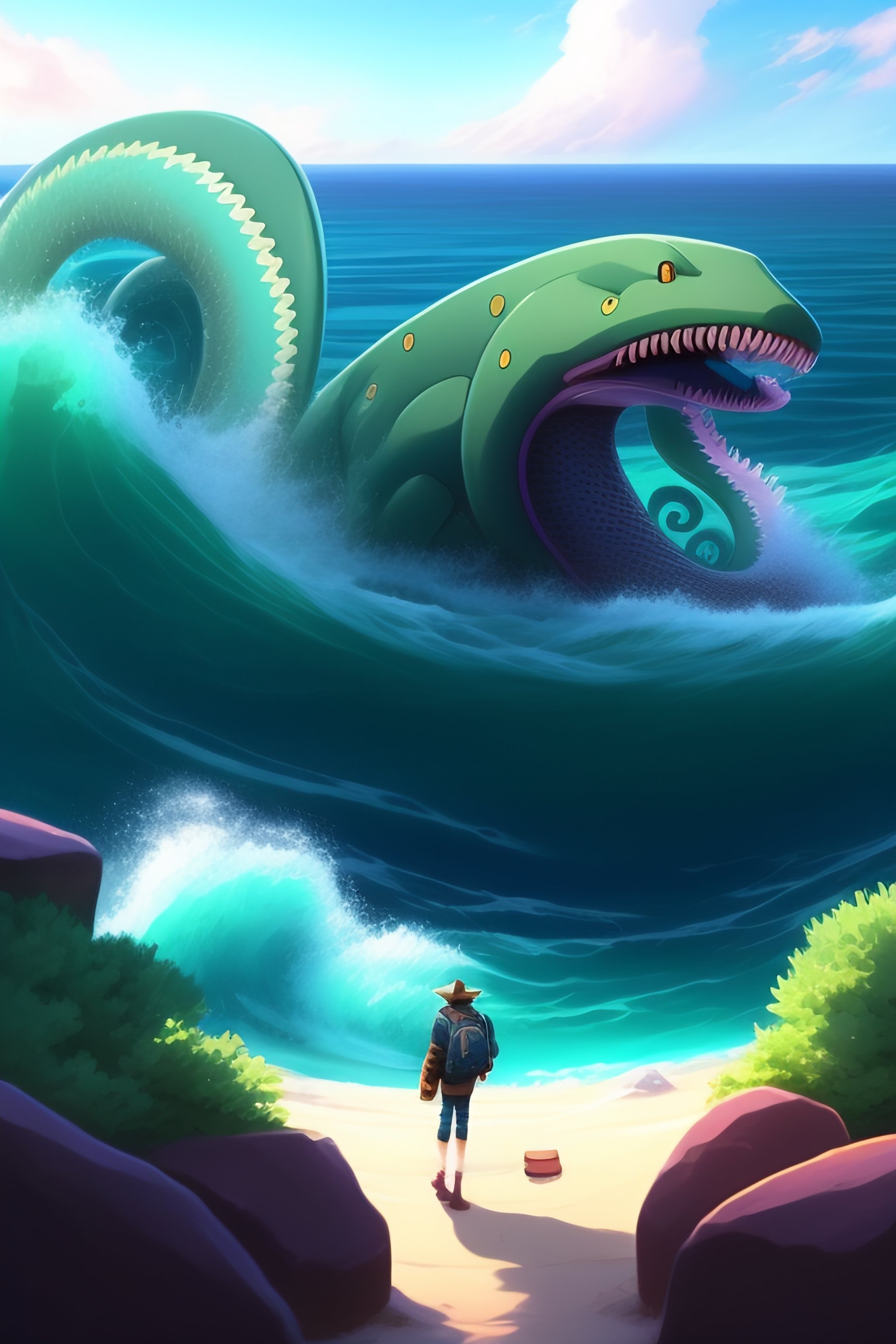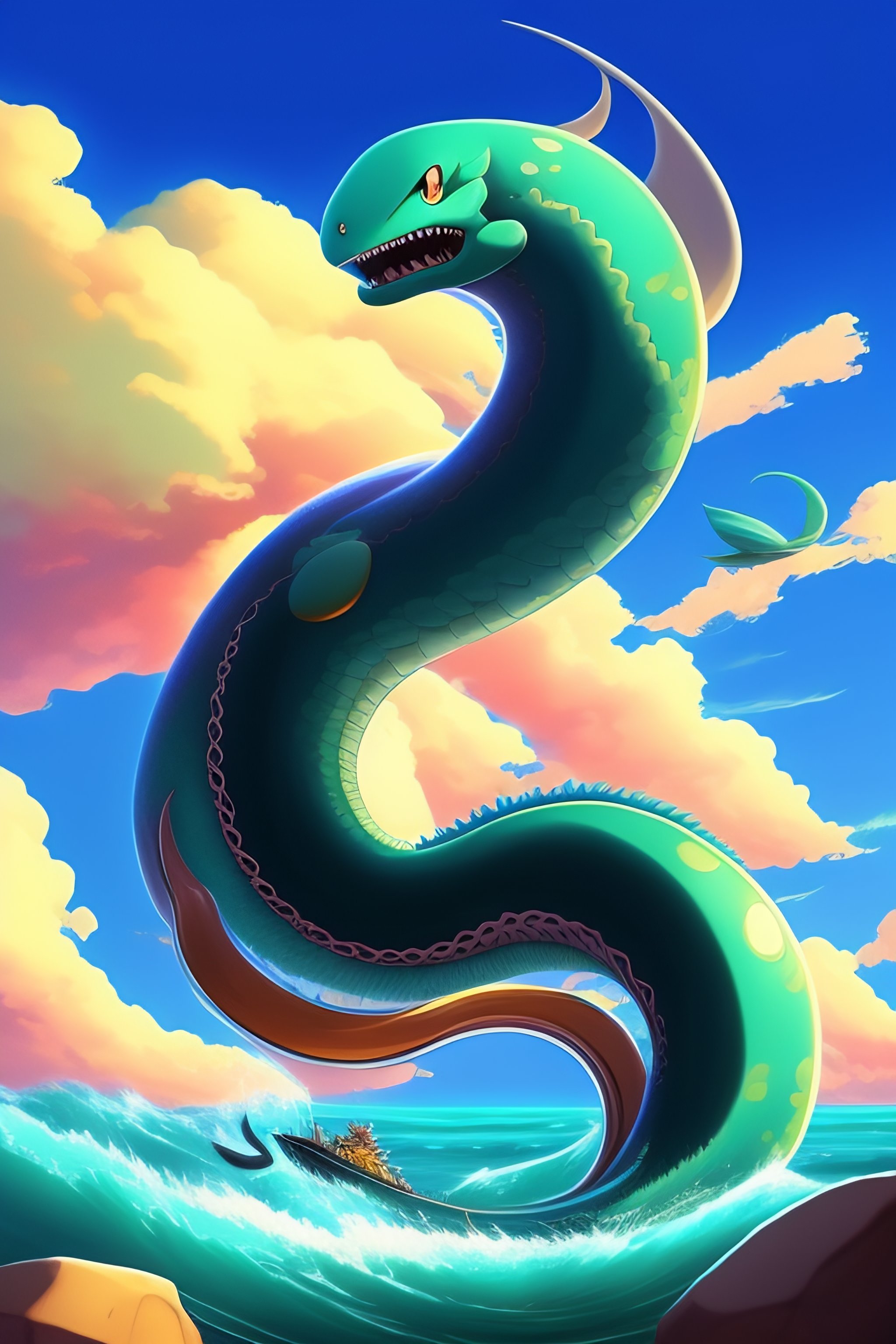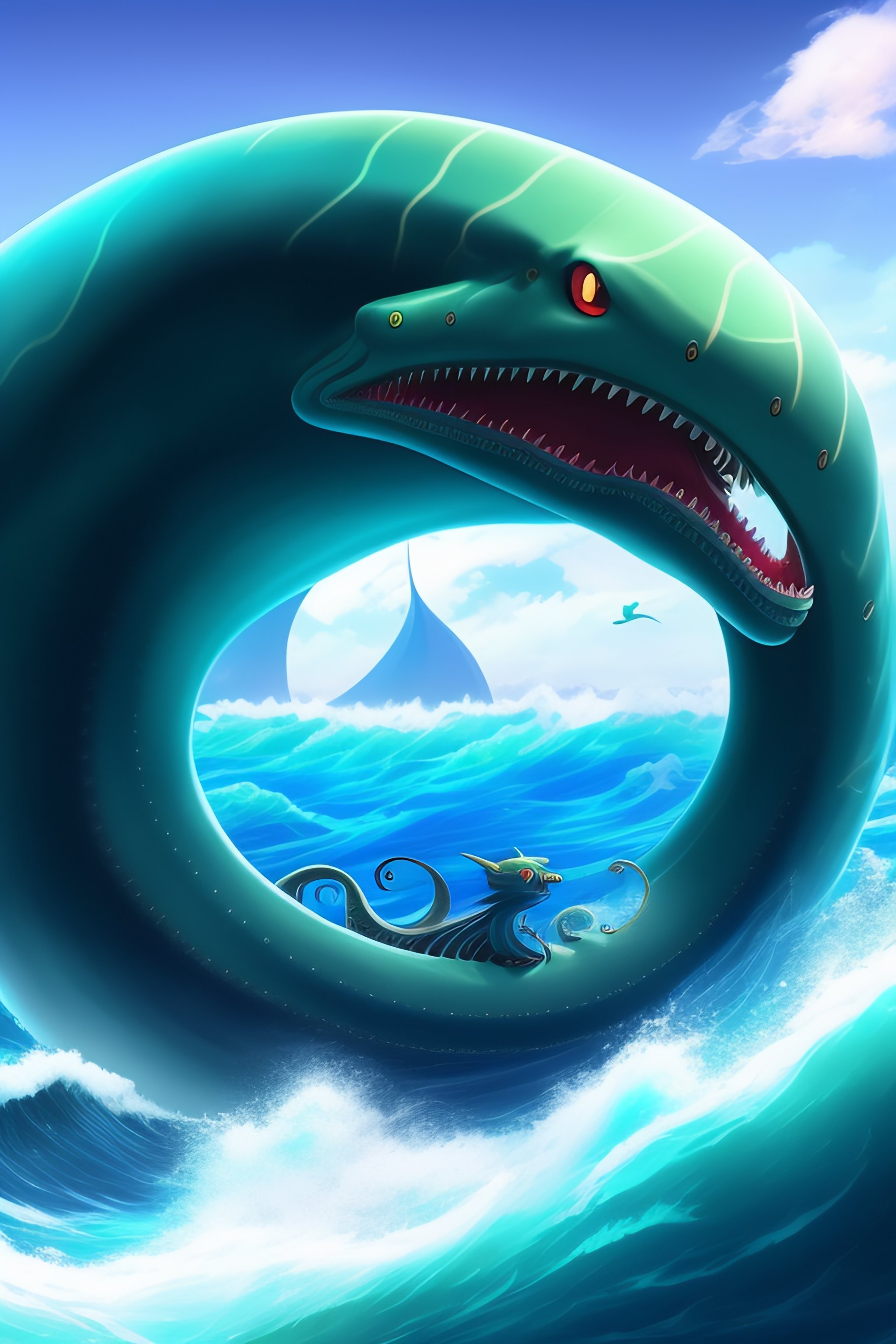 A pokemon that looks like a giant sea serpent mixed with a kraken in the art style of award winning pokemon anime with an ocean background