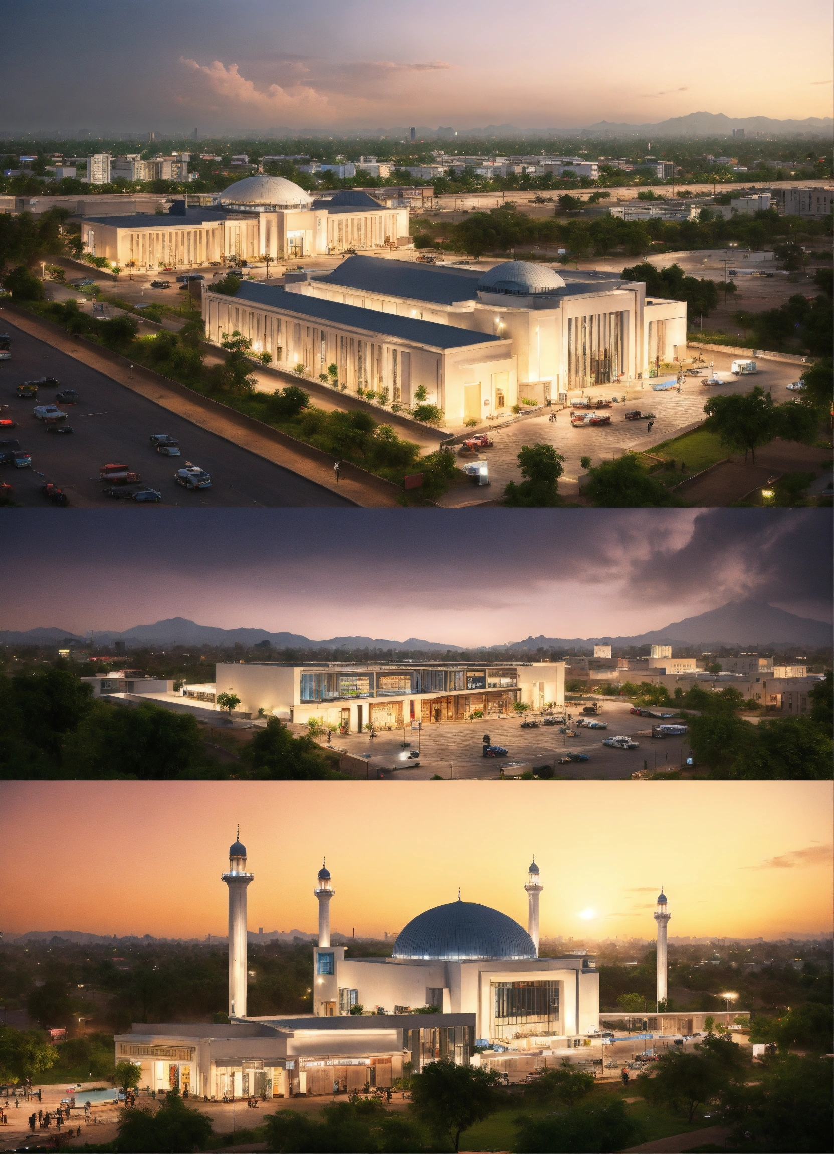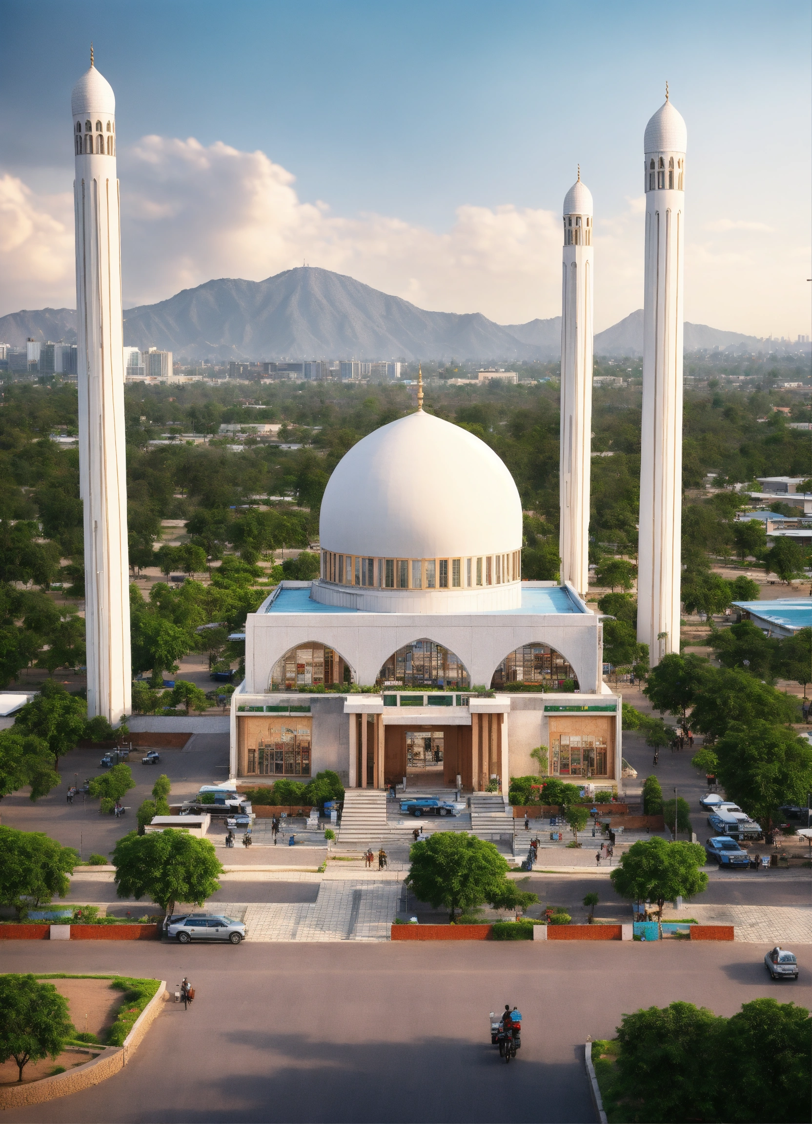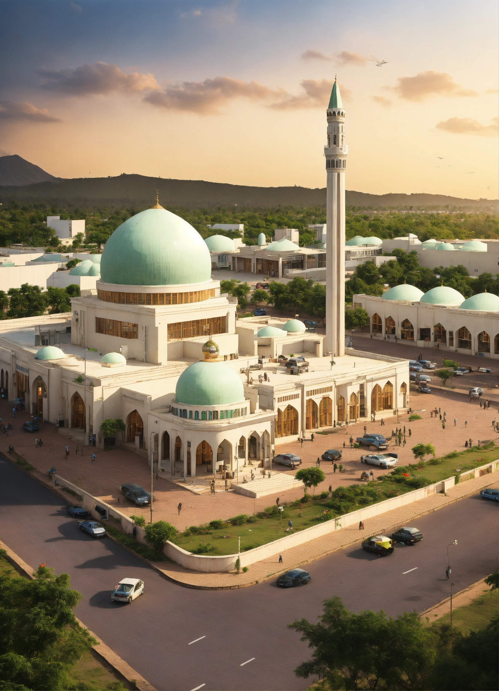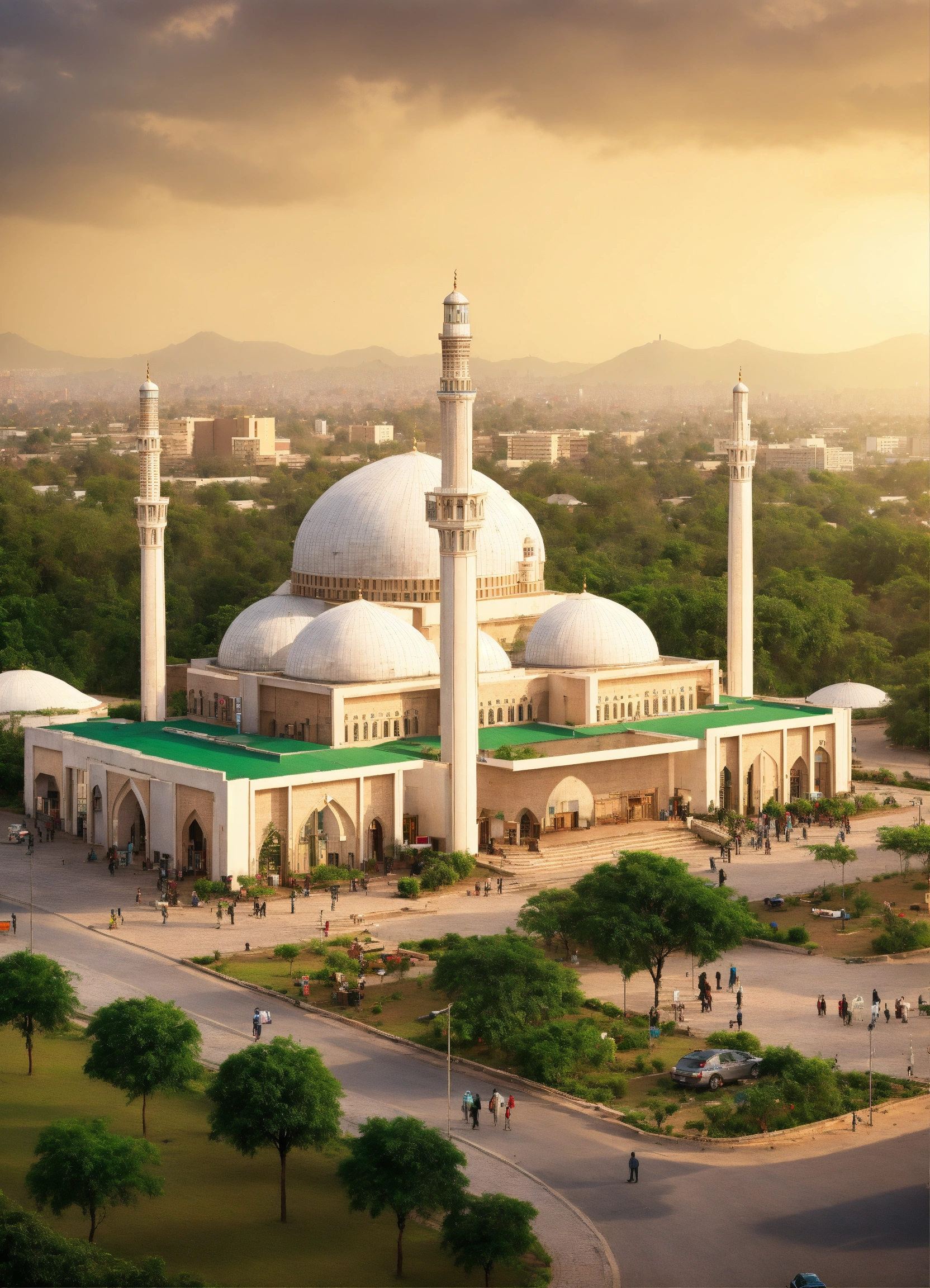 Abuja cityscape, abuja citizen, include abuja national mosque, nigeria atmosphere, photo realistic, urbancore, extremely detail building and people, daily life, city neighborhood, include abuja style cafe and stores, cinematic, lots of people, 8k photo, maximal
