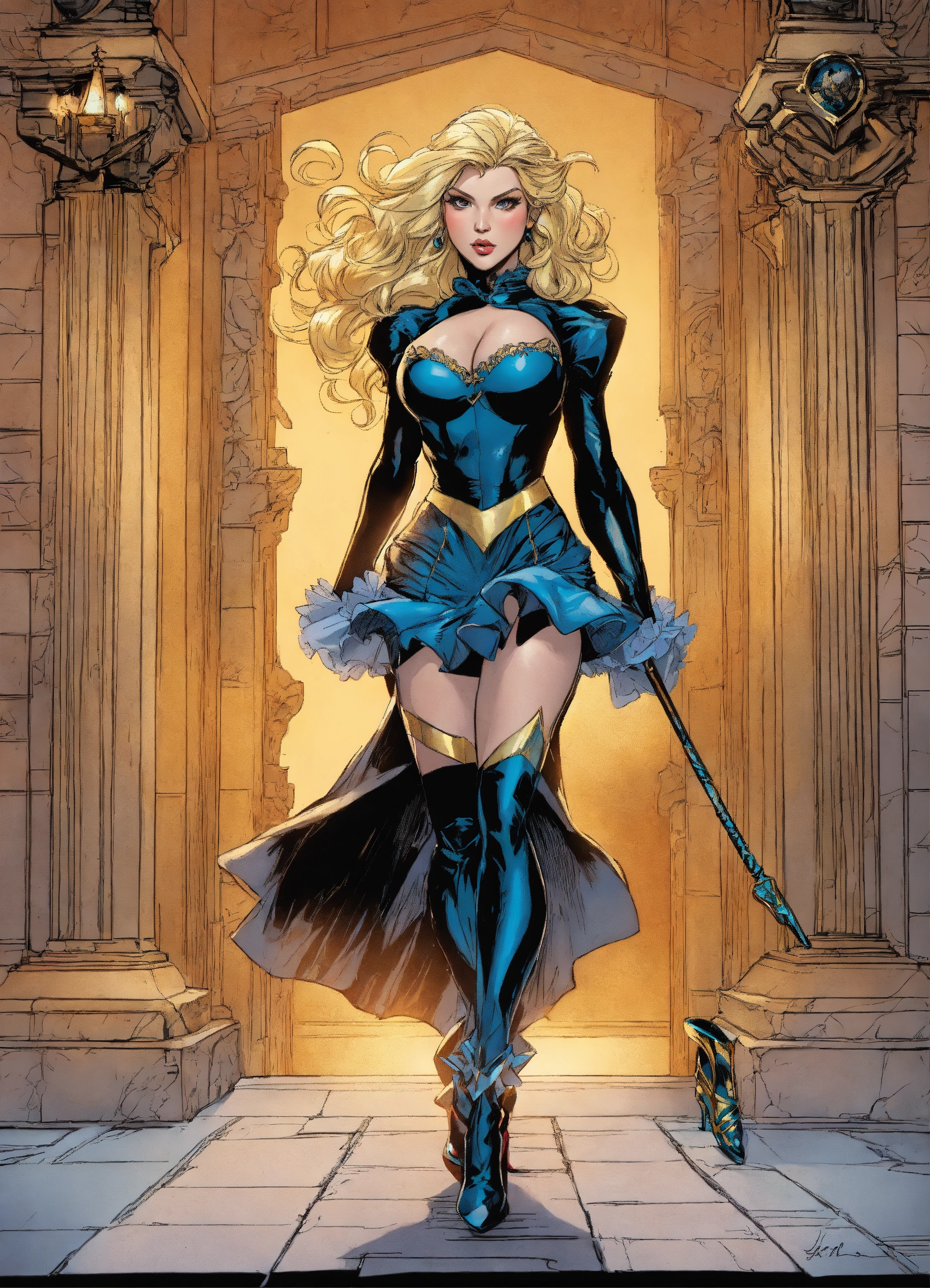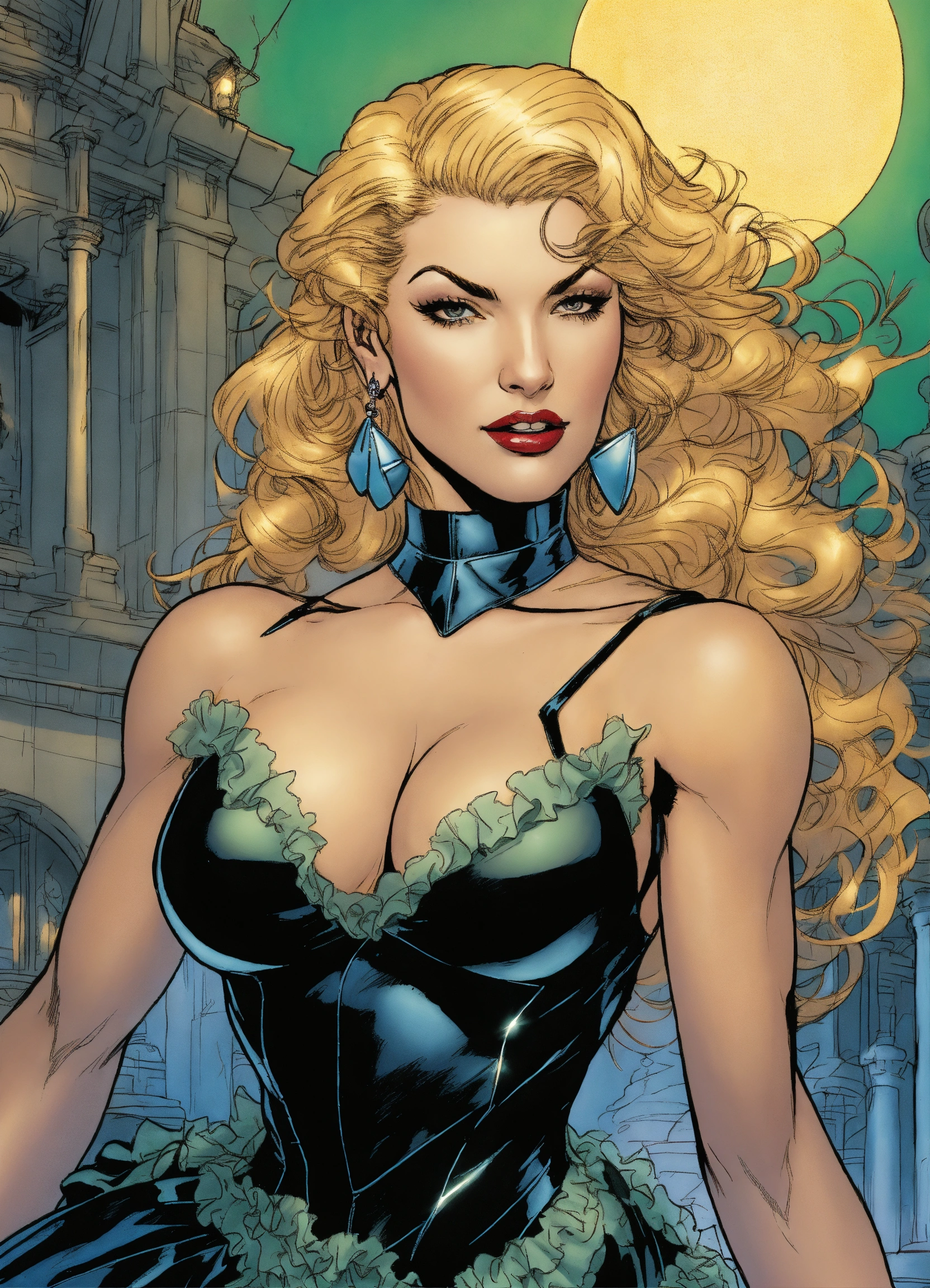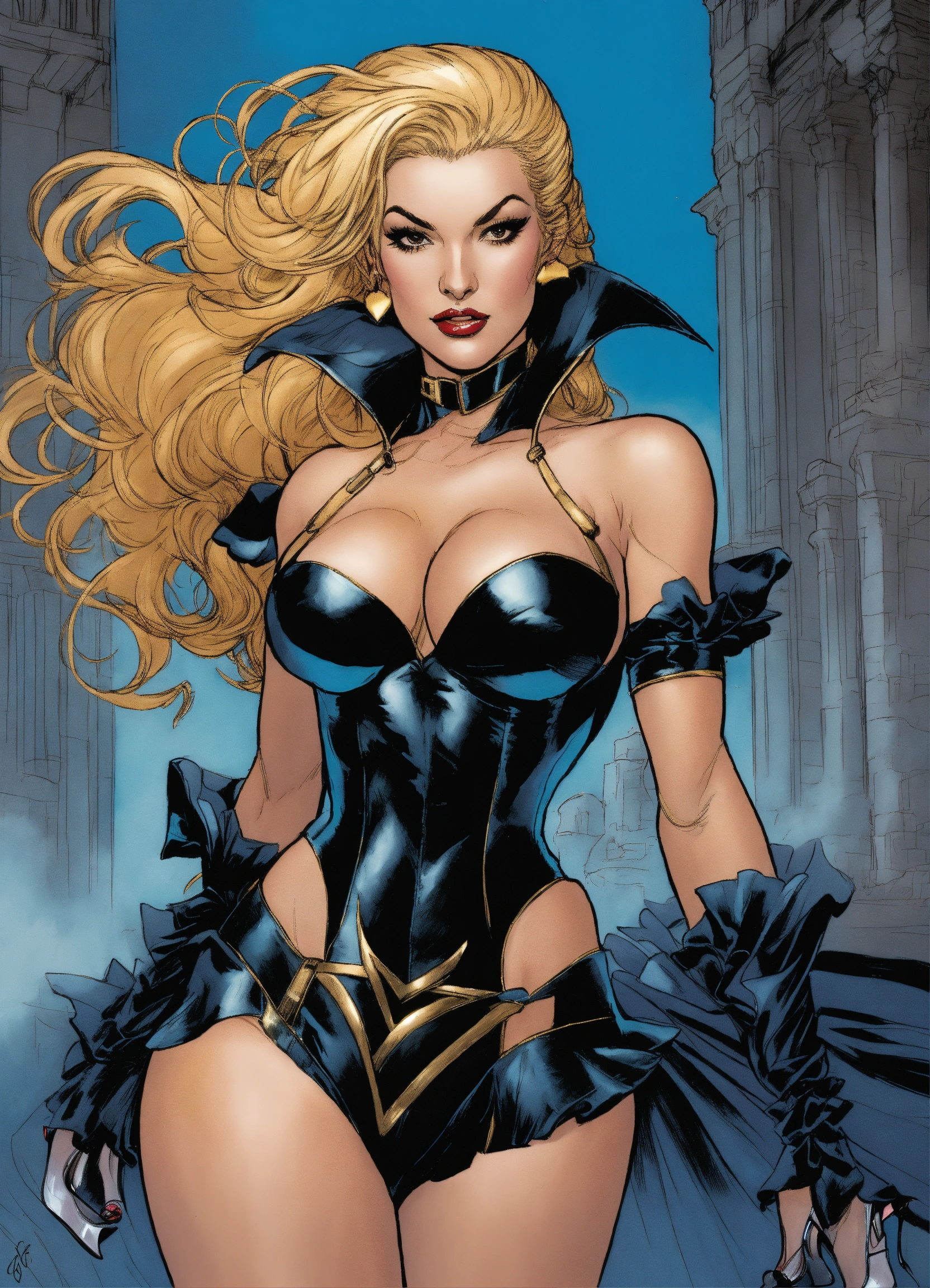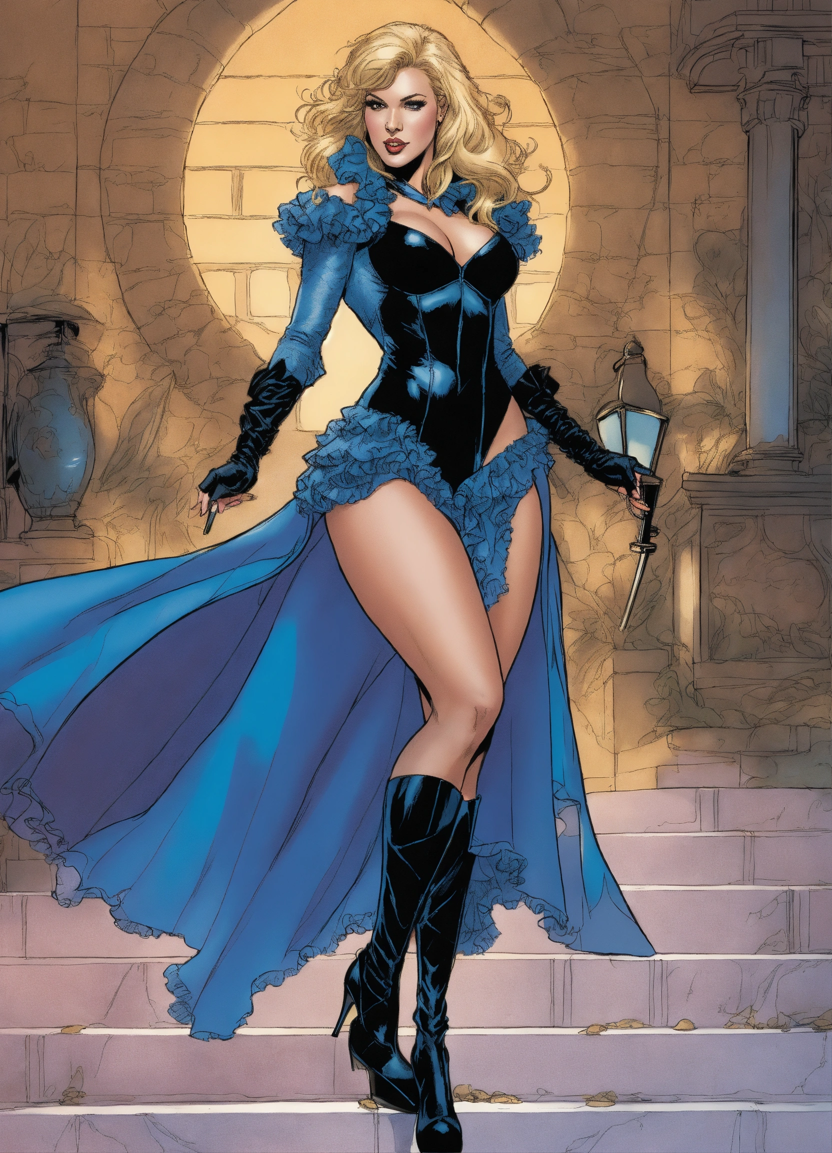 Older black canary as a fantasy maiden, wearing a wearing a frilly dress gown and stiletto high heels, art by jim lee, art by j. scott campbell