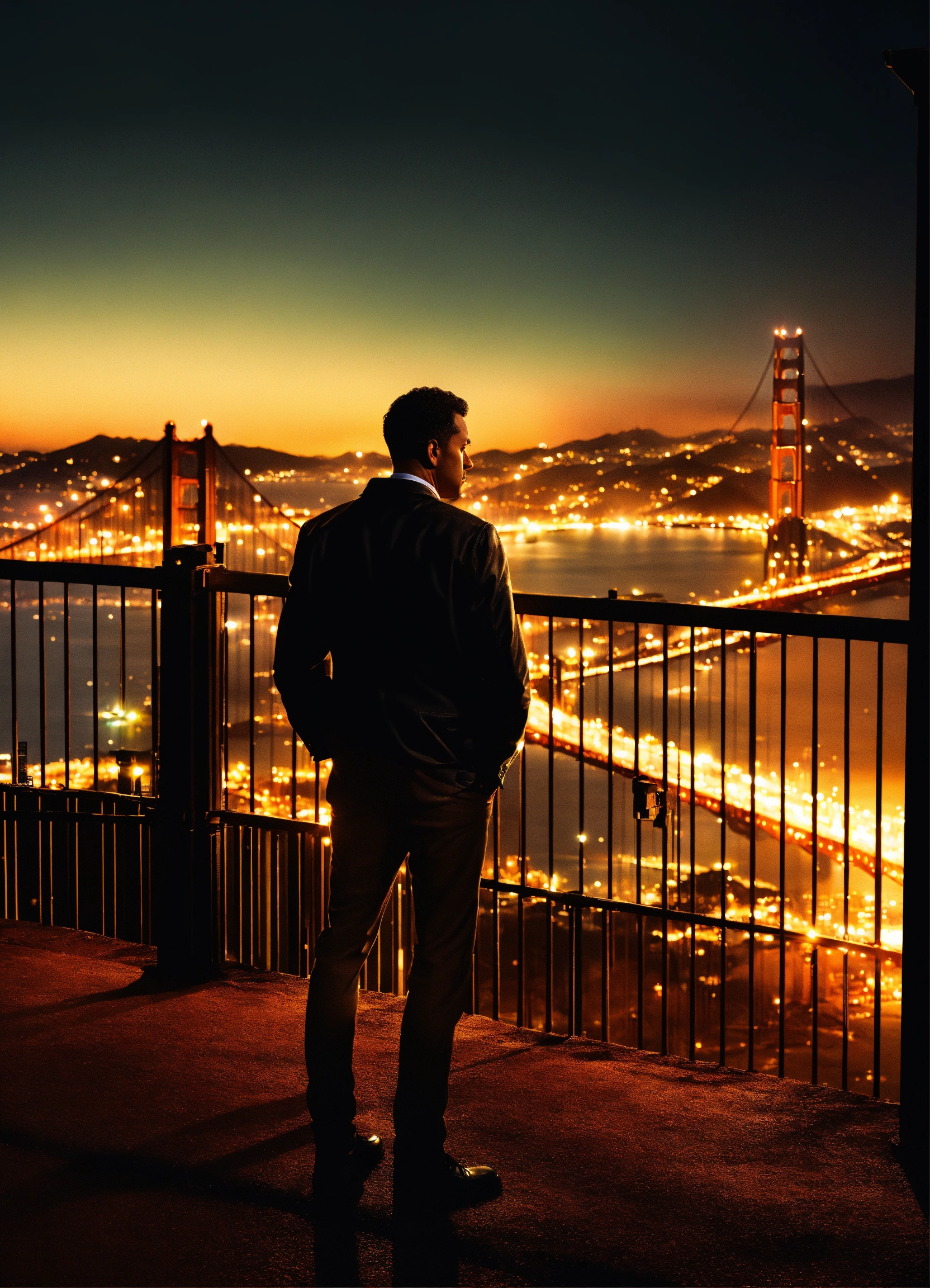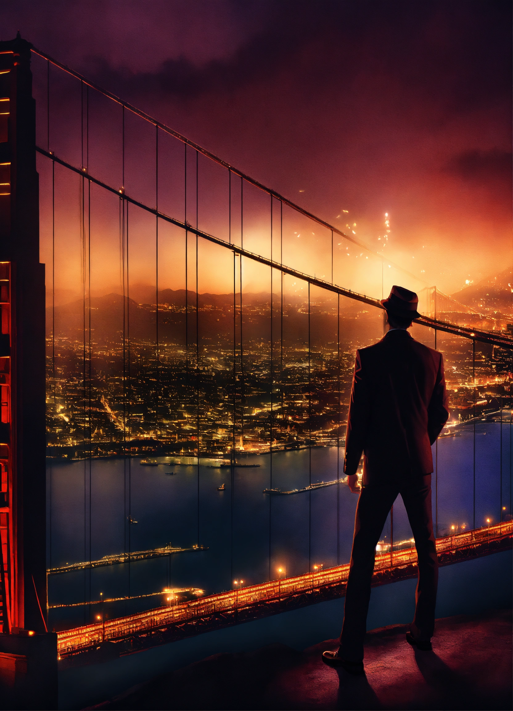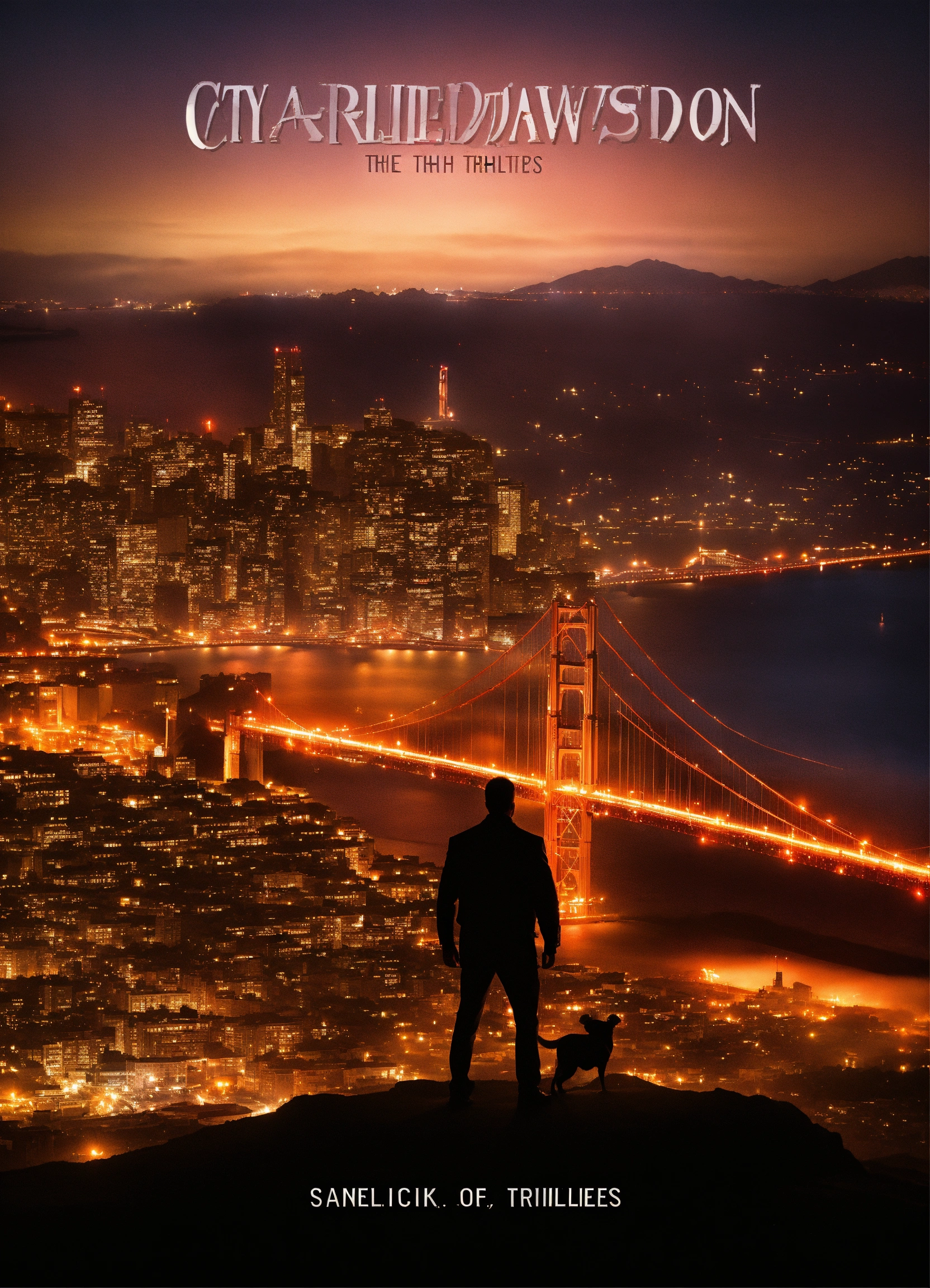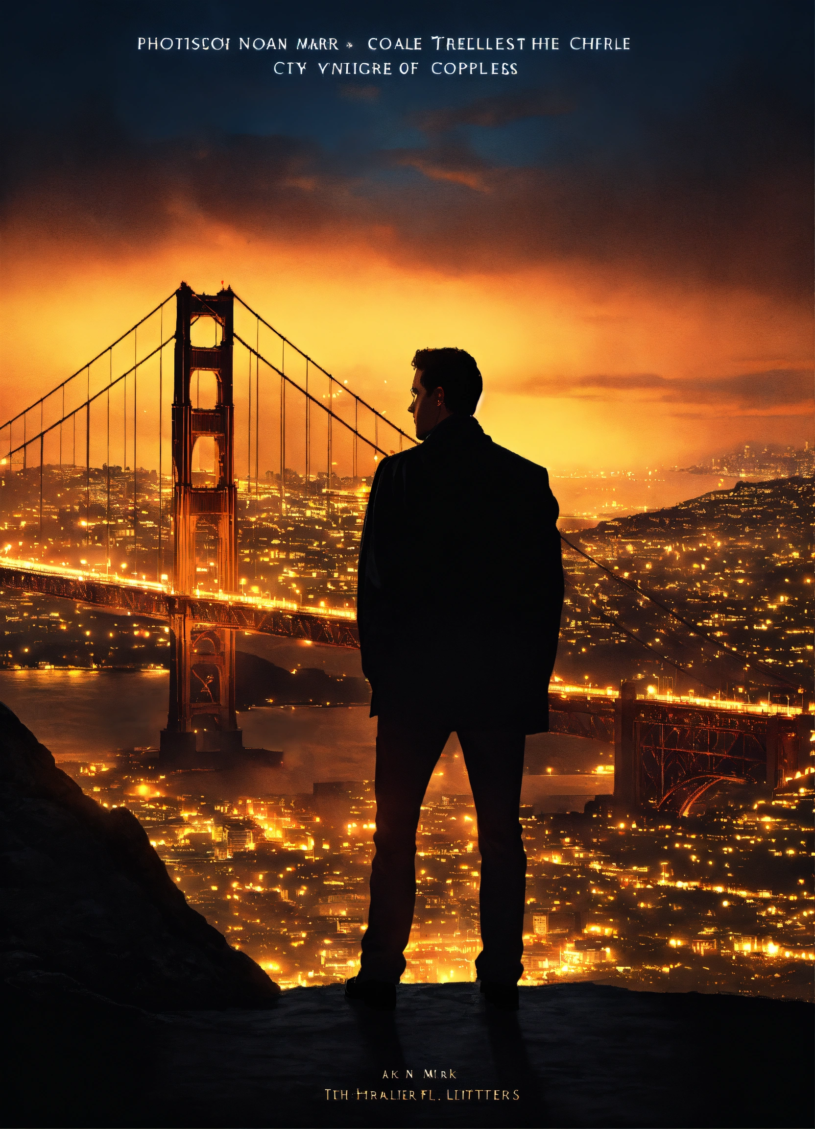 Create a captivating cover design that conveys the theme, city, night life, crime, thriller silhouette of a man overlooking city with standing in golden gate bridge in the background, inspired by the book of mark dawson "the chameleon (charlie cooper thrillers book 2)", photoreal, photorealistic, with lighting and shadows effect, city lights at night