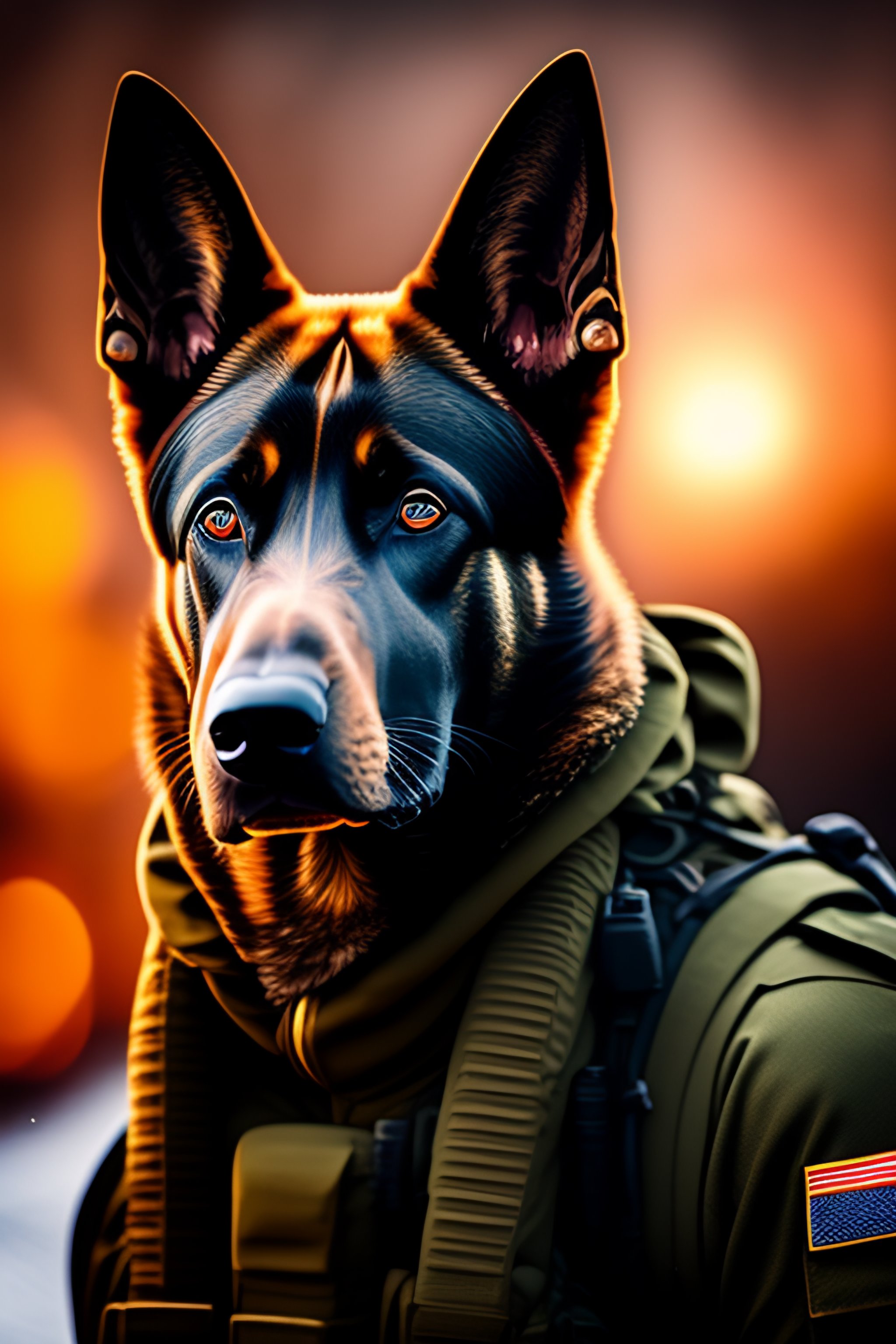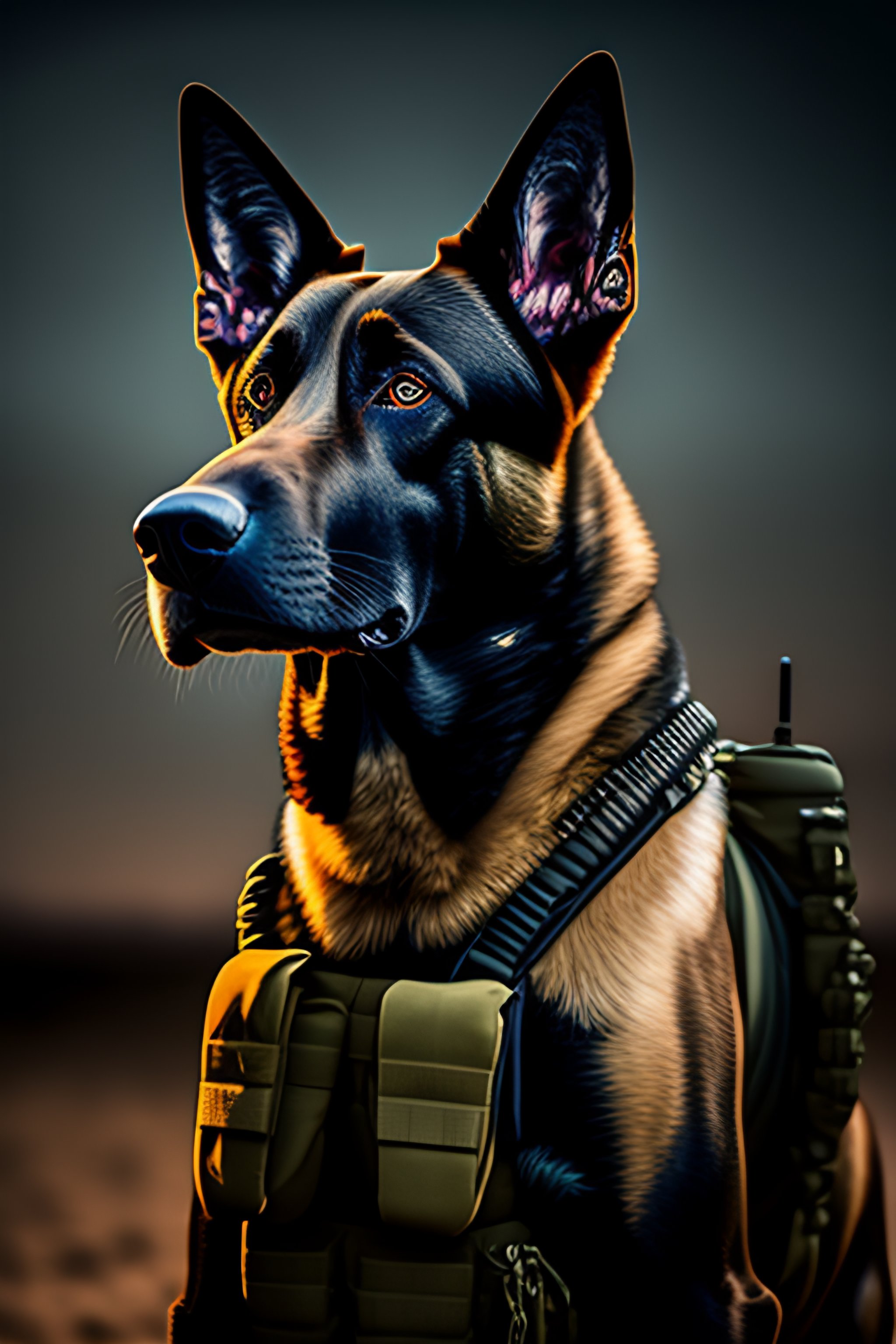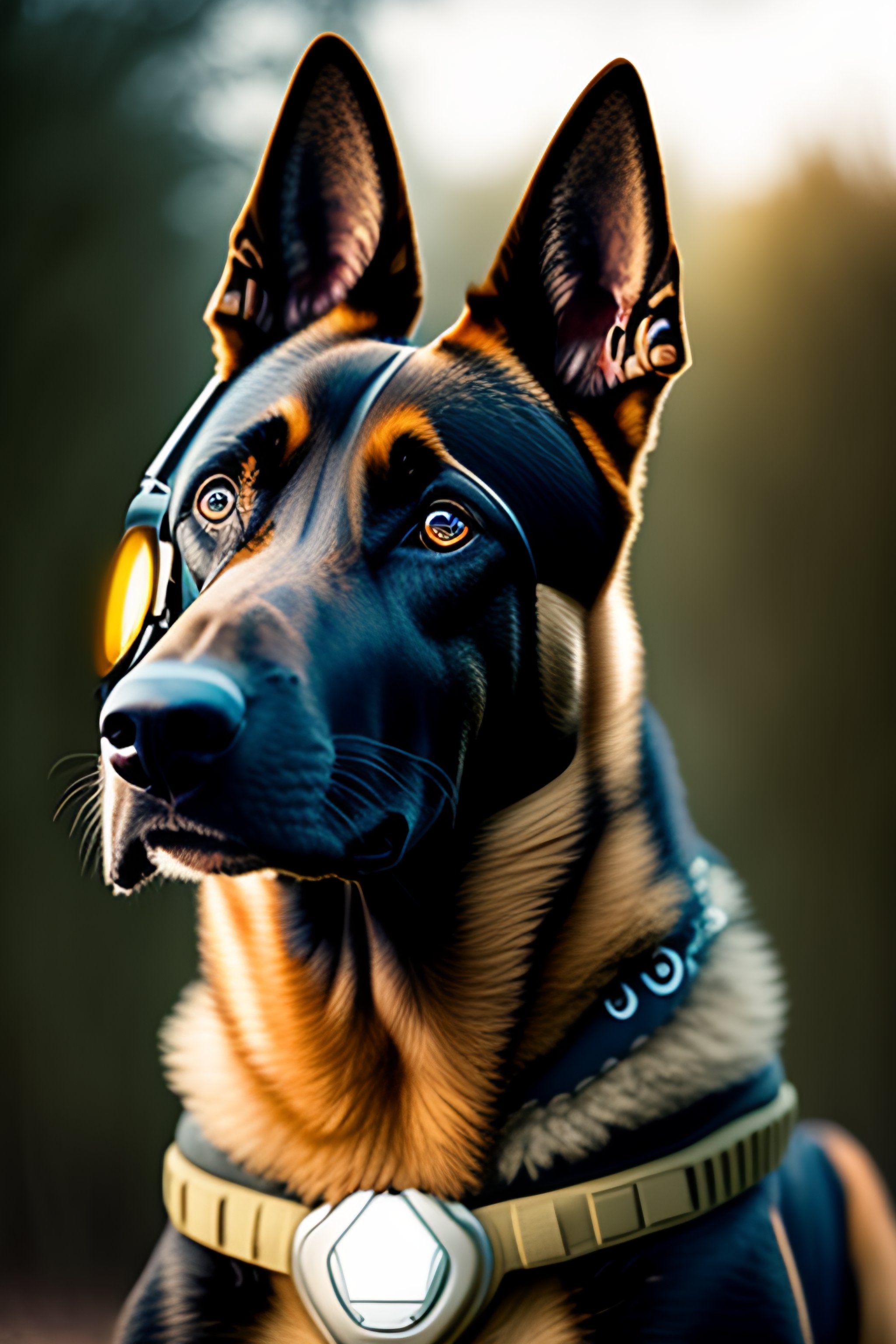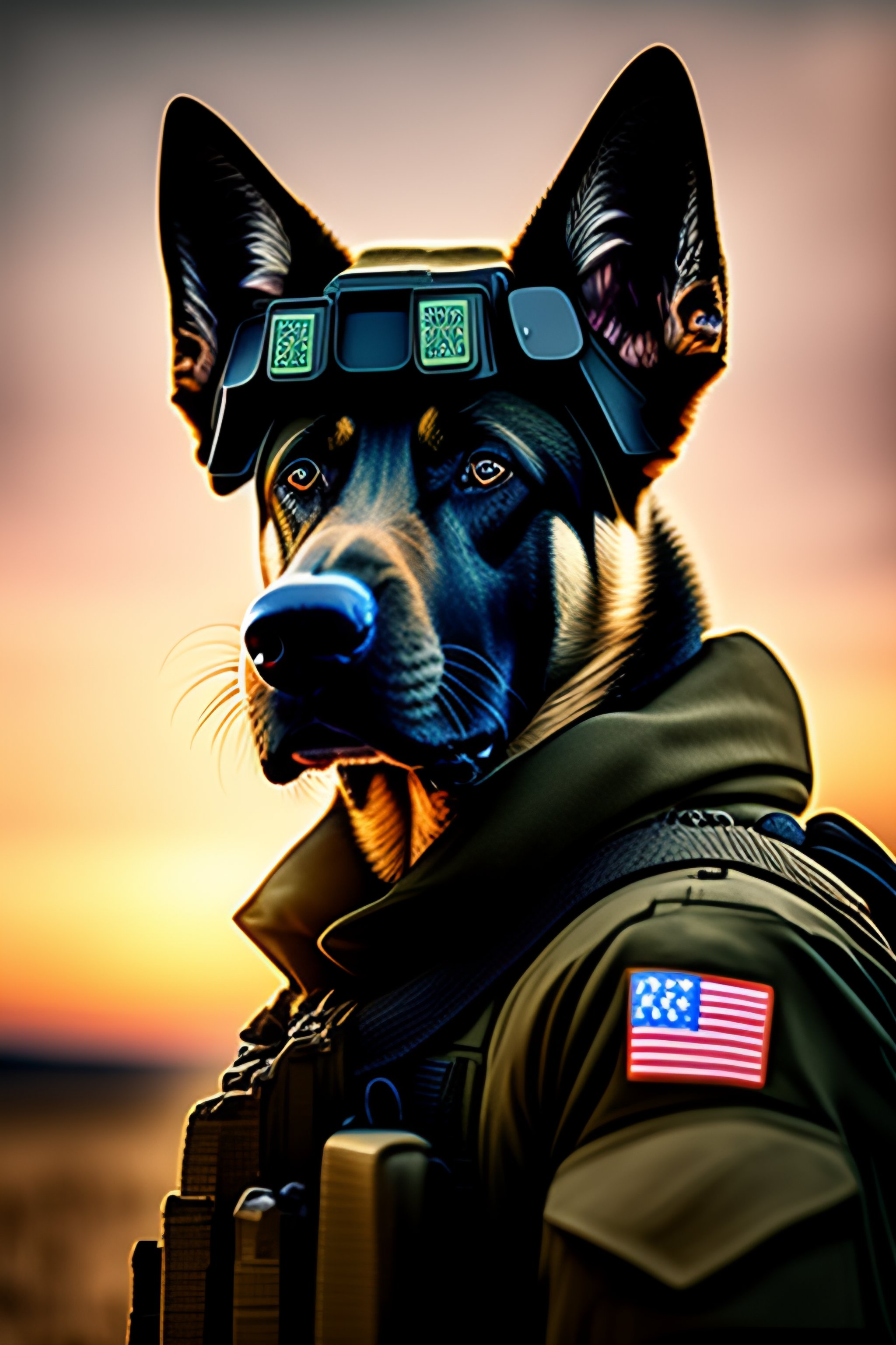 Portrait of a humanoid belgian malinois dressed as a solider wearing special forces gear with night vision goggles on his head,