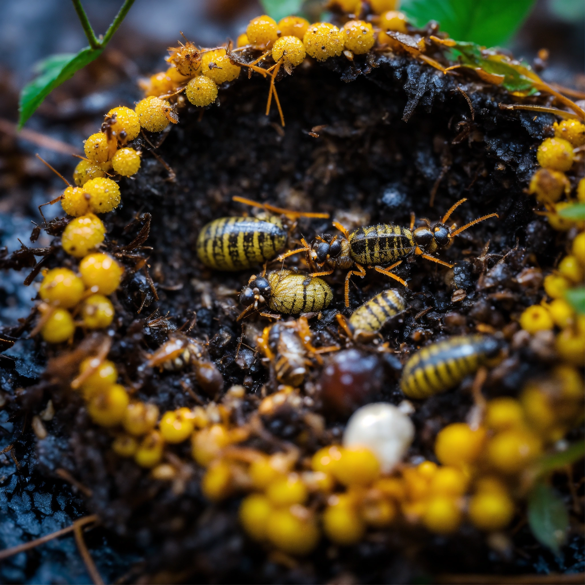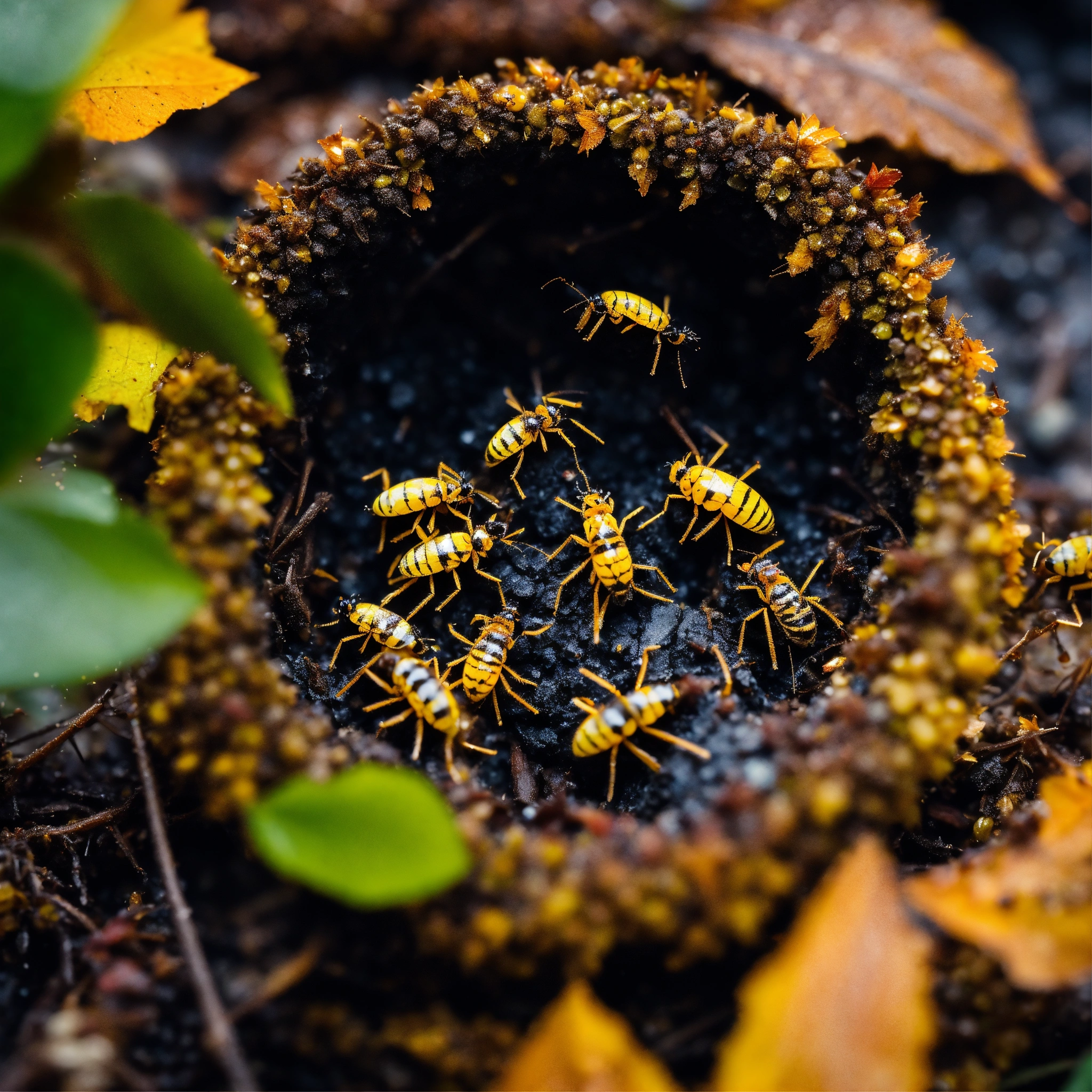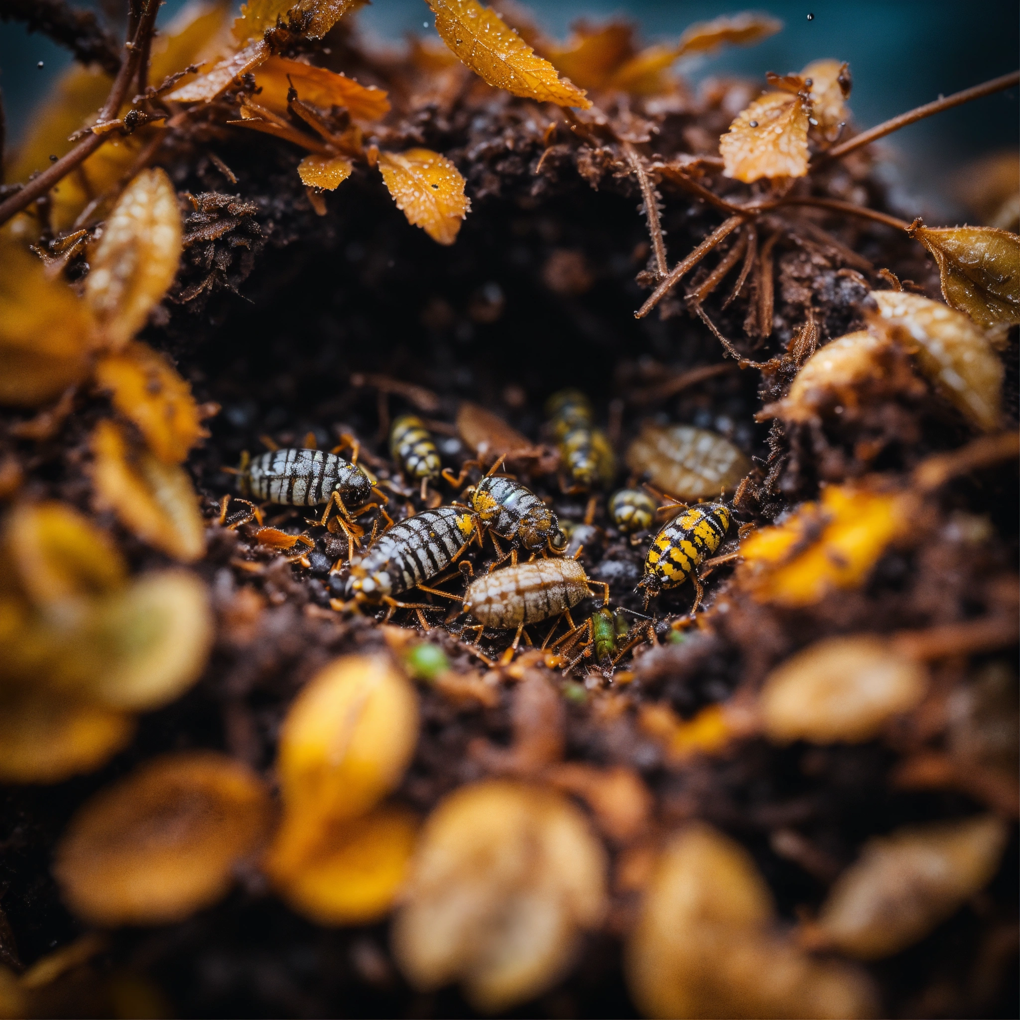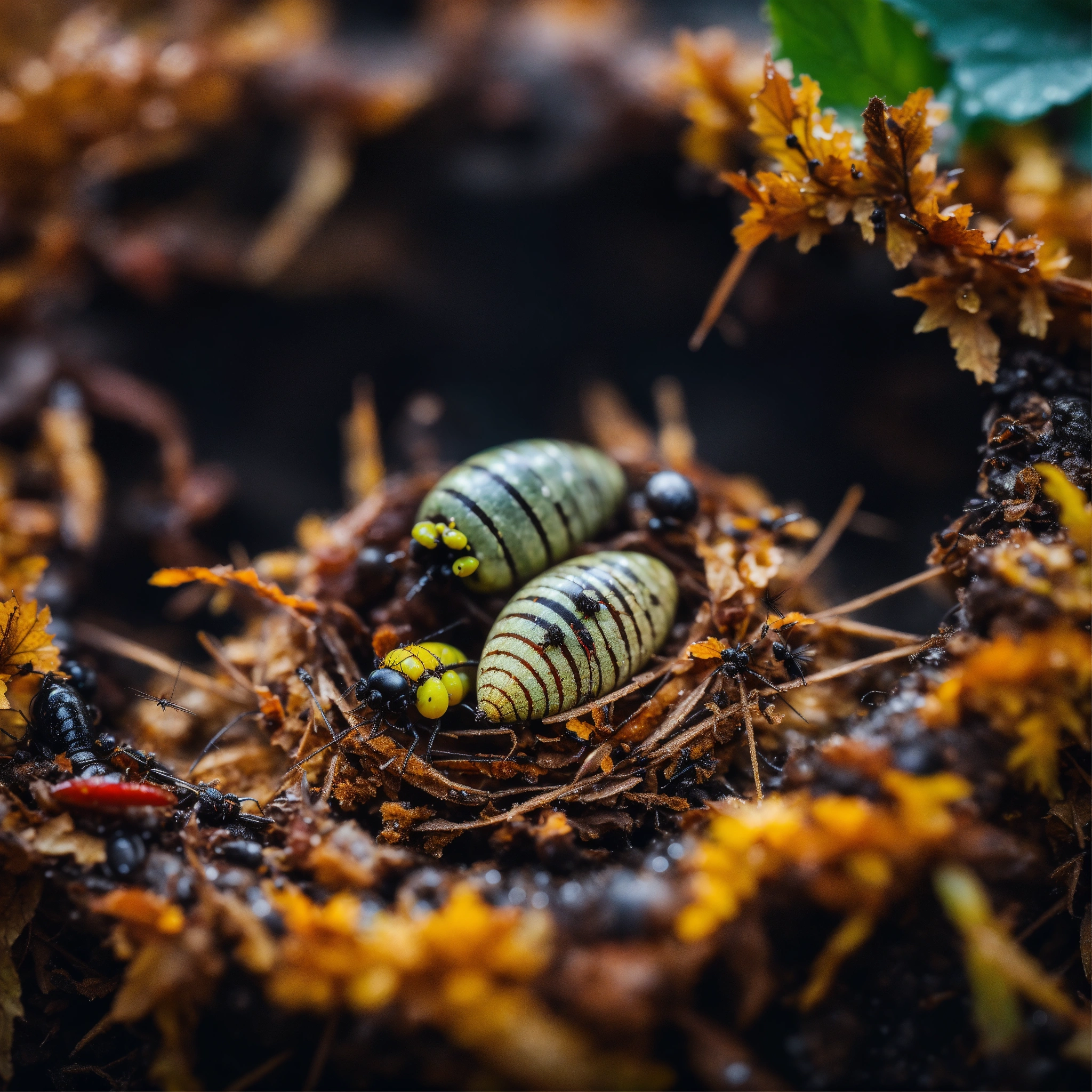 Dark creepy ugly rainy autumn macro photography close-up of a nest made of bones with some dead caterpillars and dead flies and dead insects and dead centipedes