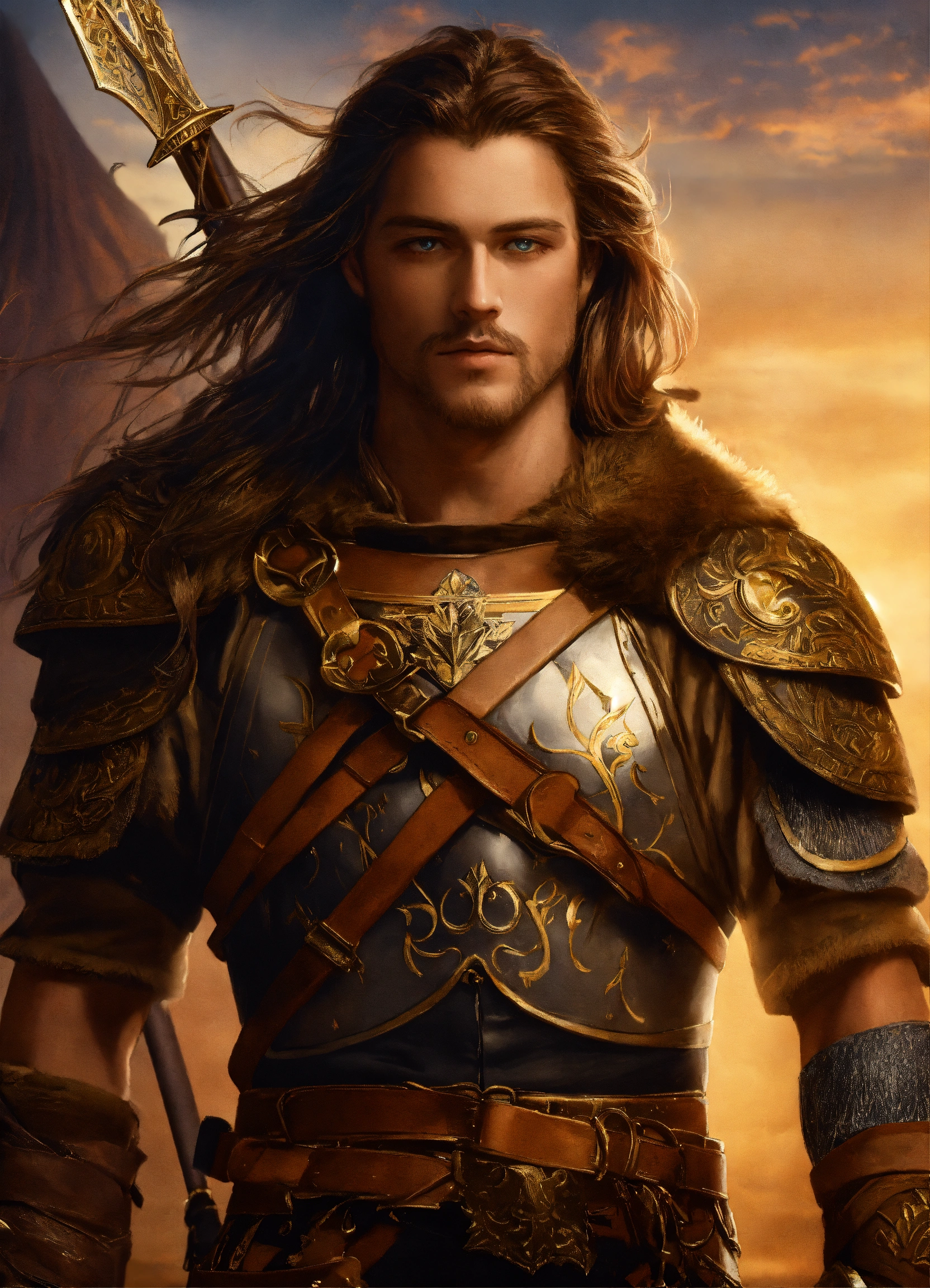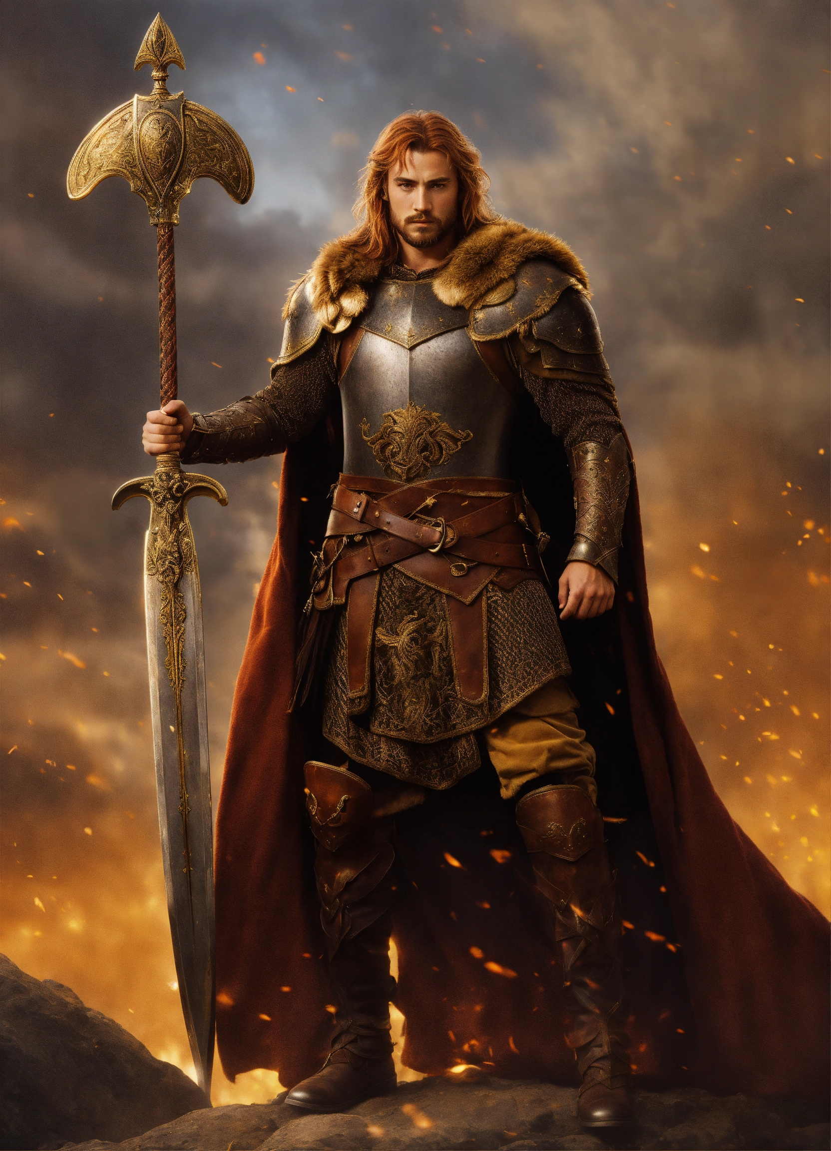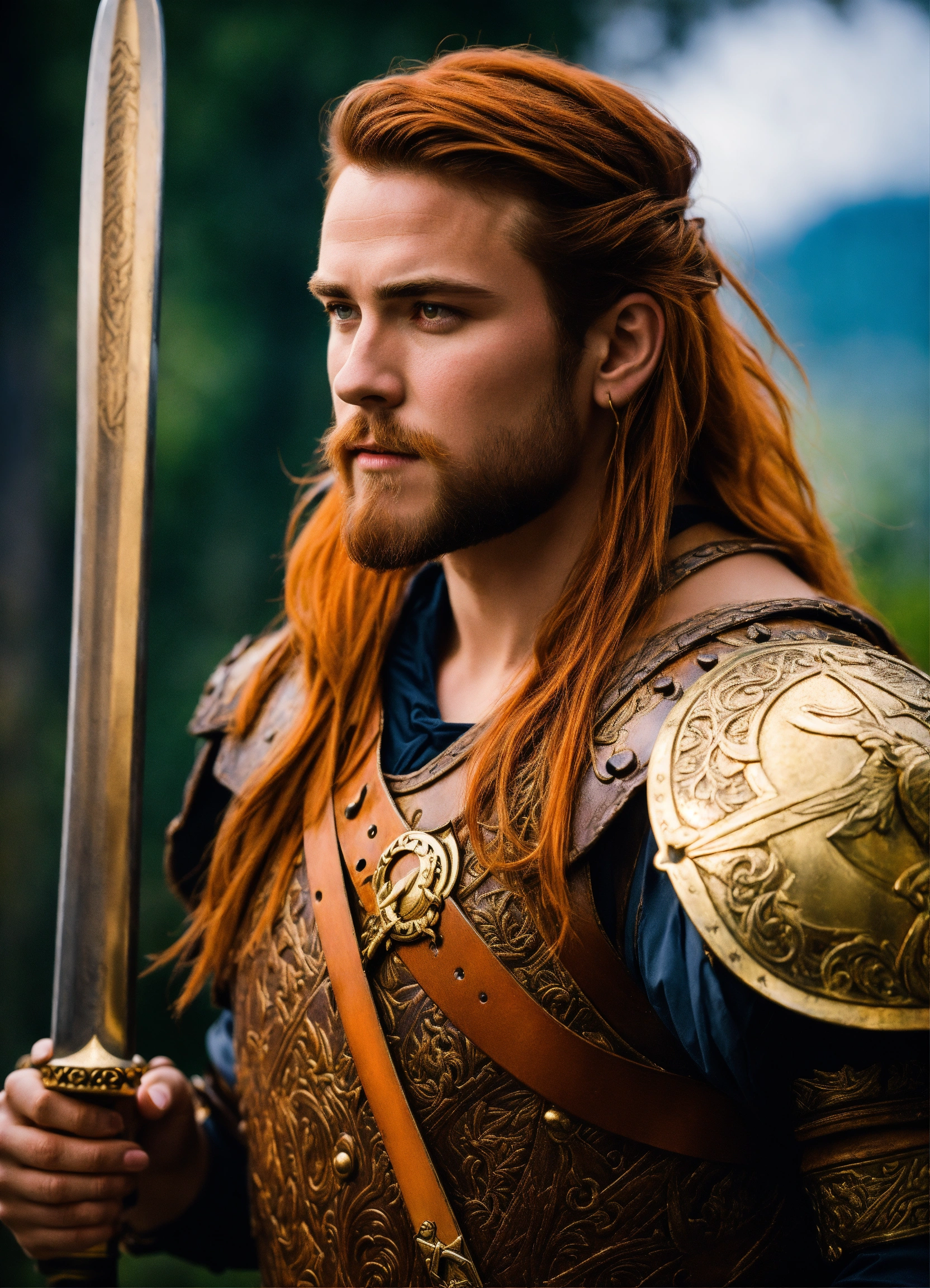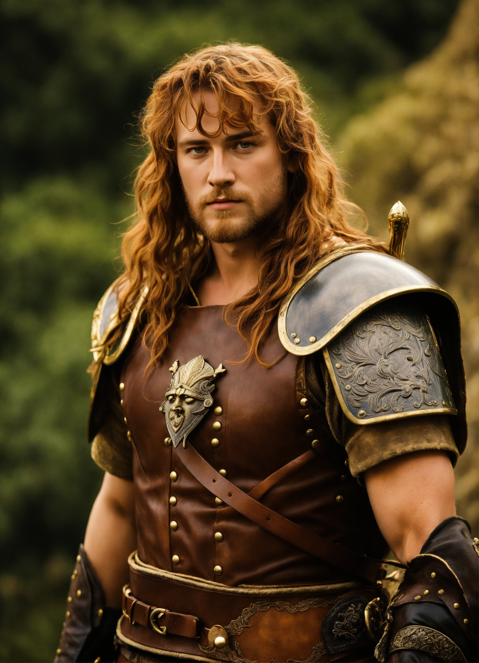 Chevalier du roi arthur avec guerrière comme xena elle aux cheveux auburn et aux yeux d'or porte un corset de cuir marron et une jupe, viking et valkyrie beau guerrier cheveux noirs.