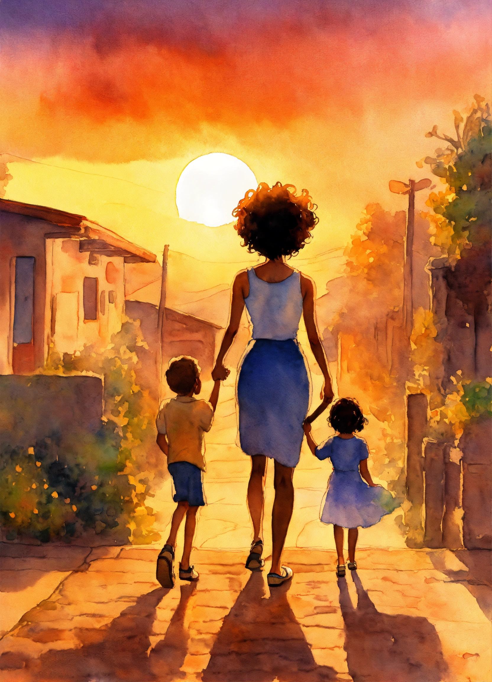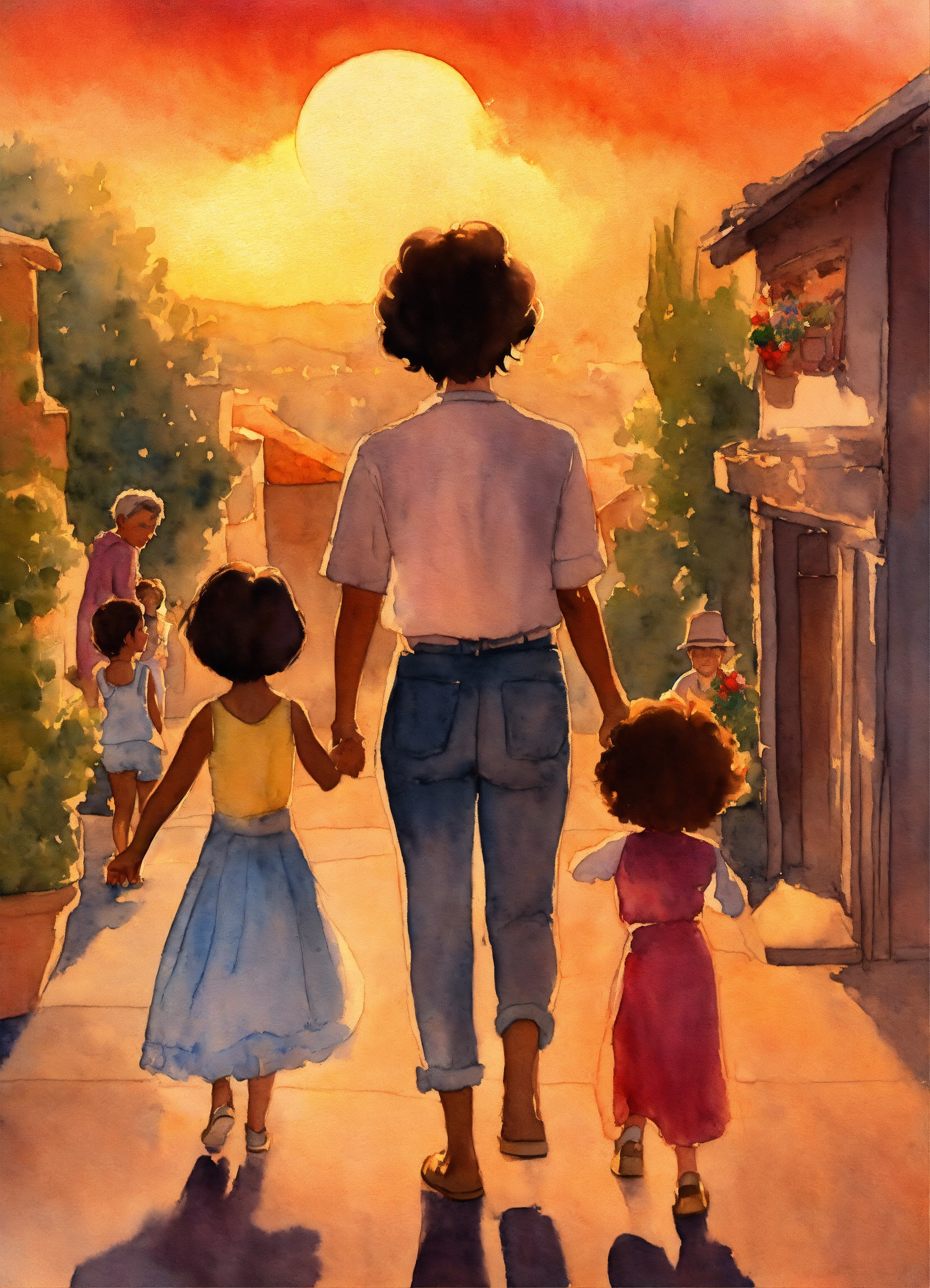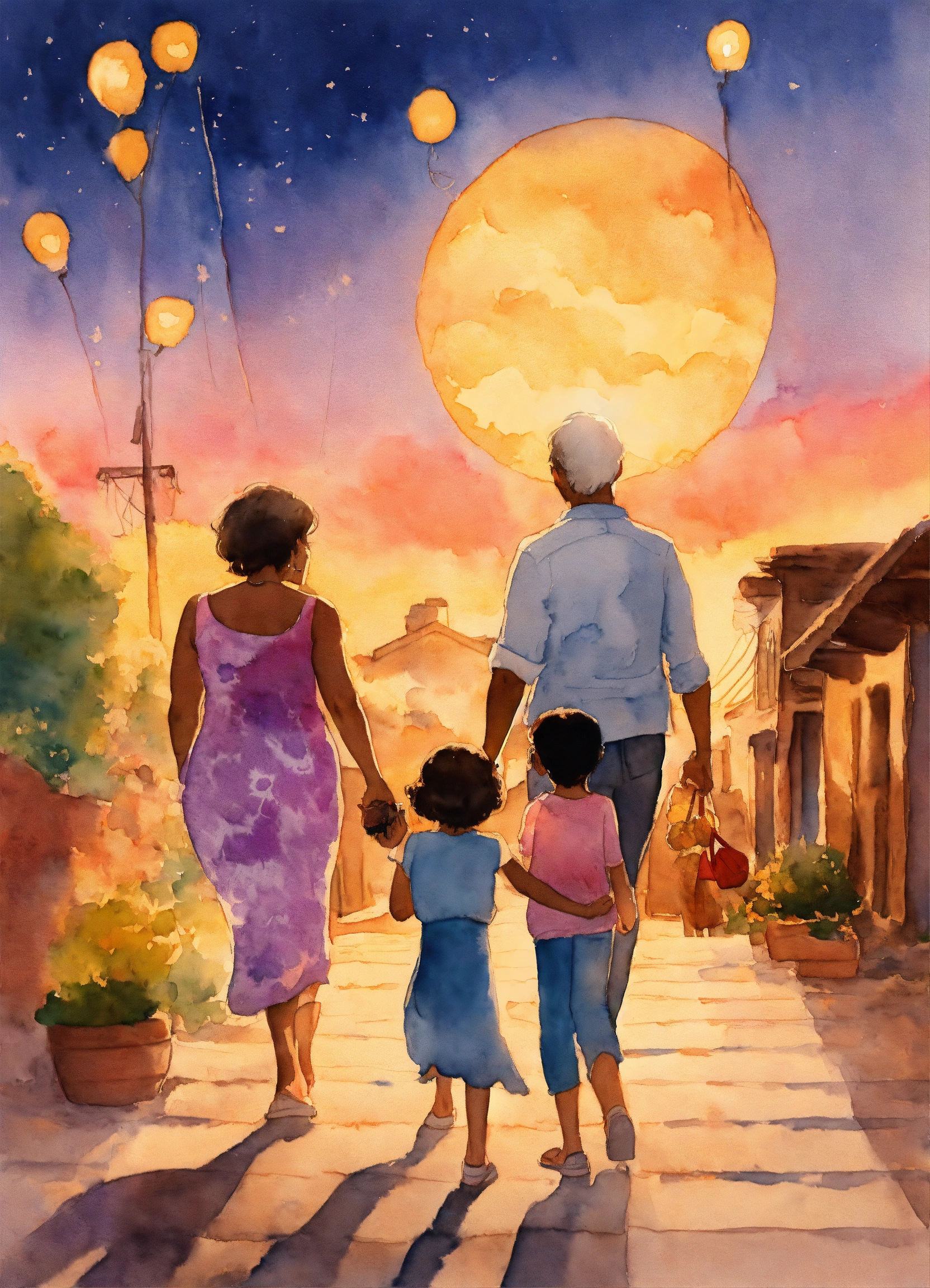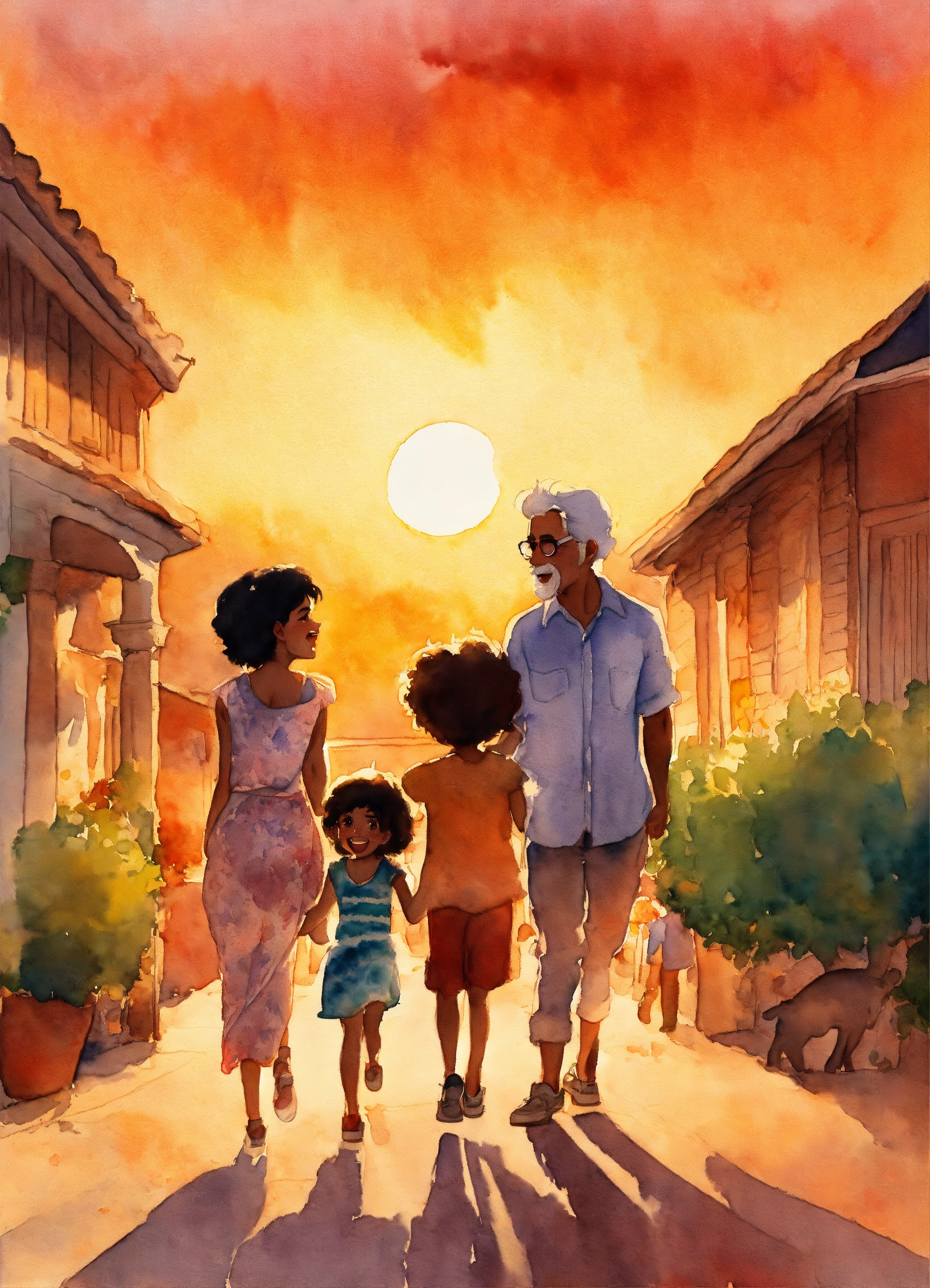 Watercolor pixar painting of an 8 year old halle berry and her family celebration, with abuelita at the center of the celebration, sharing stories the evening sun dipped below the horizon, casting a warm, golden glow over la misión, watercolor pixar style cartoon