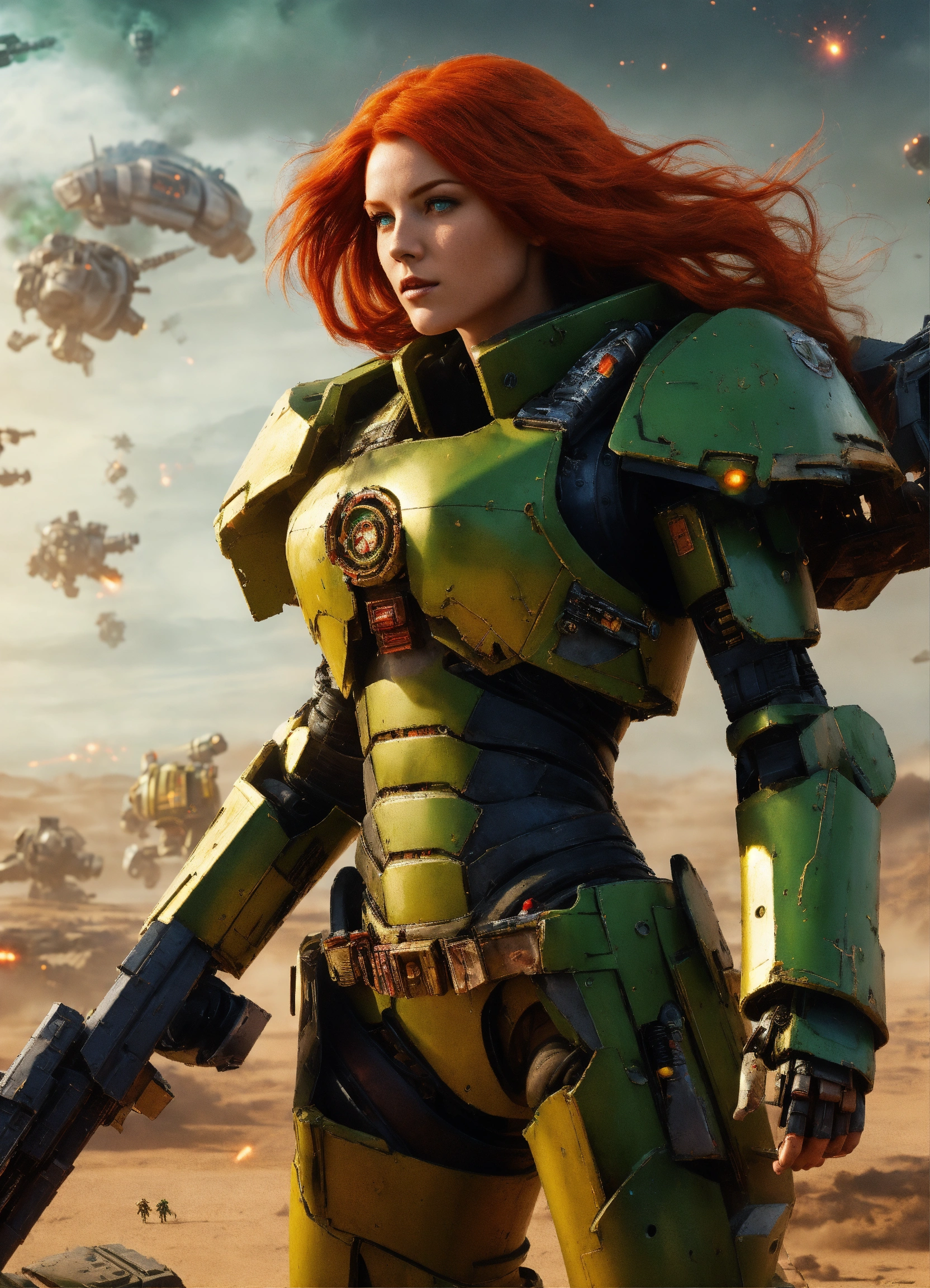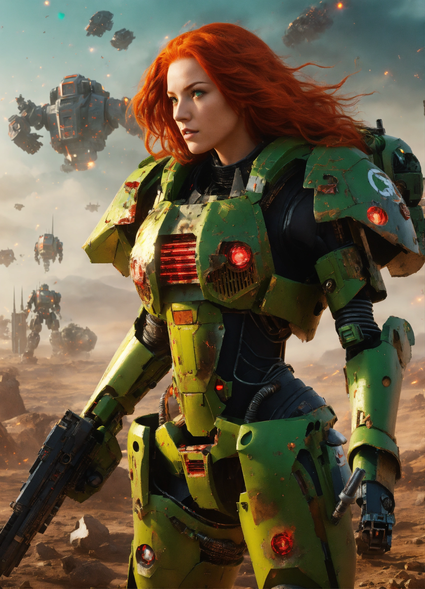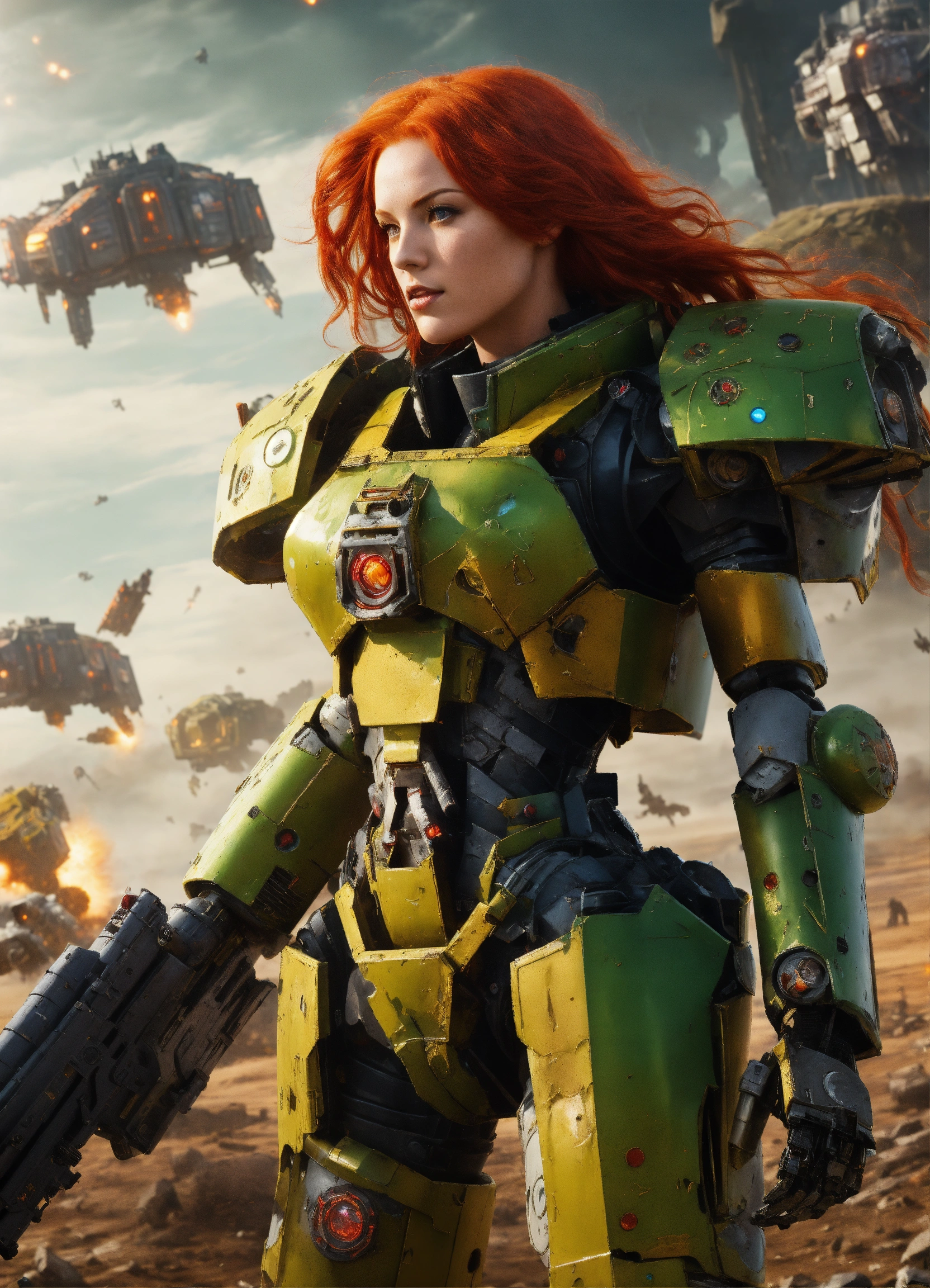 Full body shot of woman with red hair and green eyes in full warhammer 40k combat armor on an alien world battle zone covered in broken and blown-up robots trying to get to a faraway dimensional portal on the horizon, ultra realism, perfect hands