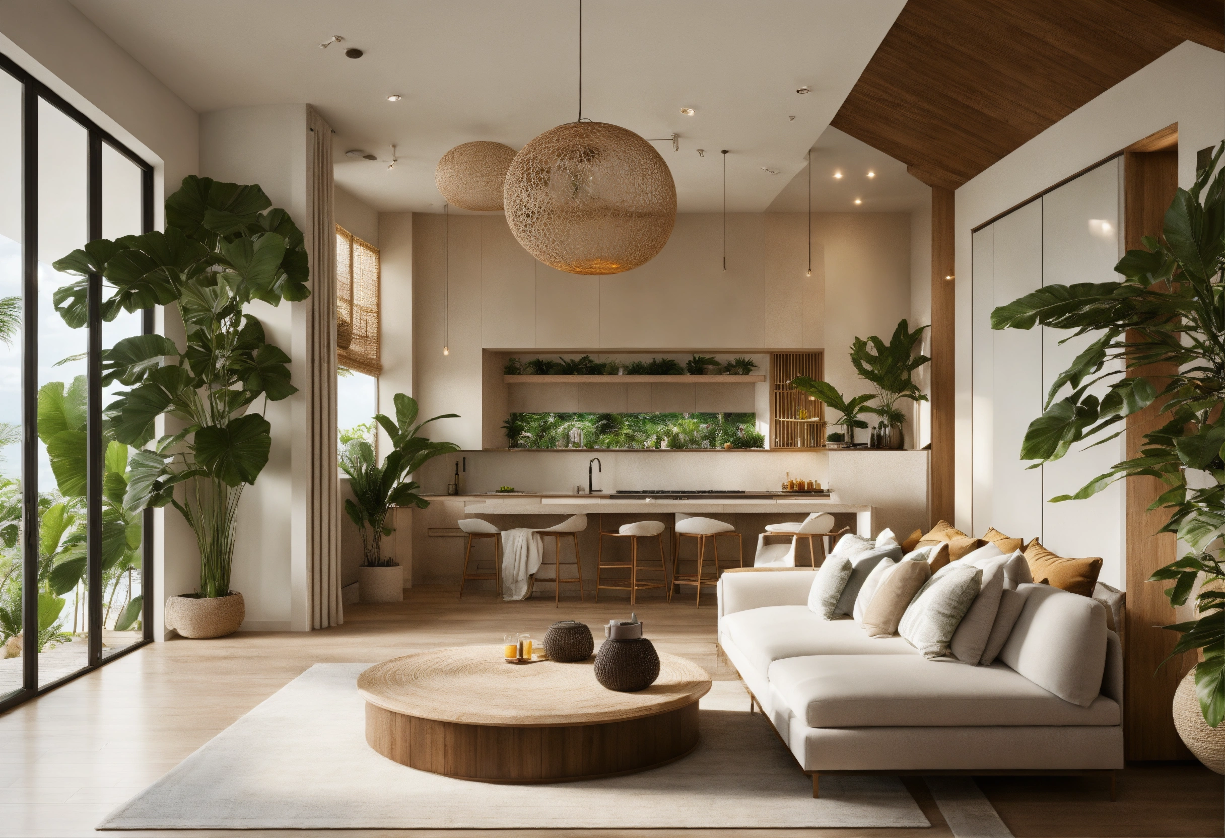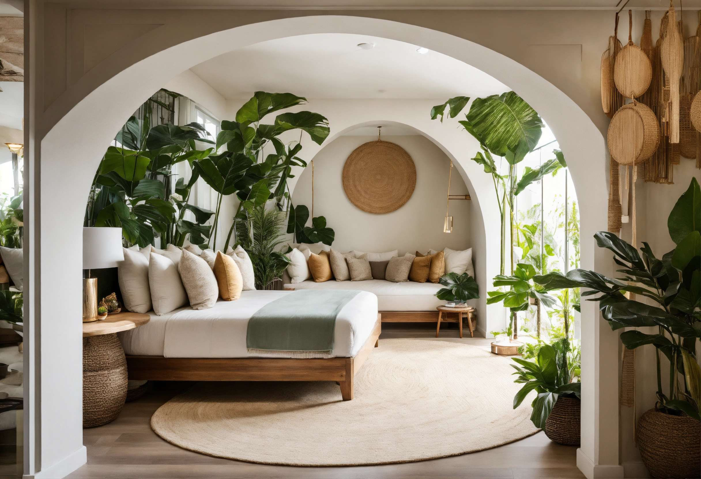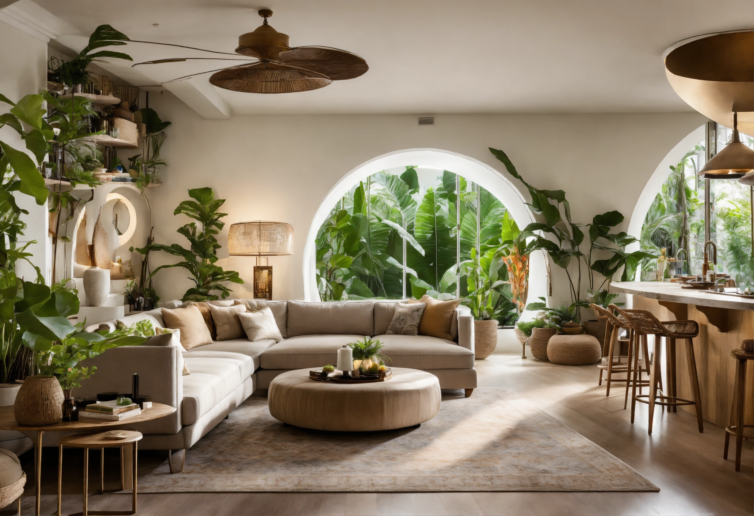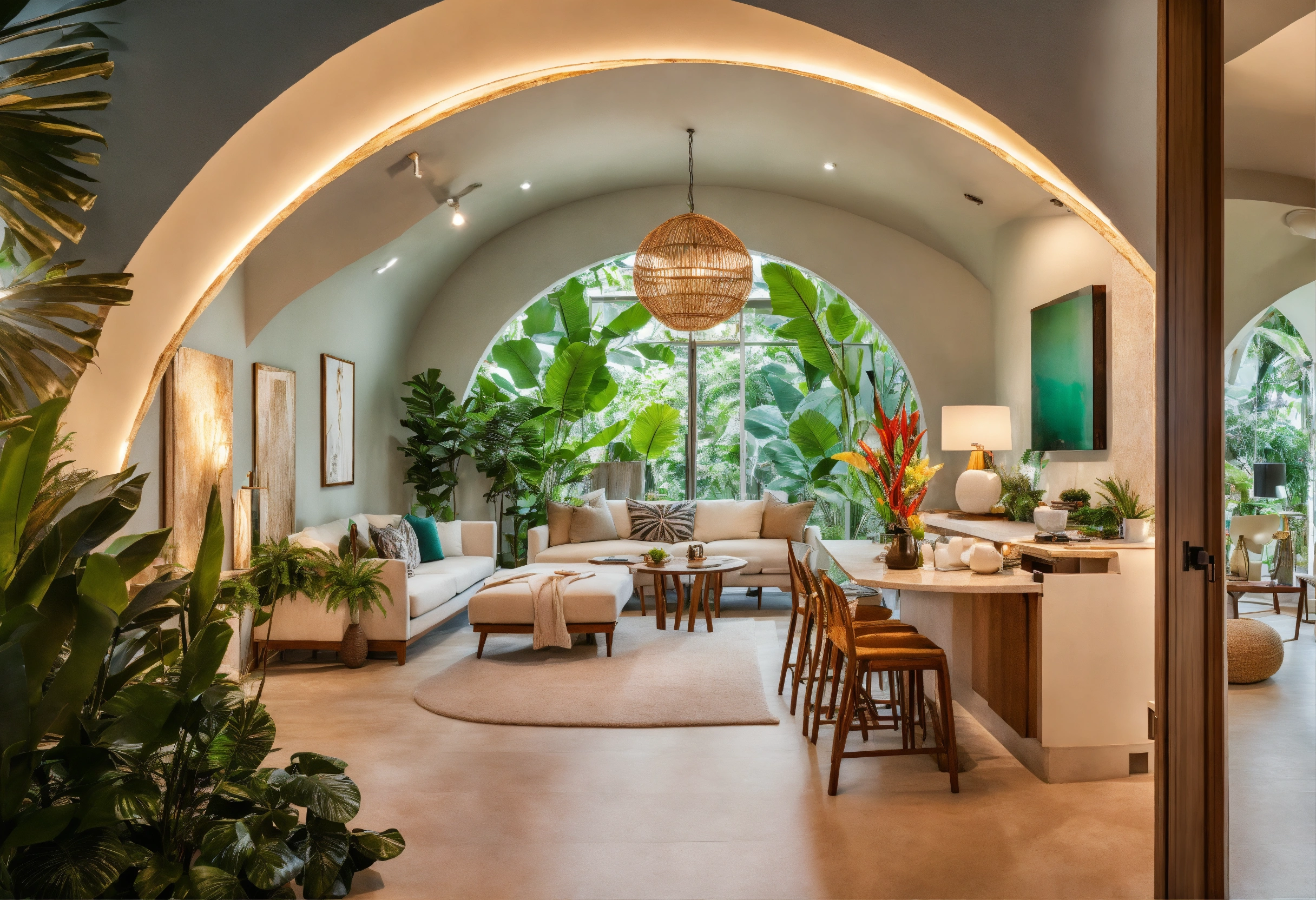 Modern take on upscale bali inspired small condo white round arches interor view of kitchen living room bedroom tropical foliage