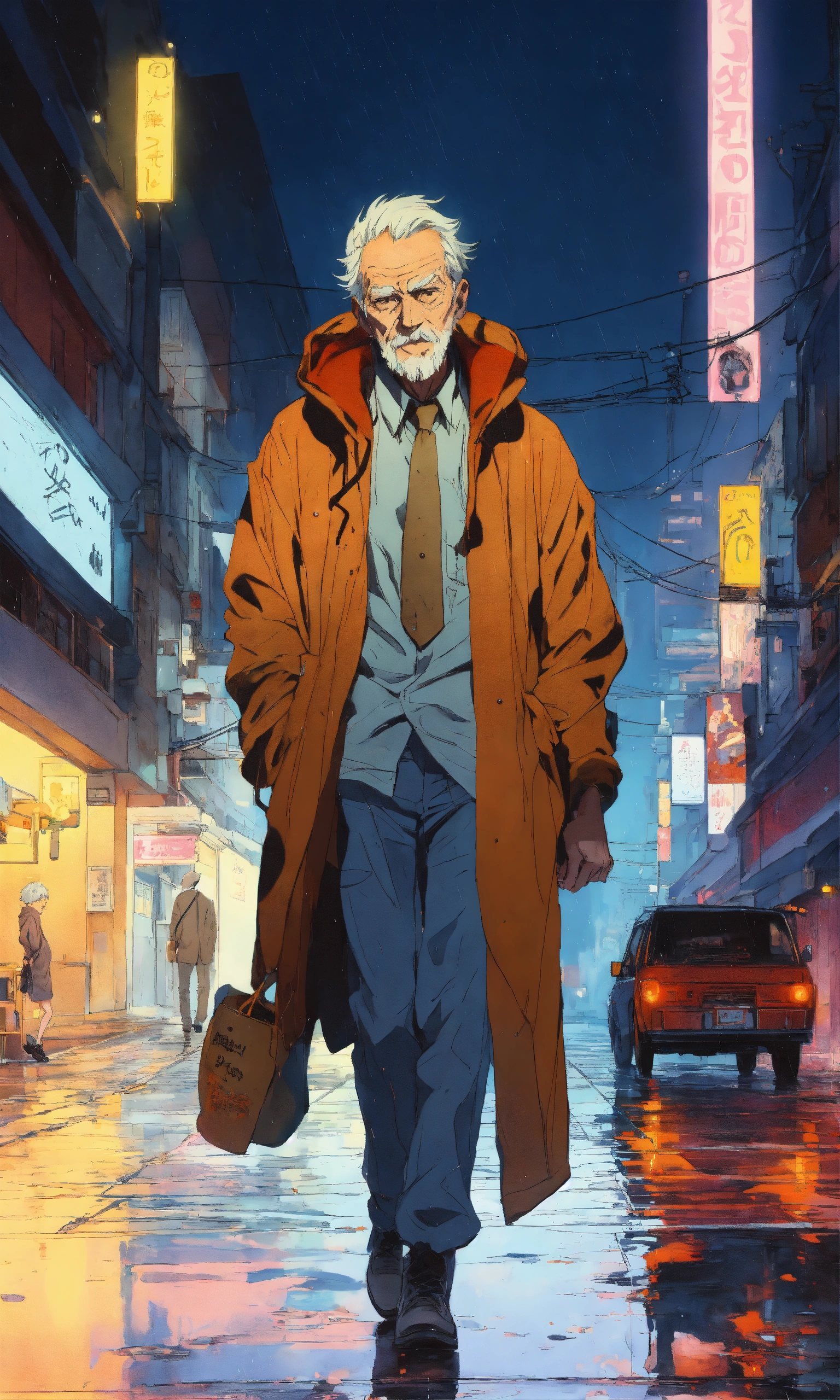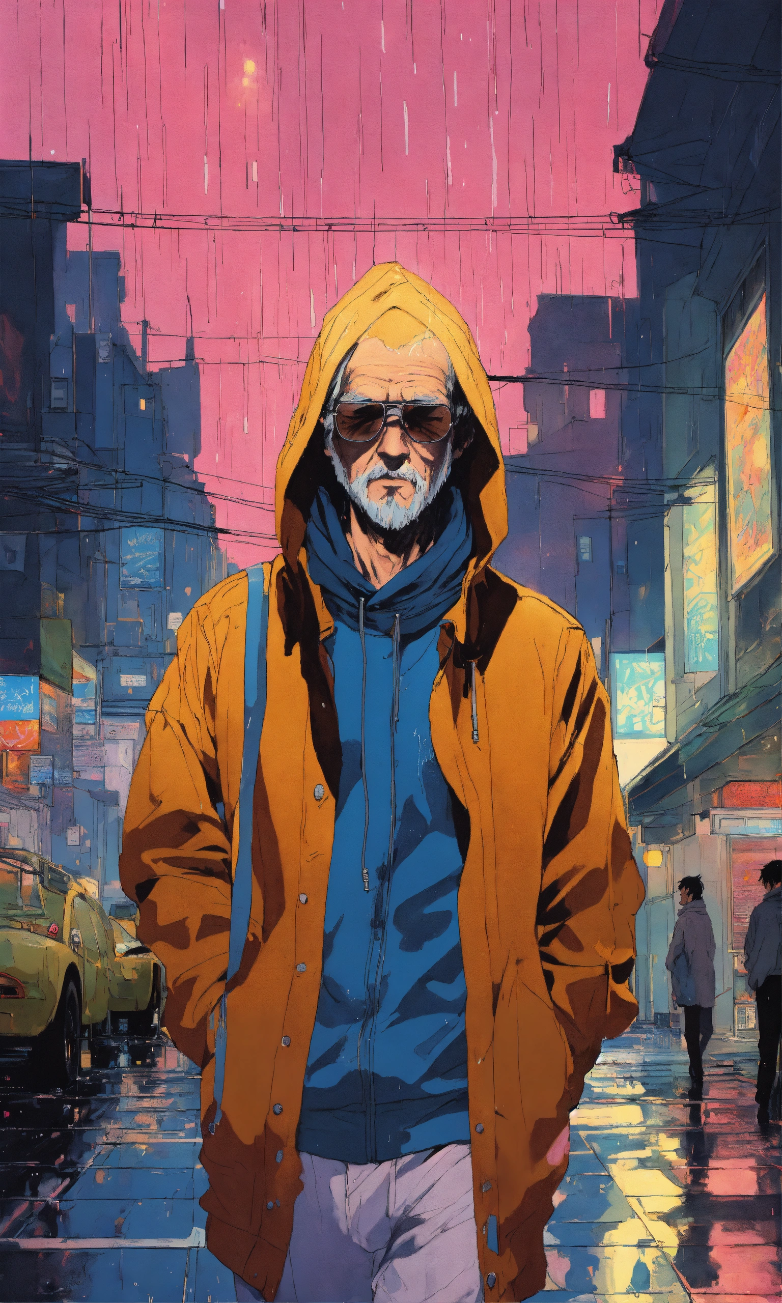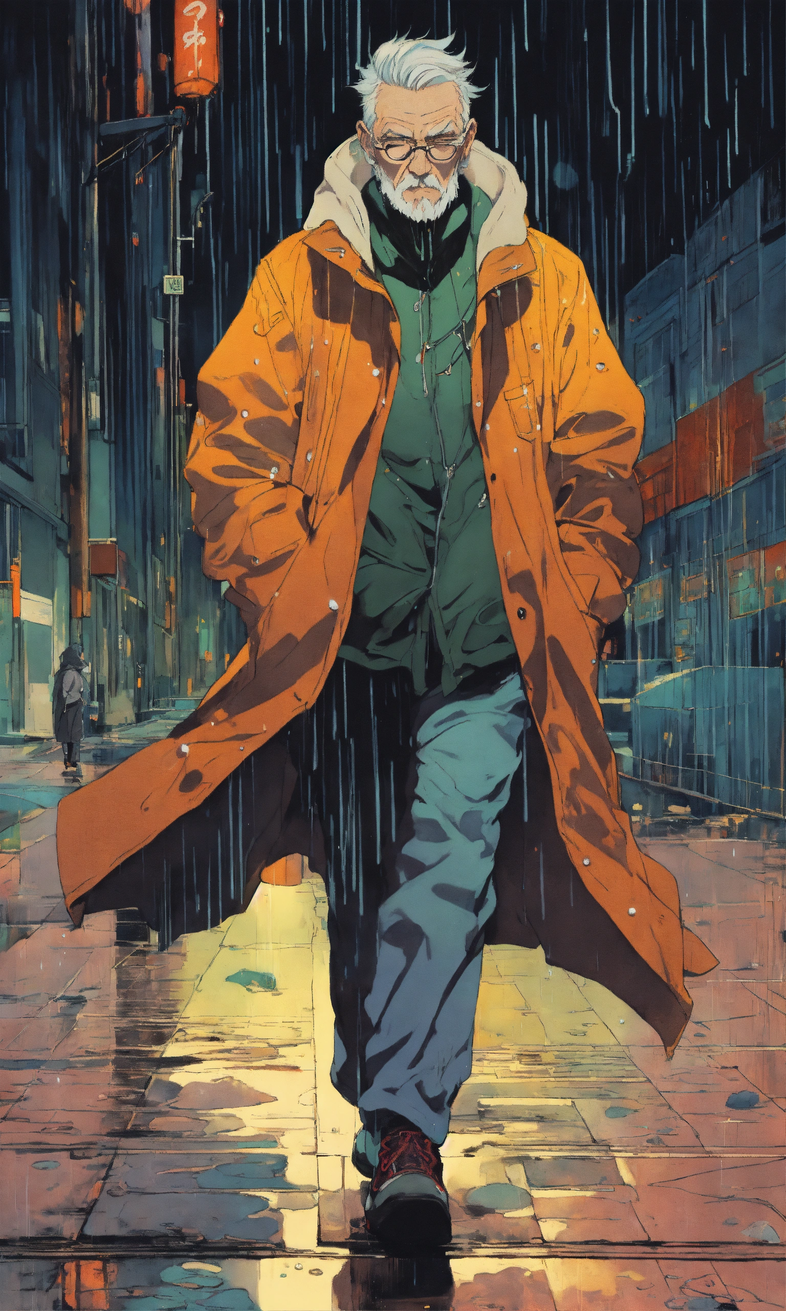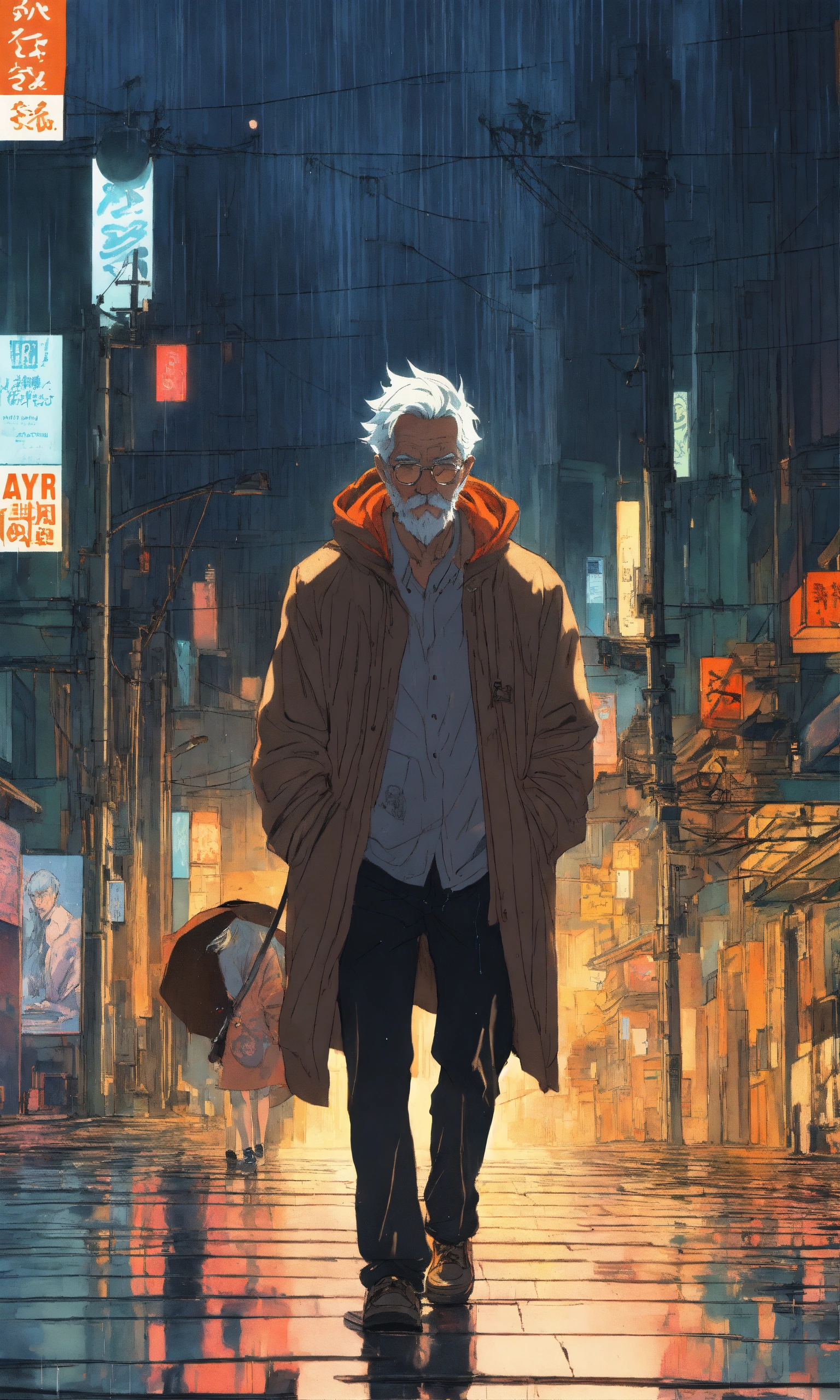 Cel anime, old man, perfect smooth coloring, hoodie, walking in the rain; by shinkai makoto, kaethe butcher, hajime sorayama, greg tocchini, virgil finlay, 4k, long shot.