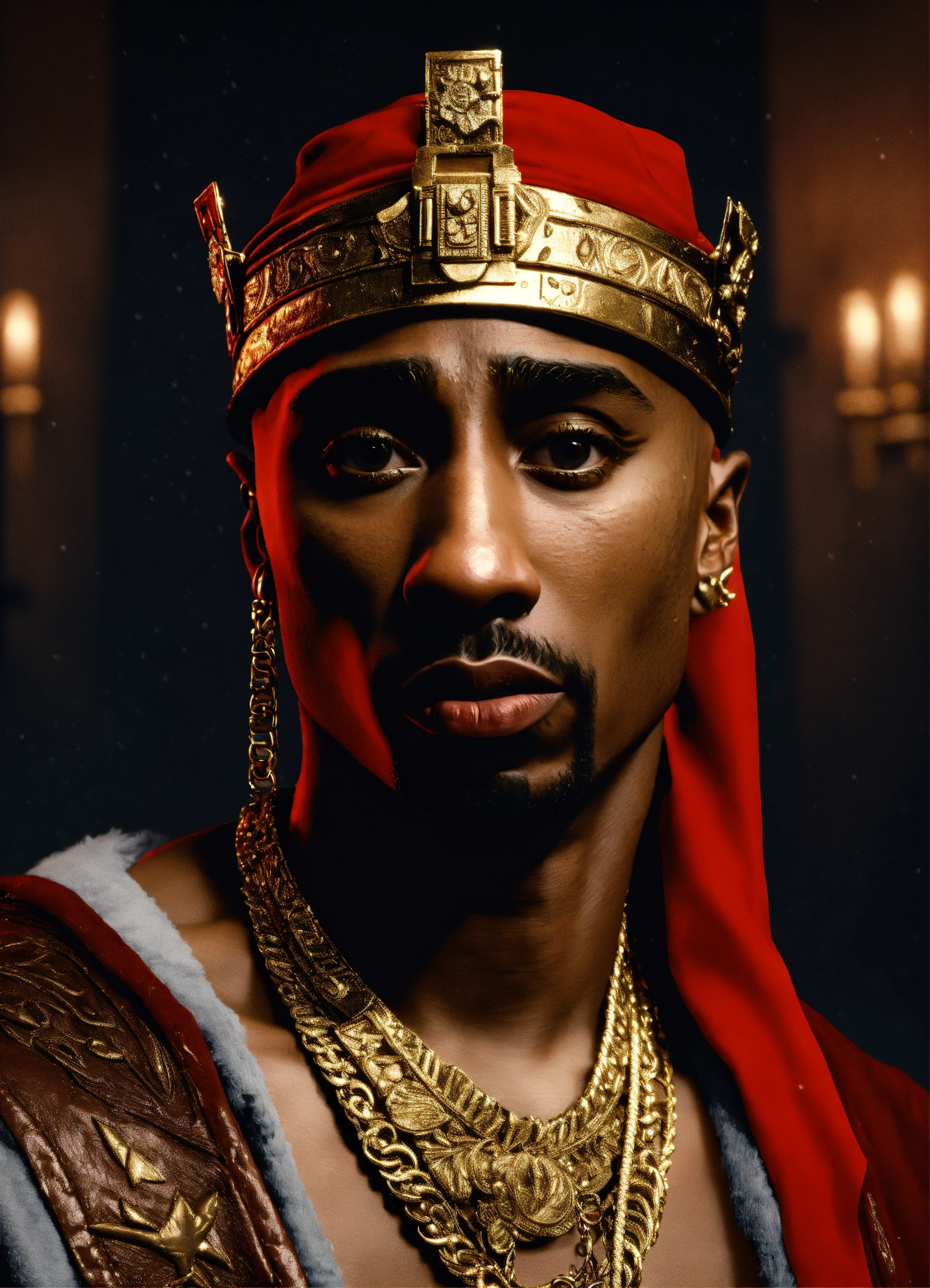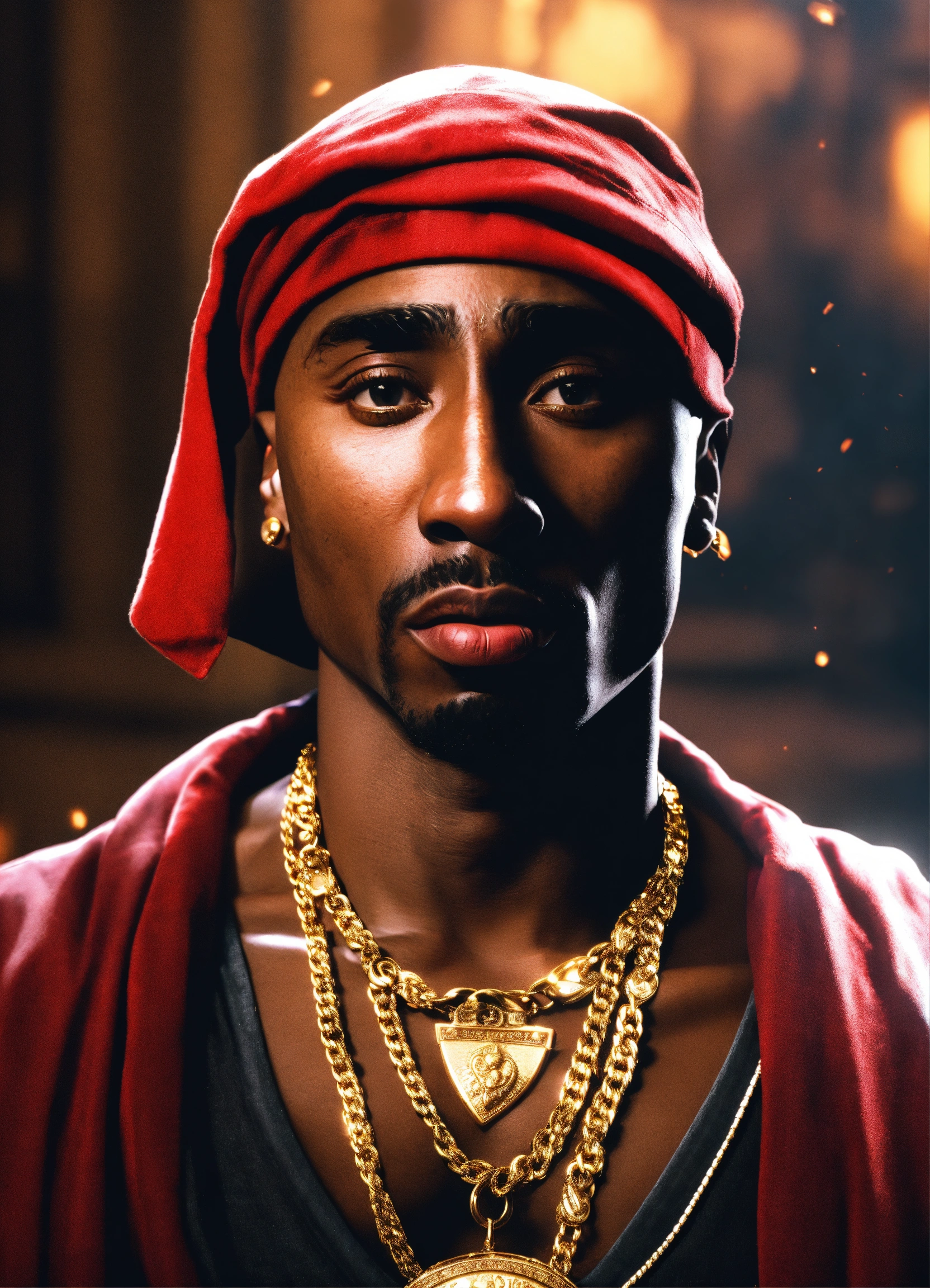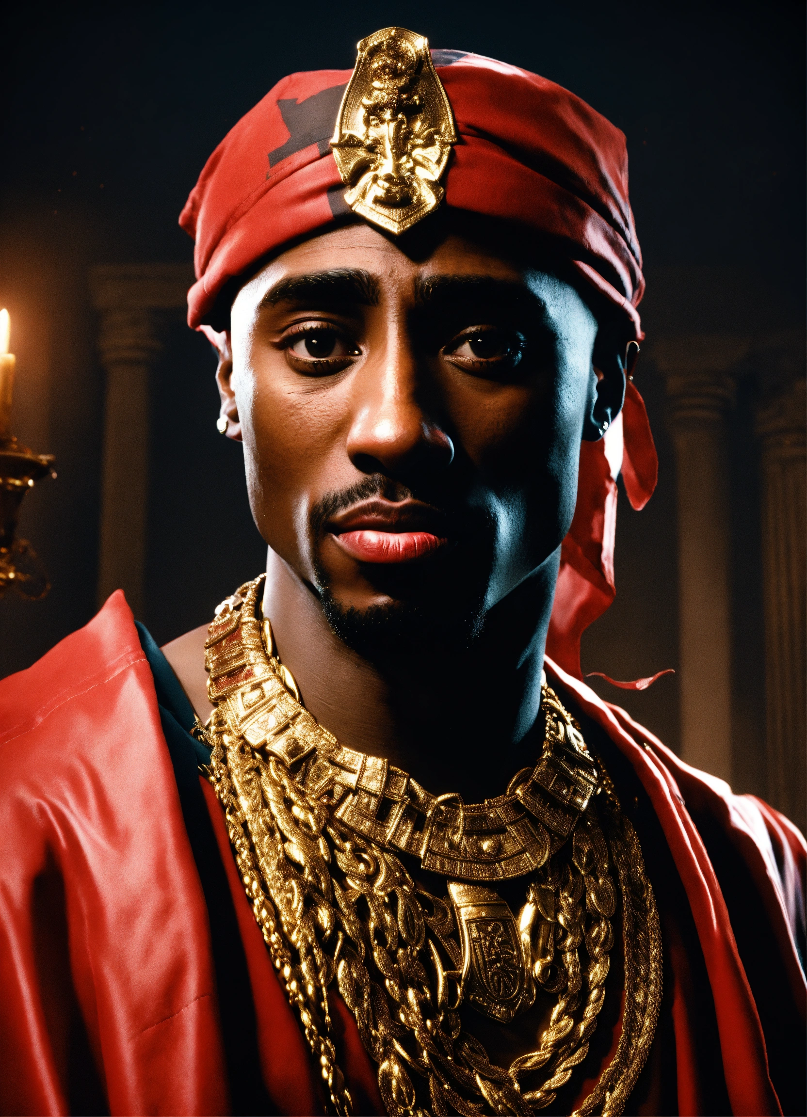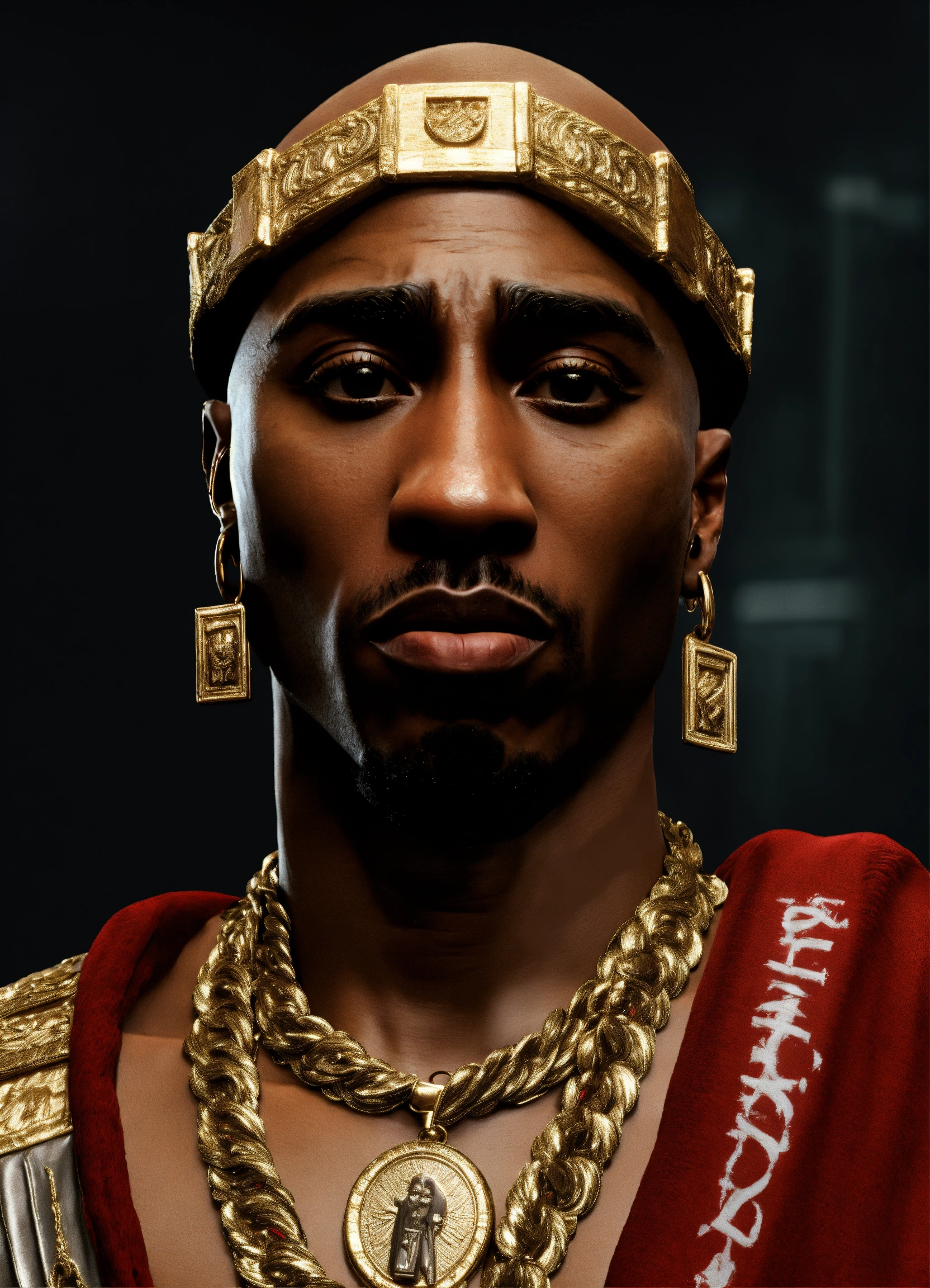 Tupac shakur as julius caesar 8k unreal engine render, photorealism, surreal, hip hop. create as a book cover for “tupac caesar” a hip hop tragedy
