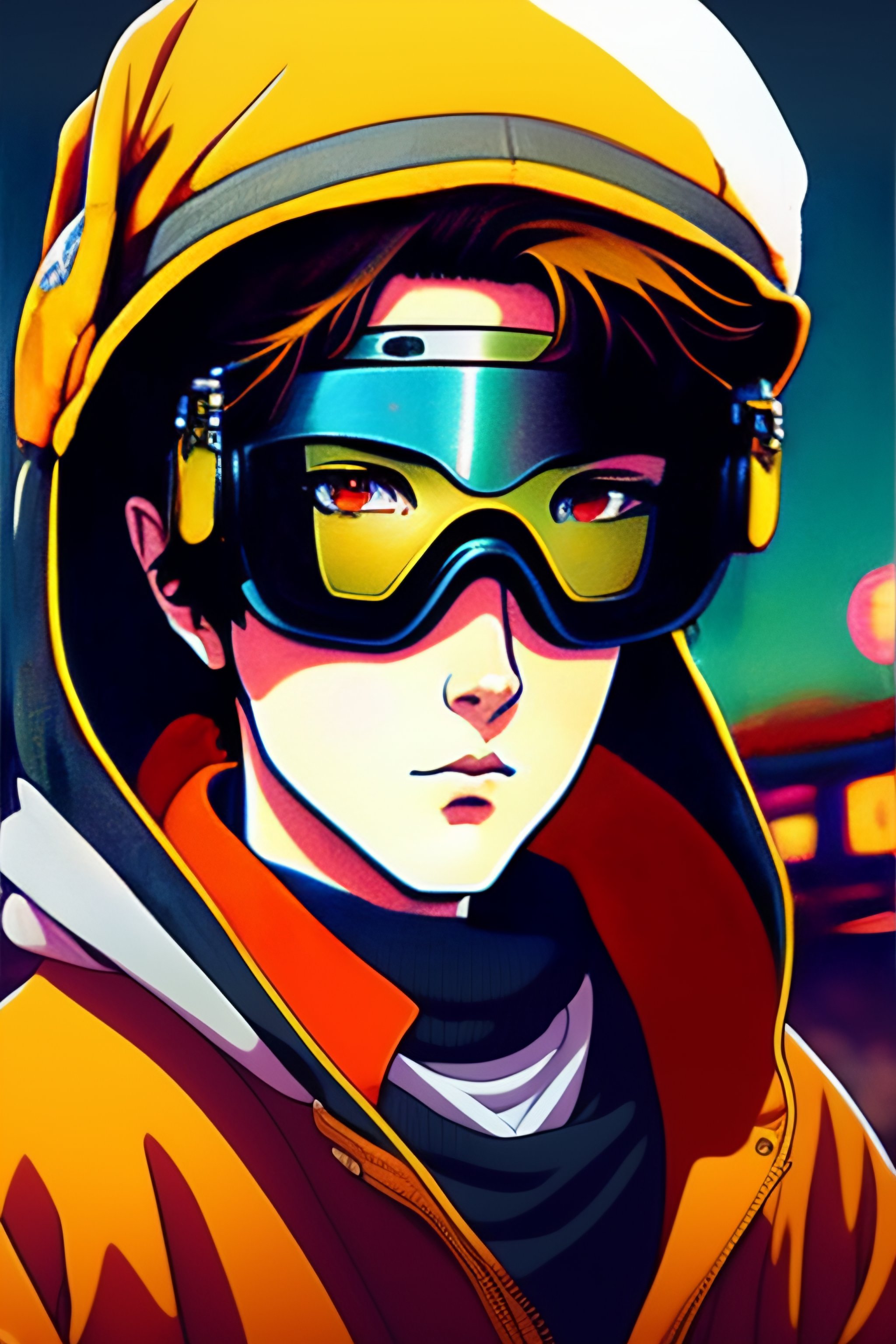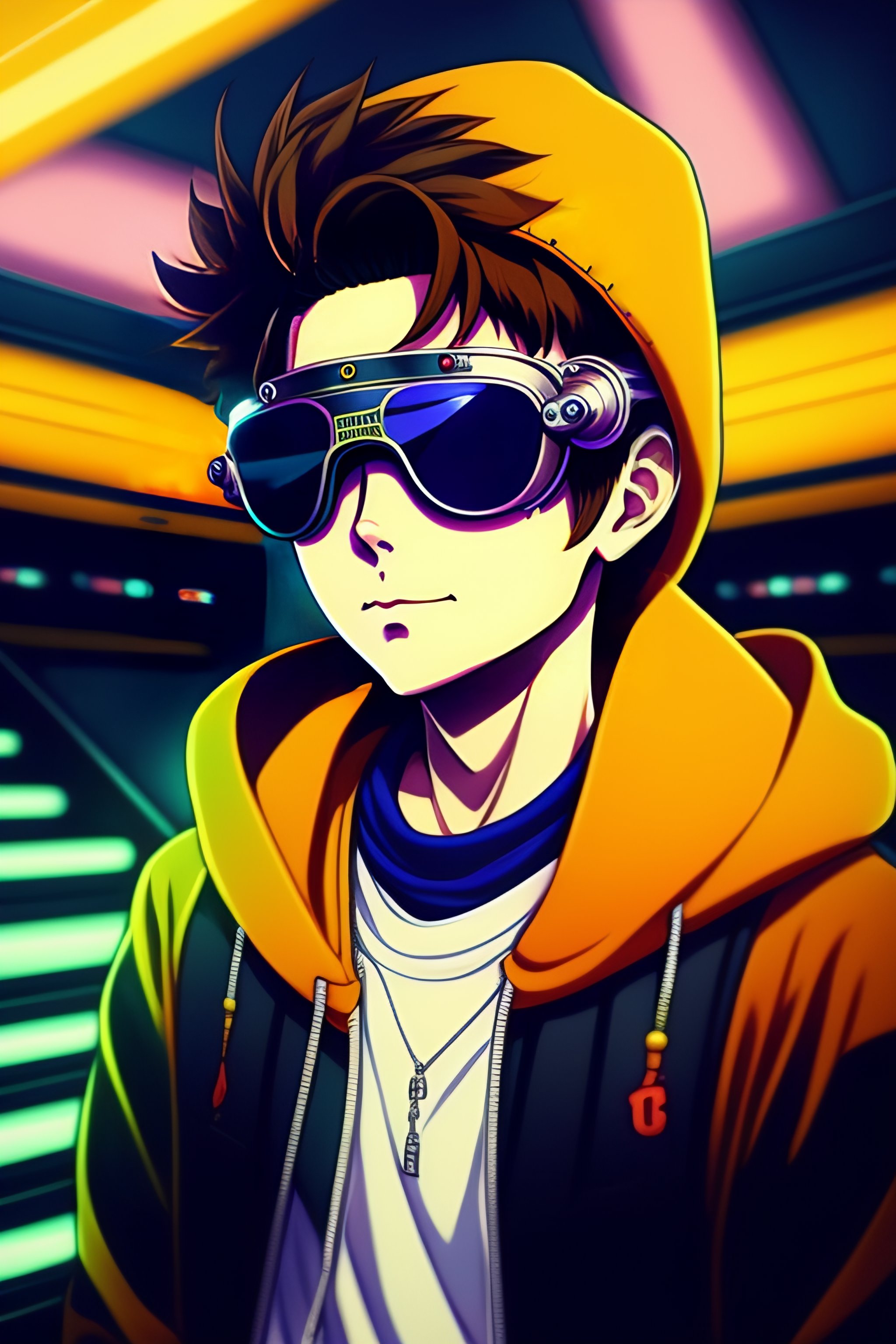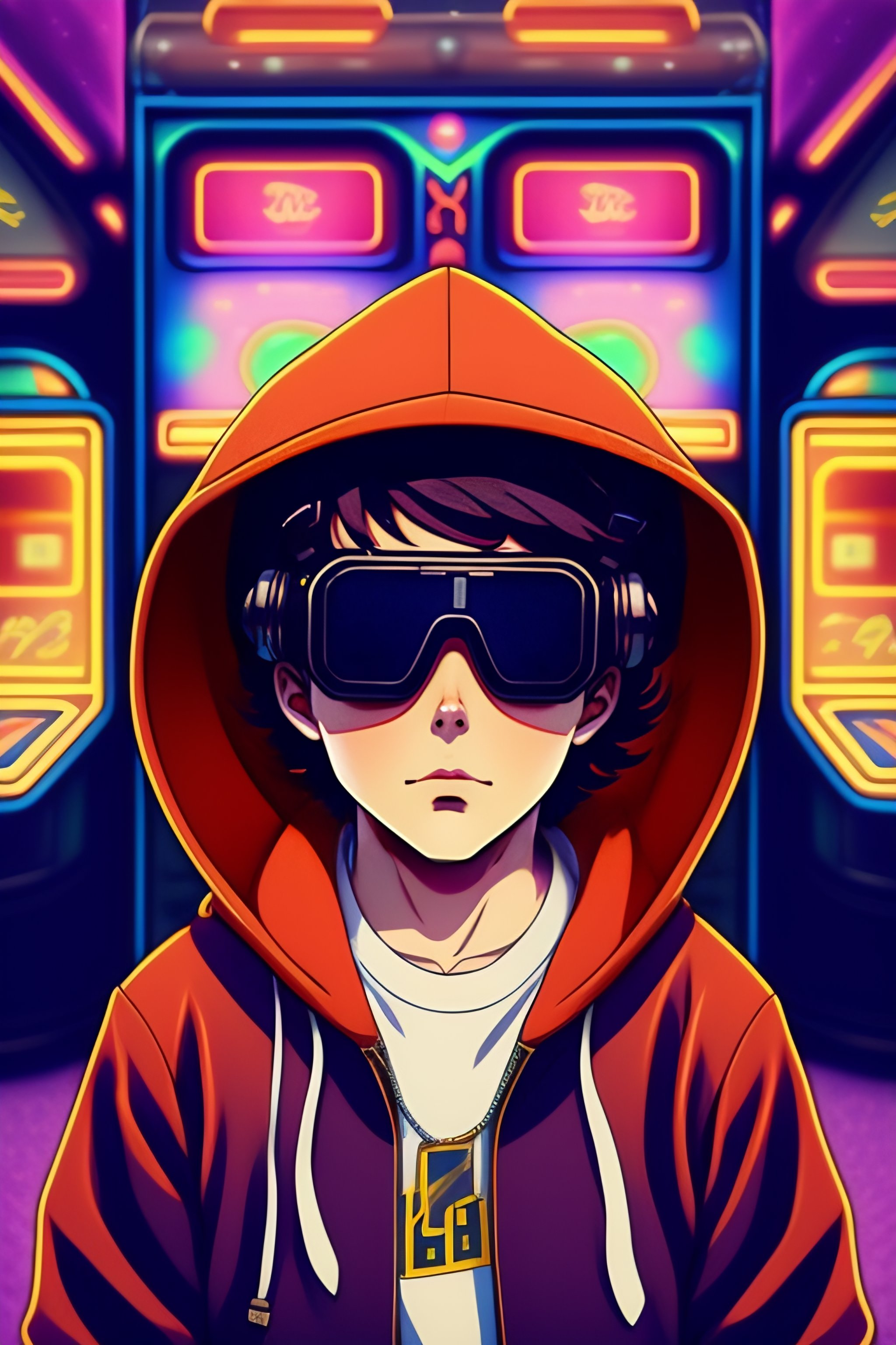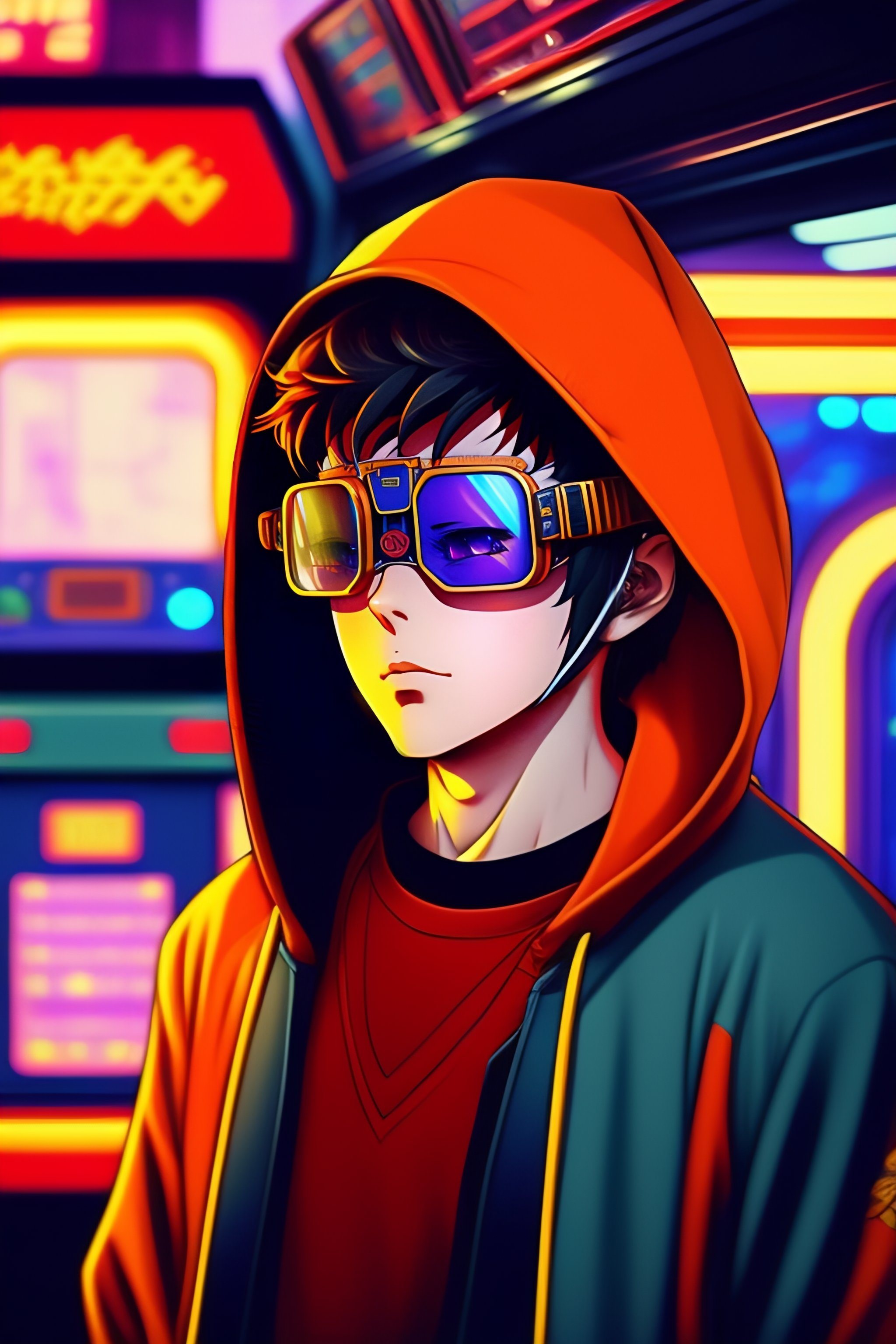 Vintage 90's anime style, retro.anime teenager boy with bandage on nose wearing steampunk goggles wearing hoodie, in a arcade, sci-fi., surreal.
