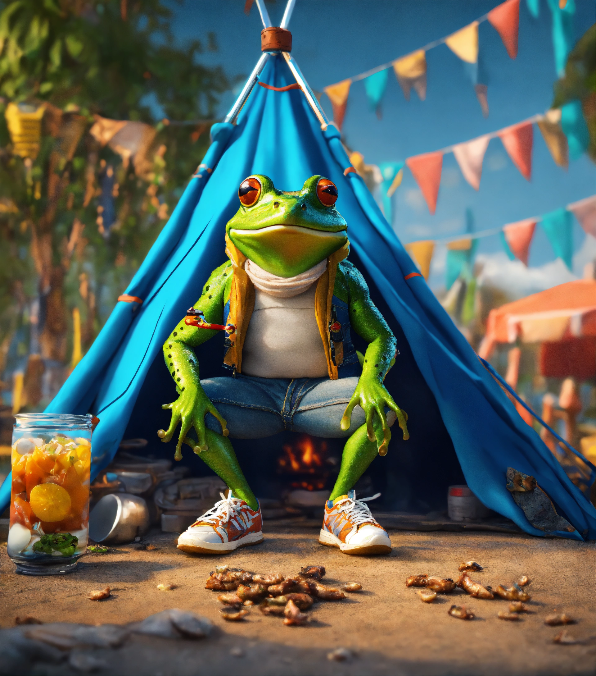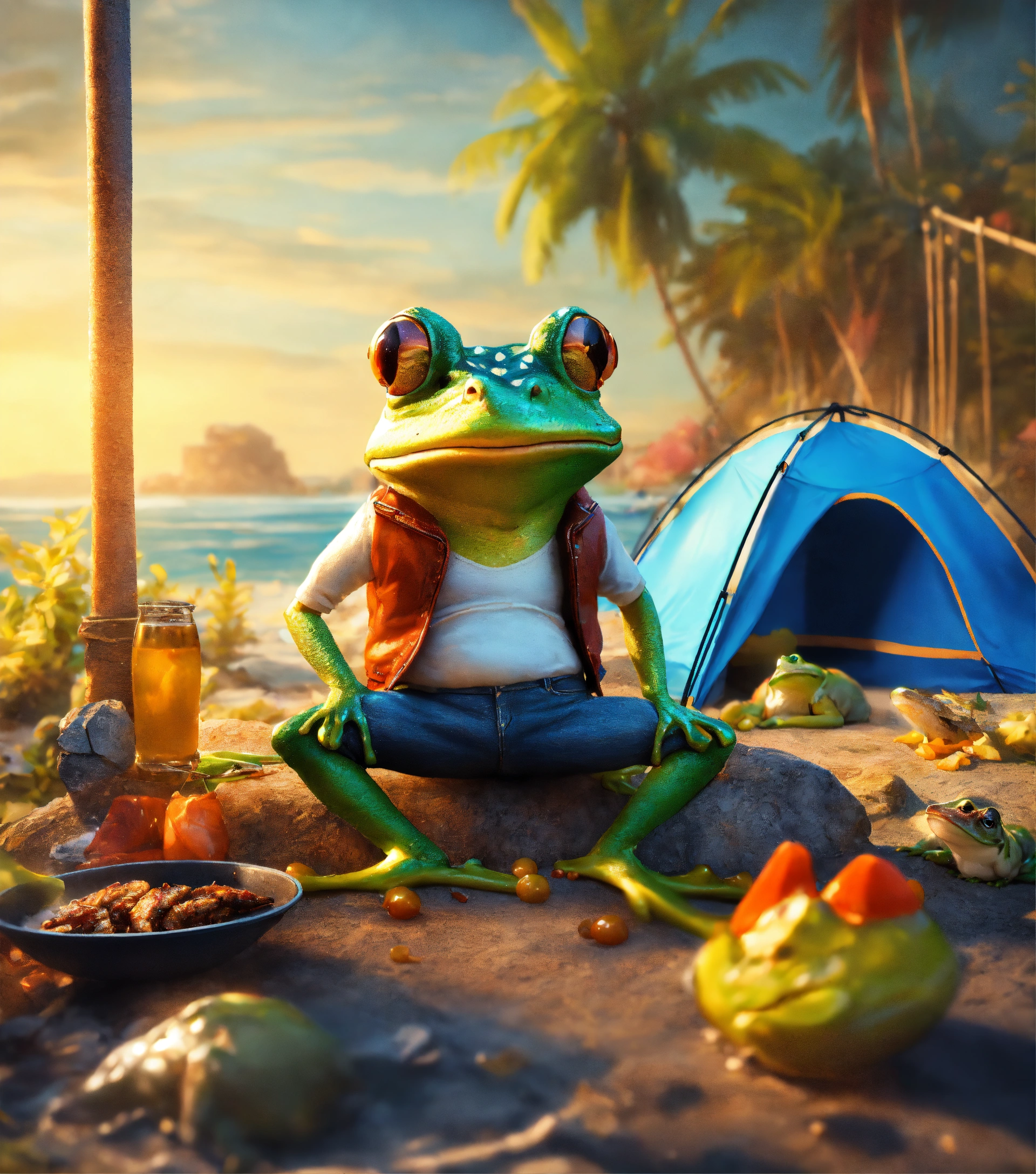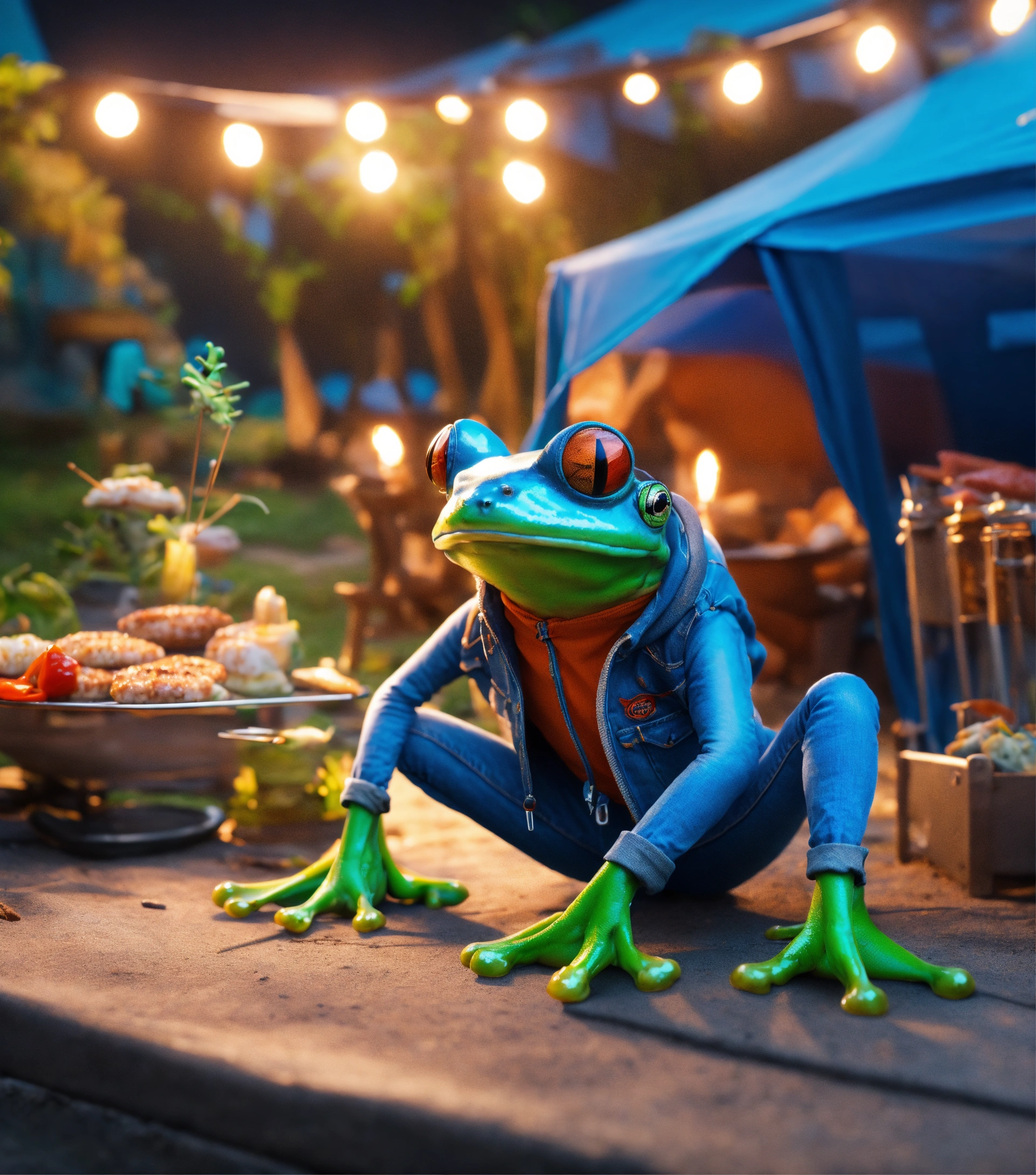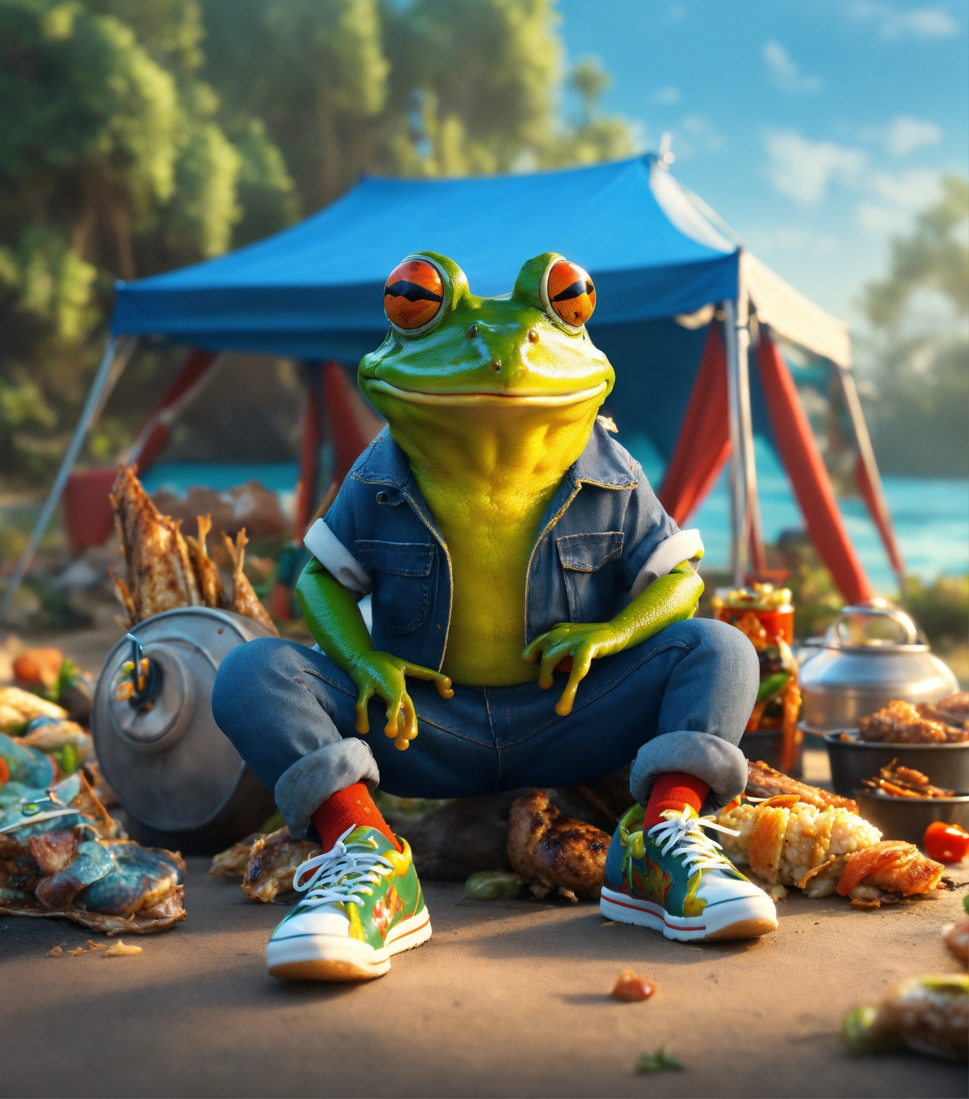 Extremely realistic stylish frog in sneakers, jeans. on the shore, shish kebab is being grilled from frog legs. behind is a blue tent. volumetric lighting, maximalist photo illustrations, 8k concept art, meticulously detailed, complex, expansive, fantastical.
