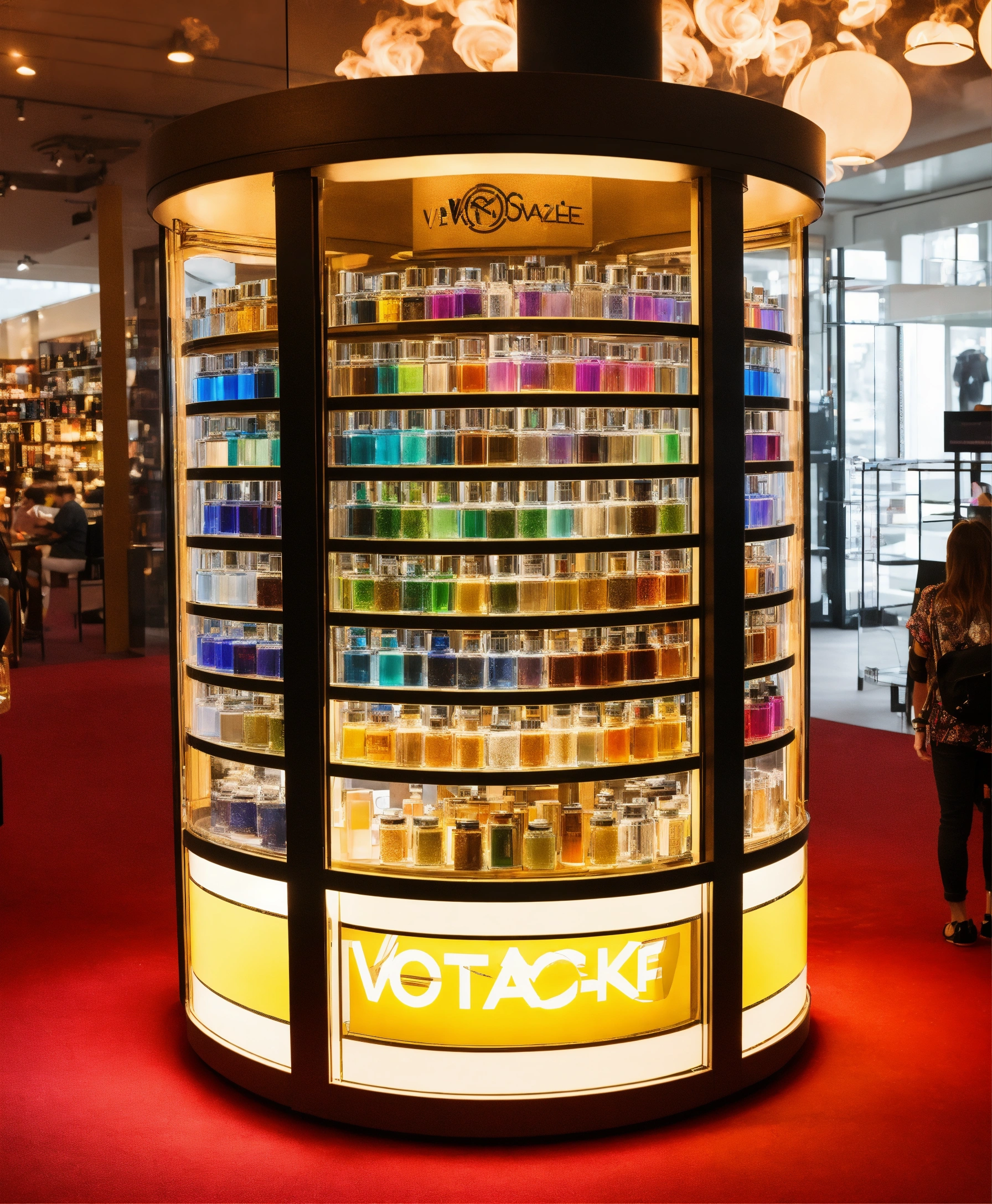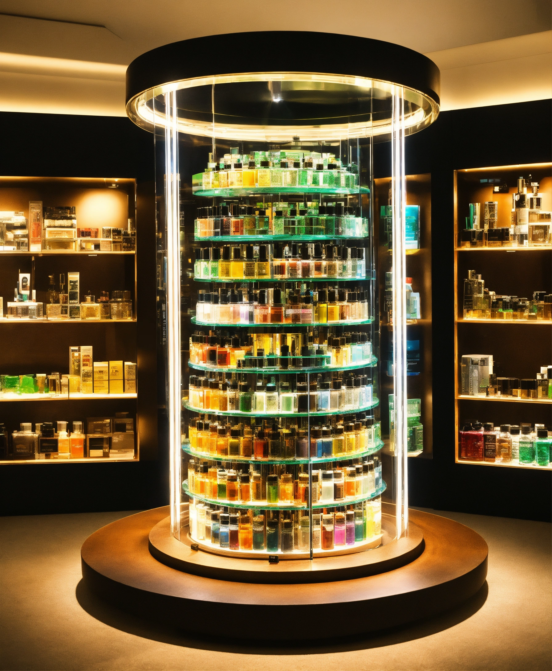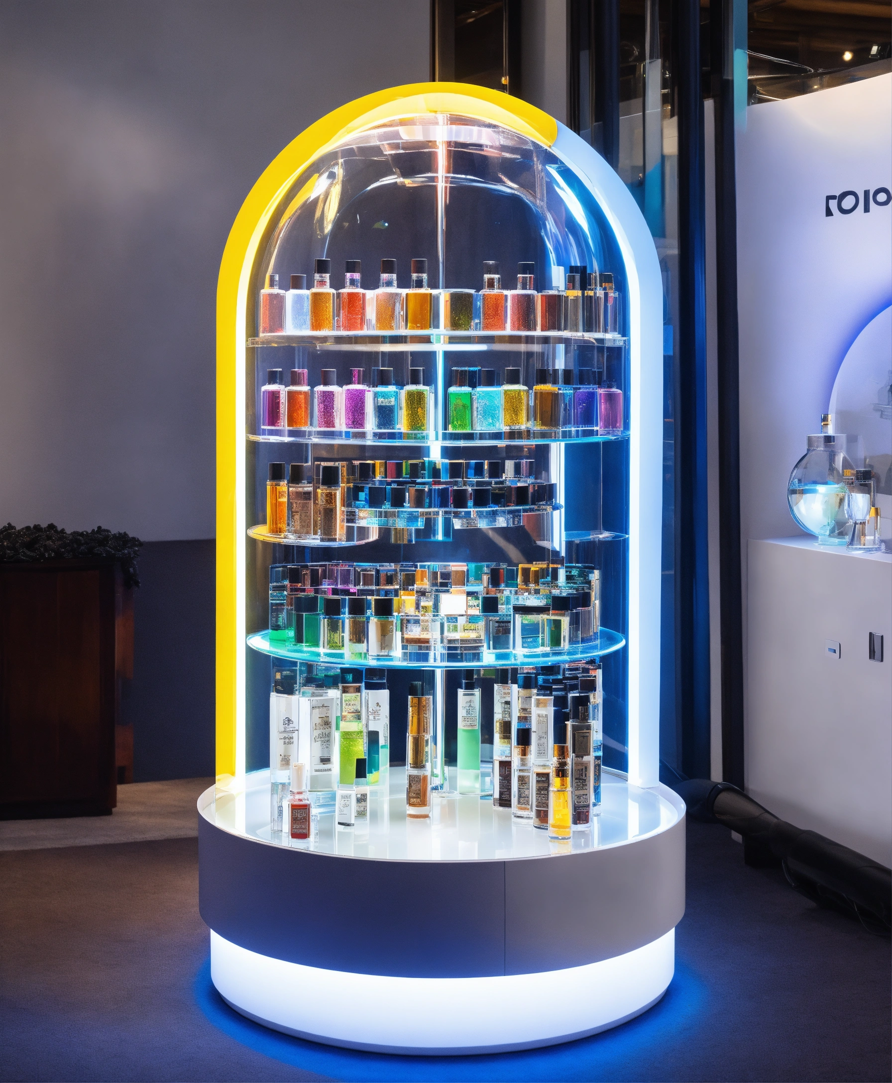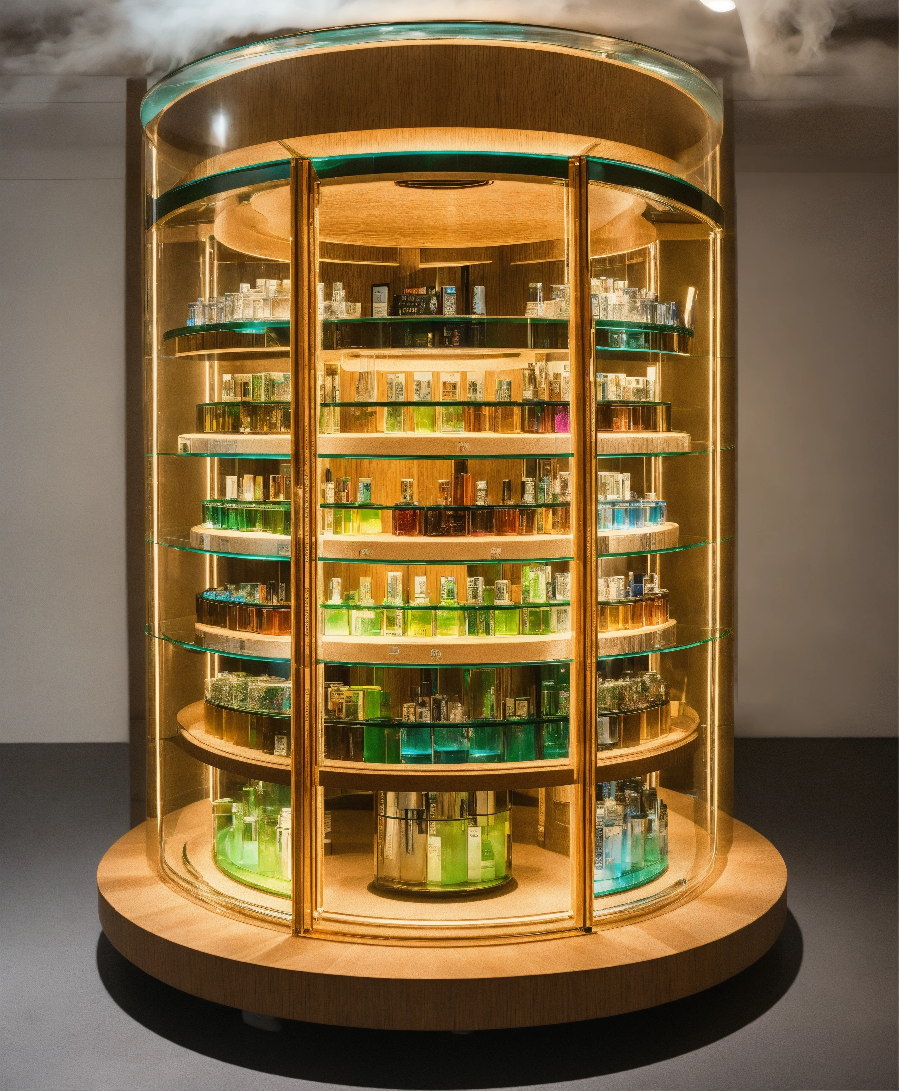 Un display case en rond, multi rayons et multi étages en rond pour mettre des produits comme vape accessoire du fumer avec des pieds de roulette volière en verre.